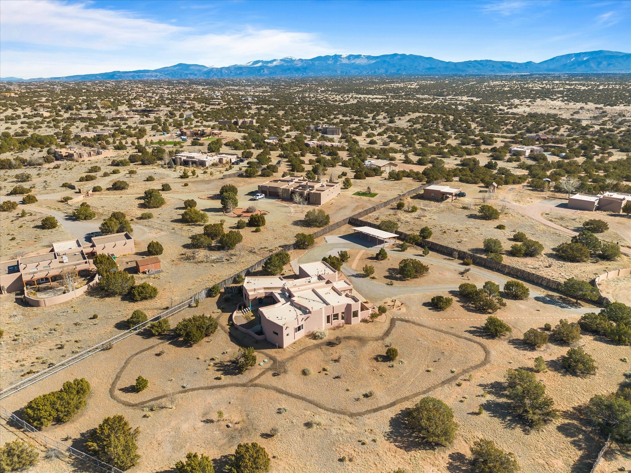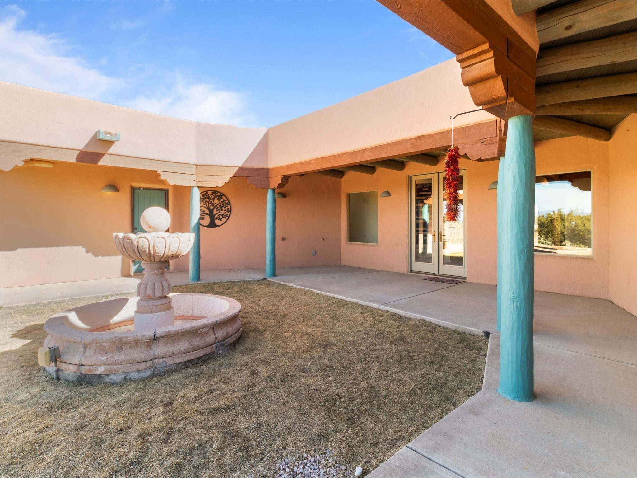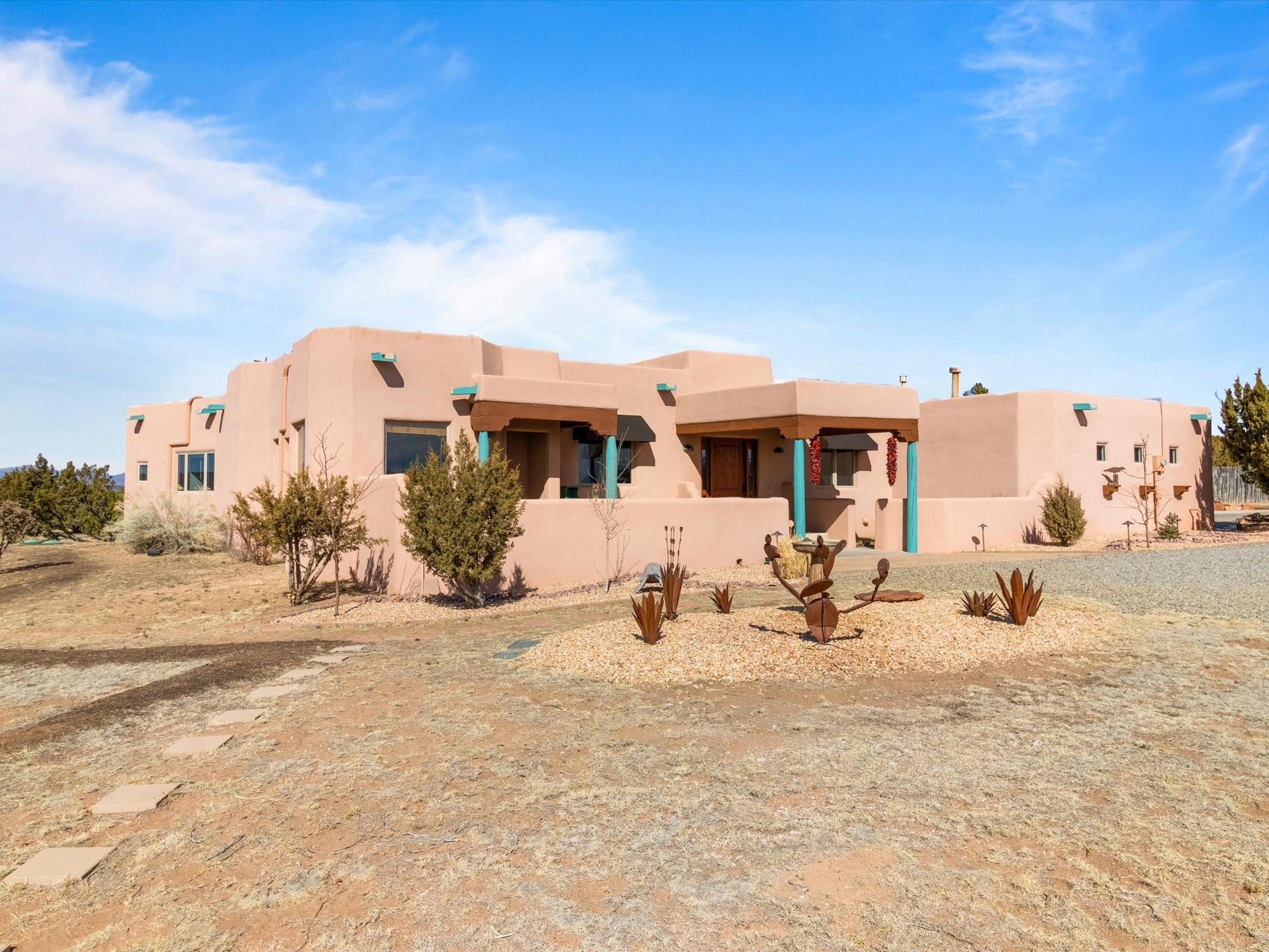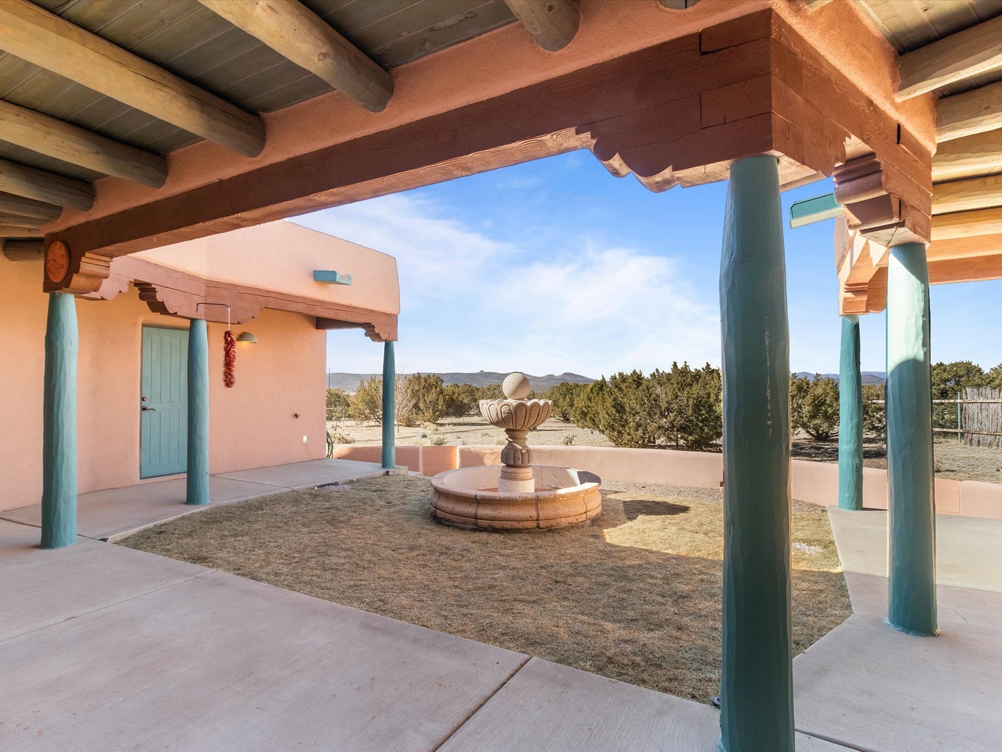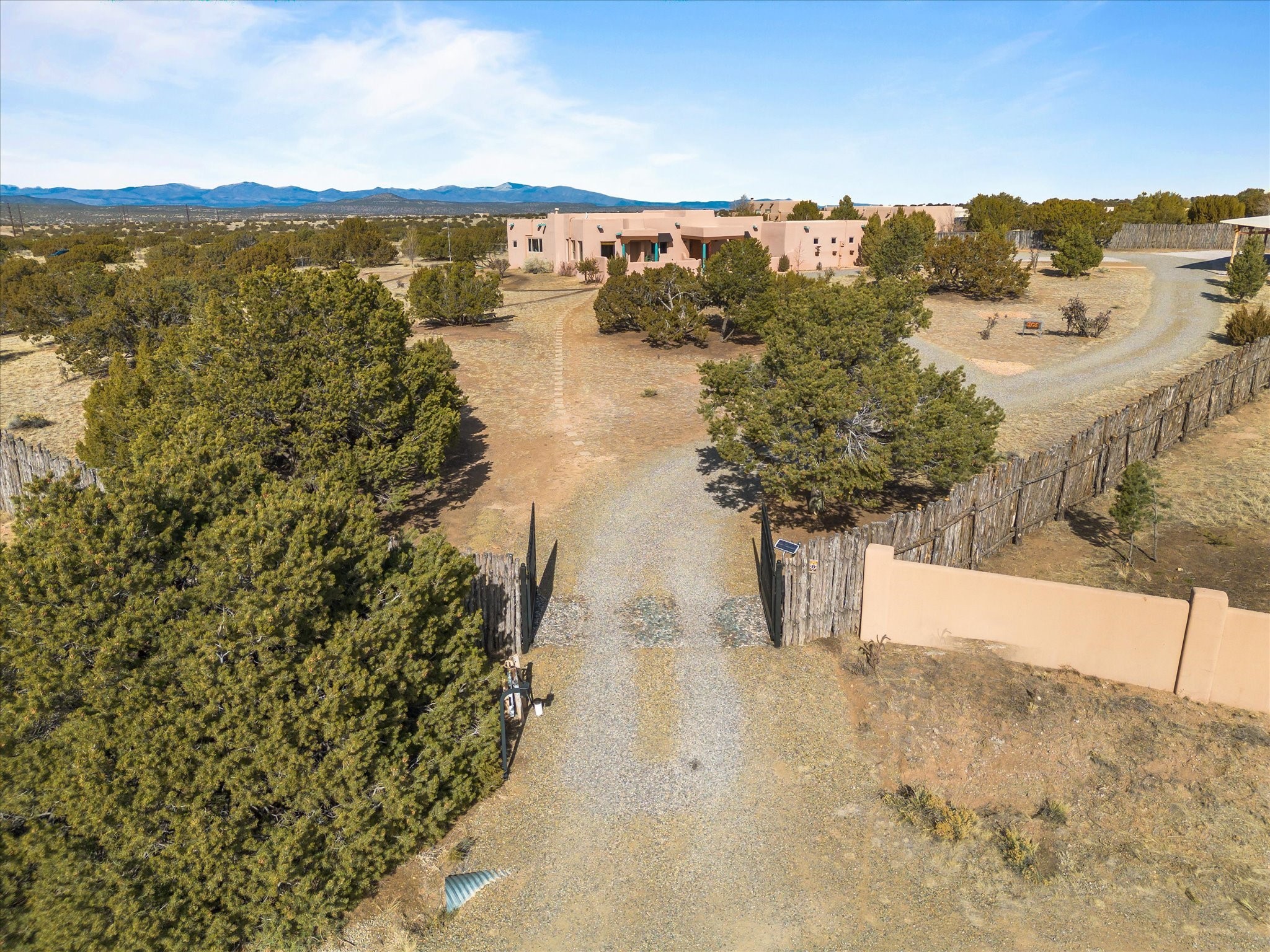 Captivating Pueblo-Style Retreat with Panoramic Views!Nestled on 2.35 acres, this lovely 3-bedroom pueblo-style home is thoughtfully designed to embrace Santa Fe's breathtaking landscapes. From the moment you step inside, the home draws you toward the inviting central patio--an ideal space for gatherings, relaxation, and savoring the vibrant hues of Santa Fe sunsets alongside the tranquil sounds of a water fountain.The high-ceilinged living room, complete with corner fireplace, creates a warm and welcoming atmosphere for entertaining. The kitchen is equipped with stainless steel appliances and has an elongated layout, leading to a charming informal dining area with large windows that perfectly frame the sweeping views of the Sandia, Ortiz, and Cerrillos mountains.The privately situated Primary suite offers a cozy gas fireplace, a spacious walk-in closet, and an En-suite bath featuring a soaking tub and separate shower. A second suite includes a comfortable sitting area with a picture window showcasing stunning views of the Jemez Mountains.Recent updates elevate this home's appeal, including a newer roof, a solar-powered entry gate, skylights, New appliances, mature landscaping with lighting, Automatic drip irrigation, fencing, Newer Boiler, Motordeck garage flooring, New garage door and motor, 220v plug for Electric car charger in the garage, intercom for front entry gate and additional 4 car covered parking. A true Santa Fe sanctuary, this residence blends timeless elegance with modern comforts for a life of beautiful vistas and tranquility.