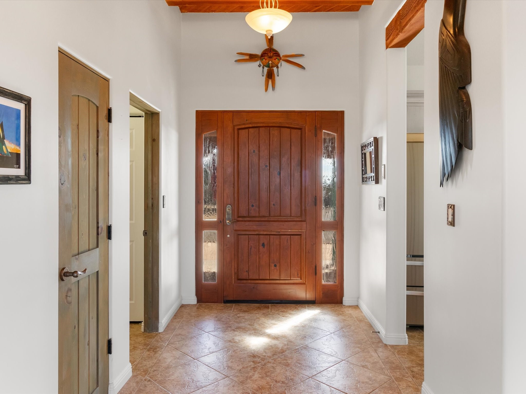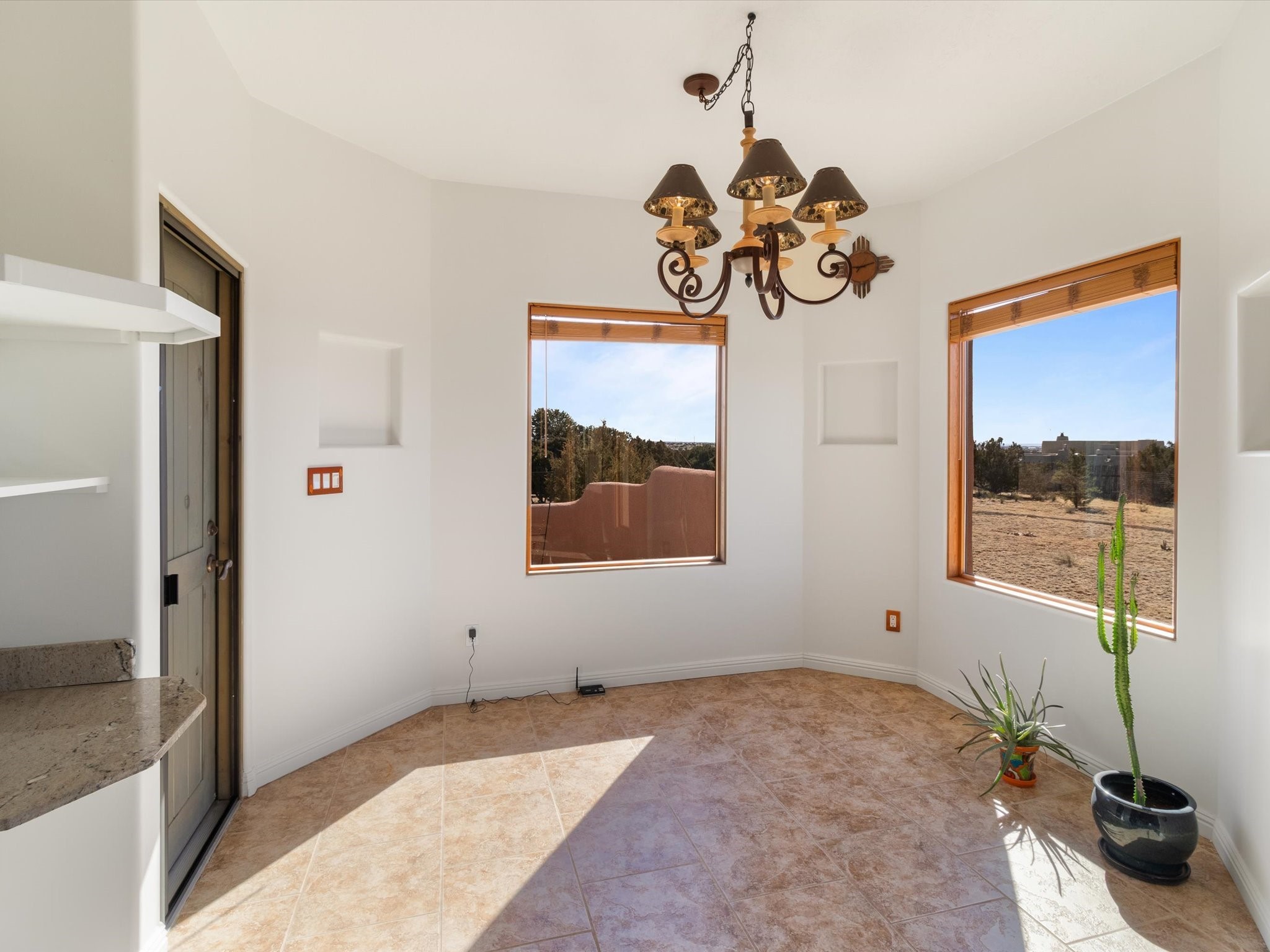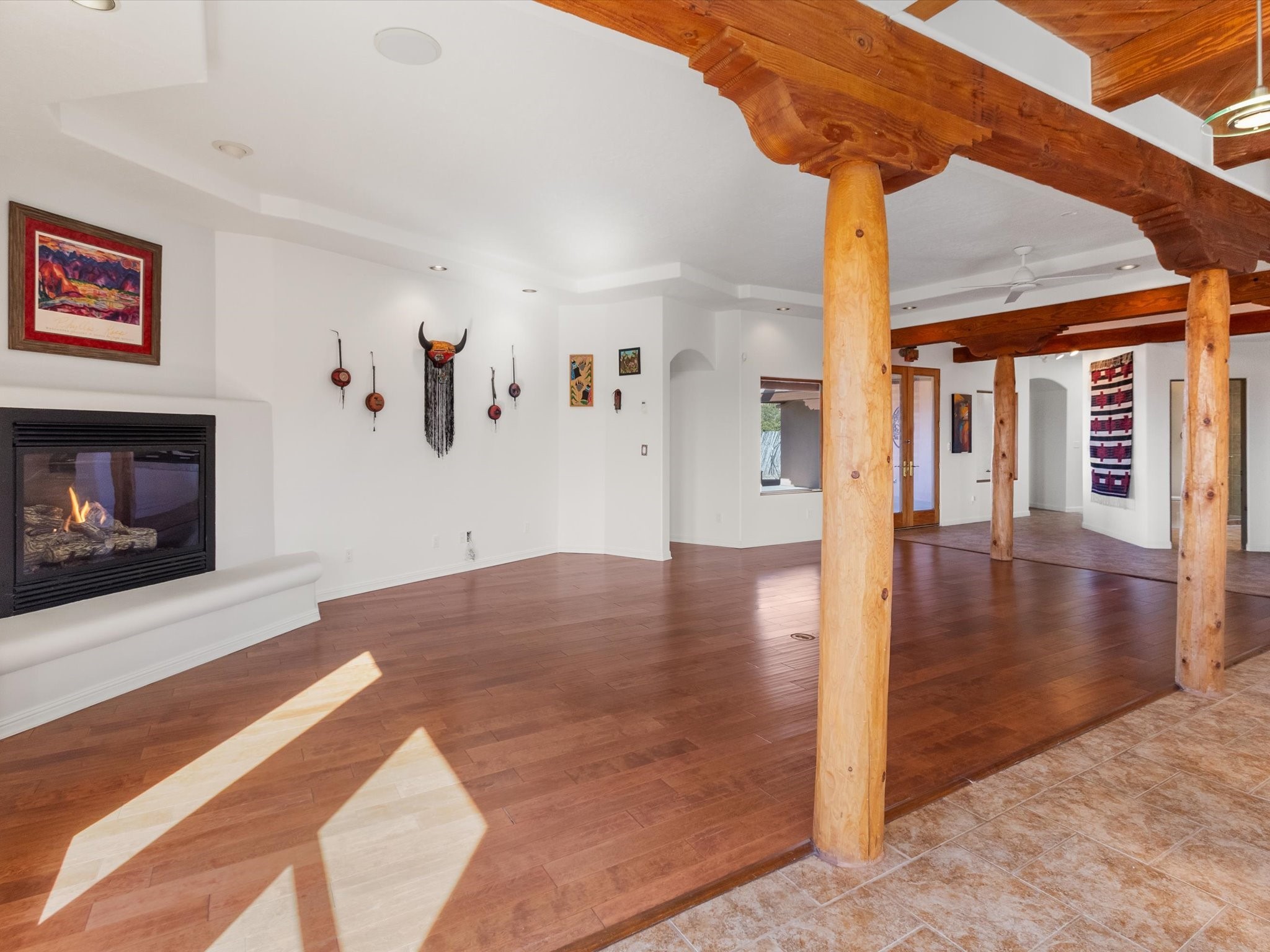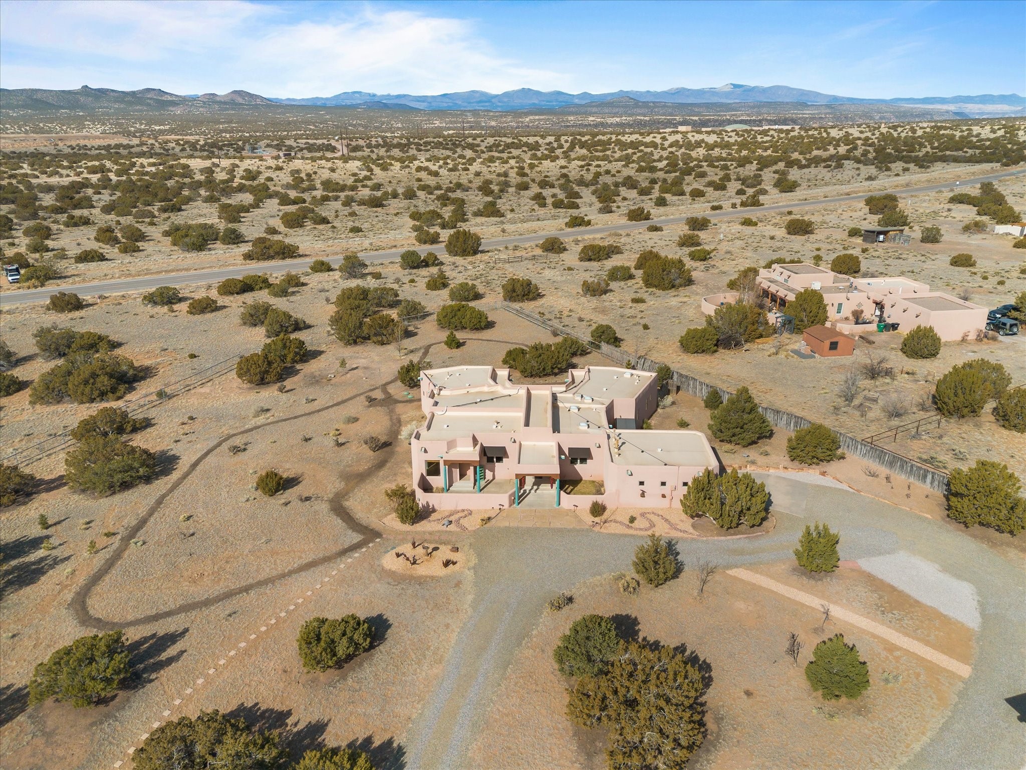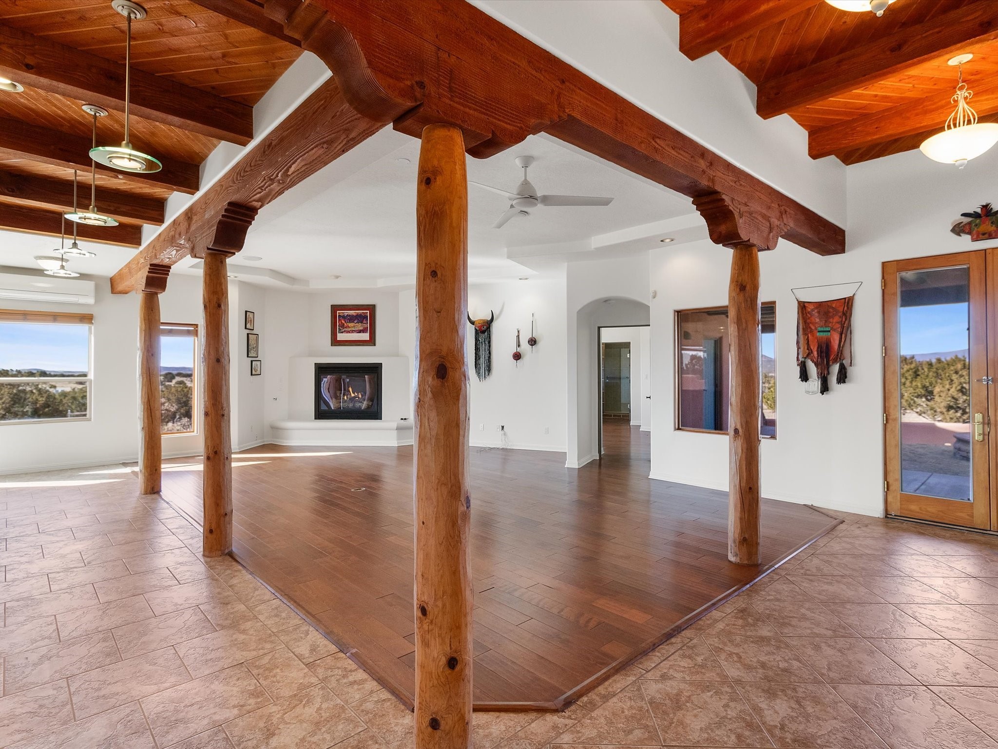 Captivating Pueblo-Style Retreat with Panoramic Views!Nestled on 2.35 acres, this lovely 3-bedroom pueblo-style home is thoughtfully designed to embrace Santa Fe's breathtaking landscapes. From the moment you step inside, the home draws you toward the inviting central patio--an ideal space for gatherings, relaxation, and savoring the vibrant hues of Santa Fe sunsets alongside the tranquil sounds of a water fountain.The high-ceilinged living room, complete with corner fireplace, creates a warm and welcoming atmosphere for entertaining. The kitchen is equipped with stainless steel appliances and has an elongated layout, leading to a charming informal dining area with large windows that perfectly frame the sweeping views of the Sandia, Ortiz, and Cerrillos mountains.The privately situated Primary suite offers a cozy gas fireplace, a spacious walk-in closet, and an En-suite bath featuring a soaking tub and separate shower. A second suite includes a comfortable sitting area with a picture window showcasing stunning views of the Jemez Mountains.Recent updates elevate this home's appeal, including a newer roof, a solar-powered entry gate, skylights, New appliances, mature landscaping with lighting, Automatic drip irrigation, fencing, Newer Boiler, Motordeck garage flooring, New garage door and motor, 220v plug for Electric car charger in the garage, intercom for front entry gate and additional 4 car covered parking. A true Santa Fe sanctuary, this residence blends timeless elegance with modern comforts for a life of beautiful vistas and tranquility.