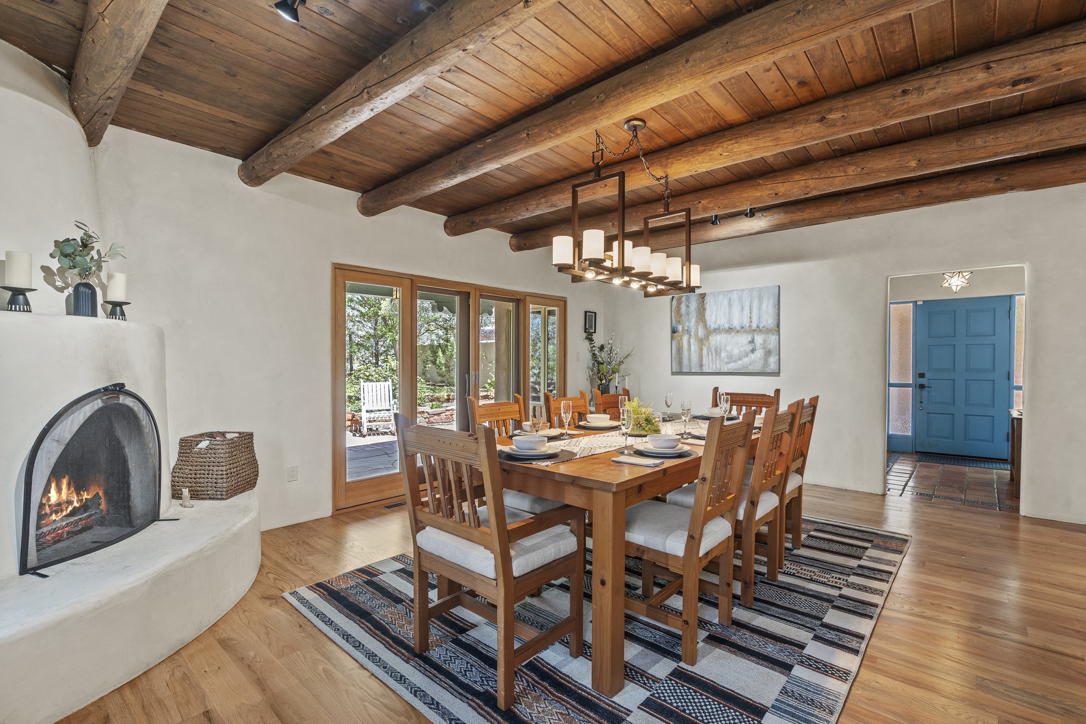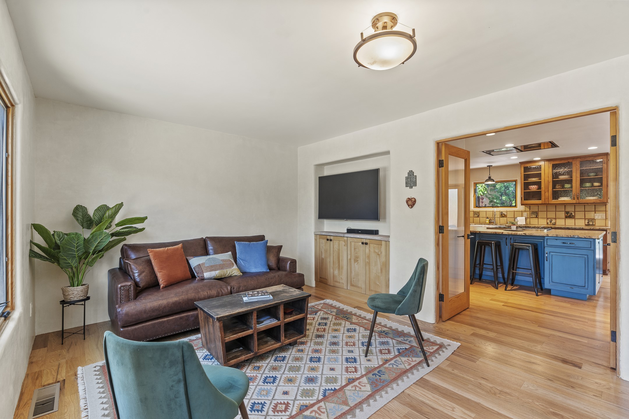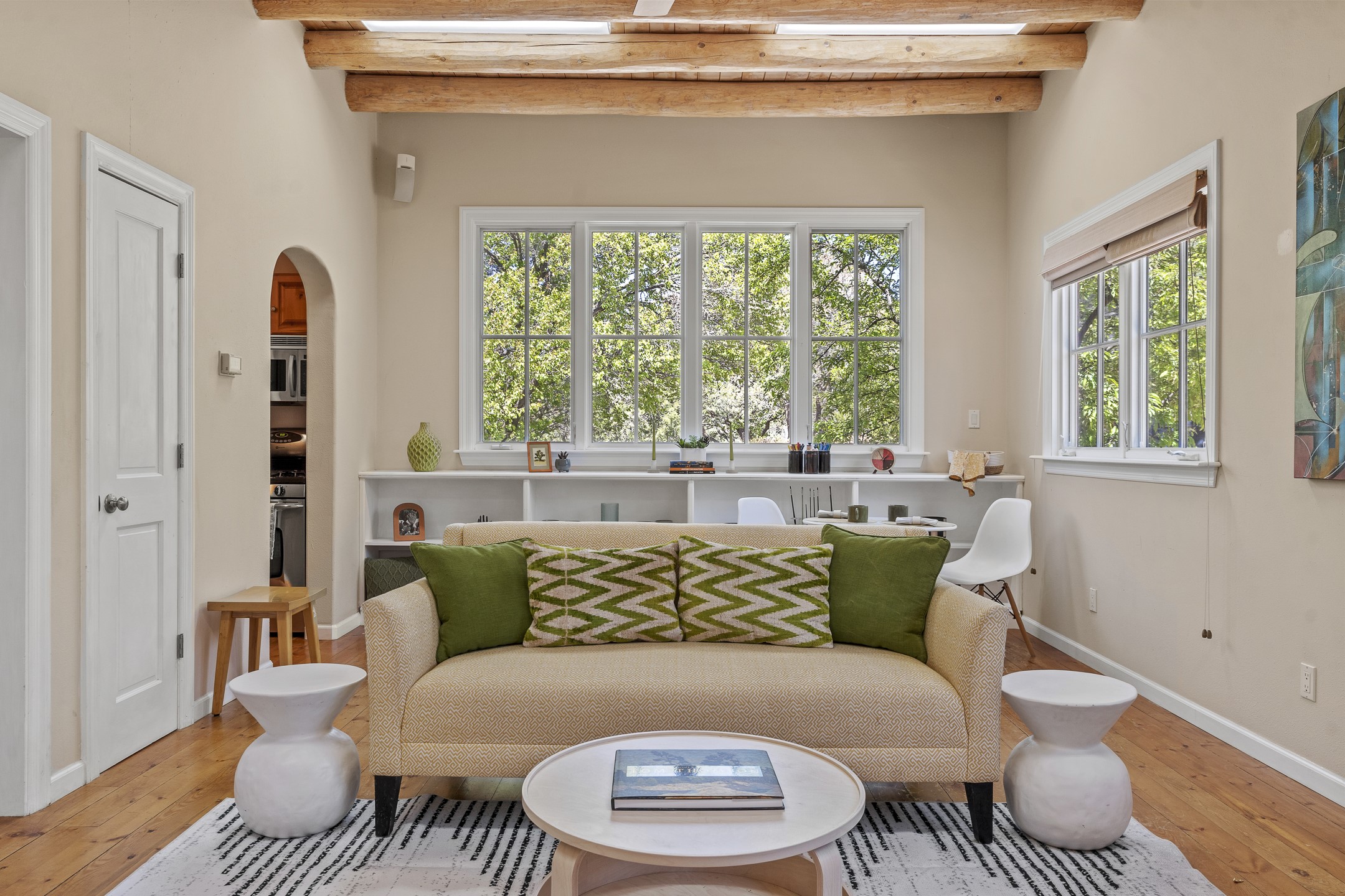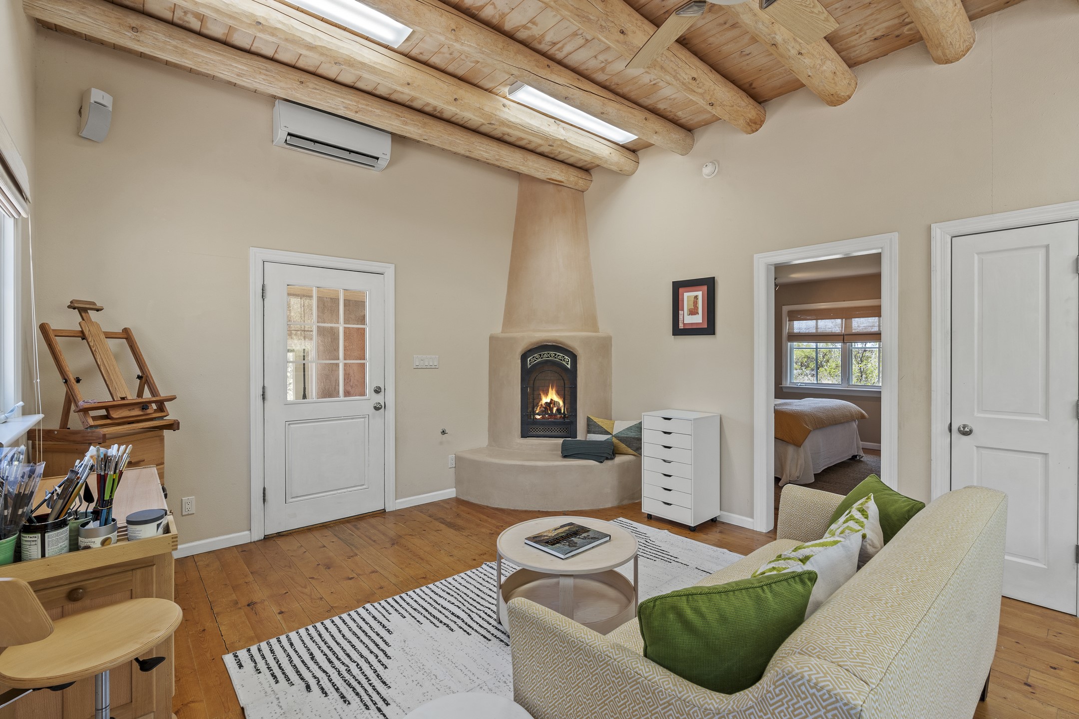 Beautifully renovated and reimagined in 2017, this exceptional property offers a main residence with 3 bedrooms and 2.5 baths, a detached 1-bedroom/1-bath casita with a full kitchen and 3/4 bath, and a versatile studio/gym. Behind a private walled courtyard, the home welcomes you with warmth and charm. Inside, the elegant living room features a stone fireplace and tall ceilings with wooden beams, and the inviting dining room continues with a classic Kiva and French sliding doors opening to a covered portal and expansive .6 acre lot. A bright and open secondary living area sits just off the kitchen, creating a connected flow for everyday living and entertaining. The kitchen was reimagined for both form and function, featuring warm-toned cabinetry, granite countertops, expanded storage, and a six-burner Wolf range. Past the kitchen, a fews stops down lead to the laundry room with direct access to the 2 car garage, and a central hallway leads to the private bedroom wing. The primary suite offers a tranquil retreat, complete with a deep soaking tub, dual vanities, and a generous walk-in closet. Additional improvements include smooth plaster walls, a reconfigured guest and powder bath, upgraded electrical panel, windows, roof, furnace, and beautifully refinished wood floors. Mini-split systems have been added to the guesthouse and studio for year-round comfort and the drip irrigation has a brand new controller.Located in a coveted residential neighborhood with a rare in-town private well, this singular property backs to the scenic Arroyo Chamiso and offers direct access to the Dale Ball Trails near St. John's College. The Casita and studio provide elevated flexibility, whether as a home office, creative retreat, guest/ family quarters or income-producing rental.Set within the sought-after Wood Gormley School District and just minutes from downtown, this is a rare blend of charm, versatility, and design.