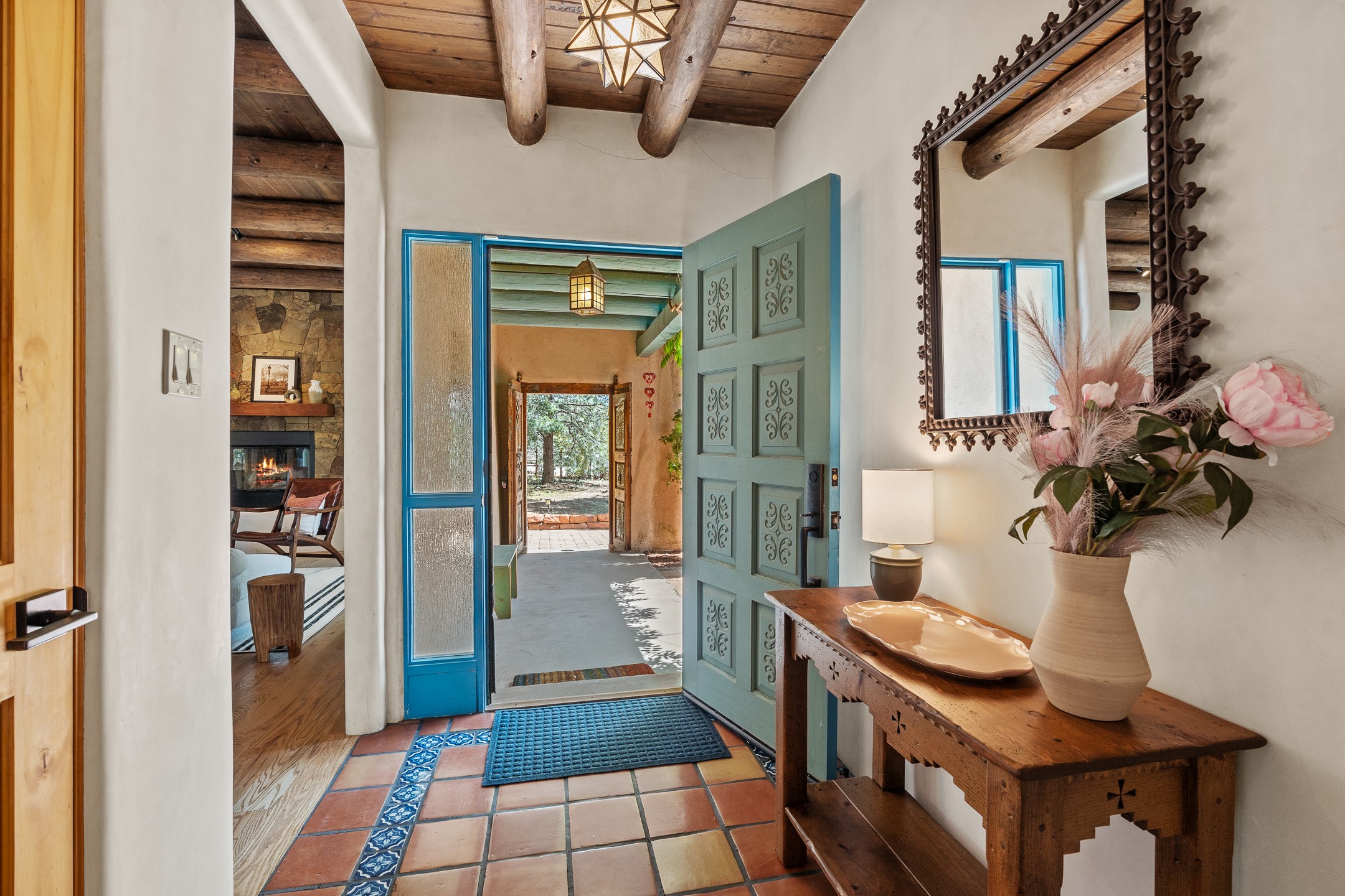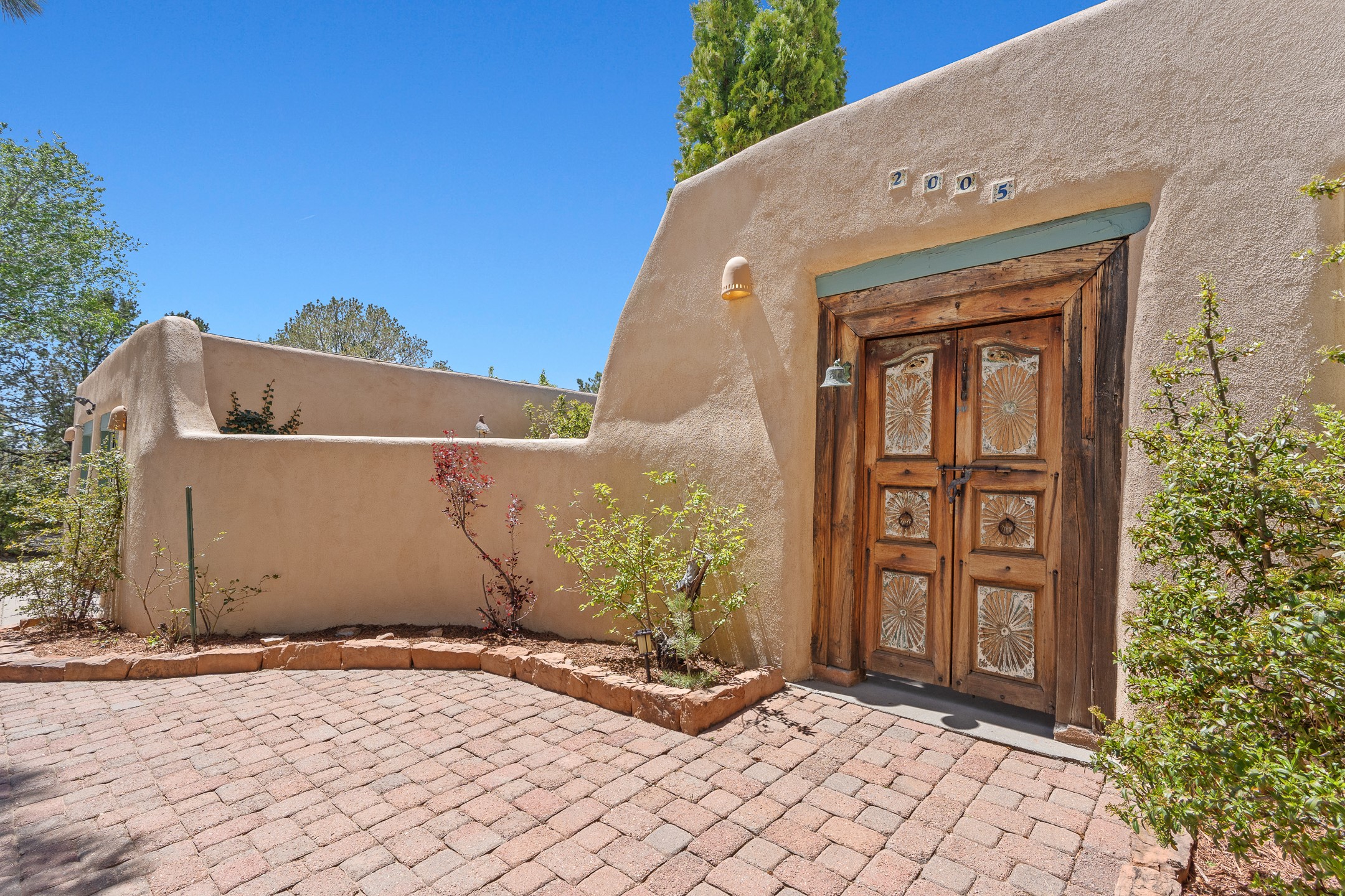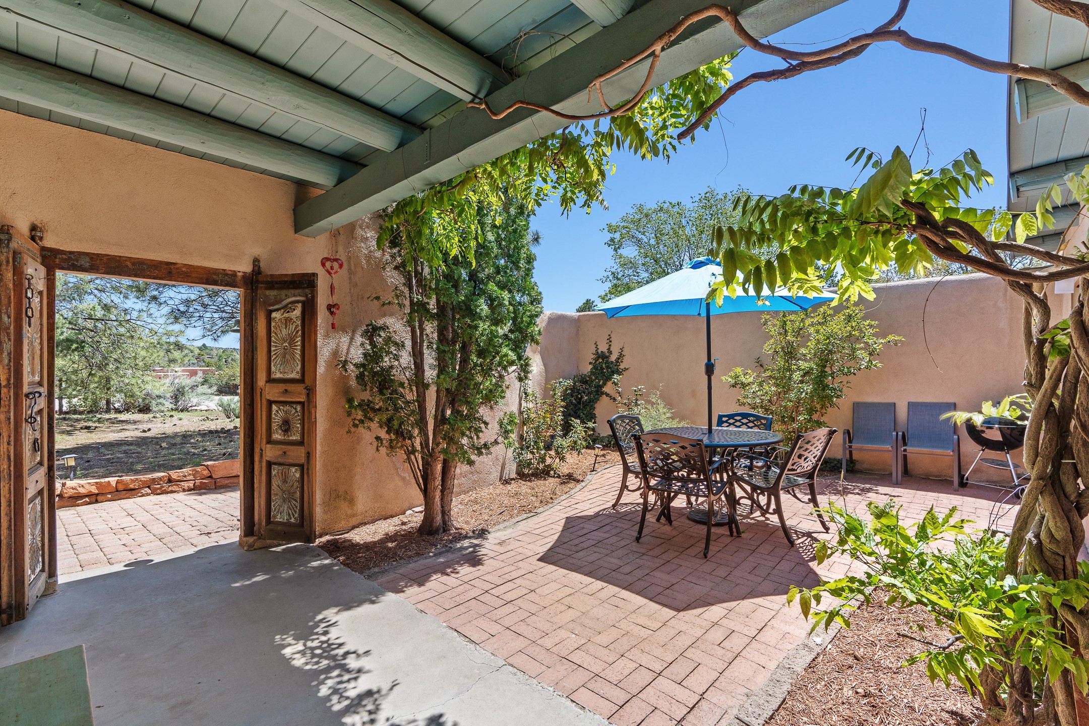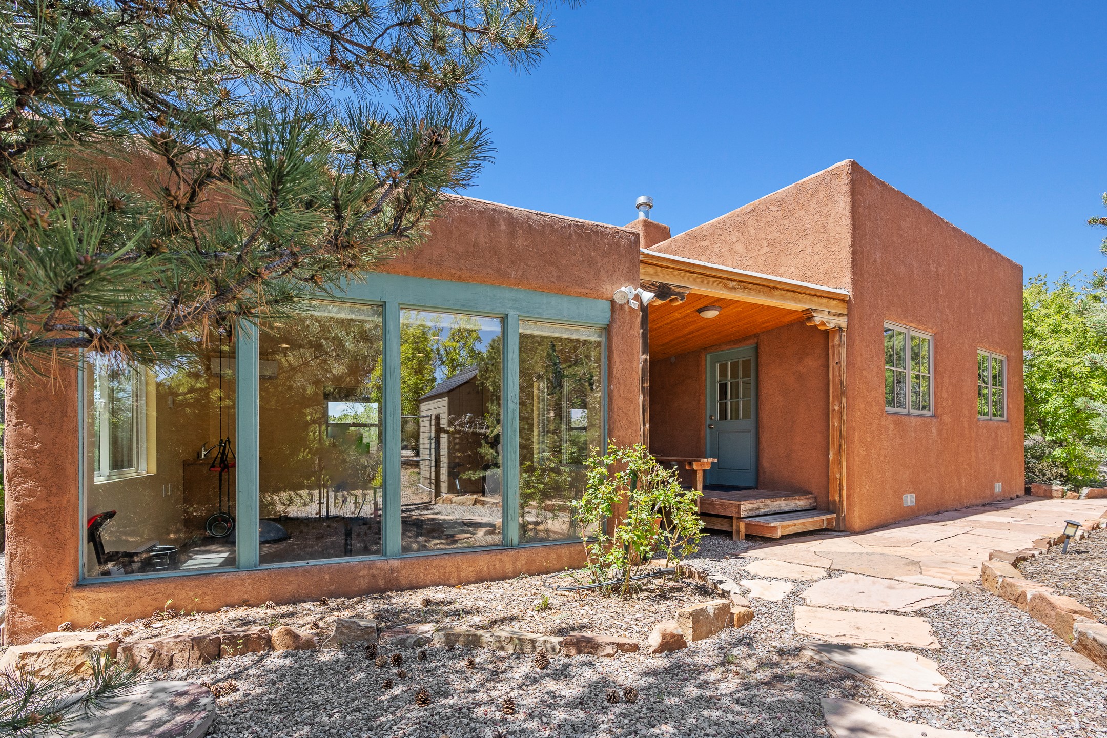 Beautifully renovated and reimagined in 2017, this exceptional property offers a main residence with 3 bedrooms and 2.5 baths, a detached 1-bedroom/1-bath casita with a full kitchen and 3/4 bath, and a versatile studio/gym. Behind a private walled courtyard, the home welcomes you with warmth and charm. Inside, the elegant living room features a stone fireplace and tall ceilings with wooden beams, and the inviting dining room continues with a classic Kiva and French sliding doors opening to a covered portal and expansive .6 acre lot. A bright and open secondary living area sits just off the kitchen, creating a connected flow for everyday living and entertaining. The kitchen was reimagined for both form and function, featuring warm-toned cabinetry, granite countertops, expanded storage, and a six-burner Wolf range. Past the kitchen, a fews stops down lead to the laundry room with direct access to the 2 car garage, and a central hallway leads to the private bedroom wing. The primary suite offers a tranquil retreat, complete with a deep soaking tub, dual vanities, and a generous walk-in closet. Additional improvements include smooth plaster walls, a reconfigured guest and powder bath, upgraded electrical panel, windows, roof, furnace, and beautifully refinished wood floors. Mini-split systems have been added to the guesthouse and studio for year-round comfort and the drip irrigation has a brand new controller.Located in a coveted residential neighborhood with a rare in-town private well, this singular property backs to the scenic Arroyo Chamiso and offers direct access to the Dale Ball Trails near St. John's College. The Casita and studio provide elevated flexibility, whether as a home office, creative retreat, guest/ family quarters or income-producing rental.Set within the sought-after Wood Gormley School District and just minutes from downtown, this is a rare blend of charm, versatility, and design.