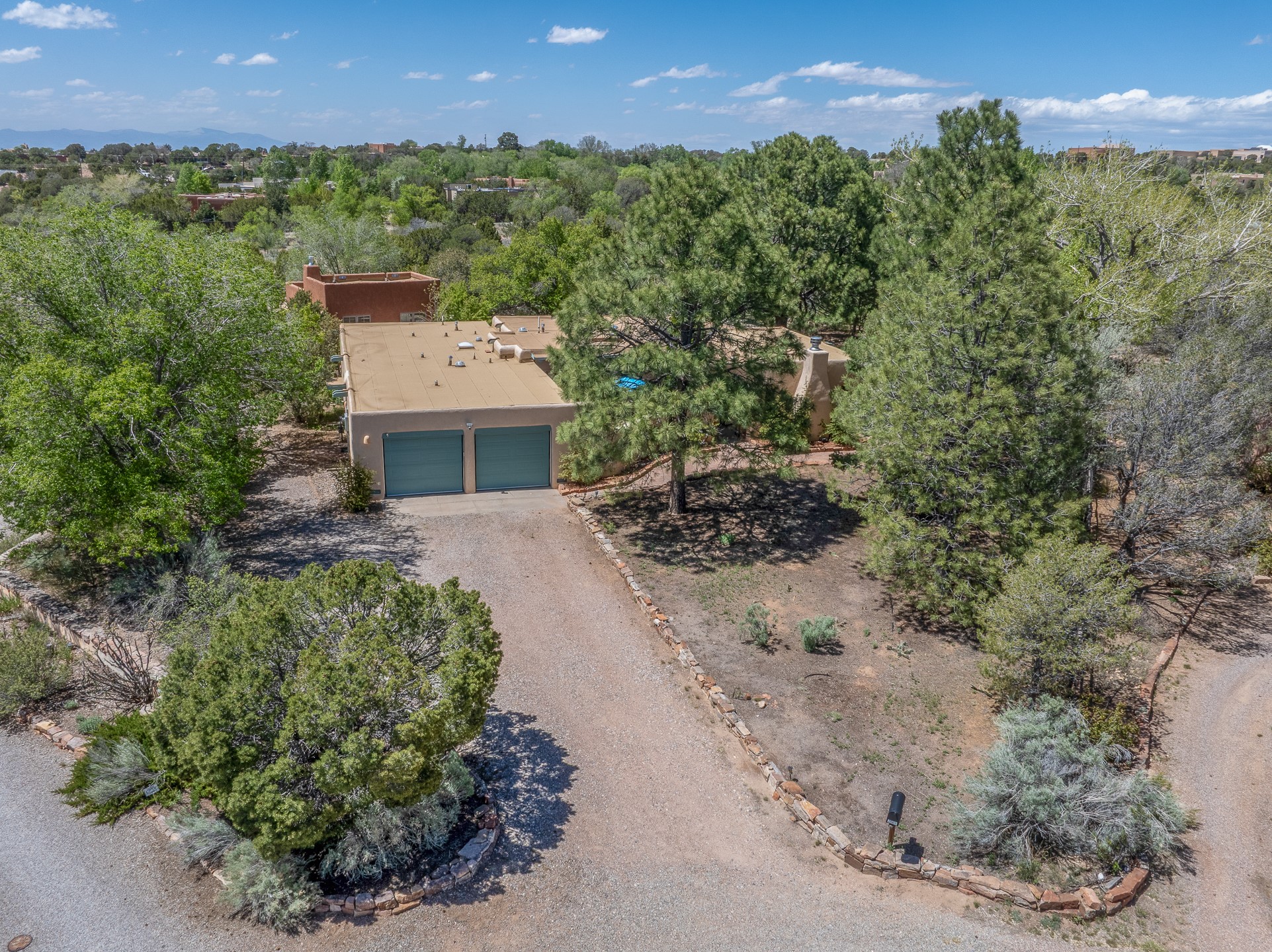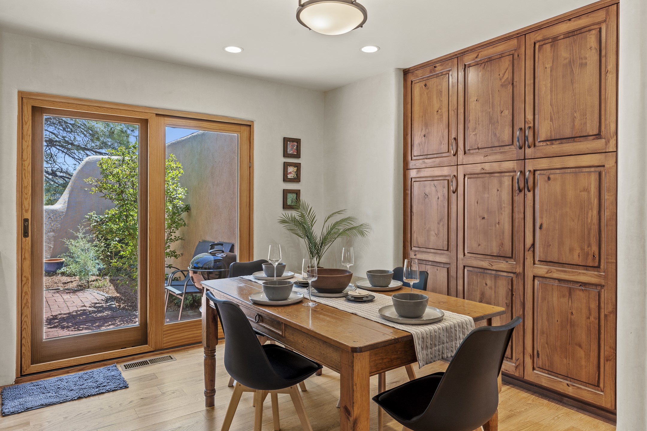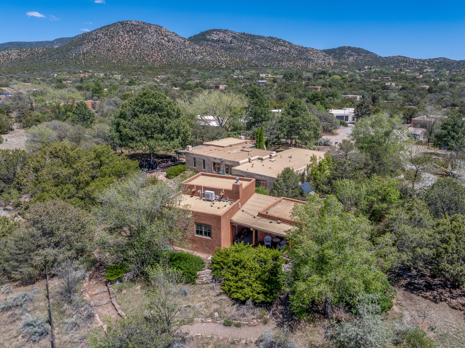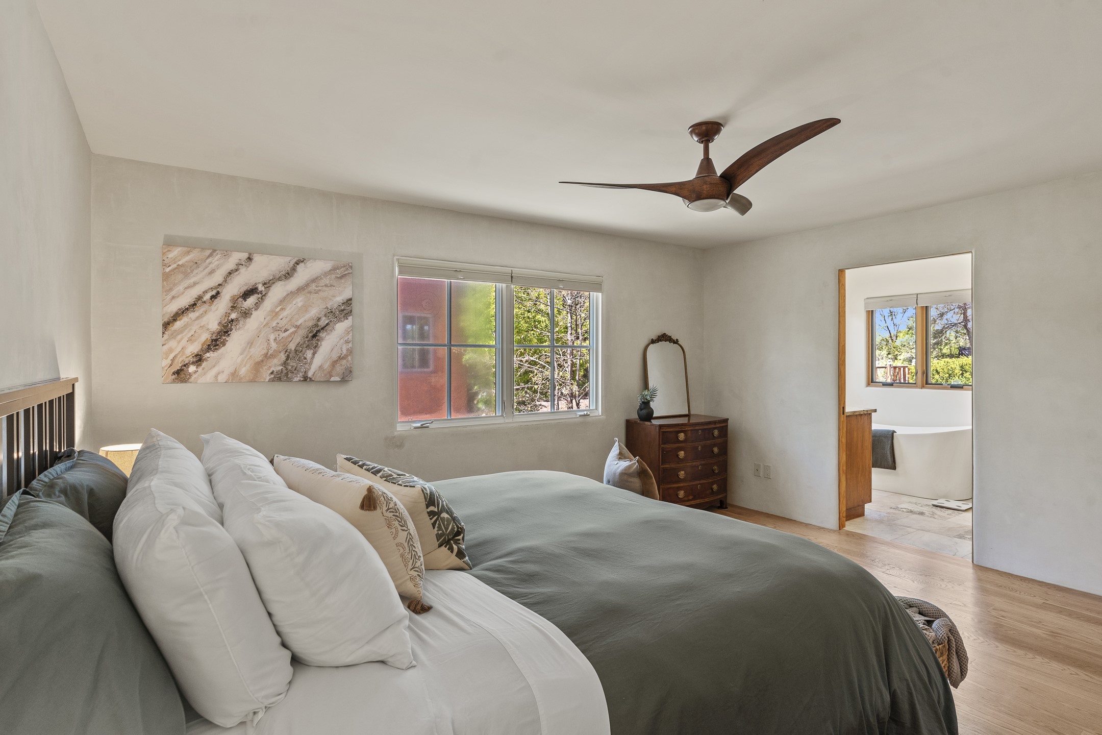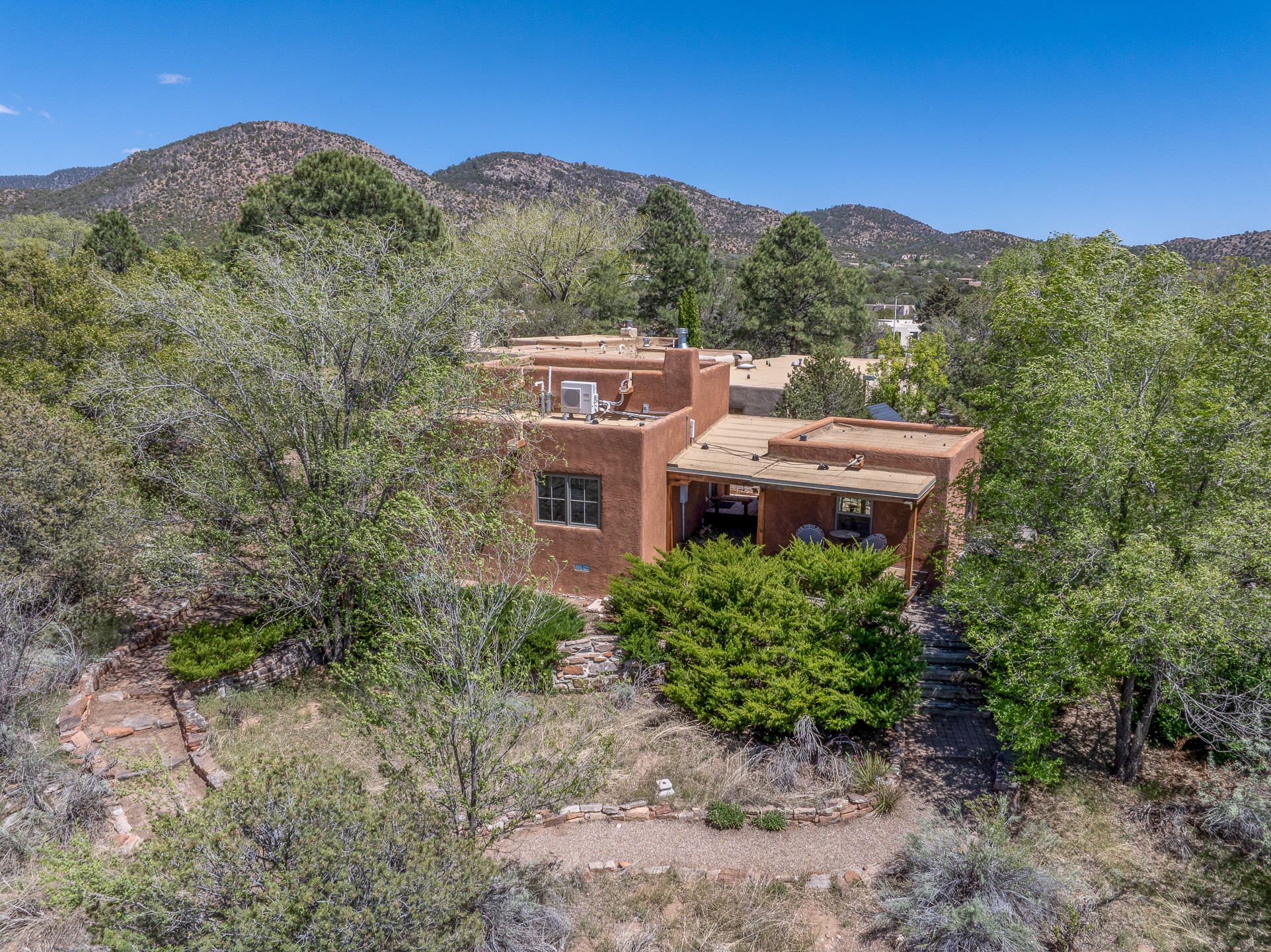 Beautifully renovated and reimagined in 2017, this exceptional property offers a main residence with 3 bedrooms and 2.5 baths, a detached 1-bedroom/1-bath casita with a full kitchen and 3/4 bath, and a versatile studio/gym. Behind a private walled courtyard, the home welcomes you with warmth and charm. Inside, the elegant living room features a stone fireplace and tall ceilings with wooden beams, and the inviting dining room continues with a classic Kiva and French sliding doors opening to a covered portal and expansive .6 acre lot. A bright and open secondary living area sits just off the kitchen, creating a connected flow for everyday living and entertaining. The kitchen was reimagined for both form and function, featuring warm-toned cabinetry, granite countertops, expanded storage, and a six-burner Wolf range. Past the kitchen, a fews stops down lead to the laundry room with direct access to the 2 car garage, and a central hallway leads to the private bedroom wing. The primary suite offers a tranquil retreat, complete with a deep soaking tub, dual vanities, and a generous walk-in closet. Additional improvements include smooth plaster walls, a reconfigured guest and powder bath, upgraded electrical panel, windows, roof, furnace, and beautifully refinished wood floors. Mini-split systems have been added to the guesthouse and studio for year-round comfort and the drip irrigation has a brand new controller.Located in a coveted residential neighborhood with a rare in-town private well, this singular property backs to the scenic Arroyo Chamiso and offers direct access to the Dale Ball Trails near St. John's College. The Casita and studio provide elevated flexibility, whether as a home office, creative retreat, guest/ family quarters or income-producing rental.Set within the sought-after Wood Gormley School District and just minutes from downtown, this is a rare blend of charm, versatility, and design.