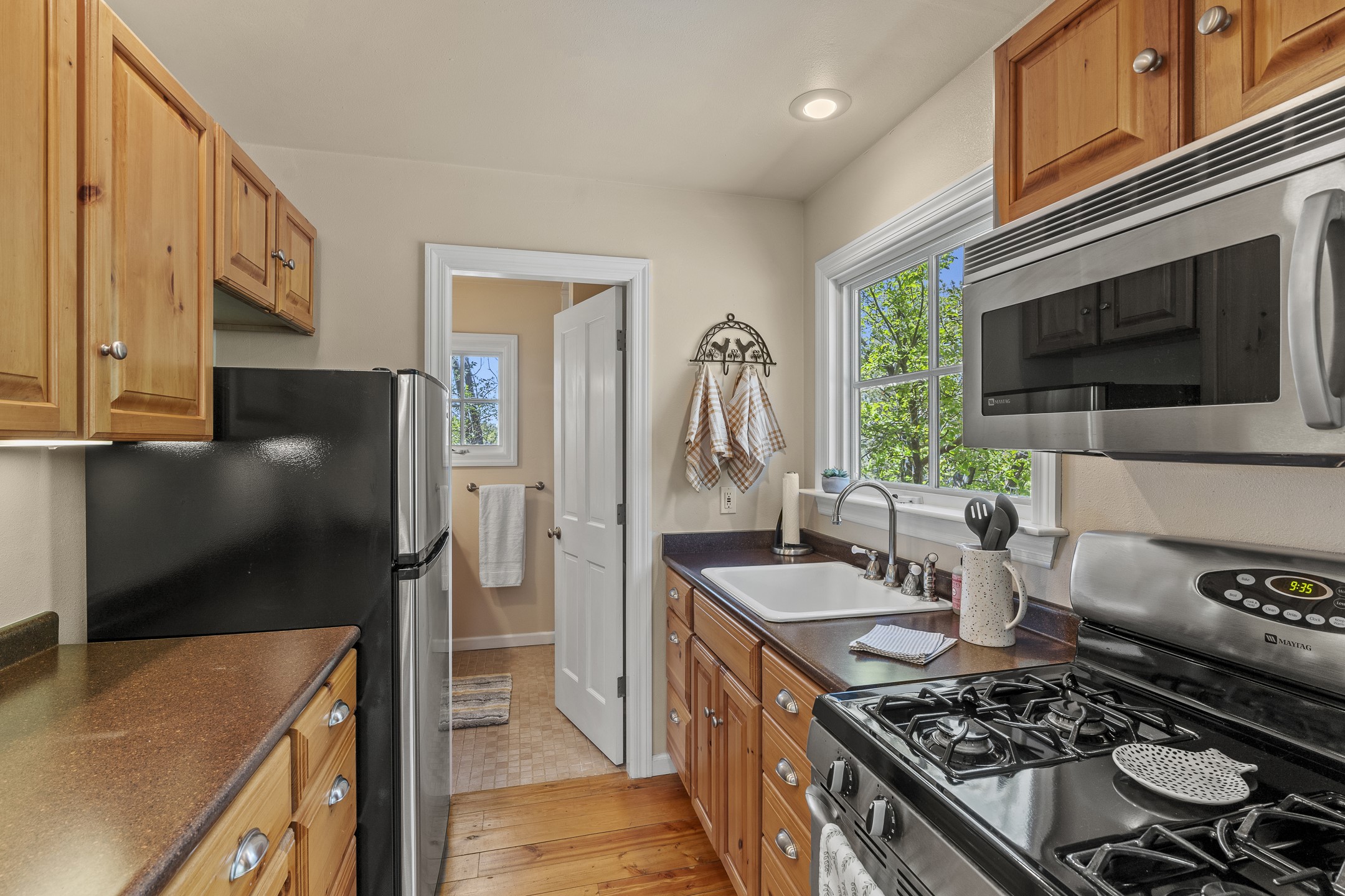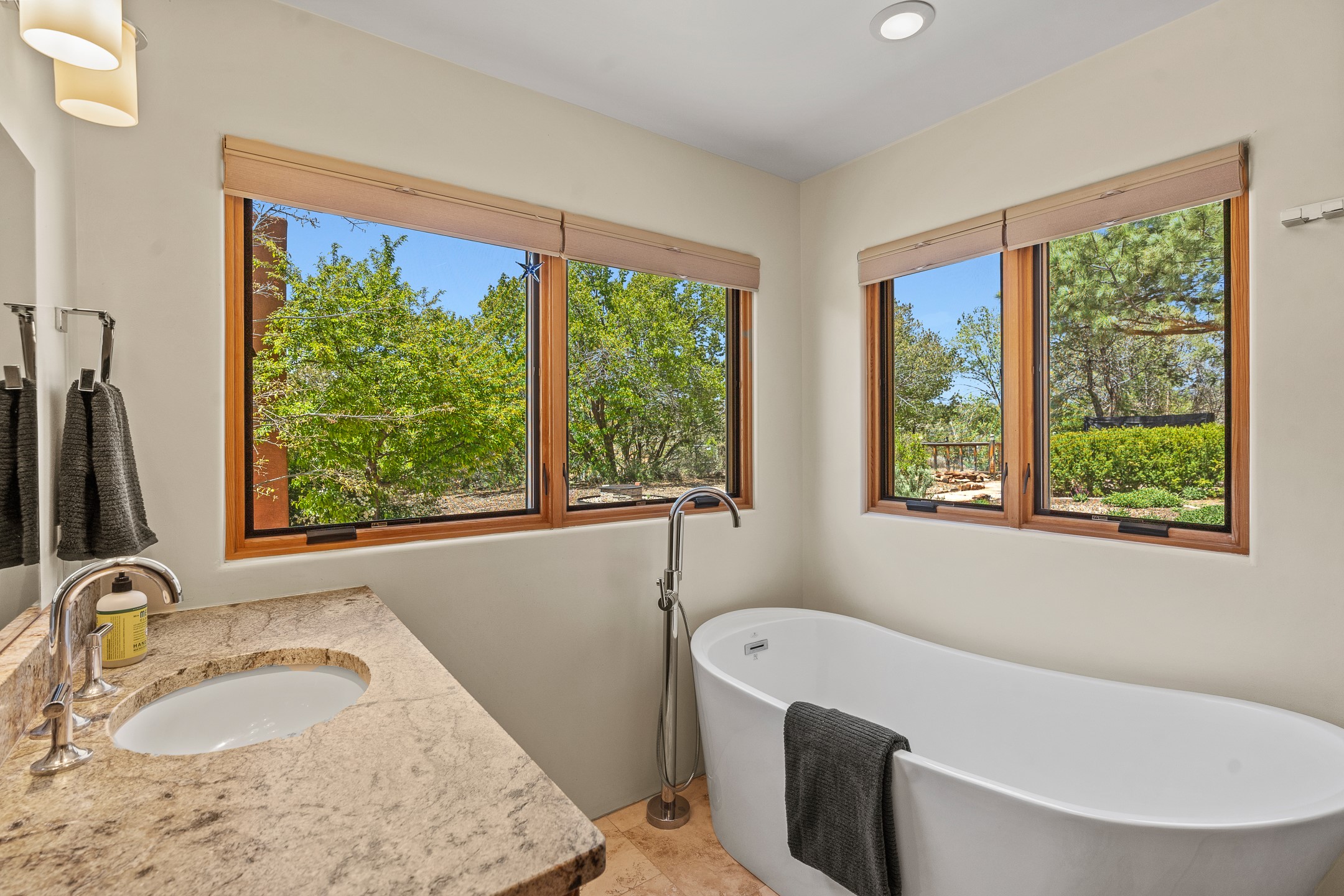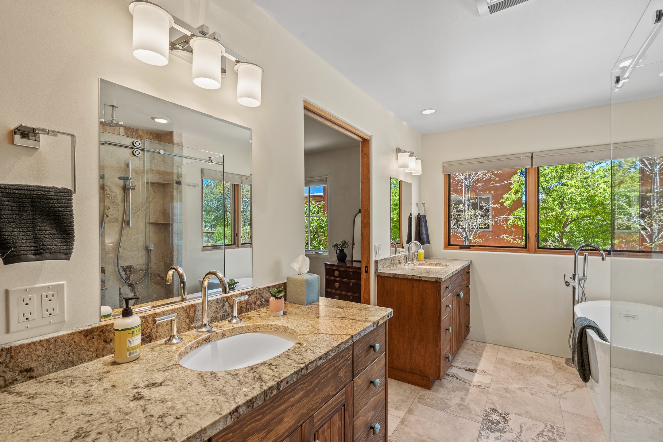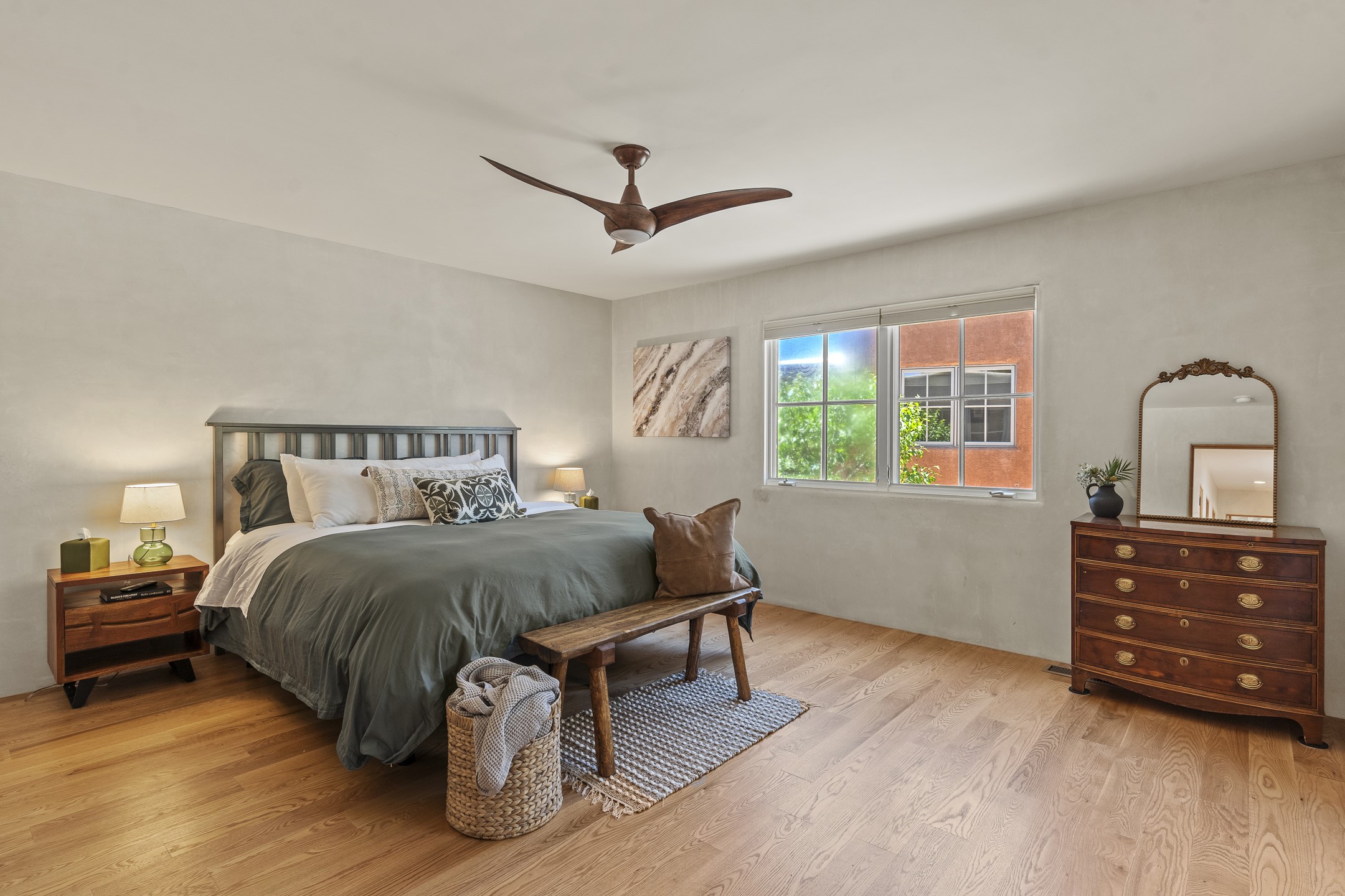 Beautifully renovated and reimagined in 2017, this exceptional property offers a main residence with 3 bedrooms and 2.5 baths, a detached 1-bedroom/1-bath casita with a full kitchen and 3/4 bath, and a versatile studio/gym. Behind a private walled courtyard, the home welcomes you with warmth and charm. Inside, the elegant living room features a stone fireplace and tall ceilings with wooden beams, and the inviting dining room continues with a classic Kiva and French sliding doors opening to a covered portal and expansive .6 acre lot. A bright and open secondary living area sits just off the kitchen, creating a connected flow for everyday living and entertaining. The kitchen was reimagined for both form and function, featuring warm-toned cabinetry, granite countertops, expanded storage, and a six-burner Wolf range. Past the kitchen, a fews stops down lead to the laundry room with direct access to the 2 car garage, and a central hallway leads to the private bedroom wing. The primary suite offers a tranquil retreat, complete with a deep soaking tub, dual vanities, and a generous walk-in closet. Additional improvements include smooth plaster walls, a reconfigured guest and powder bath, upgraded electrical panel, windows, roof, furnace, and beautifully refinished wood floors. Mini-split systems have been added to the guesthouse and studio for year-round comfort and the drip irrigation has a brand new controller.Located in a coveted residential neighborhood with a rare in-town private well, this singular property backs to the scenic Arroyo Chamiso and offers direct access to the Dale Ball Trails near St. John's College. The Casita and studio provide elevated flexibility, whether as a home office, creative retreat, guest/ family quarters or income-producing rental.Set within the sought-after Wood Gormley School District and just minutes from downtown, this is a rare blend of charm, versatility, and design.