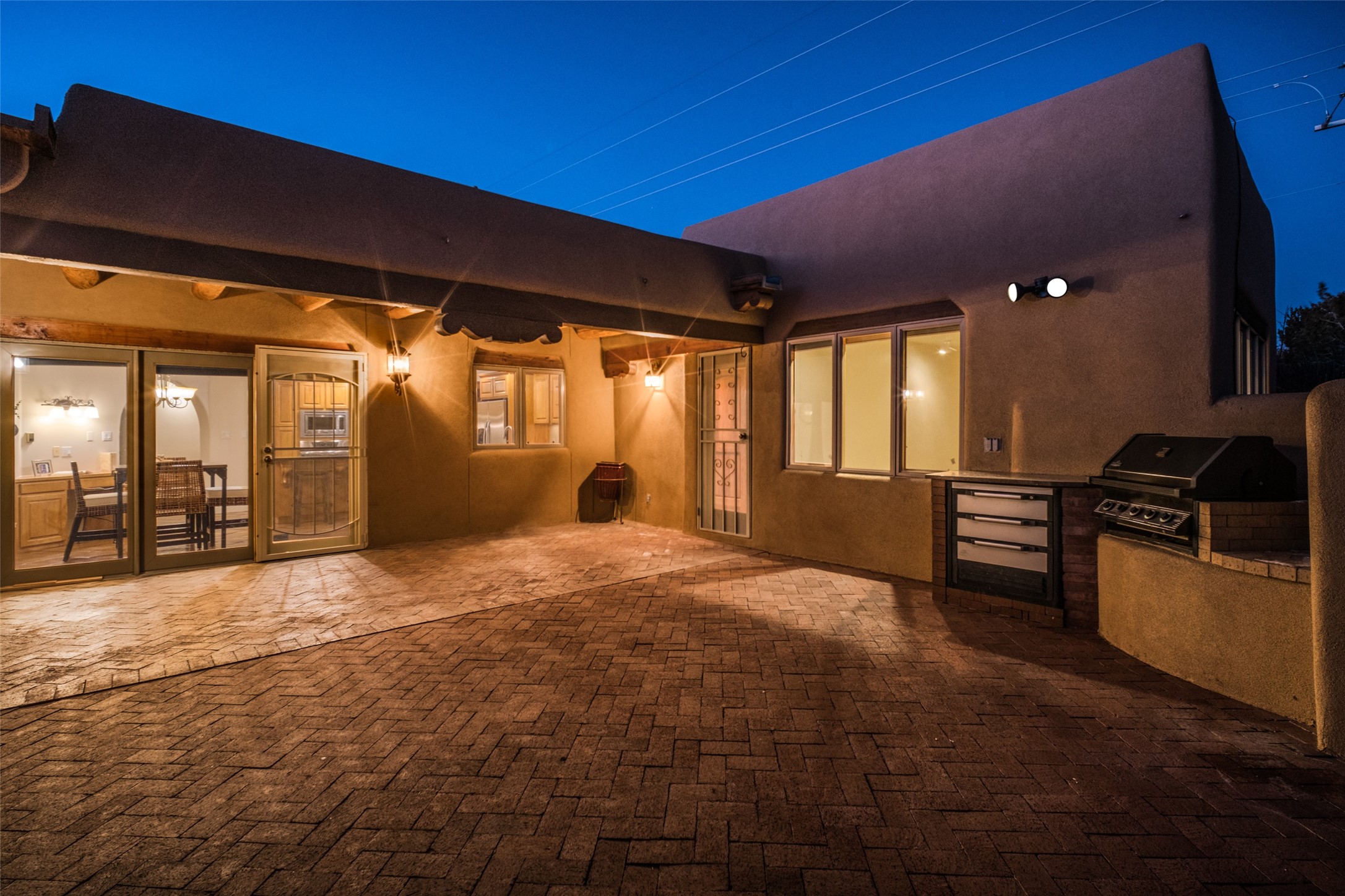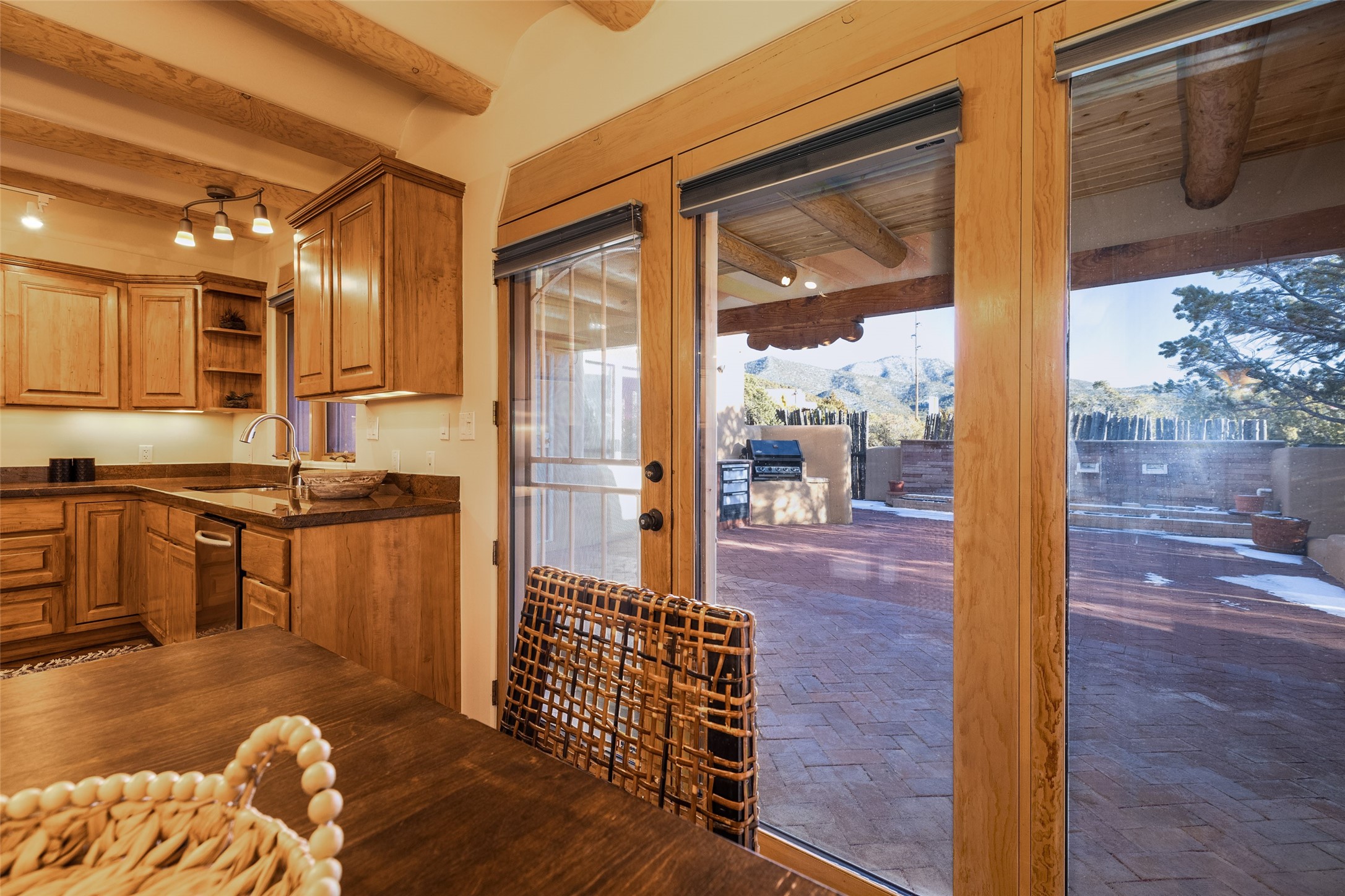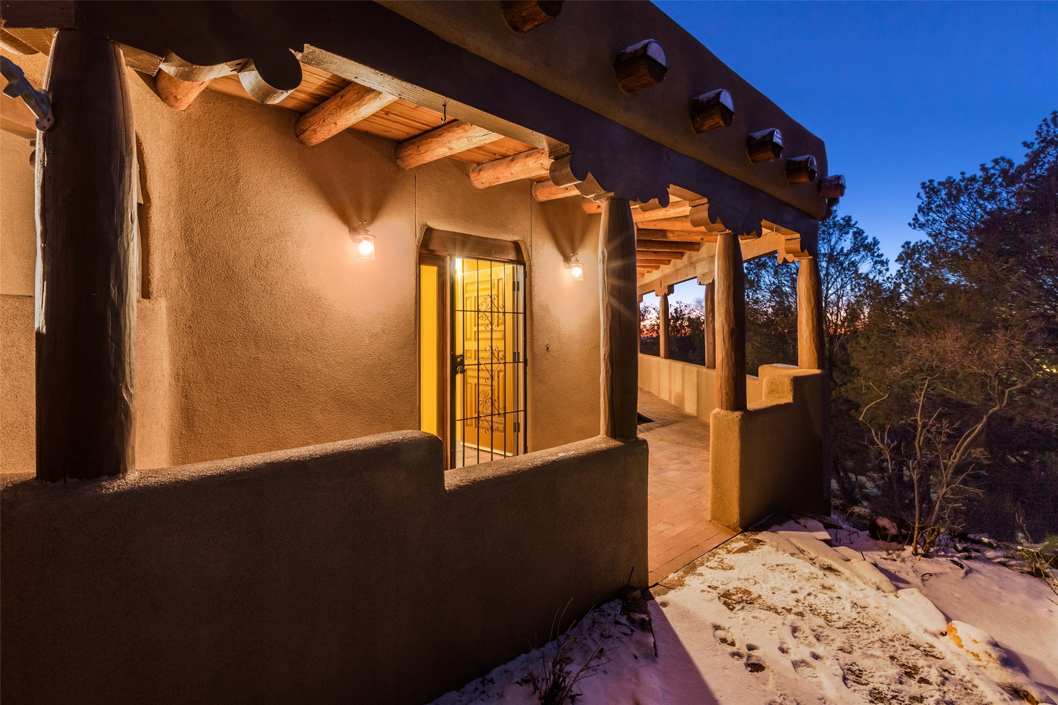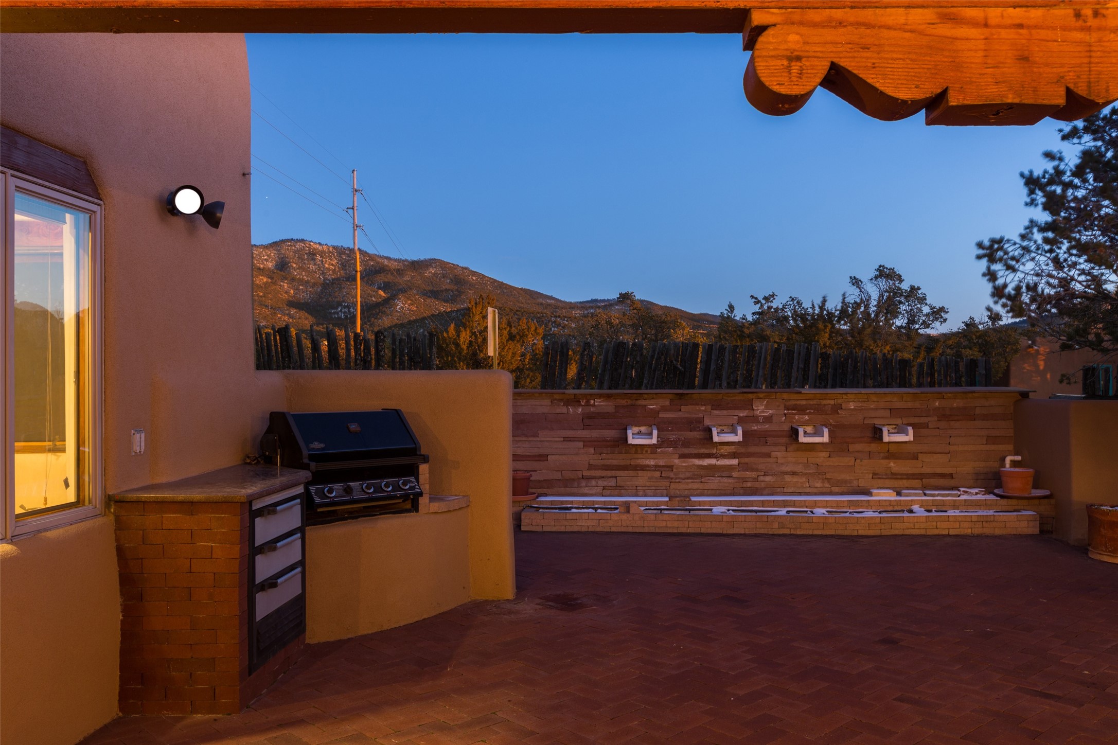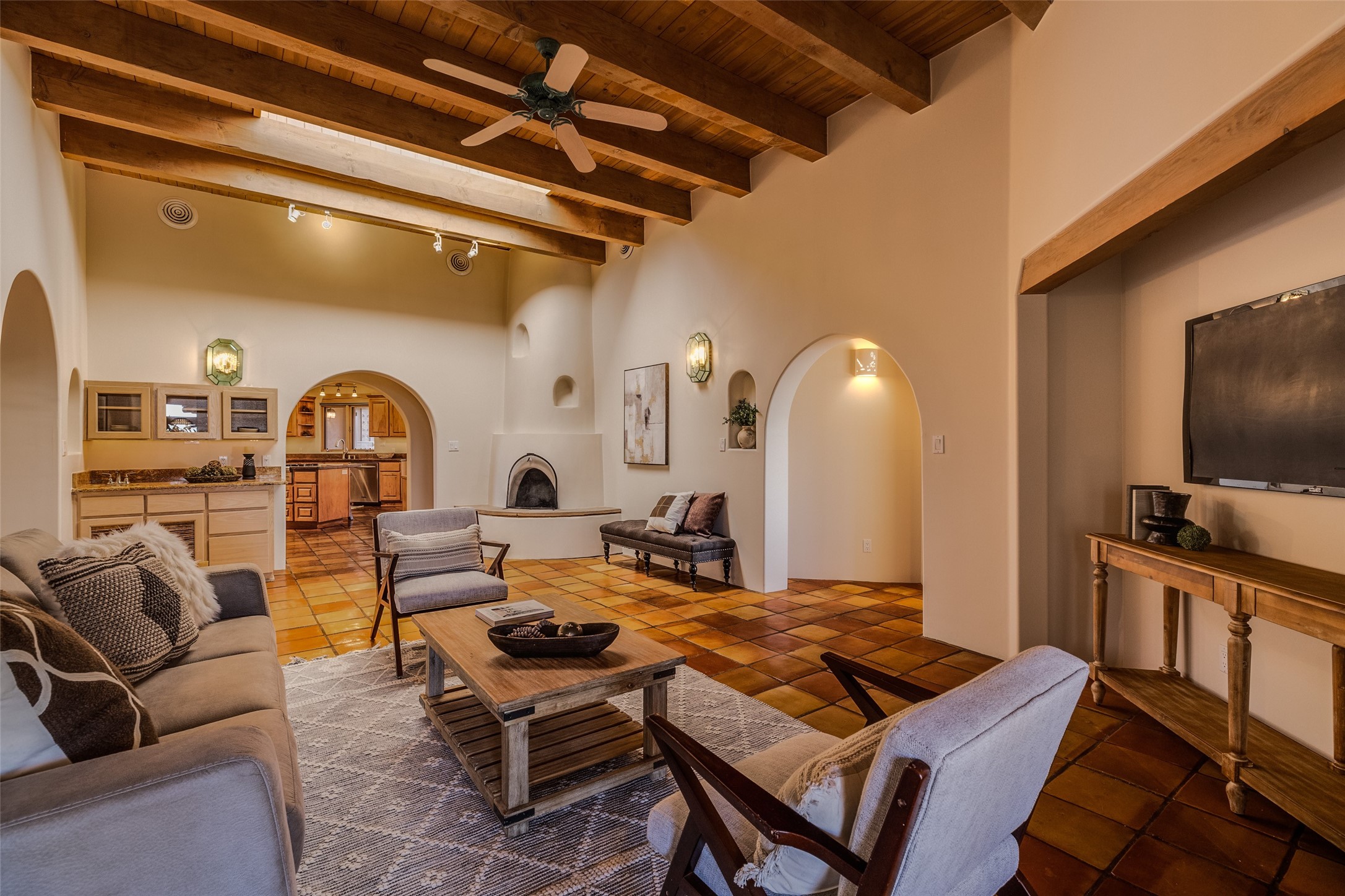 Discover your dream home in Santa Fe, nestled in the highly sought-after Las Barrancas neighborhood, just 2 miles from downtown Santa Fe. Enjoy easy access to renowned art galleries, fantastic dining, scenic hiking trails, and the famous Ten Thousand Waves Spa and restaurant! This custom-designed home features beautiful Santa Fe-style finishes, seamlessly blending comfort and elegance. The open floor plan is bathed in natural light and opens up to a wraparound portal, accessible from the main living areas. With 3 bedrooms, 2 bathrooms, 2 kiva fireplaces, and a versatile flex room that opens to the patio, this home is ideal for use as an office or studio. The spacious kitchen includes a cozy breakfast nook and desk area, with direct access to the covered portal for effortless outdoor entertaining. A double-car garage with potential for expansion and a gated front entry offer added convenience and security, making this the perfect "lock-and-leave" property.
