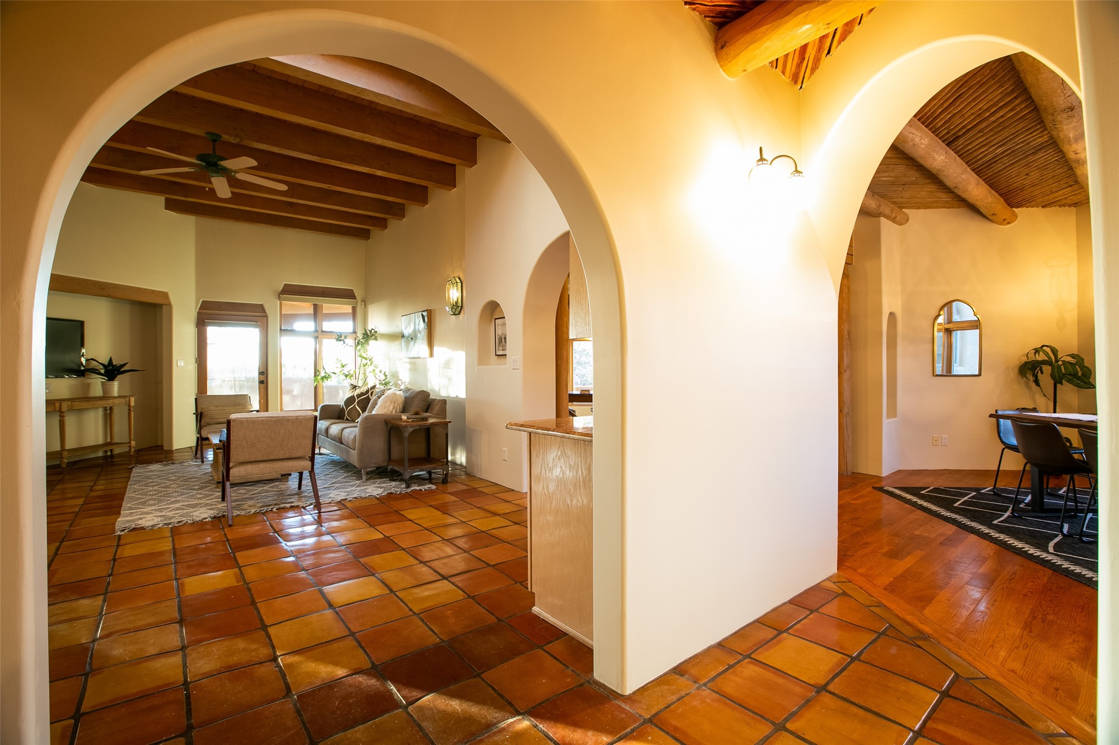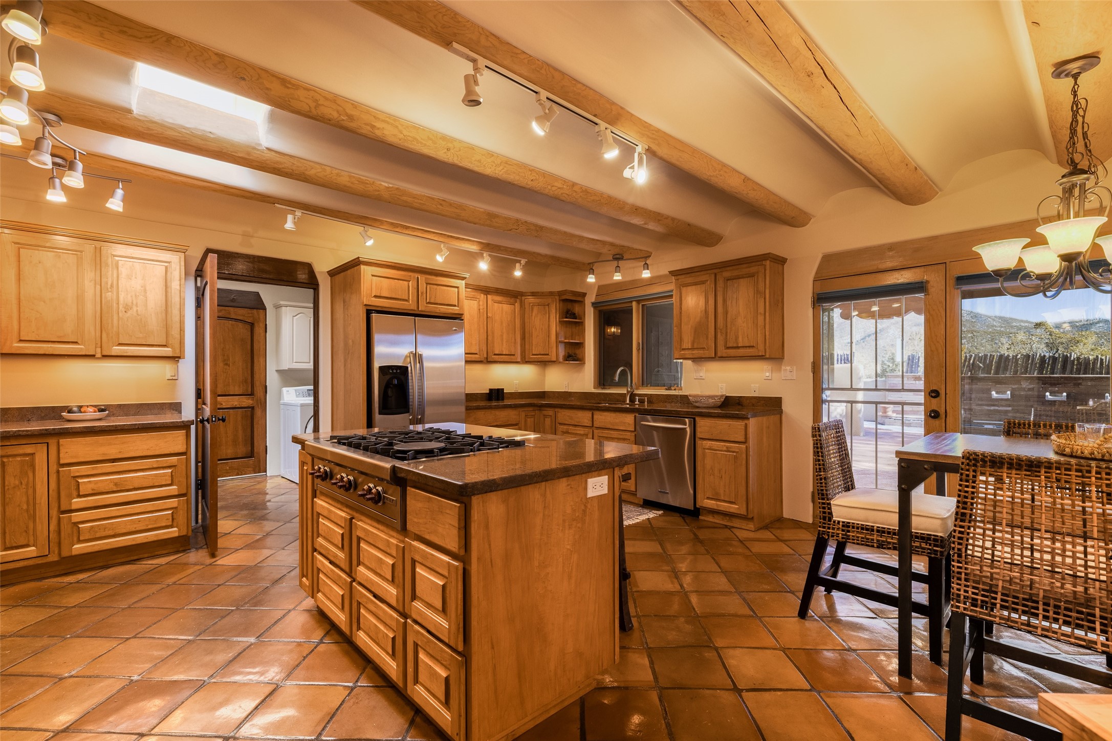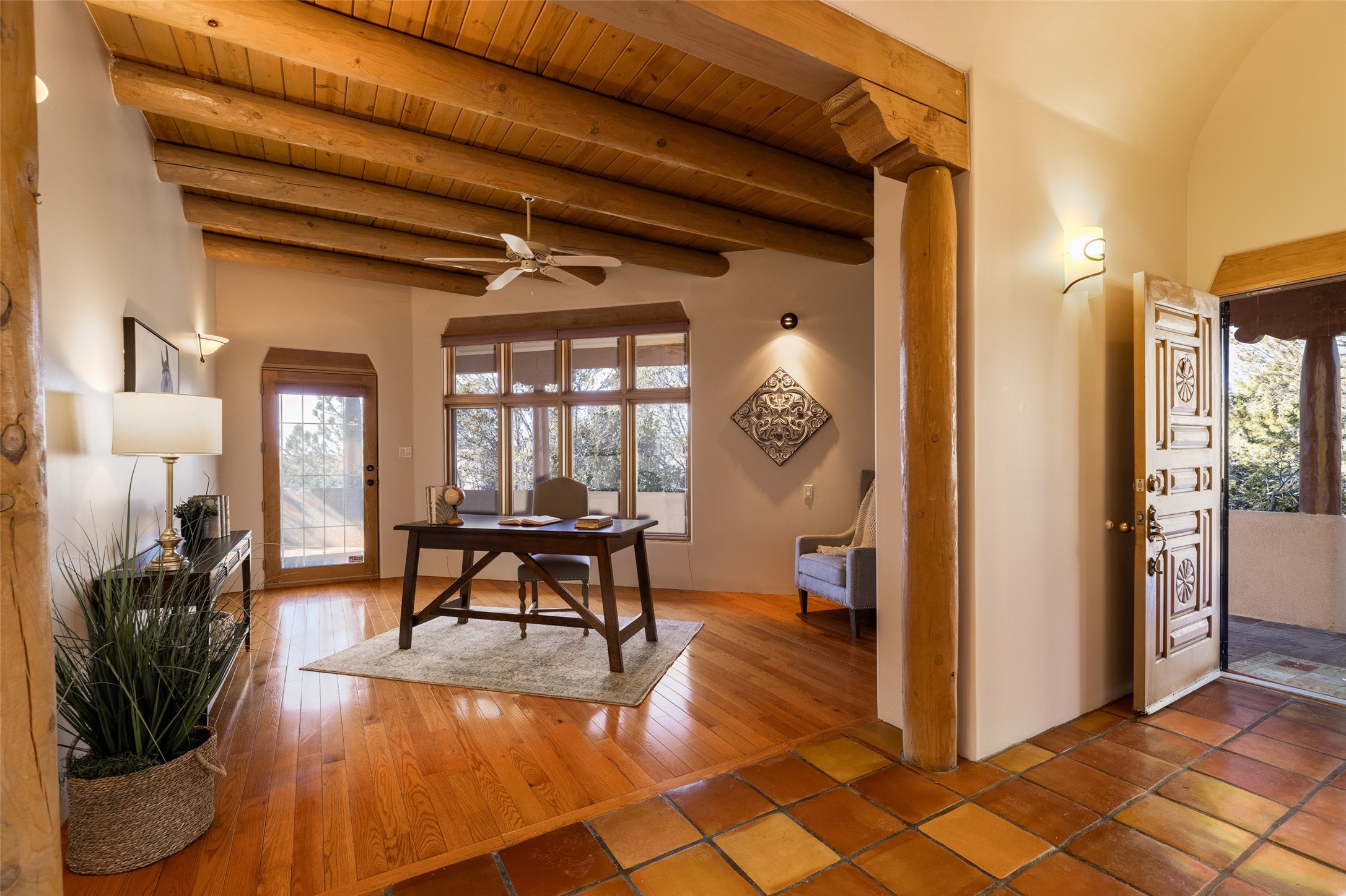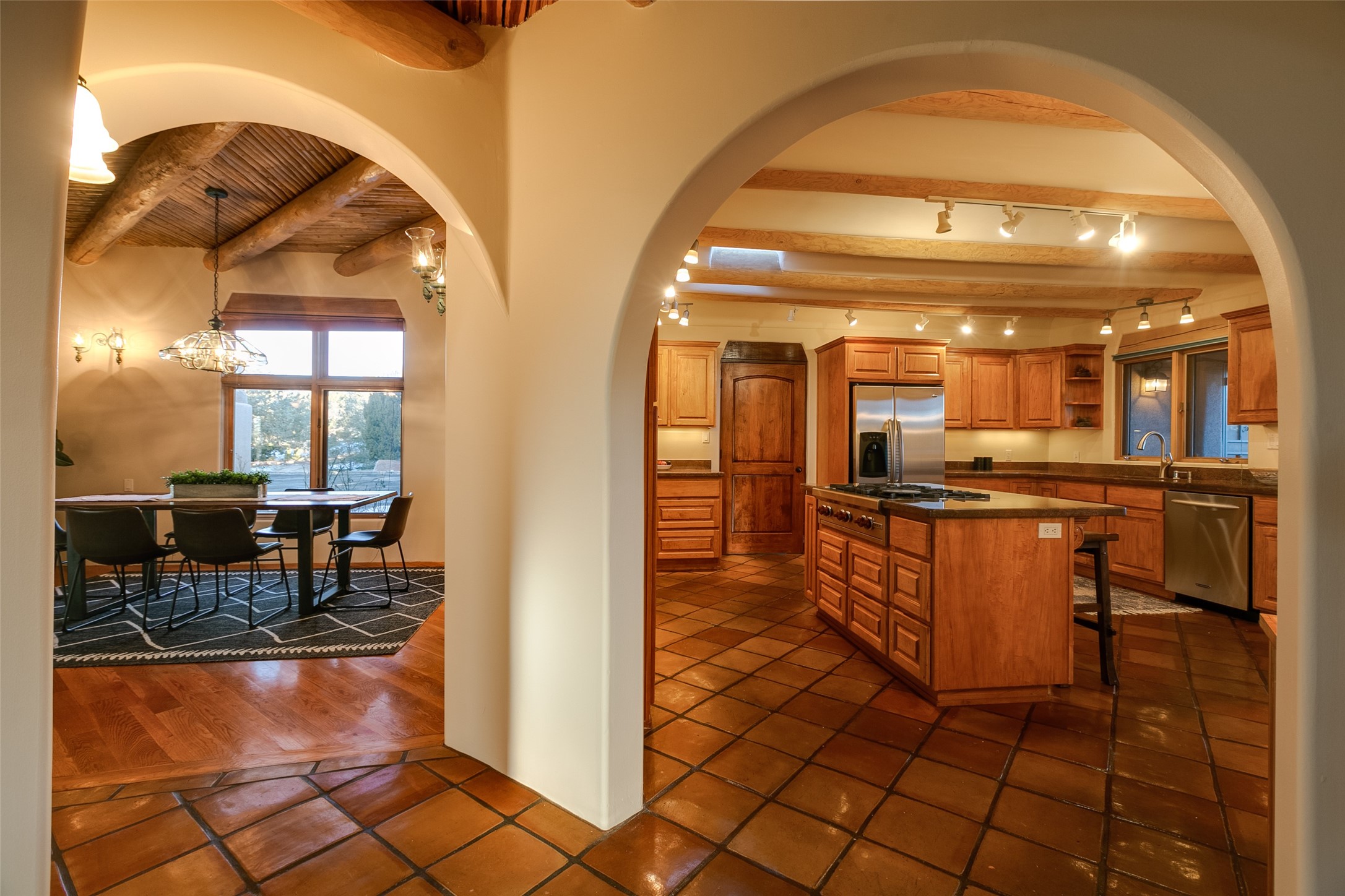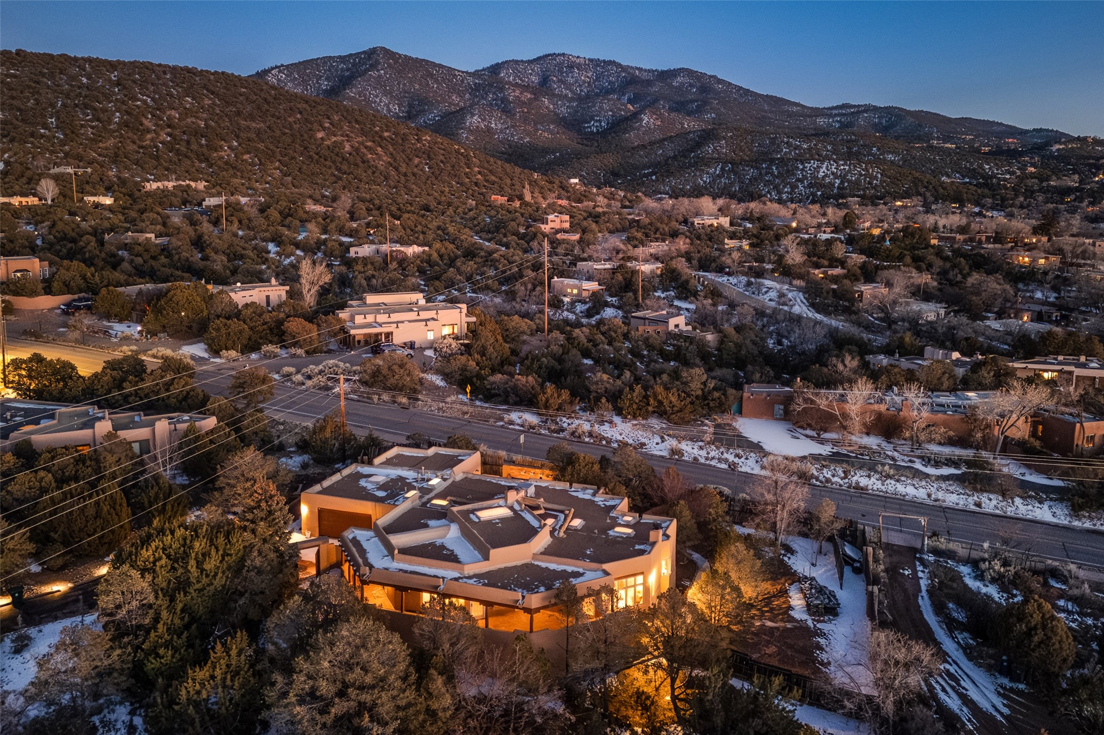 Discover your dream home in Santa Fe, nestled in the highly sought-after Las Barrancas neighborhood, just 2 miles from downtown Santa Fe. Enjoy easy access to renowned art galleries, fantastic dining, scenic hiking trails, and the famous Ten Thousand Waves Spa and restaurant! This custom-designed home features beautiful Santa Fe-style finishes, seamlessly blending comfort and elegance. The open floor plan is bathed in natural light and opens up to a wraparound portal, accessible from the main living areas. With 3 bedrooms, 2 bathrooms, 2 kiva fireplaces, and a versatile flex room that opens to the patio, this home is ideal for use as an office or studio. The spacious kitchen includes a cozy breakfast nook and desk area, with direct access to the covered portal for effortless outdoor entertaining. A double-car garage with potential for expansion and a gated front entry offer added convenience and security, making this the perfect "lock-and-leave" property.