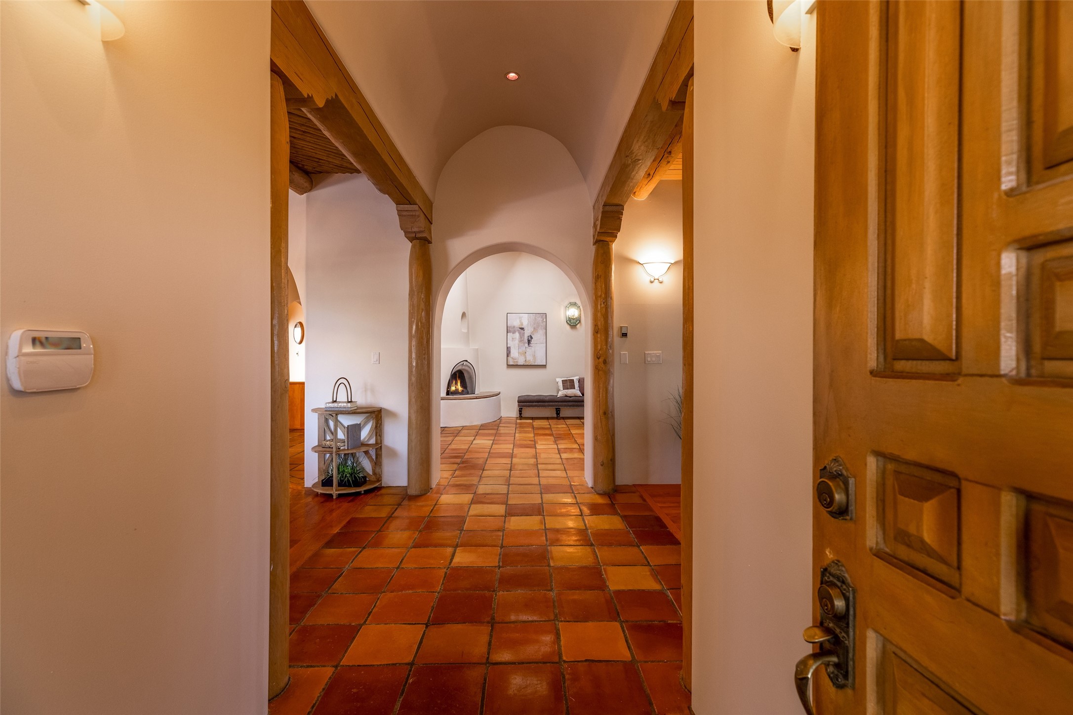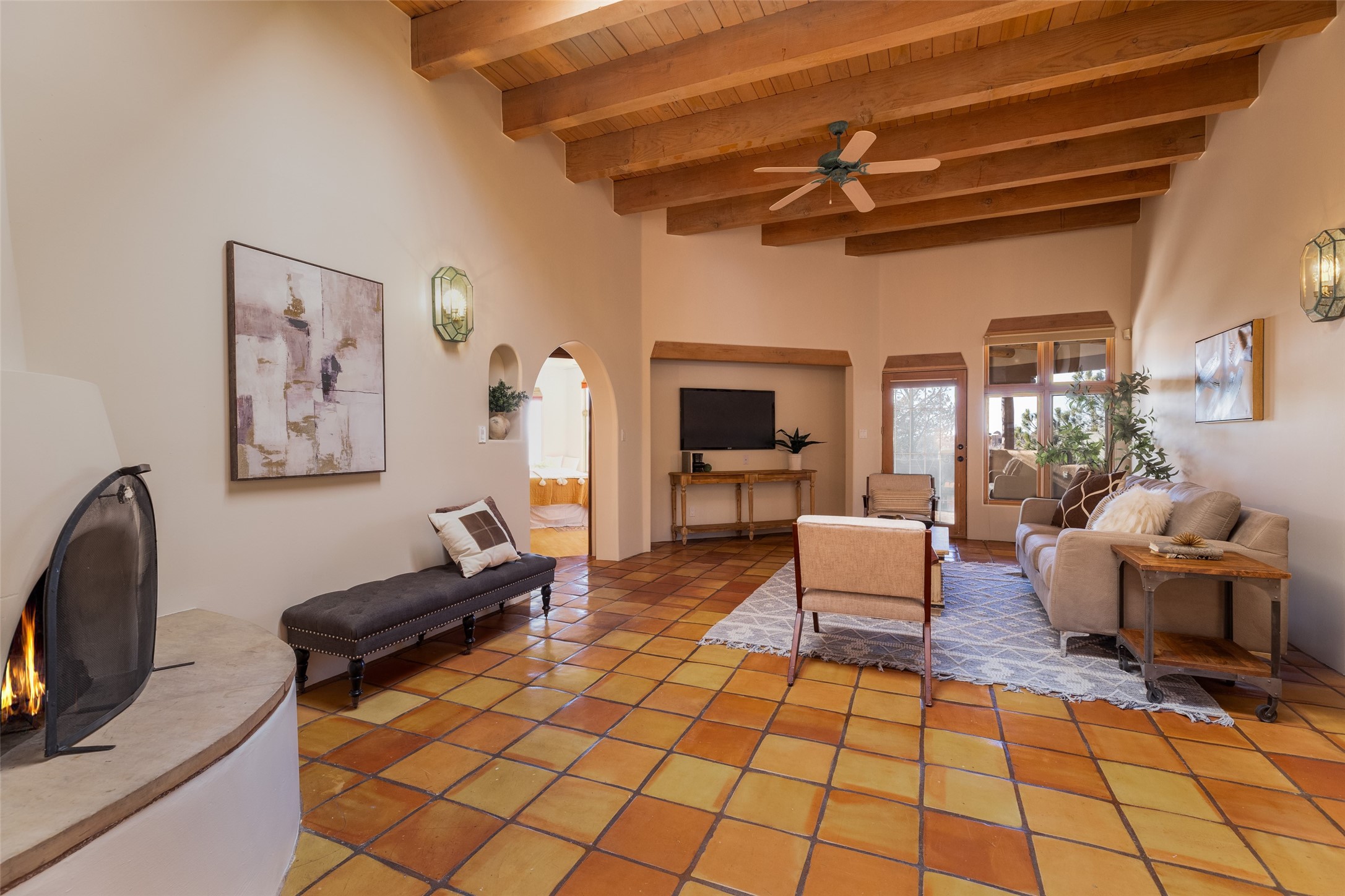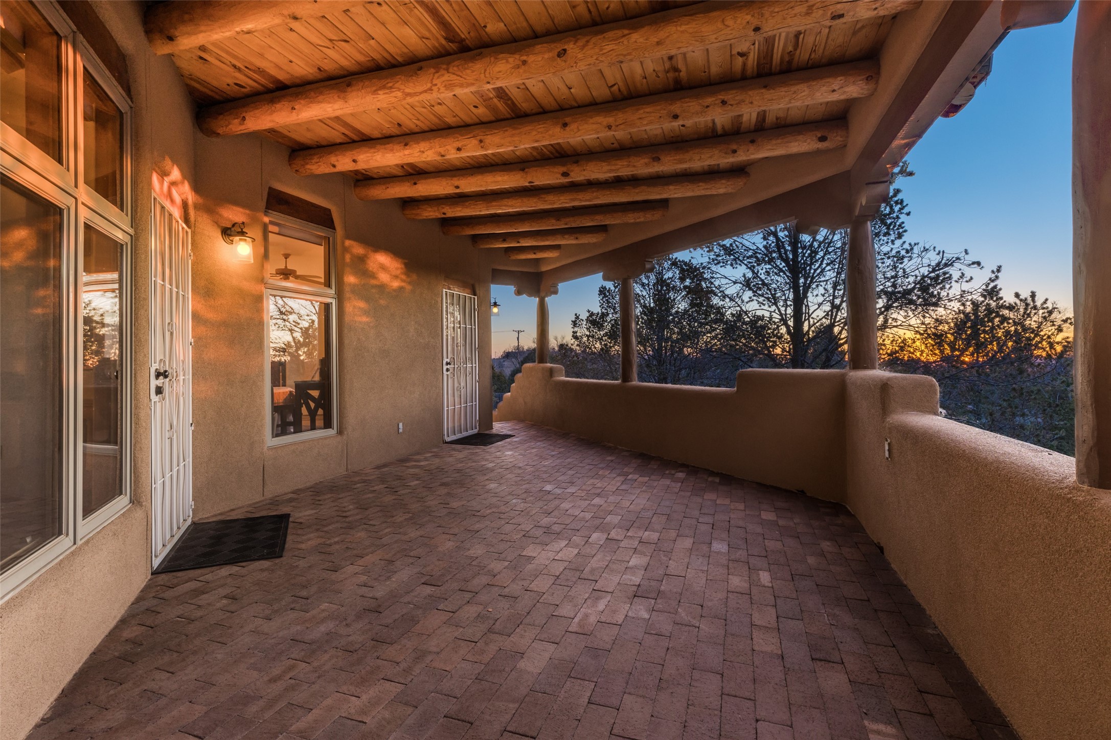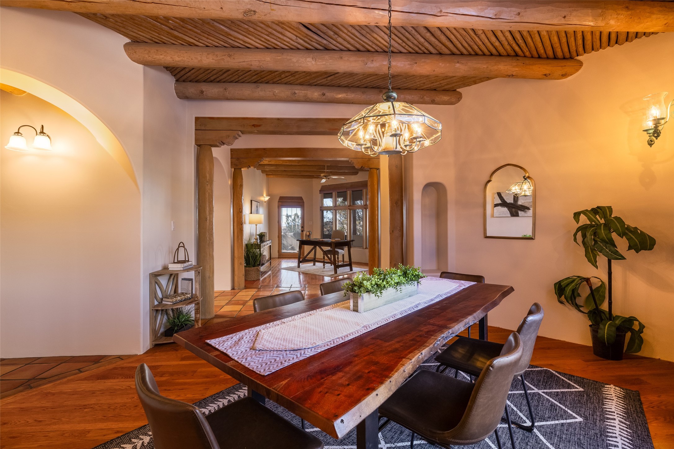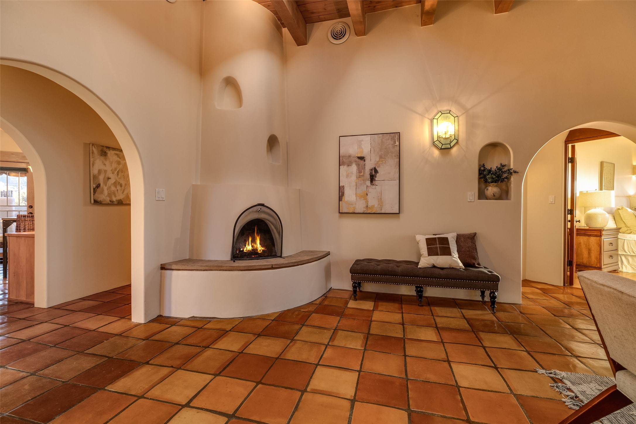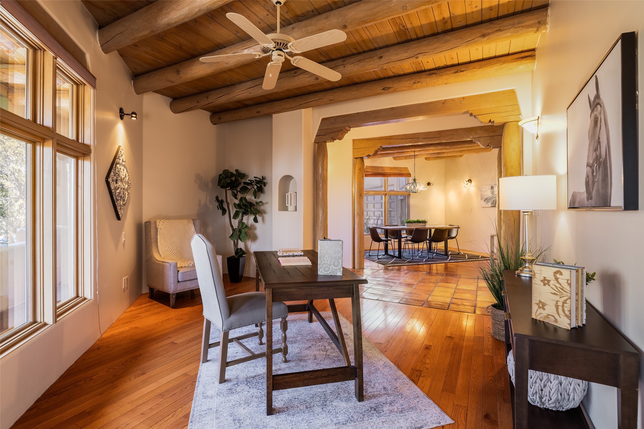 Discover your dream home in Santa Fe, nestled in the highly sought-after Las Barrancas neighborhood, just 2 miles from downtown Santa Fe. Enjoy easy access to renowned art galleries, fantastic dining, scenic hiking trails, and the famous Ten Thousand Waves Spa and restaurant! This custom-designed home features beautiful Santa Fe-style finishes, seamlessly blending comfort and elegance. The open floor plan is bathed in natural light and opens up to a wraparound portal, accessible from the main living areas. With 3 bedrooms, 2 bathrooms, 2 kiva fireplaces, and a versatile flex room that opens to the patio, this home is ideal for use as an office or studio. The spacious kitchen includes a cozy breakfast nook and desk area, with direct access to the covered portal for effortless outdoor entertaining. A double-car garage with potential for expansion and a gated front entry offer added convenience and security, making this the perfect "lock-and-leave" property.