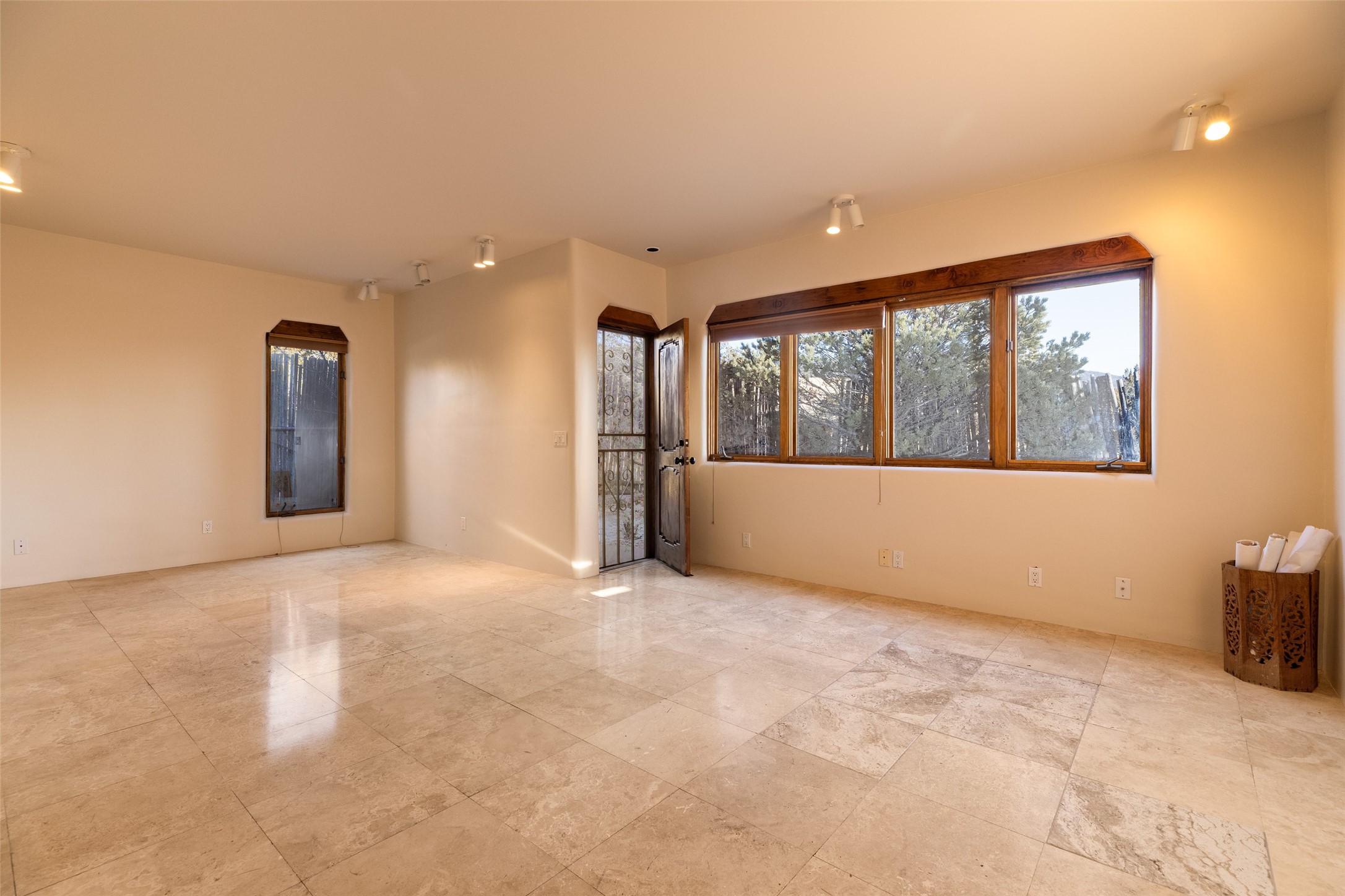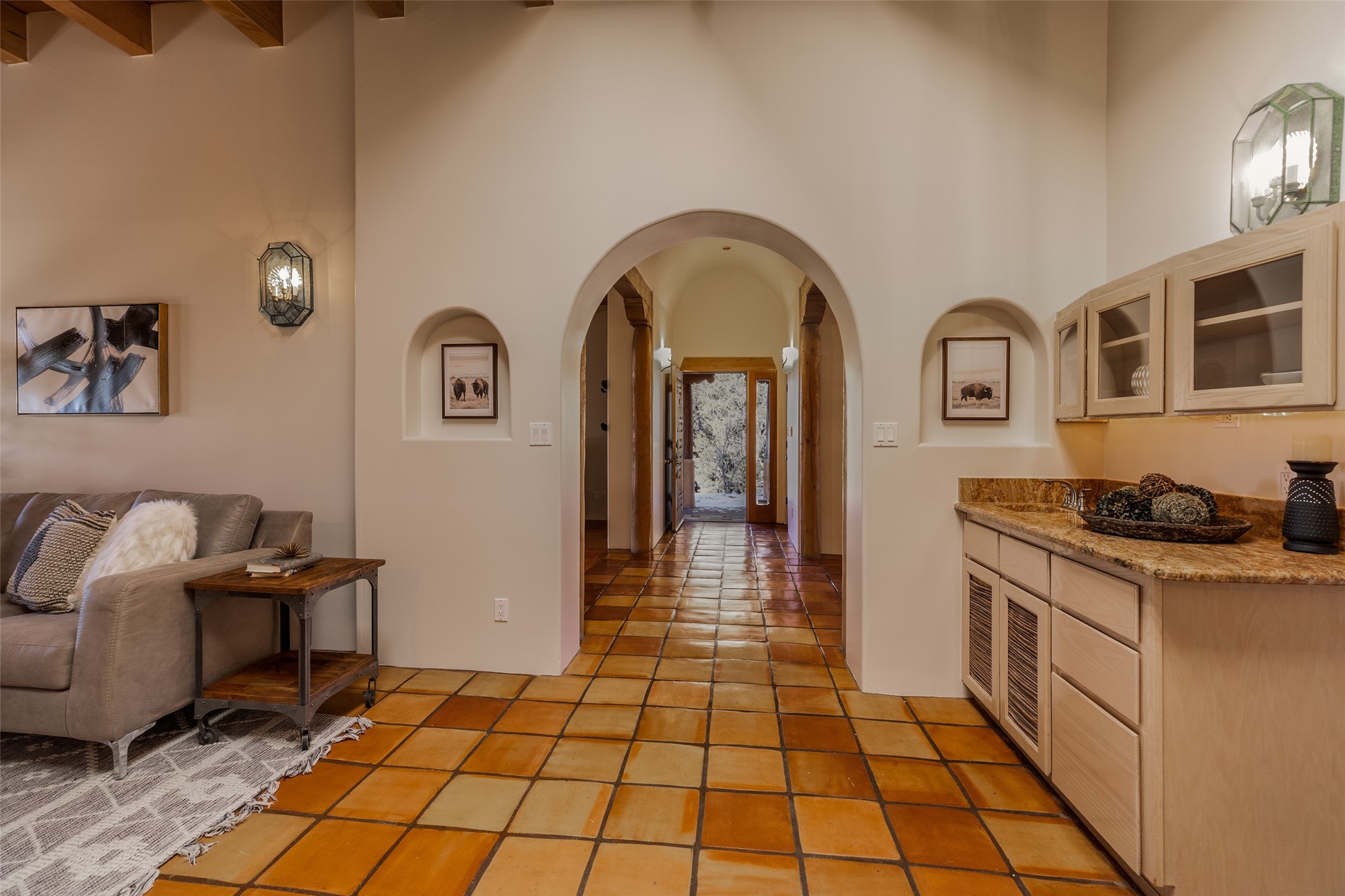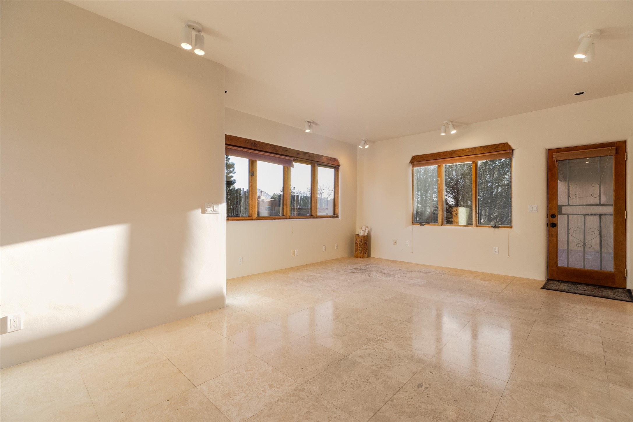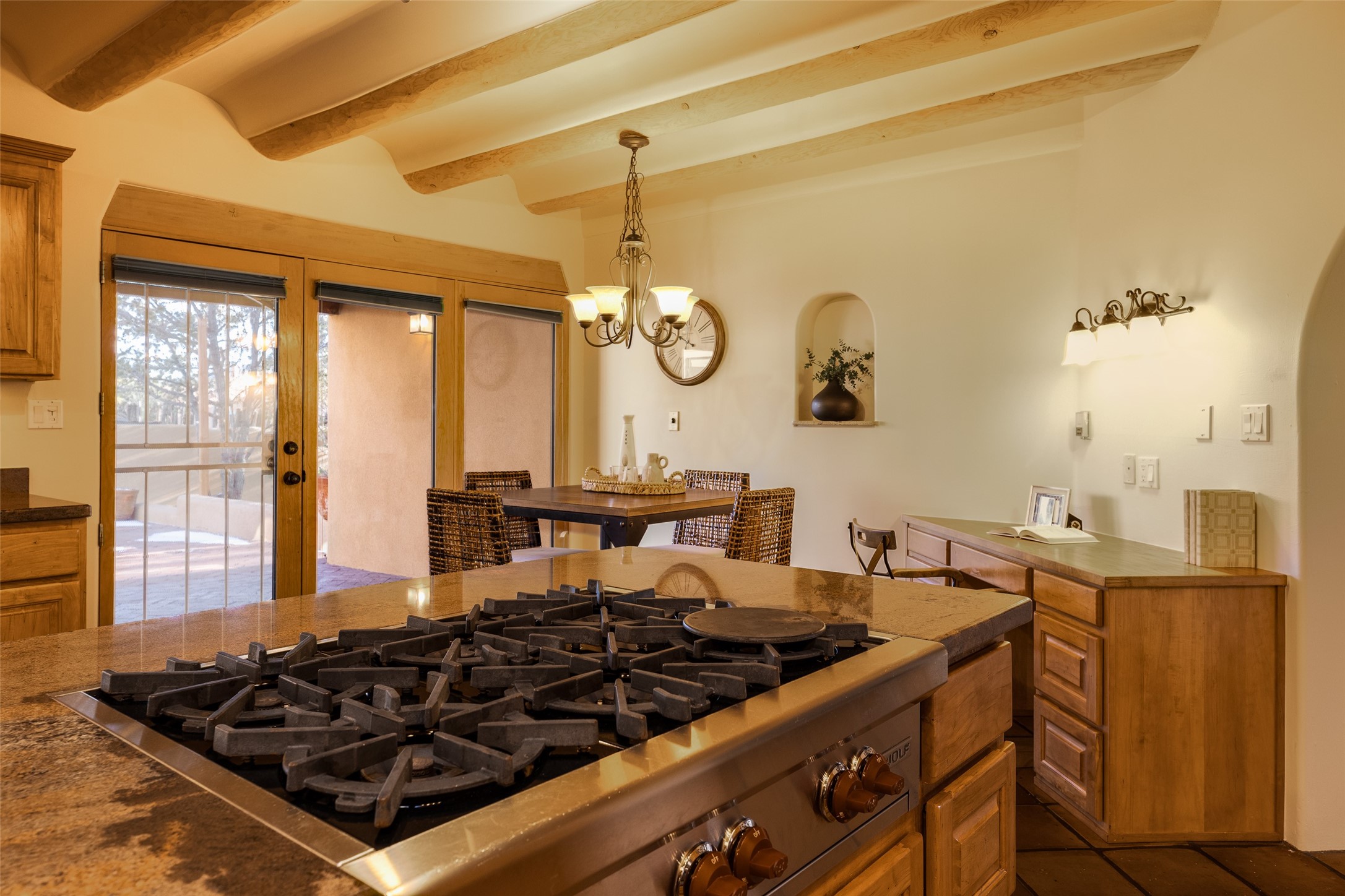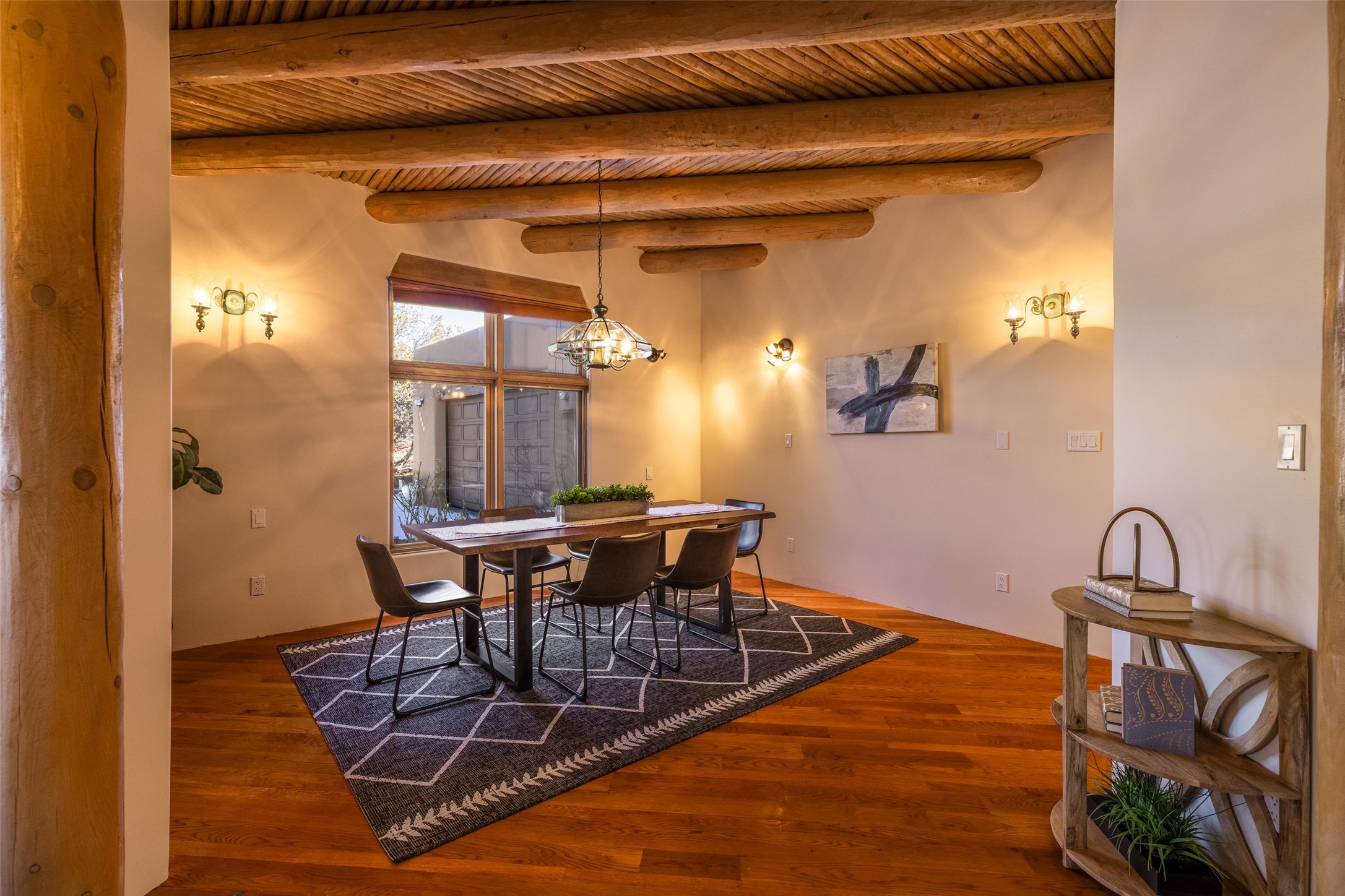 Discover your dream home in Santa Fe, nestled in the highly sought-after Las Barrancas neighborhood, just 2 miles from downtown Santa Fe. Enjoy easy access to renowned art galleries, fantastic dining, scenic hiking trails, and the famous Ten Thousand Waves Spa and restaurant! This custom-designed home features beautiful Santa Fe-style finishes, seamlessly blending comfort and elegance. The open floor plan is bathed in natural light and opens up to a wraparound portal, accessible from the main living areas. With 3 bedrooms, 2 bathrooms, 2 kiva fireplaces, and a versatile flex room that opens to the patio, this home is ideal for use as an office or studio. The spacious kitchen includes a cozy breakfast nook and desk area, with direct access to the covered portal for effortless outdoor entertaining. A double-car garage with potential for expansion and a gated front entry offer added convenience and security, making this the perfect "lock-and-leave" property.