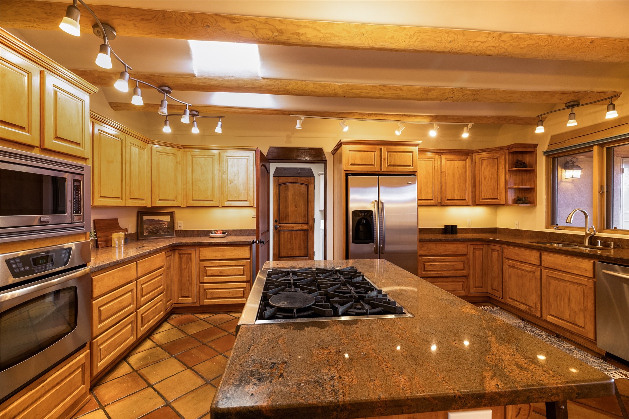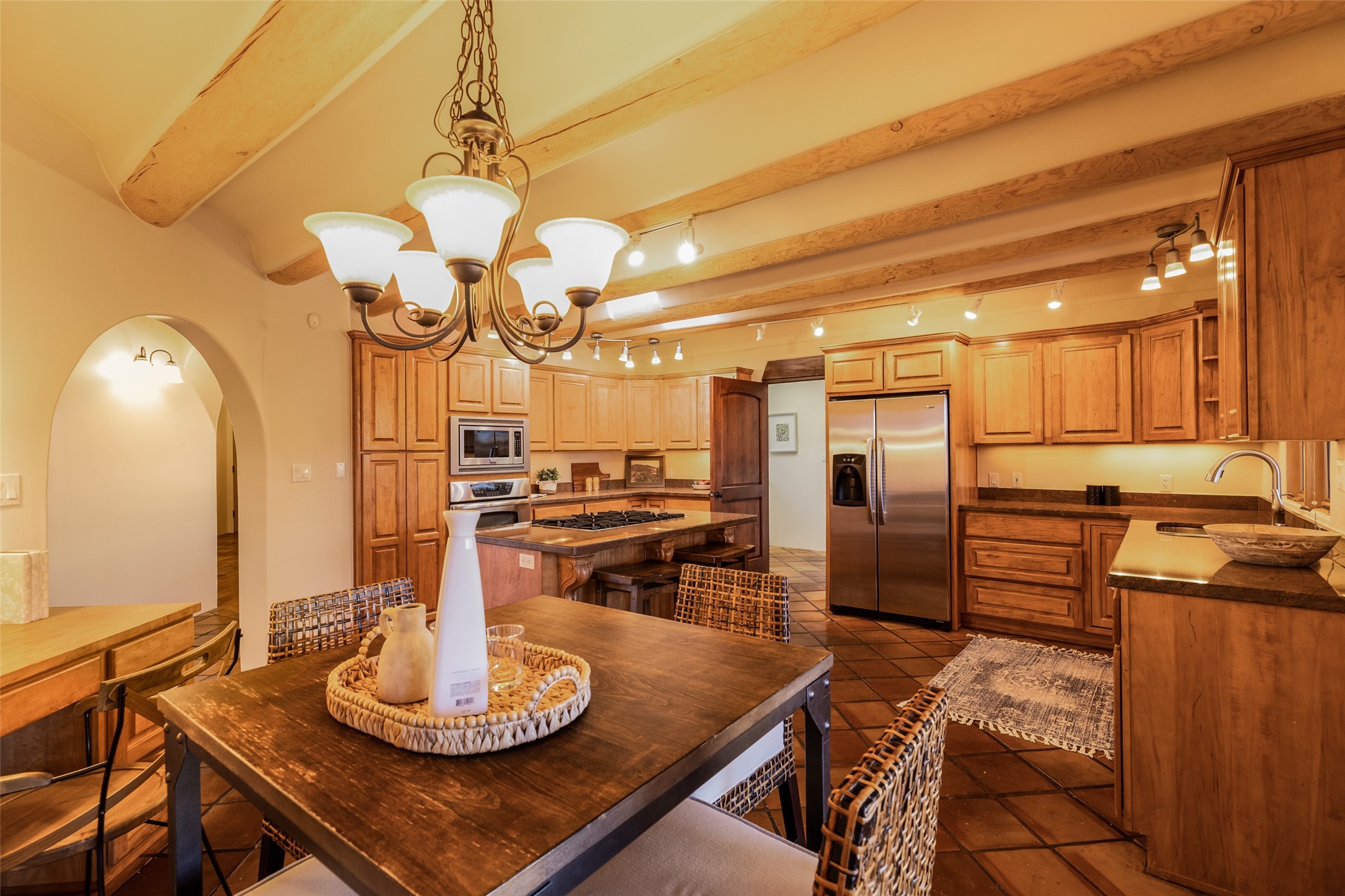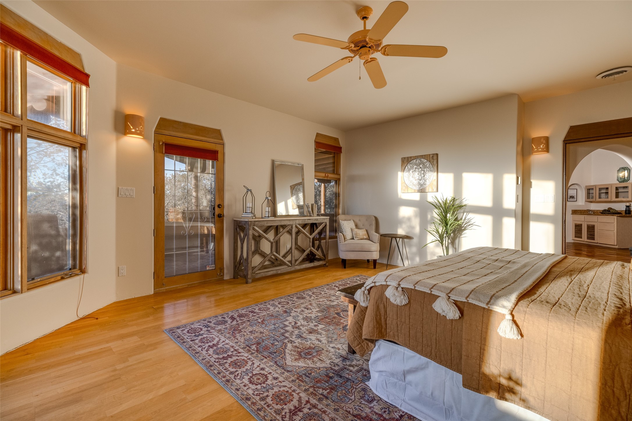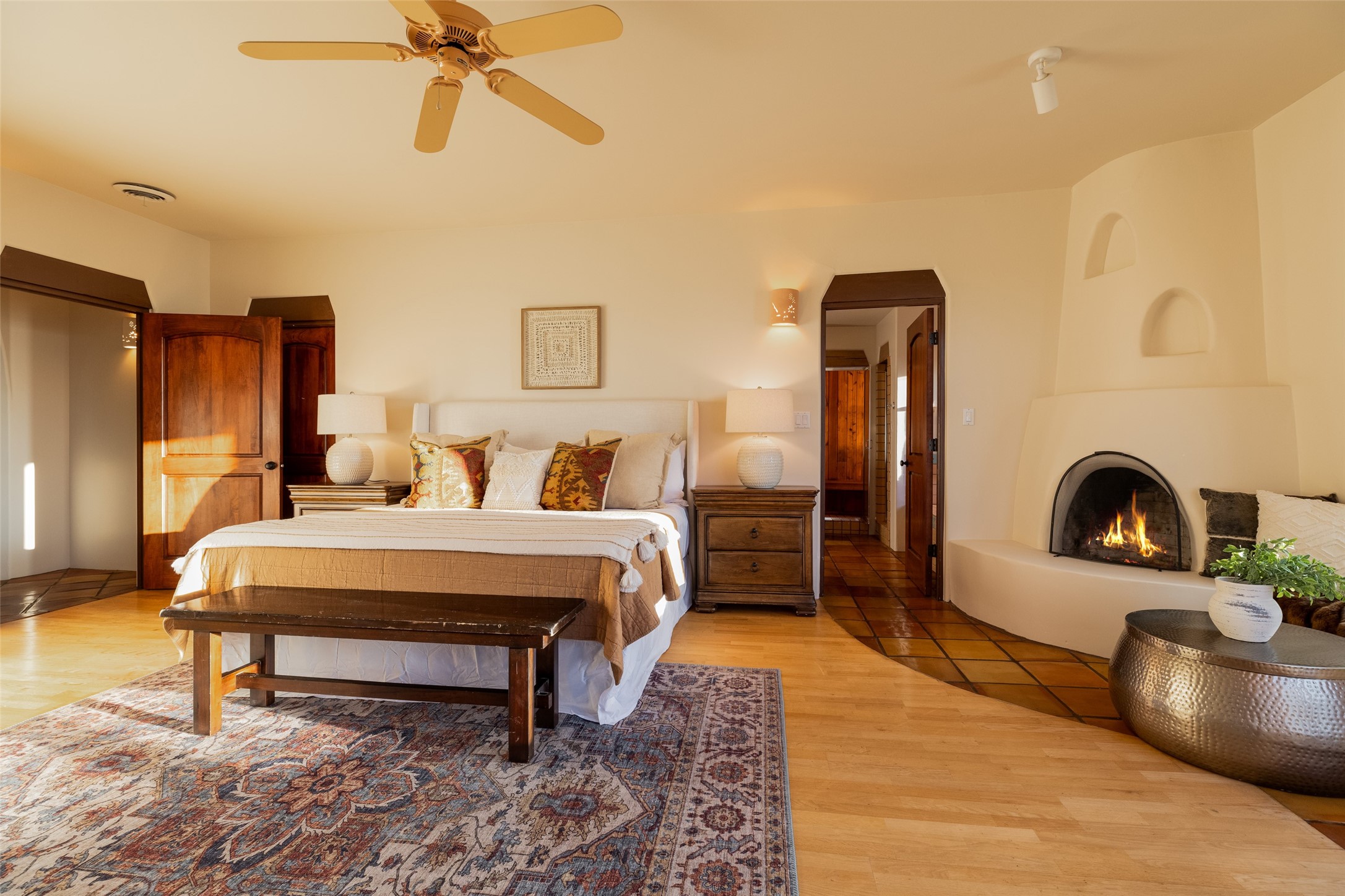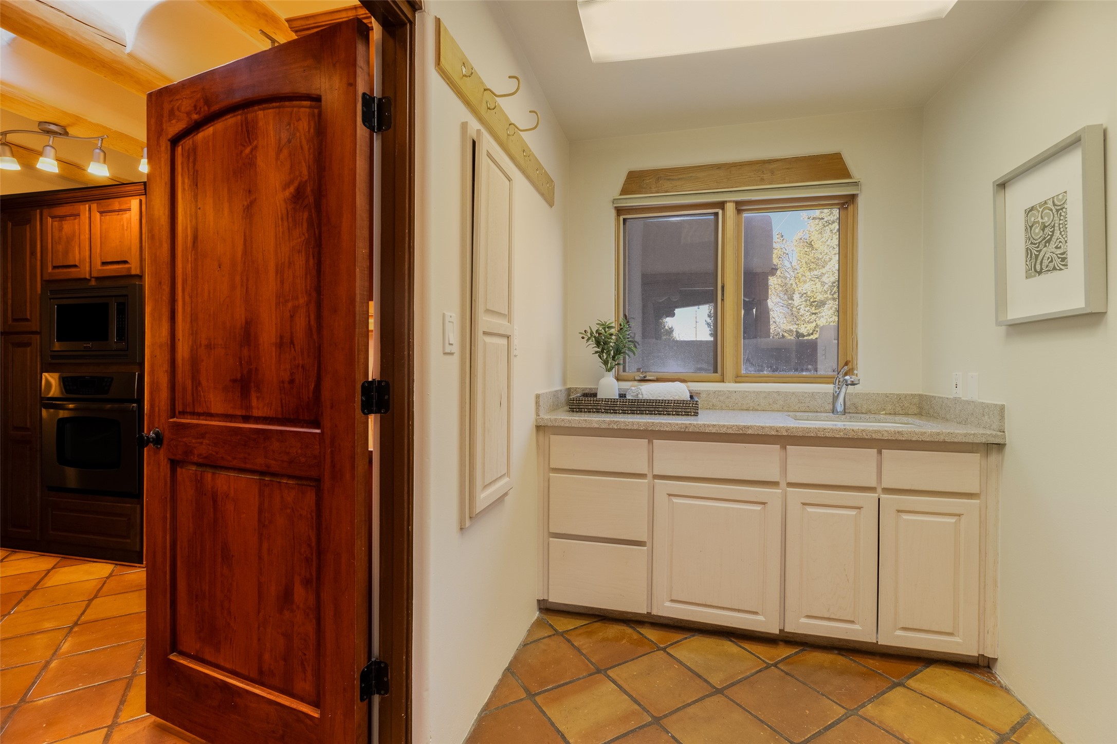 Discover your dream home in Santa Fe, nestled in the highly sought-after Las Barrancas neighborhood, just 2 miles from downtown Santa Fe. Enjoy easy access to renowned art galleries, fantastic dining, scenic hiking trails, and the famous Ten Thousand Waves Spa and restaurant! This custom-designed home features beautiful Santa Fe-style finishes, seamlessly blending comfort and elegance. The open floor plan is bathed in natural light and opens up to a wraparound portal, accessible from the main living areas. With 3 bedrooms, 2 bathrooms, 2 kiva fireplaces, and a versatile flex room that opens to the patio, this home is ideal for use as an office or studio. The spacious kitchen includes a cozy breakfast nook and desk area, with direct access to the covered portal for effortless outdoor entertaining. A double-car garage with potential for expansion and a gated front entry offer added convenience and security, making this the perfect "lock-and-leave" property.
