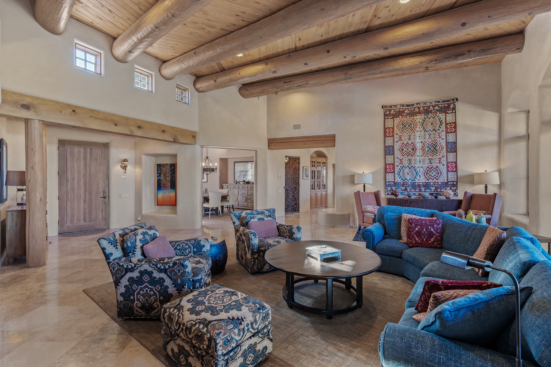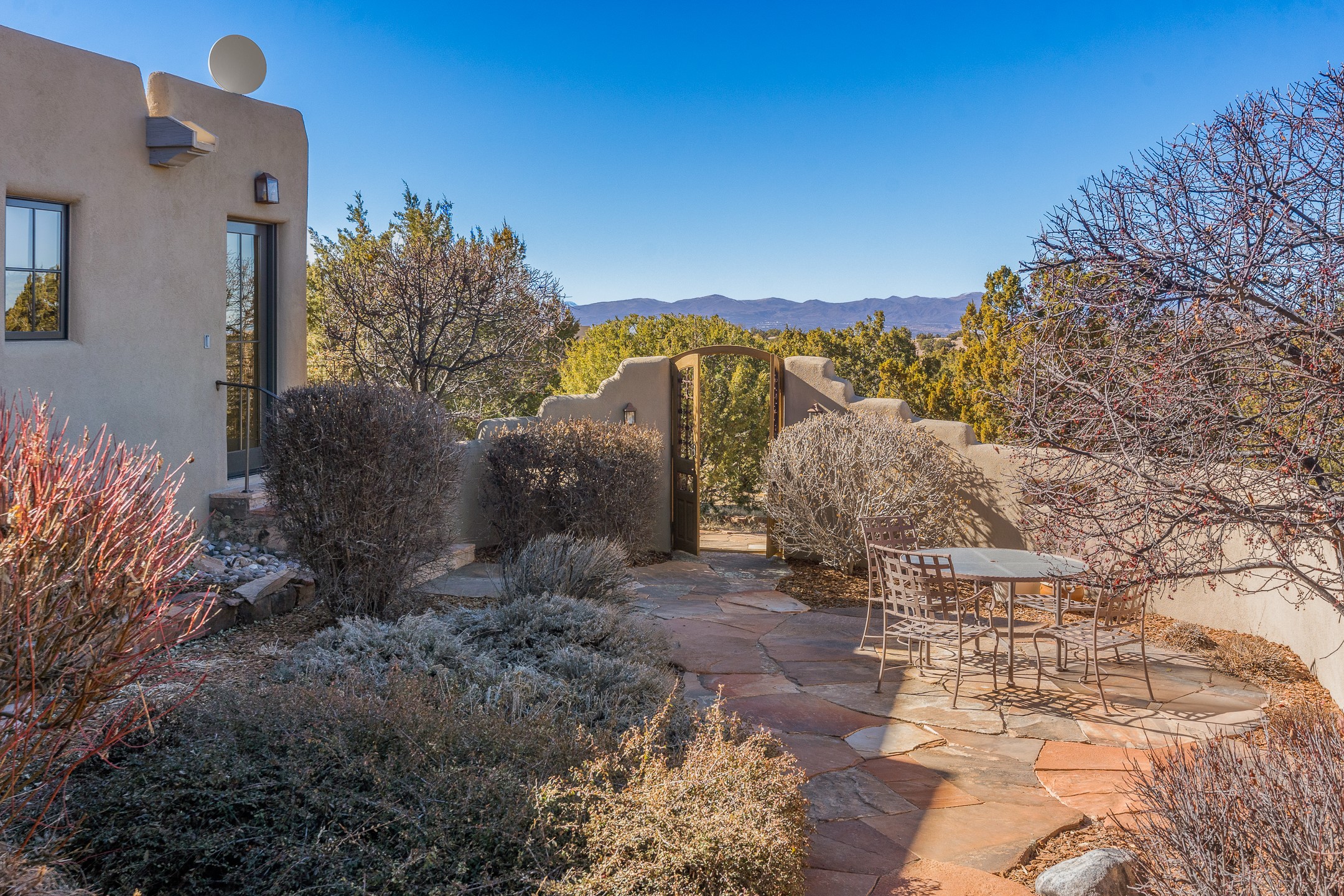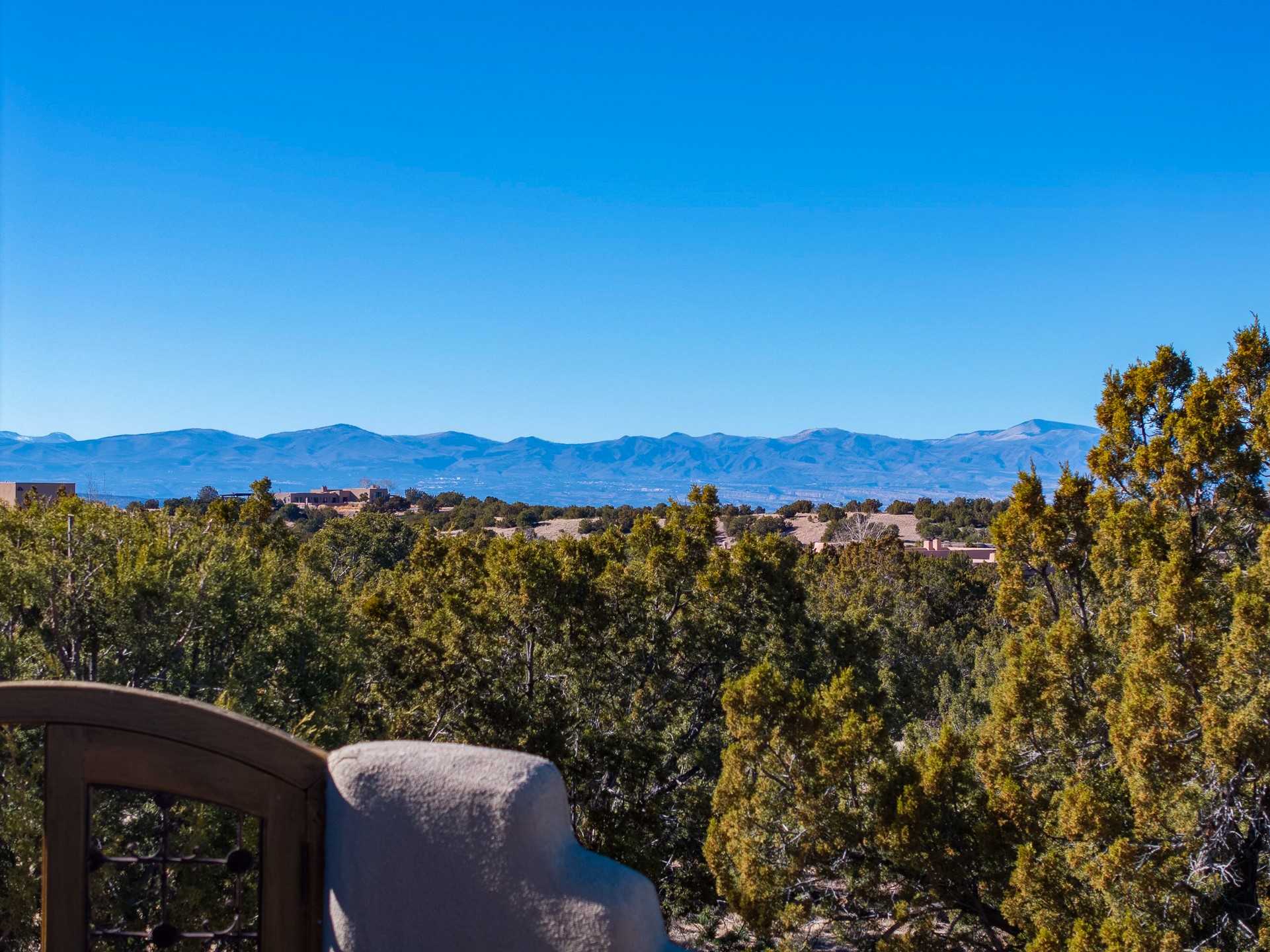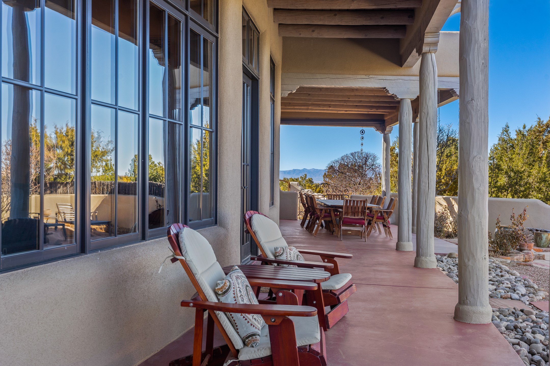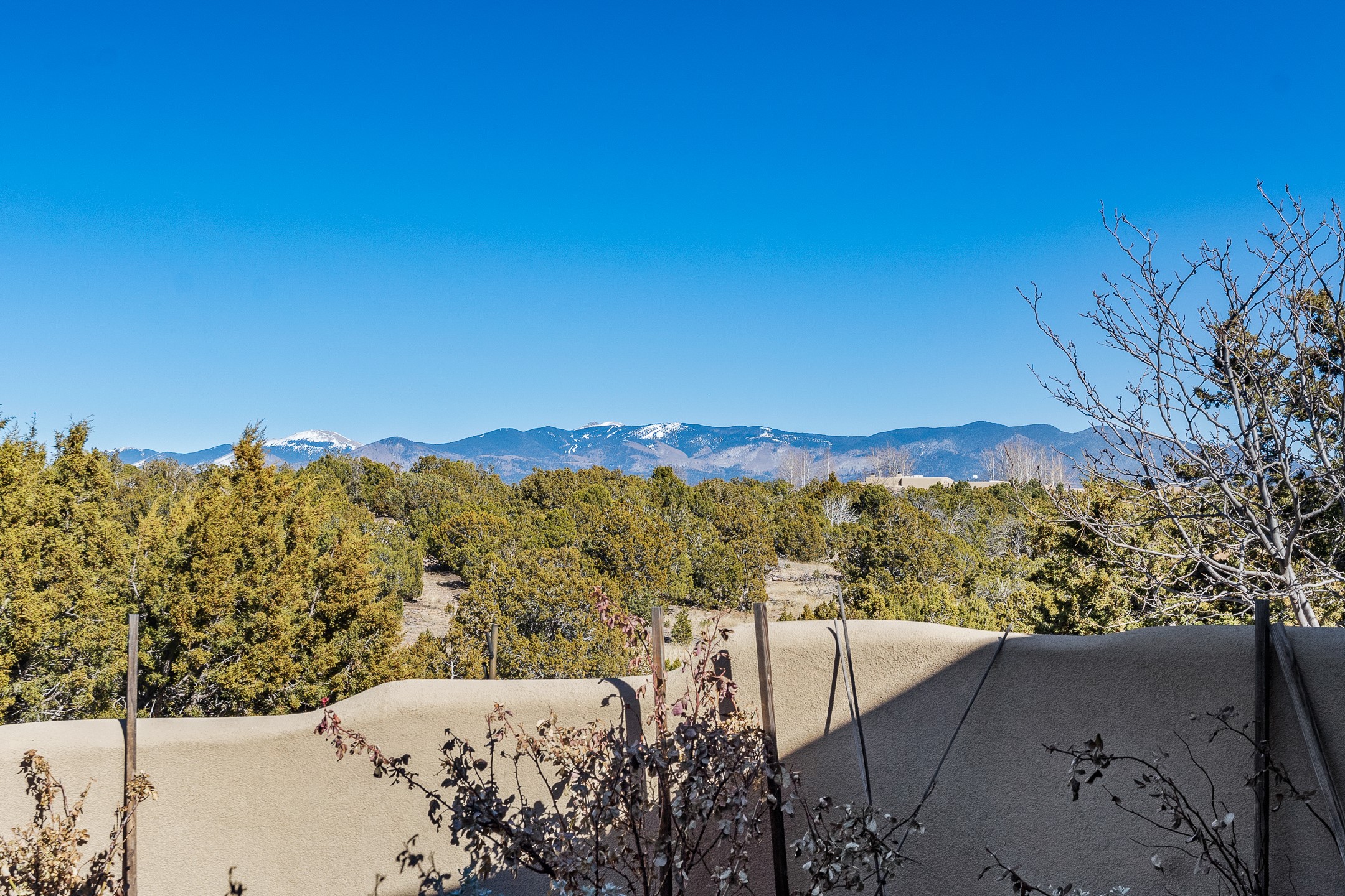 Sundance Estates Beauty! This immaculate single-level home with 3750 +/- sqft is situated on 2.5 acres, boasting views of the Sangre de Cristo and Jemez Mountains. The main house features 3 bedrooms, an office, 4 bathrooms, & an appx 700-square-foot 2 car garage and solar panels. An attached studio/guest quarters of 305 +/- sqft with plaster walls, a full bath, mini-split, separate entrance, & an enclosed yard provides flexibility for guests or creative space. Upon entering, you'll be captivated by the stunning living room with soaring ceiling, vigas, fireplace with doors that open to an expansive covered portal. The walled courtyard with flagstone walkways, multiple seating areas, and a hot tub, offers an ideal setting for entertaining or simply admiring the magnificent views. The cook's kitchen is a dream & features granite countertops, large butcher block island/breakfast bar, Sub-Zero refrigerator, Wolf 6-burner stove with grill, double ovens, trash compactor, two sinks (including one copper), abundant cabinet space, eat-in kitchen nook with a fireplace, built-in hutch, & a spacious walk-in pantry. On one side of the home, you'll find an office & the luxurious primary suite, complete with sitting area, vigas, fireplace, and a stunning ensuite bathroom. The bath includes granite countertops, a fireplace, power blinds, double vanities, a jetted tub, a separate shower, a mini split & two walk-in closets w/ built-ins. On the opposite side, there are 2 additional bedrooms, each w/ ensuite bathrooms, plus a convenient half-bath for guests. Wonderful amenities and features Include: Radiant in floor heating-7 mini splits (heating and cooling)-Plaster walls-Travertine tile floors-Wood doors-Wet bar-Nichos-Bancos-Ceiling fans-Skylights-Laundry room with sink, cabinets, counter space/closet-Formal dining room with wood beam ceiling-Built-ins. This exceptional property blends luxury, comfort, and functionality in a stunning setting. Please read agent only remarks.