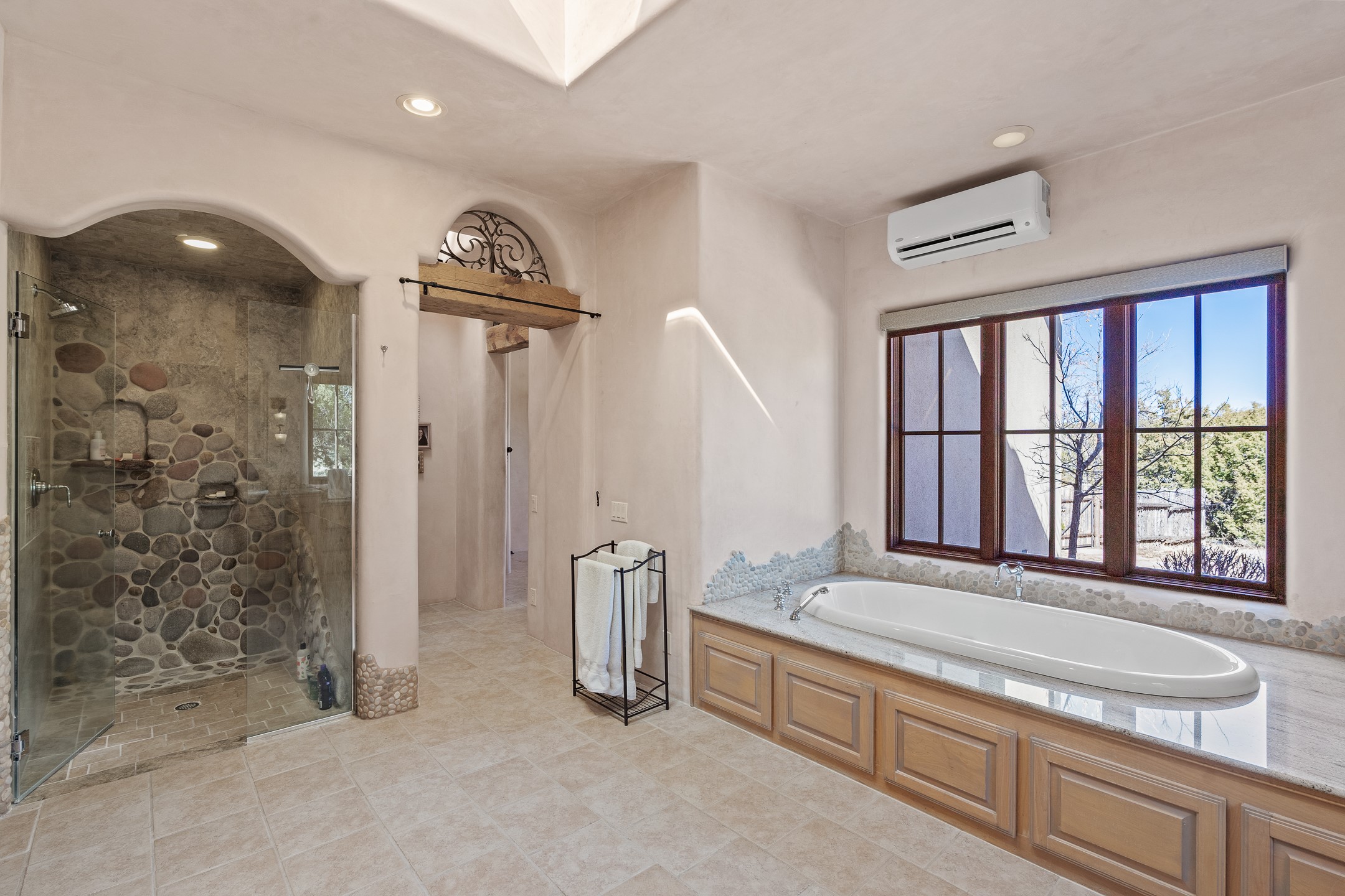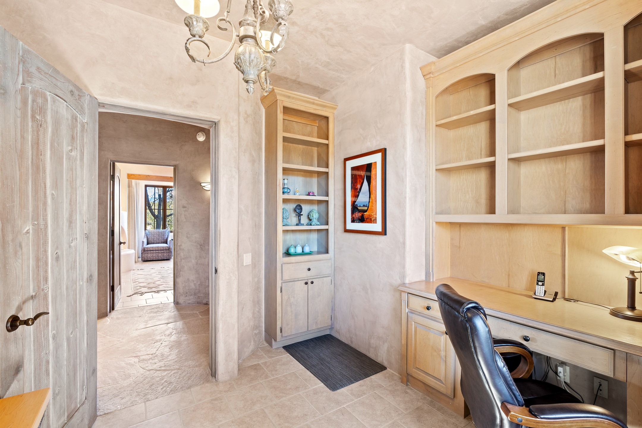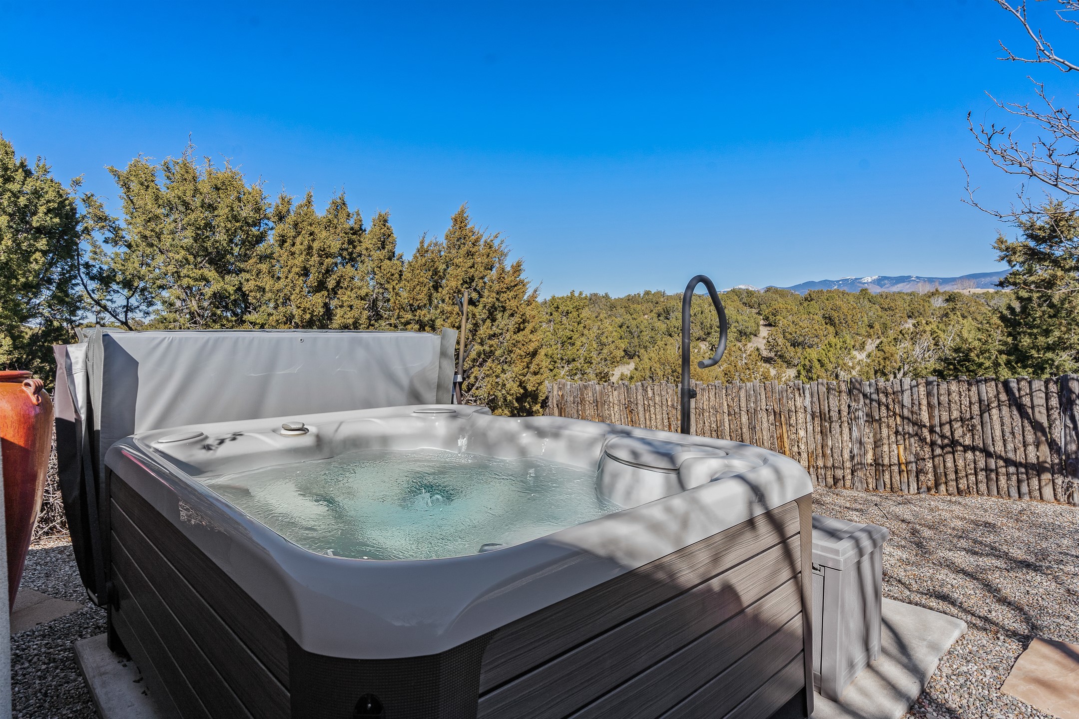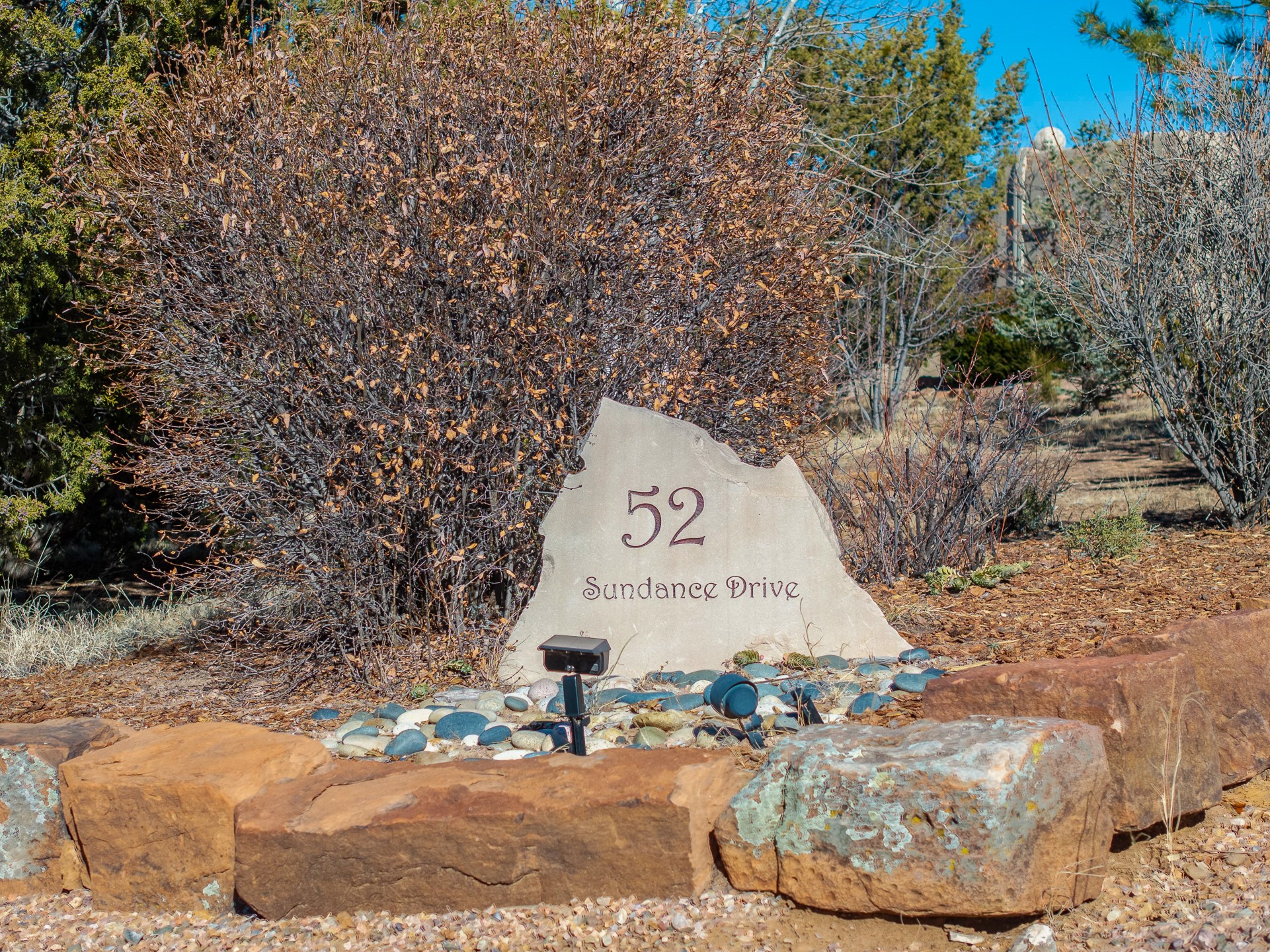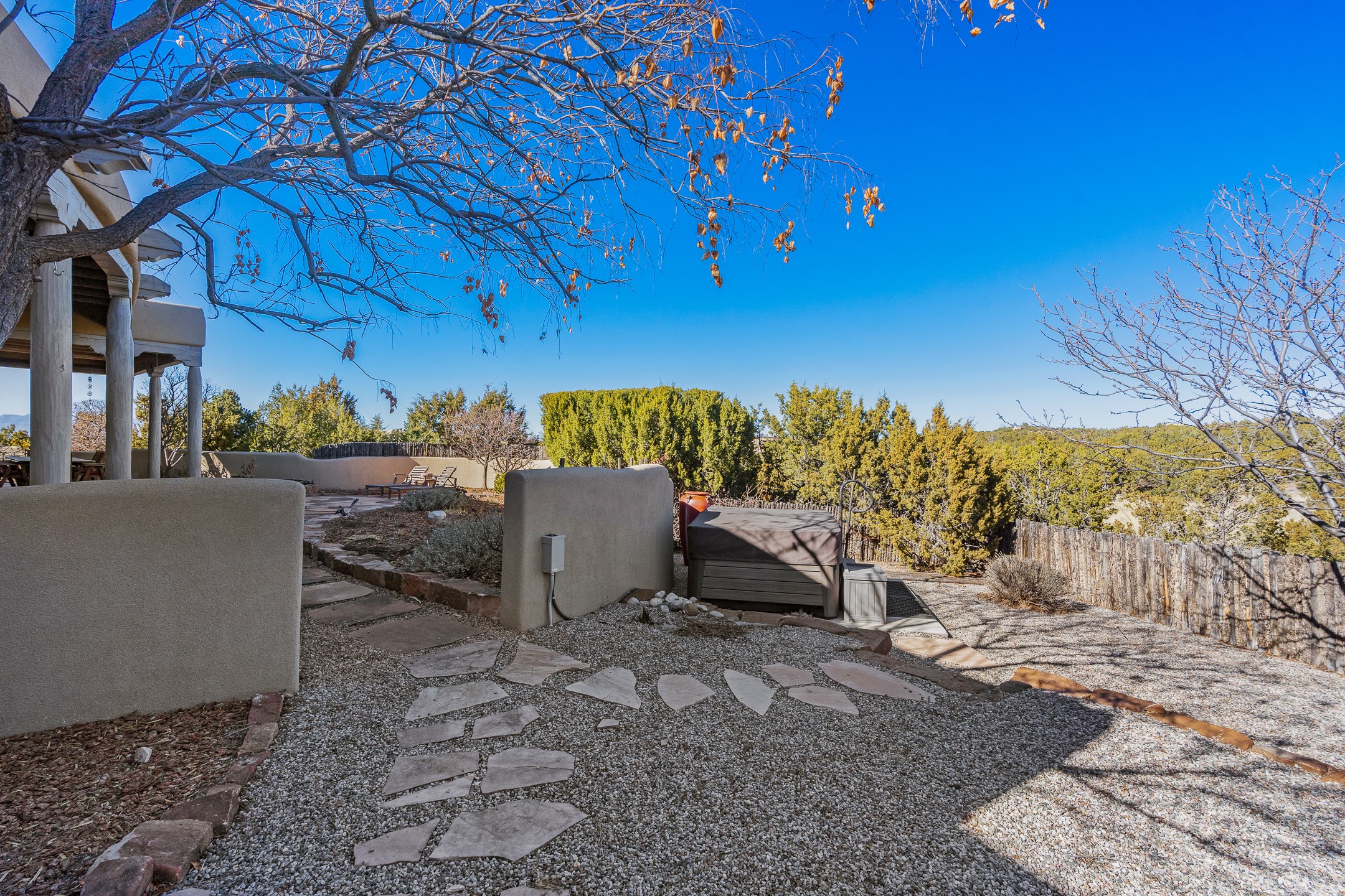 Sundance Estates Beauty! This immaculate single-level home with 3750 +/- sqft is situated on 2.5 acres, boasting views of the Sangre de Cristo and Jemez Mountains. The main house features 3 bedrooms, an office, 4 bathrooms, & an appx 700-square-foot 2 car garage and solar panels. An attached studio/guest quarters of 305 +/- sqft with plaster walls, a full bath, mini-split, separate entrance, & an enclosed yard provides flexibility for guests or creative space. Upon entering, you'll be captivated by the stunning living room with soaring ceiling, vigas, fireplace with doors that open to an expansive covered portal. The walled courtyard with flagstone walkways, multiple seating areas, and a hot tub, offers an ideal setting for entertaining or simply admiring the magnificent views. The cook's kitchen is a dream & features granite countertops, large butcher block island/breakfast bar, Sub-Zero refrigerator, Wolf 6-burner stove with grill, double ovens, trash compactor, two sinks (including one copper), abundant cabinet space, eat-in kitchen nook with a fireplace, built-in hutch, & a spacious walk-in pantry. On one side of the home, you'll find an office & the luxurious primary suite, complete with sitting area, vigas, fireplace, and a stunning ensuite bathroom. The bath includes granite countertops, a fireplace, power blinds, double vanities, a jetted tub, a separate shower, a mini split & two walk-in closets w/ built-ins. On the opposite side, there are 2 additional bedrooms, each w/ ensuite bathrooms, plus a convenient half-bath for guests. Wonderful amenities and features Include: Radiant in floor heating-7 mini splits (heating and cooling)-Plaster walls-Travertine tile floors-Wood doors-Wet bar-Nichos-Bancos-Ceiling fans-Skylights-Laundry room with sink, cabinets, counter space/closet-Formal dining room with wood beam ceiling-Built-ins. This exceptional property blends luxury, comfort, and functionality in a stunning setting. Please read agent only remarks.