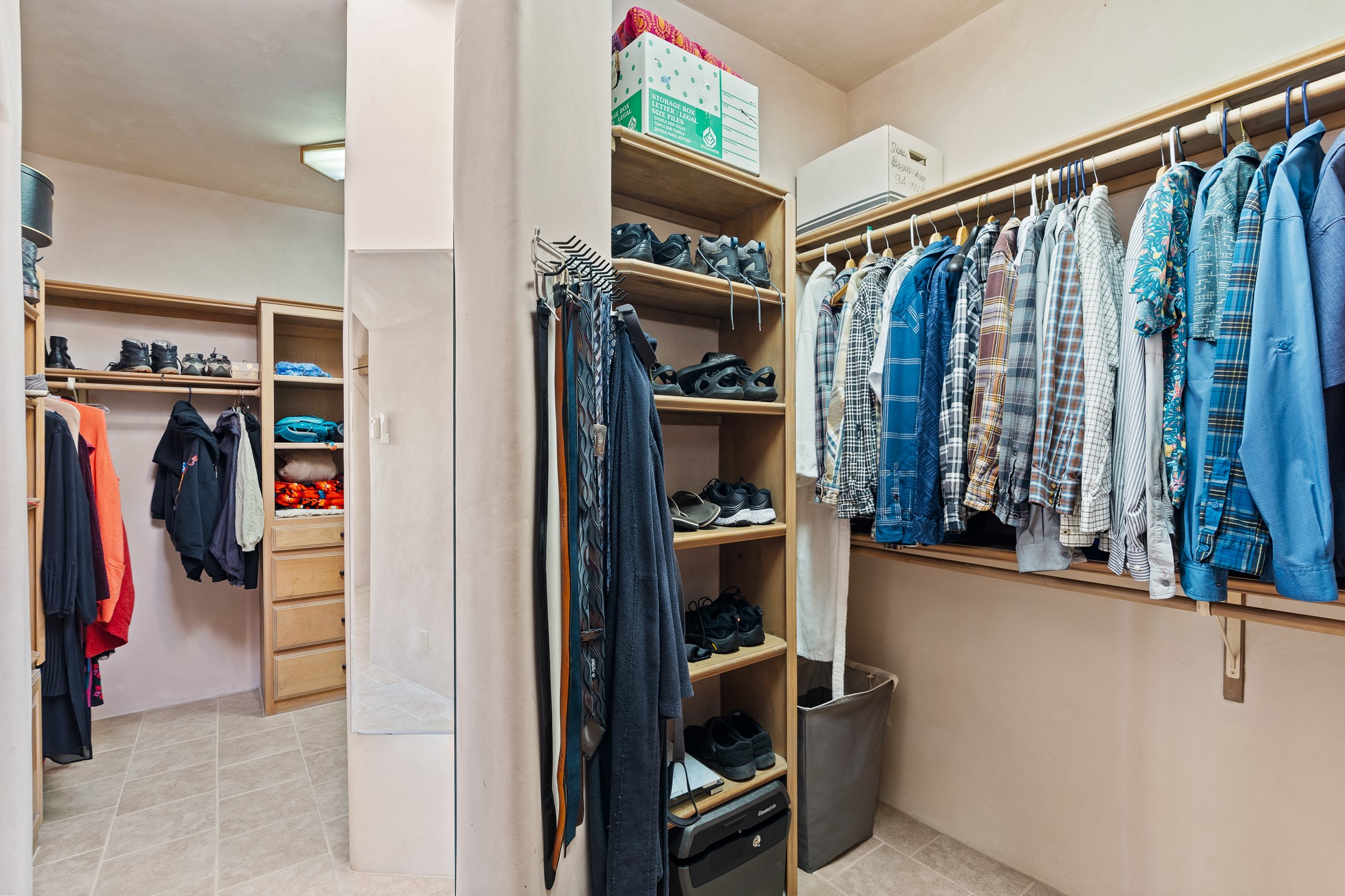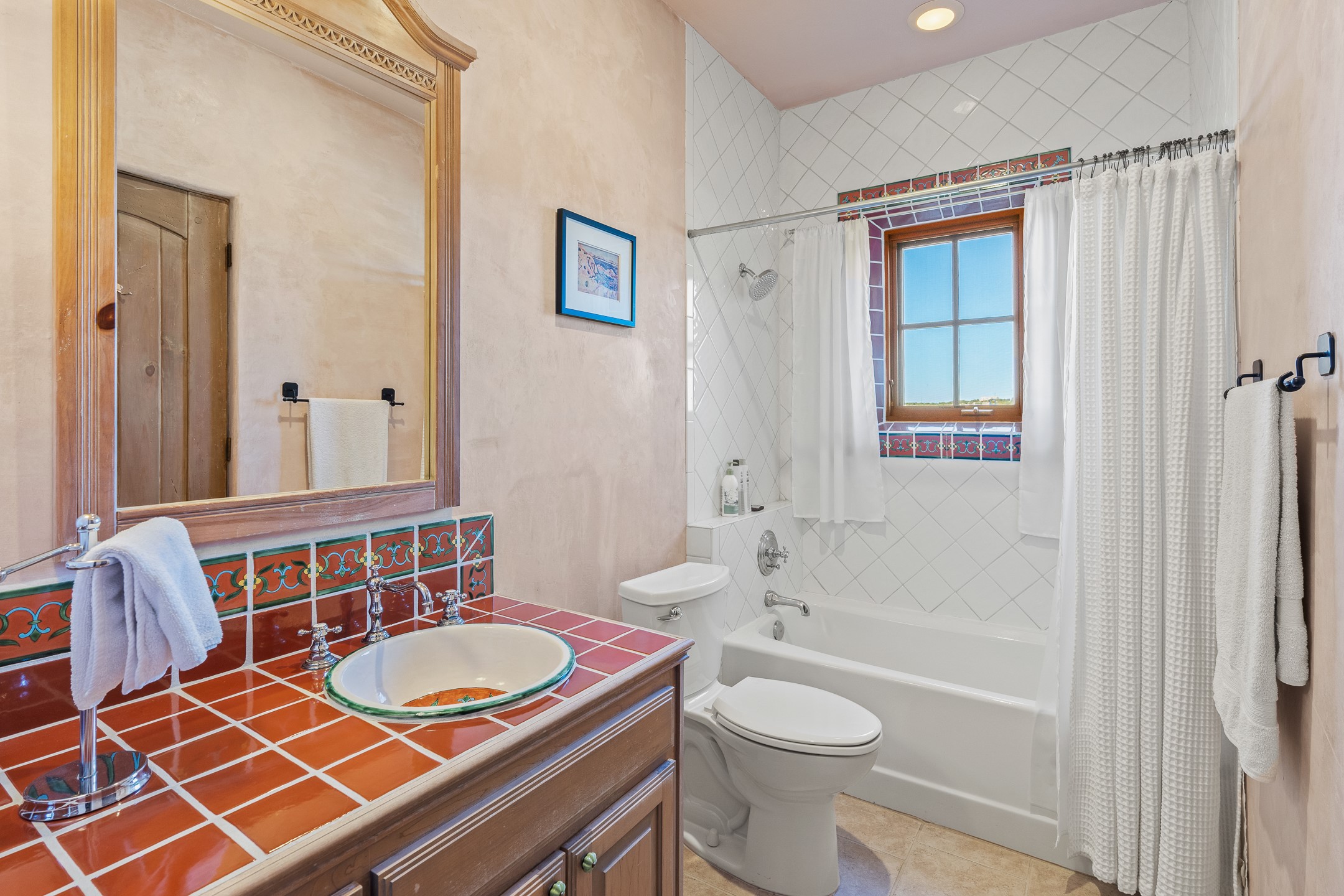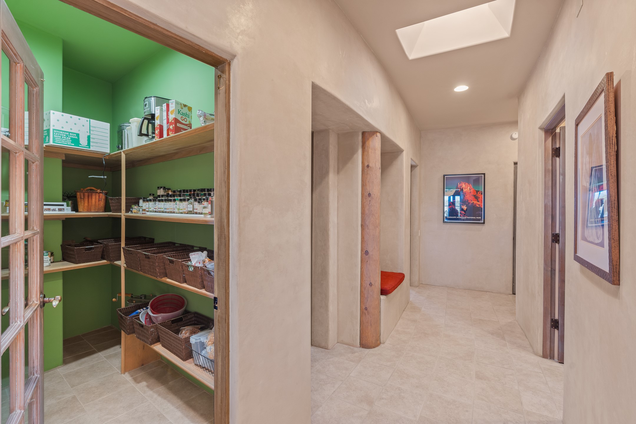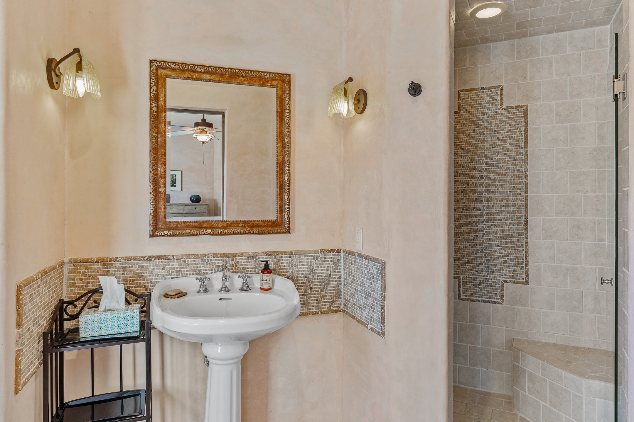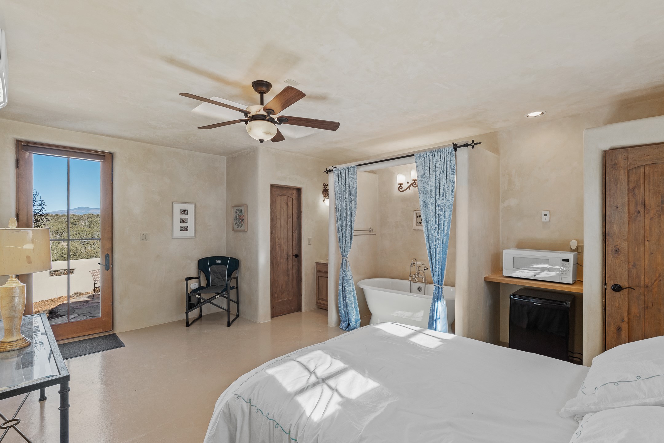 Sundance Estates Beauty! This immaculate single-level home with 3750 +/- sqft is situated on 2.5 acres, boasting views of the Sangre de Cristo and Jemez Mountains. The main house features 3 bedrooms, an office, 4 bathrooms, & an appx 700-square-foot 2 car garage and solar panels. An attached studio/guest quarters of 305 +/- sqft with plaster walls, a full bath, mini-split, separate entrance, & an enclosed yard provides flexibility for guests or creative space. Upon entering, you'll be captivated by the stunning living room with soaring ceiling, vigas, fireplace with doors that open to an expansive covered portal. The walled courtyard with flagstone walkways, multiple seating areas, and a hot tub, offers an ideal setting for entertaining or simply admiring the magnificent views. The cook's kitchen is a dream & features granite countertops, large butcher block island/breakfast bar, Sub-Zero refrigerator, Wolf 6-burner stove with grill, double ovens, trash compactor, two sinks (including one copper), abundant cabinet space, eat-in kitchen nook with a fireplace, built-in hutch, & a spacious walk-in pantry. On one side of the home, you'll find an office & the luxurious primary suite, complete with sitting area, vigas, fireplace, and a stunning ensuite bathroom. The bath includes granite countertops, a fireplace, power blinds, double vanities, a jetted tub, a separate shower, a mini split & two walk-in closets w/ built-ins. On the opposite side, there are 2 additional bedrooms, each w/ ensuite bathrooms, plus a convenient half-bath for guests. Wonderful amenities and features Include: Radiant in floor heating-7 mini splits (heating and cooling)-Plaster walls-Travertine tile floors-Wood doors-Wet bar-Nichos-Bancos-Ceiling fans-Skylights-Laundry room with sink, cabinets, counter space/closet-Formal dining room with wood beam ceiling-Built-ins. This exceptional property blends luxury, comfort, and functionality in a stunning setting. Please read agent only remarks.