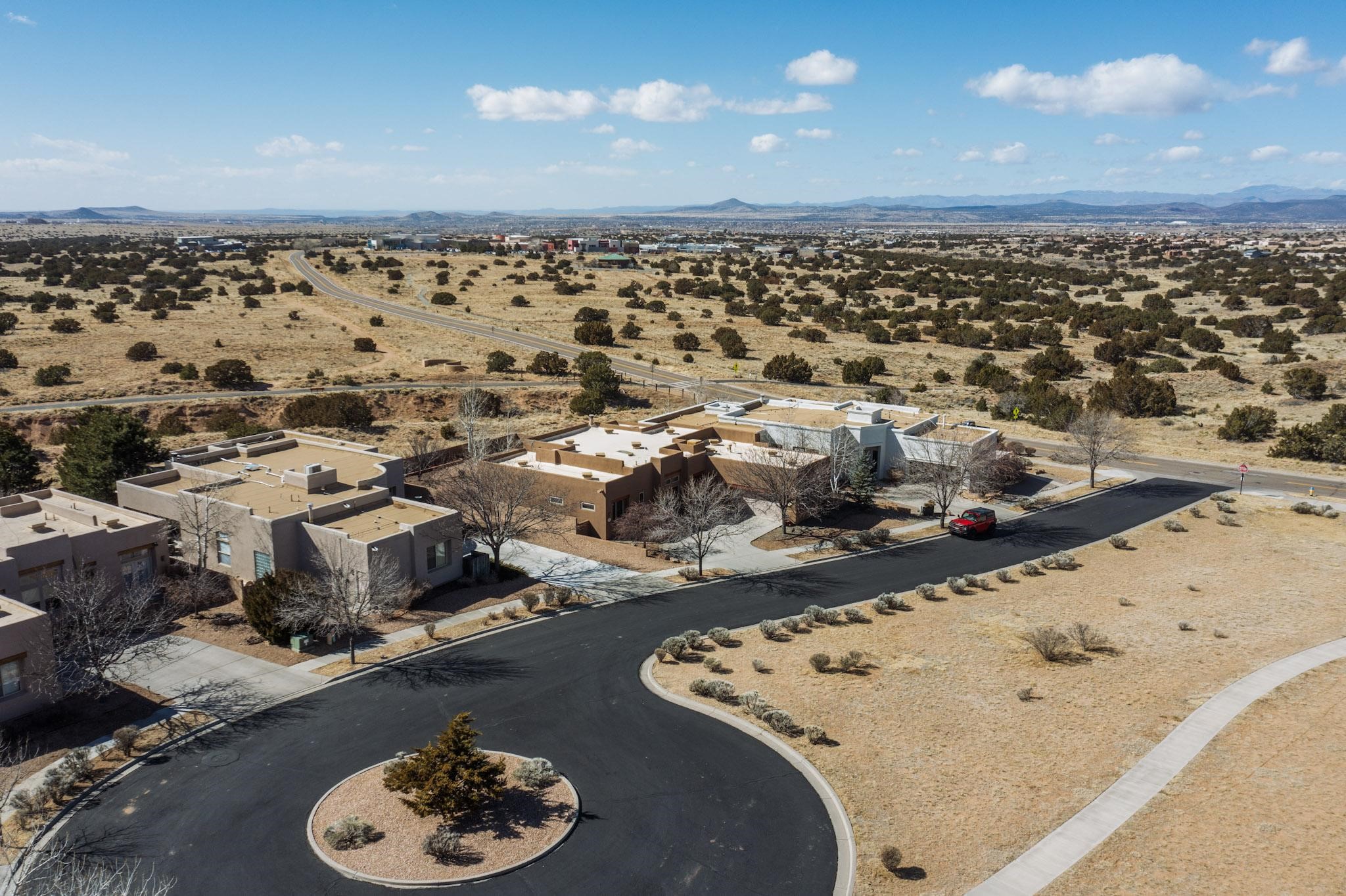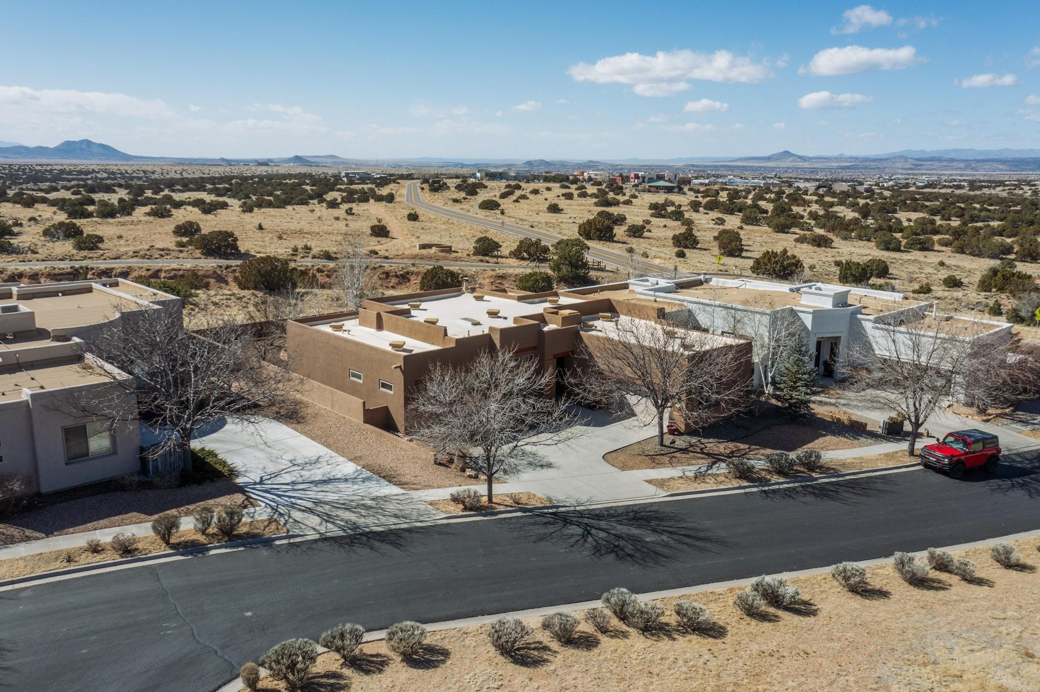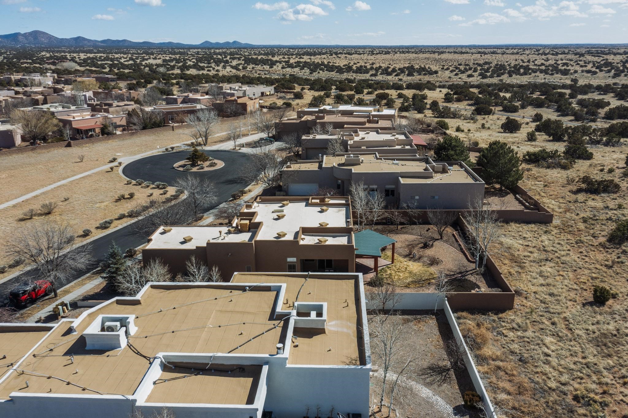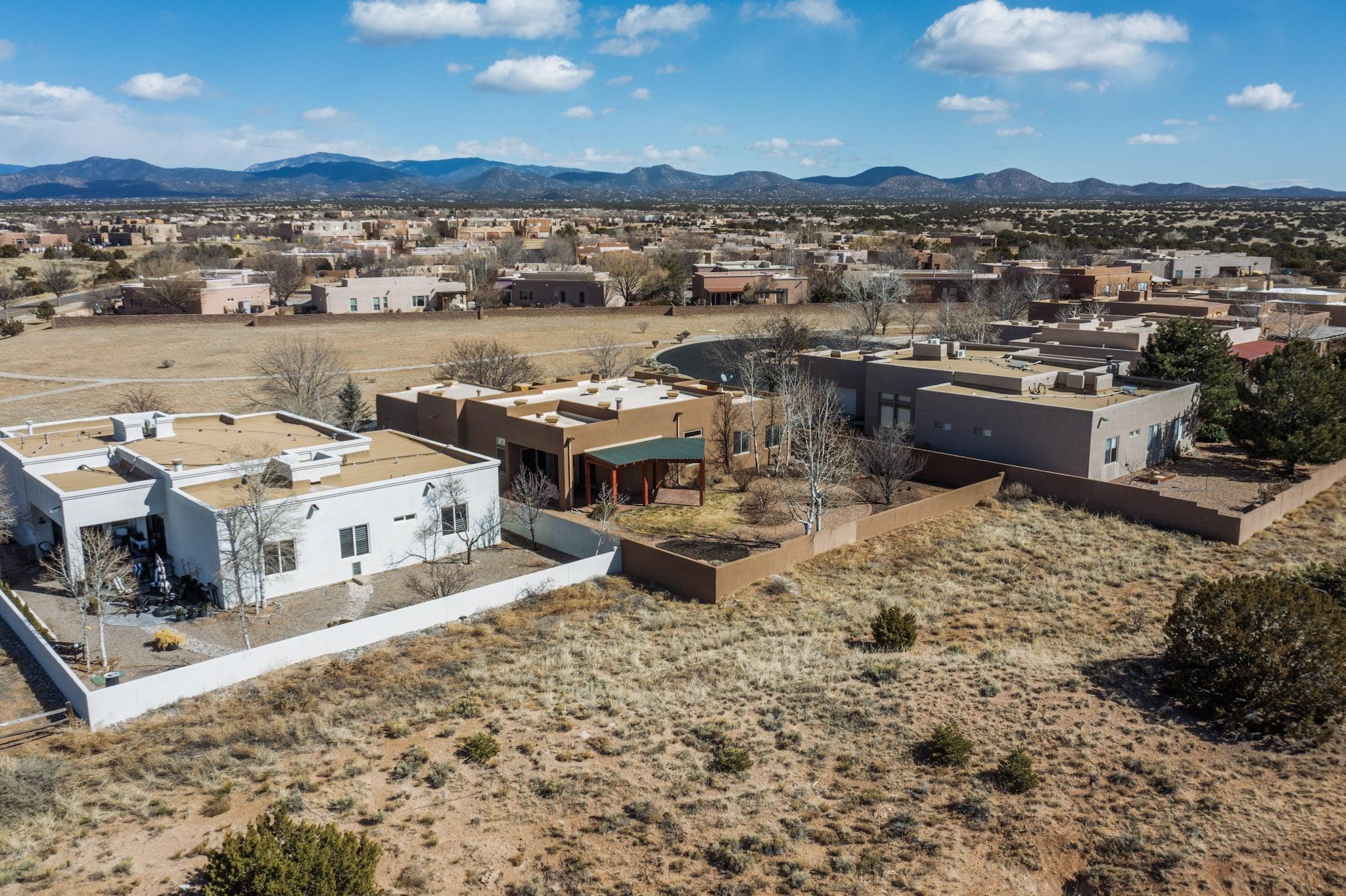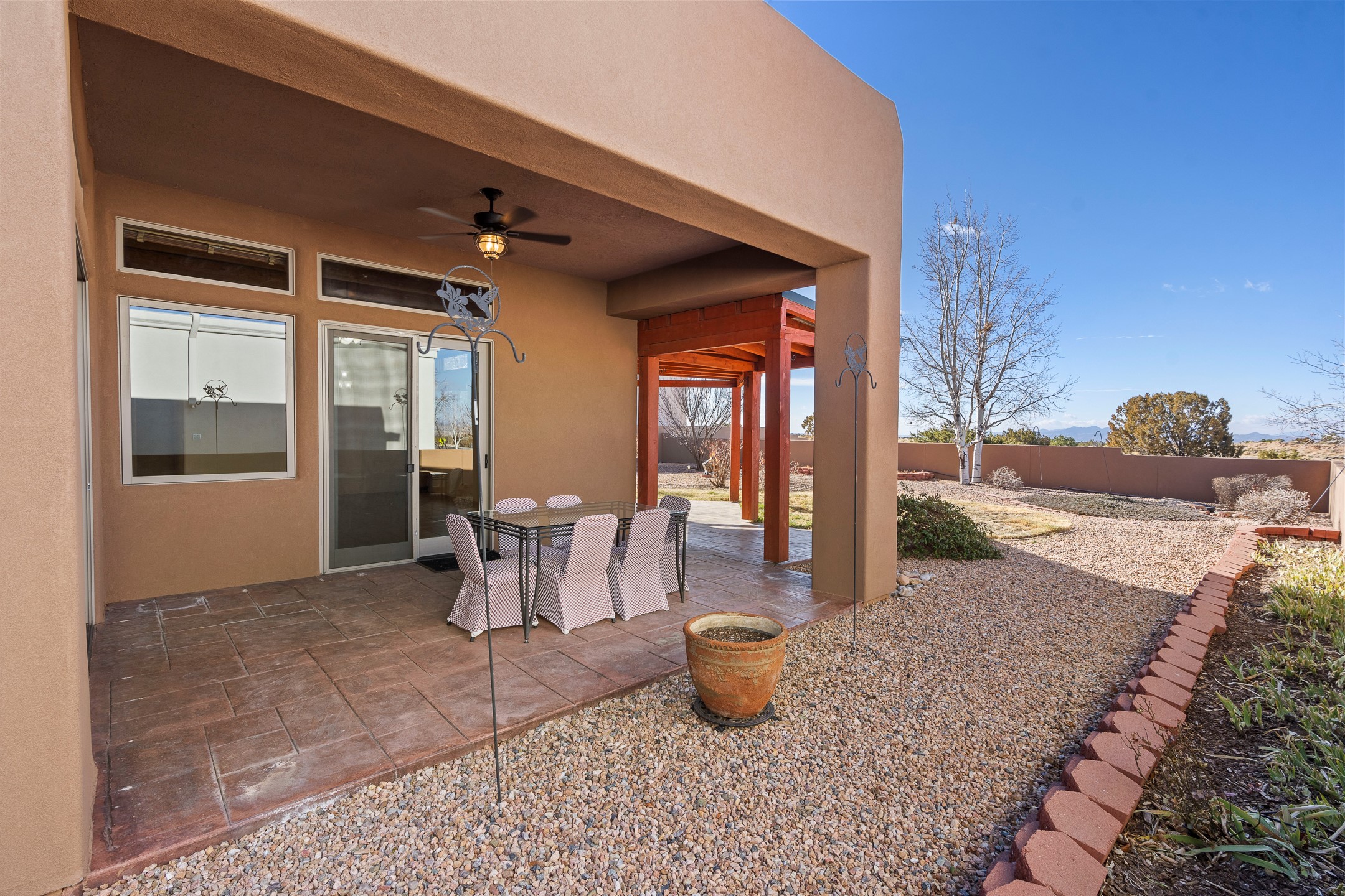 Mountain views from every room. On a quiet cul-de-sac street with open space in front and back of home with spectacular sunsets and views from the back yard. This recently updated Pueblo-style home in Rancho Viejo with new roof, new stucco, fresh interior paint, fully remodeled primary bath, added covered portal and granite island in kitchen is on a premium lot backing to vast greenbelt. The popular Mesa Verde open floor plan has four bedrooms and three full baths plus lots of usable space and storage room. The versatile 4th bedroom with private bath can serve as office, guest room, library or den. Large walled backyard for landscaping and pets with fruit trees. Behind the home is part of the 15 miles of paved walking/biking trails in the neighborhood. Near everything in Santa Fe but just far enough out for a quiet, peaceful life.