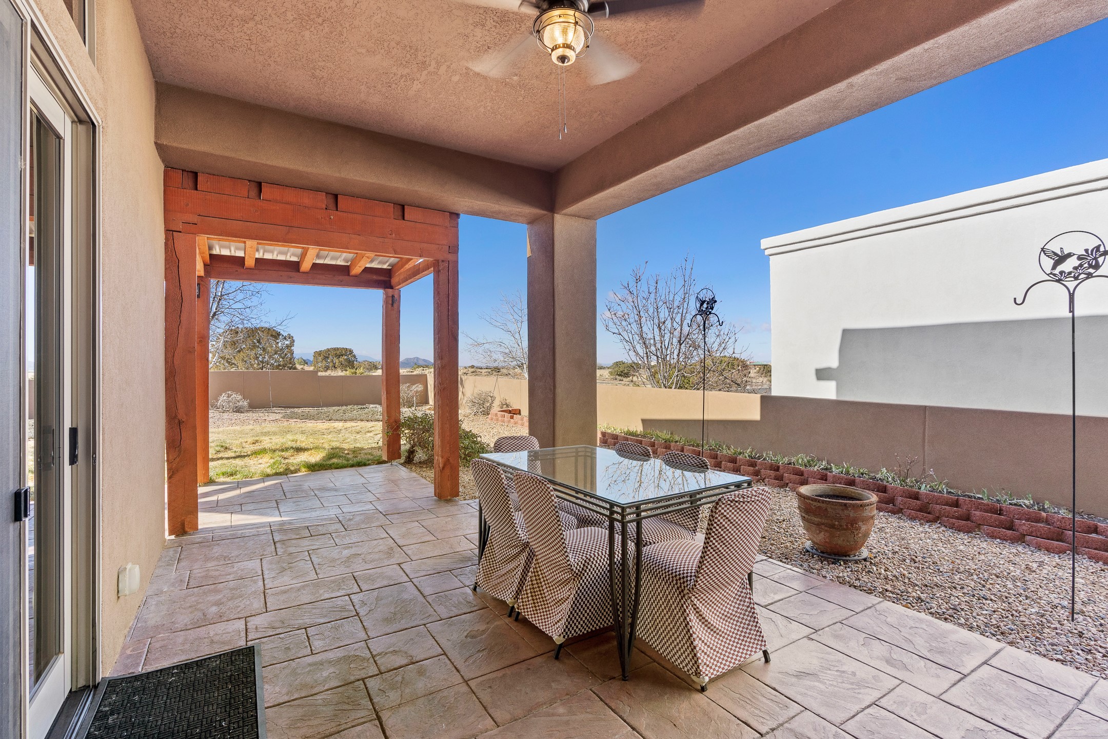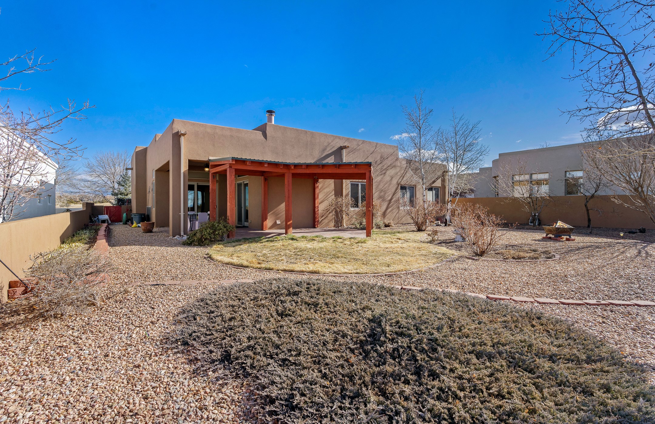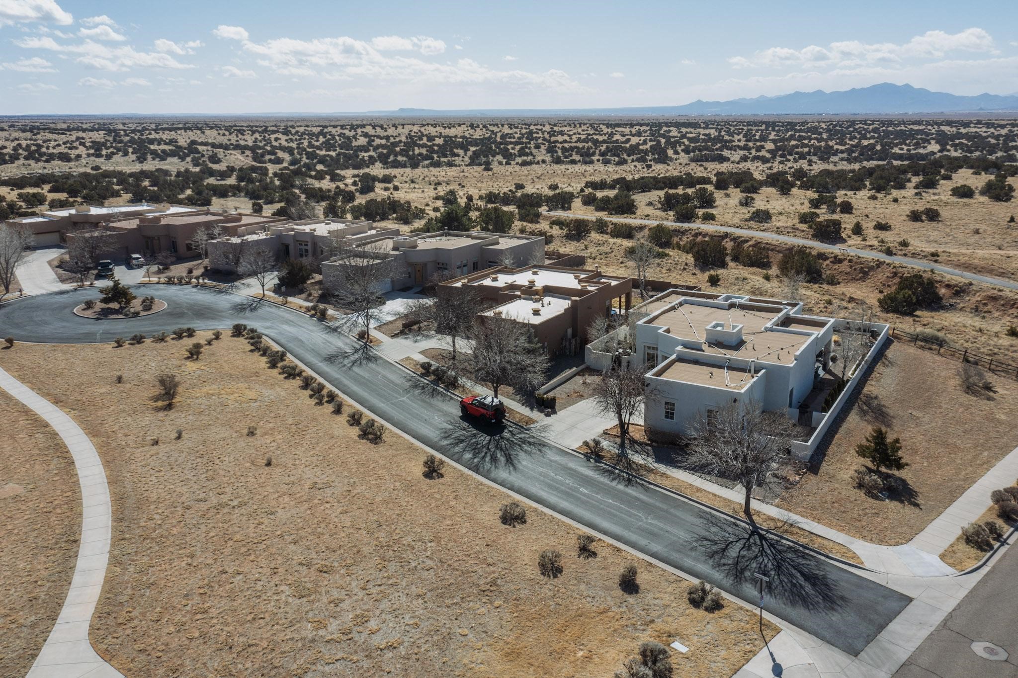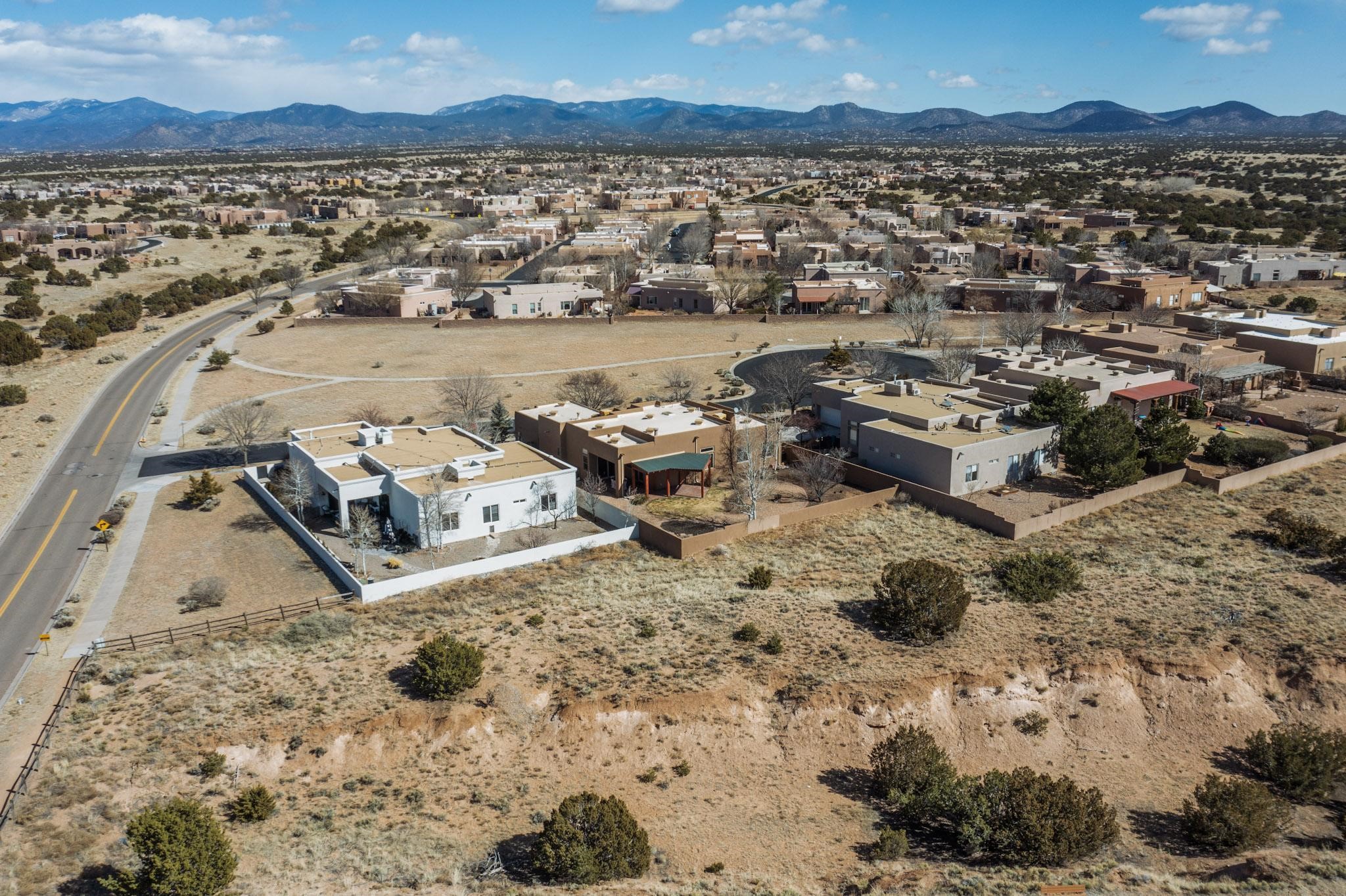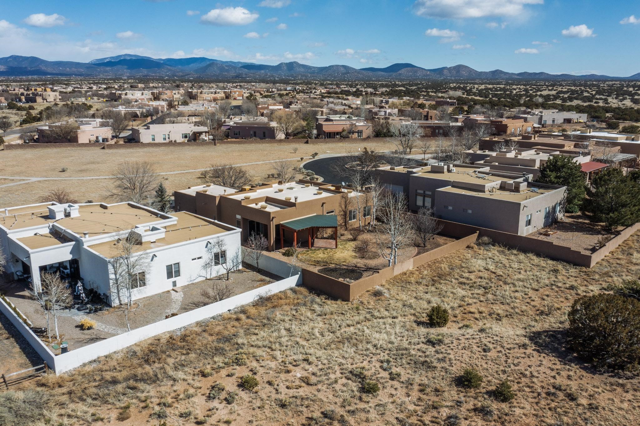 Mountain views from every room. On a quiet cul-de-sac street with open space in front and back of home with spectacular sunsets and views from the back yard. This recently updated Pueblo-style home in Rancho Viejo with new roof, new stucco, fresh interior paint, fully remodeled primary bath, added covered portal and granite island in kitchen is on a premium lot backing to vast greenbelt. The popular Mesa Verde open floor plan has four bedrooms and three full baths plus lots of usable space and storage room. The versatile 4th bedroom with private bath can serve as office, guest room, library or den. Large walled backyard for landscaping and pets with fruit trees. Behind the home is part of the 15 miles of paved walking/biking trails in the neighborhood. Near everything in Santa Fe but just far enough out for a quiet, peaceful life.