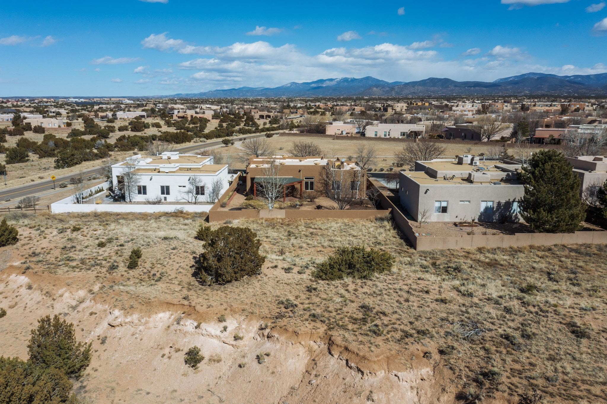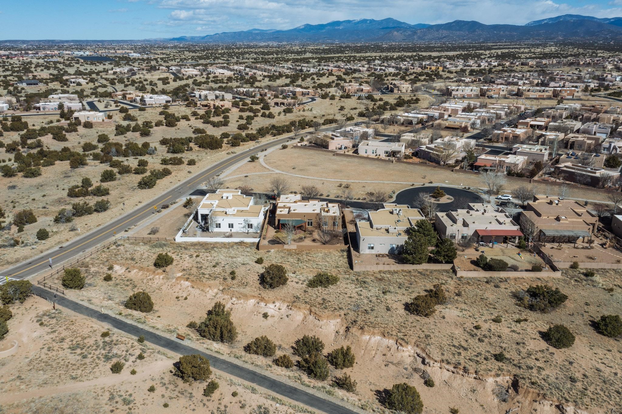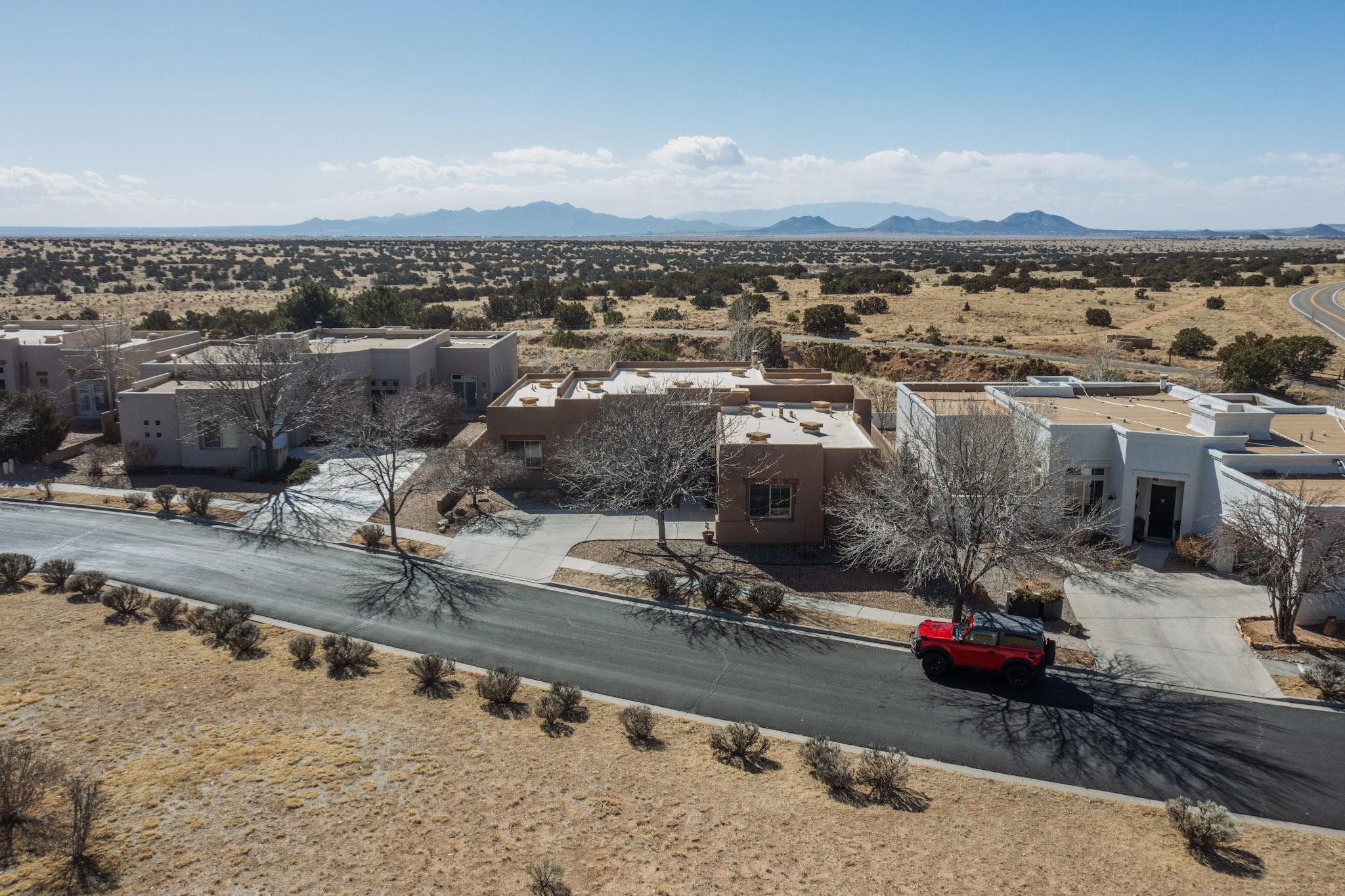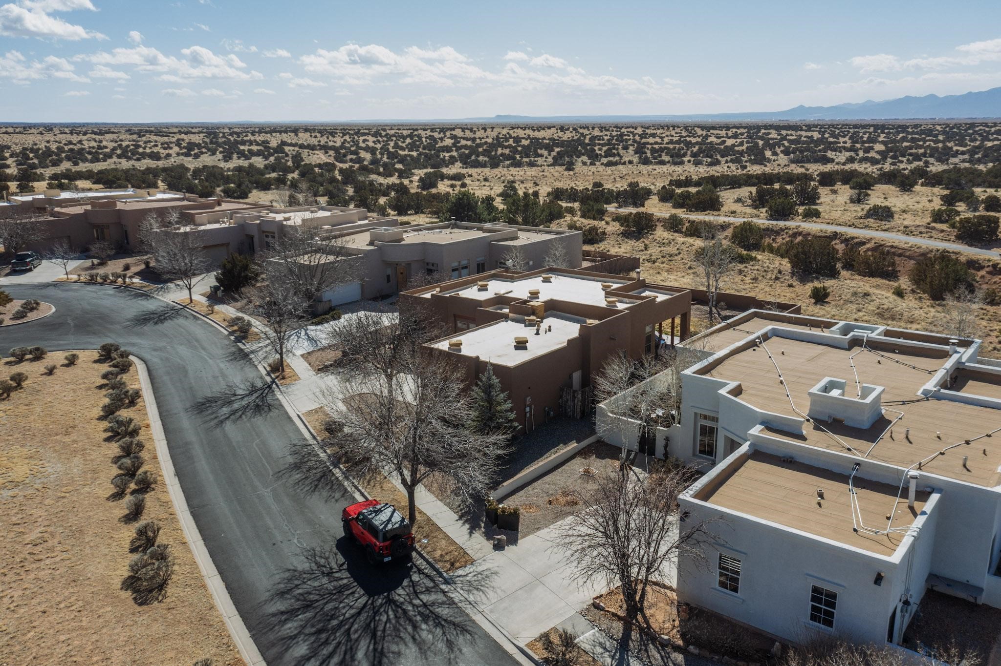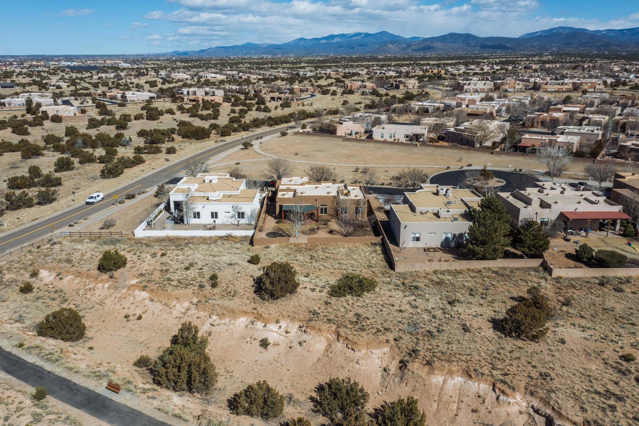 Mountain views from every room. On a quiet cul-de-sac street with open space in front and back of home with spectacular sunsets and views from the back yard. This recently updated Pueblo-style home in Rancho Viejo with new roof, new stucco, fresh interior paint, fully remodeled primary bath, added covered portal and granite island in kitchen is on a premium lot backing to vast greenbelt. The popular Mesa Verde open floor plan has four bedrooms and three full baths plus lots of usable space and storage room. The versatile 4th bedroom with private bath can serve as office, guest room, library or den. Large walled backyard for landscaping and pets with fruit trees. Behind the home is part of the 15 miles of paved walking/biking trails in the neighborhood. Near everything in Santa Fe but just far enough out for a quiet, peaceful life.