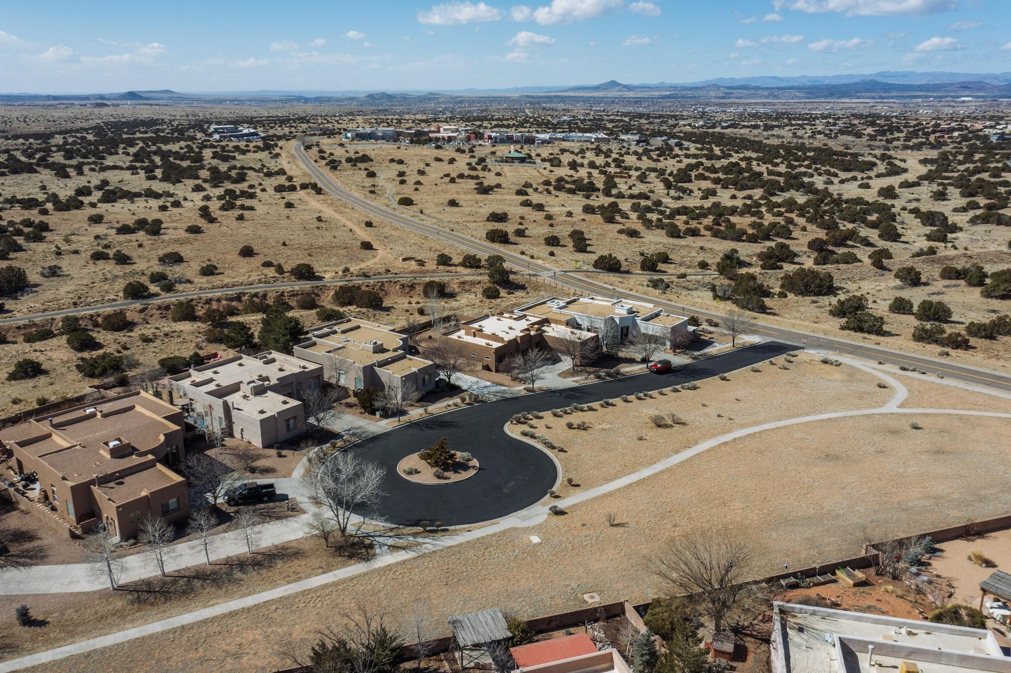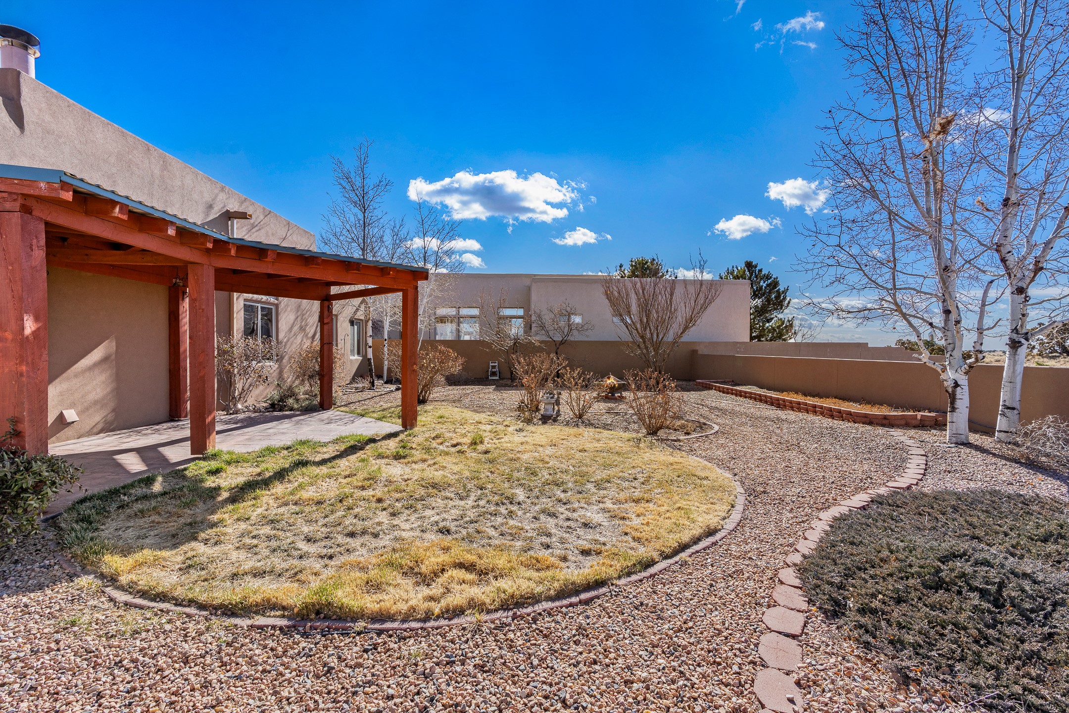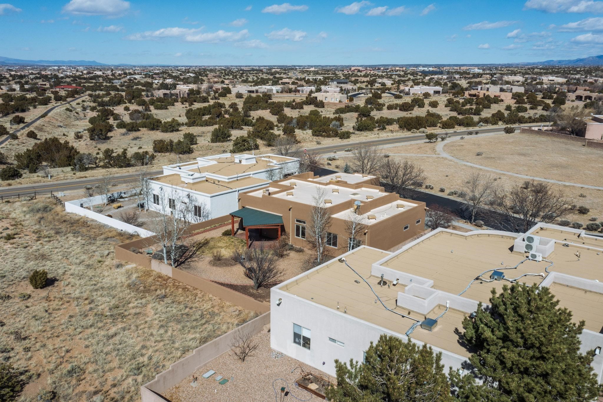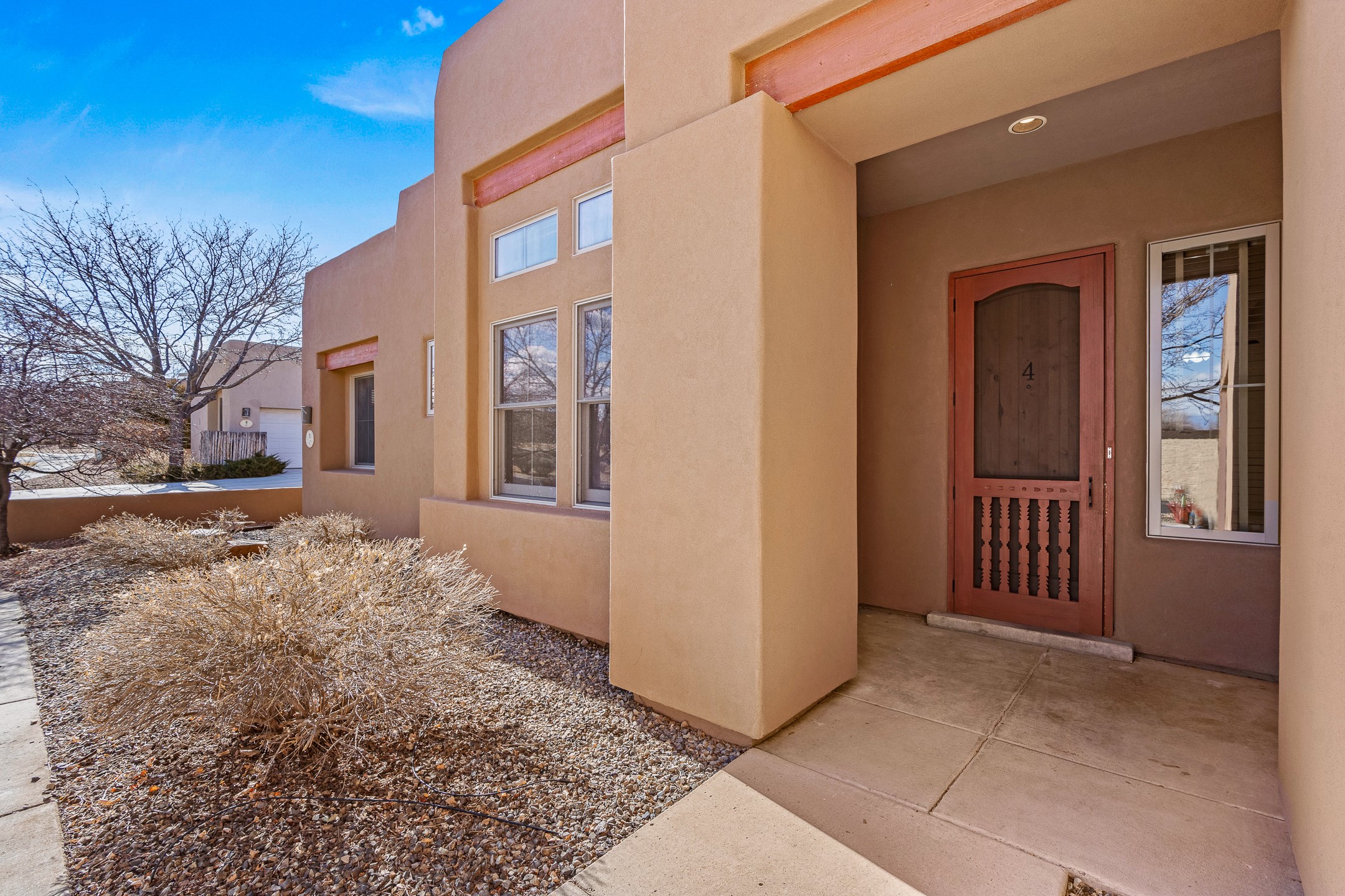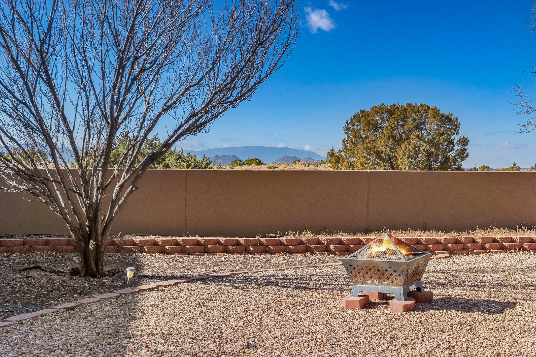 Mountain views from every room. On a quiet cul-de-sac street with open space in front and back of home with spectacular sunsets and views from the back yard. This recently updated Pueblo-style home in Rancho Viejo with new roof, new stucco, fresh interior paint, fully remodeled primary bath, added covered portal and granite island in kitchen is on a premium lot backing to vast greenbelt. The popular Mesa Verde open floor plan has four bedrooms and three full baths plus lots of usable space and storage room. The versatile 4th bedroom with private bath can serve as office, guest room, library or den. Large walled backyard for landscaping and pets with fruit trees. Behind the home is part of the 15 miles of paved walking/biking trails in the neighborhood. Near everything in Santa Fe but just far enough out for a quiet, peaceful life.