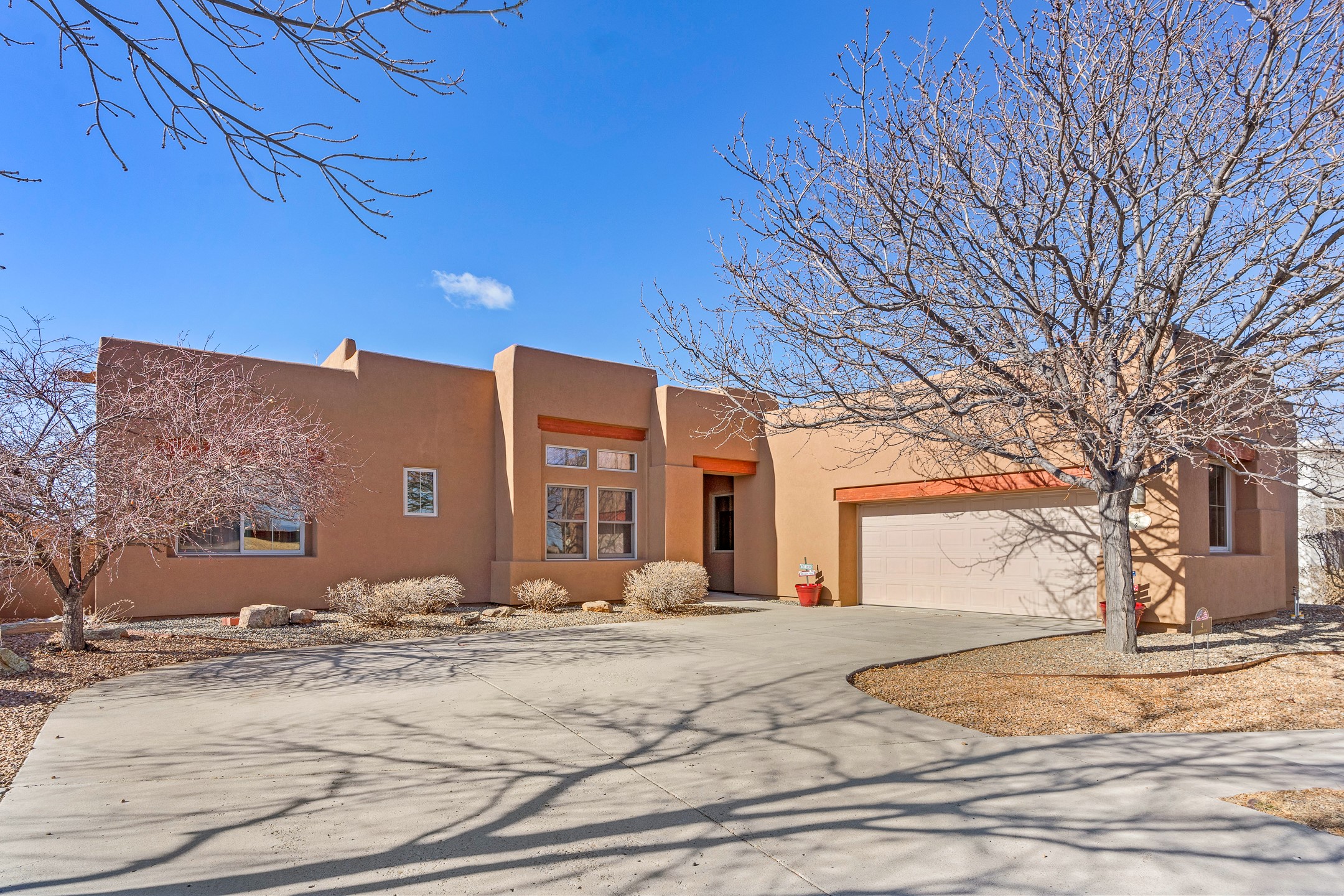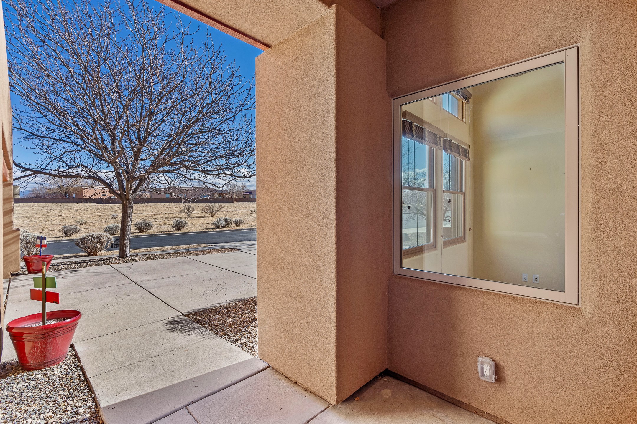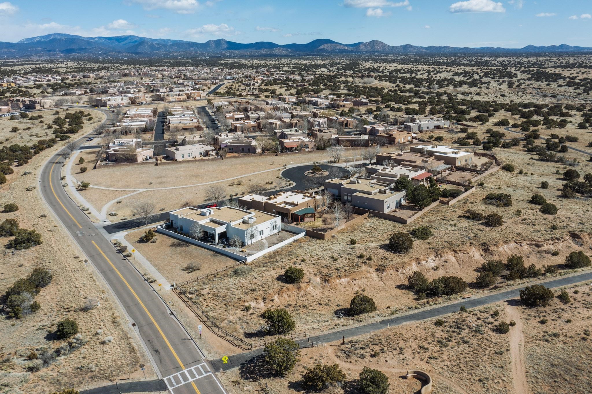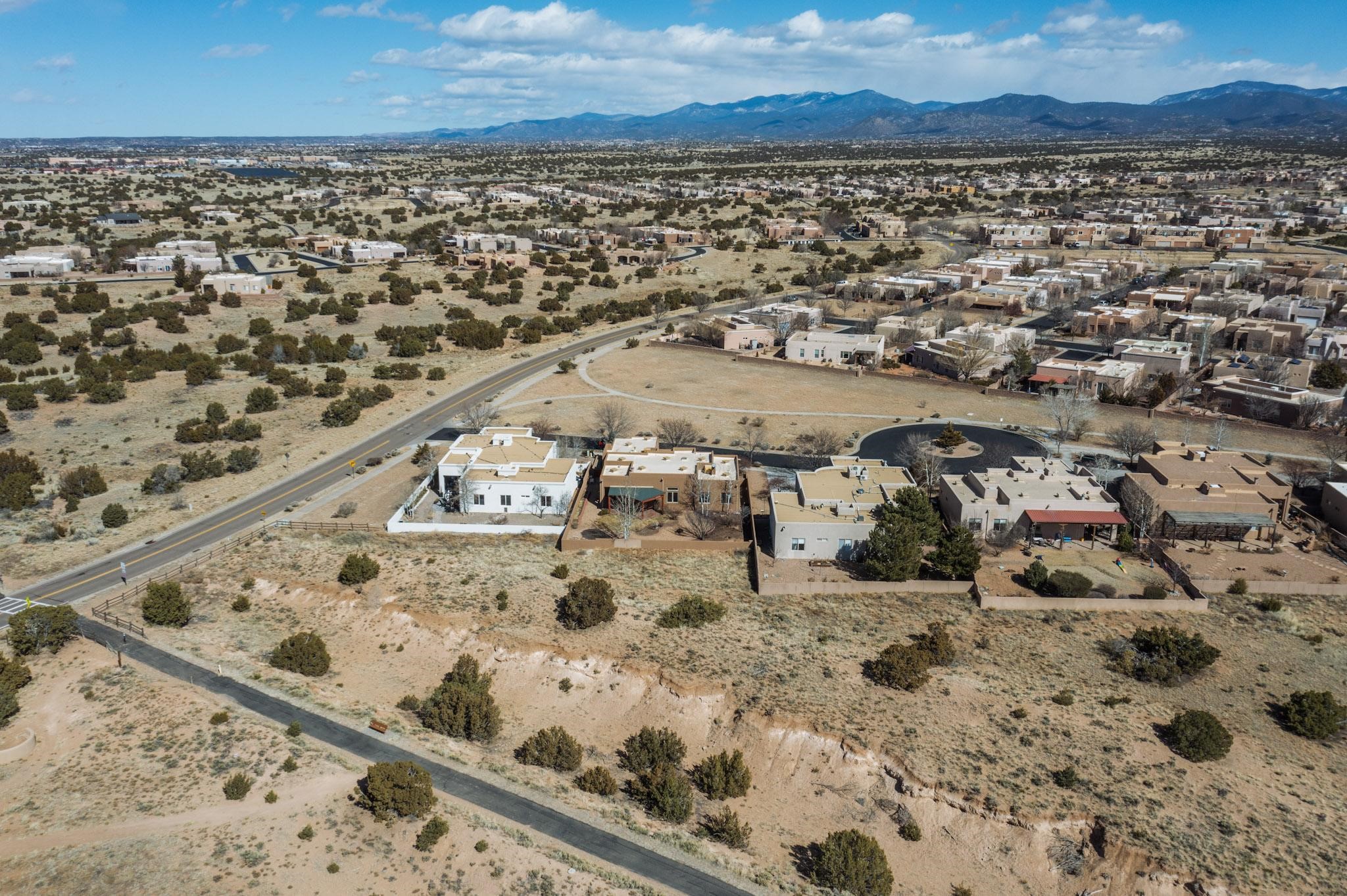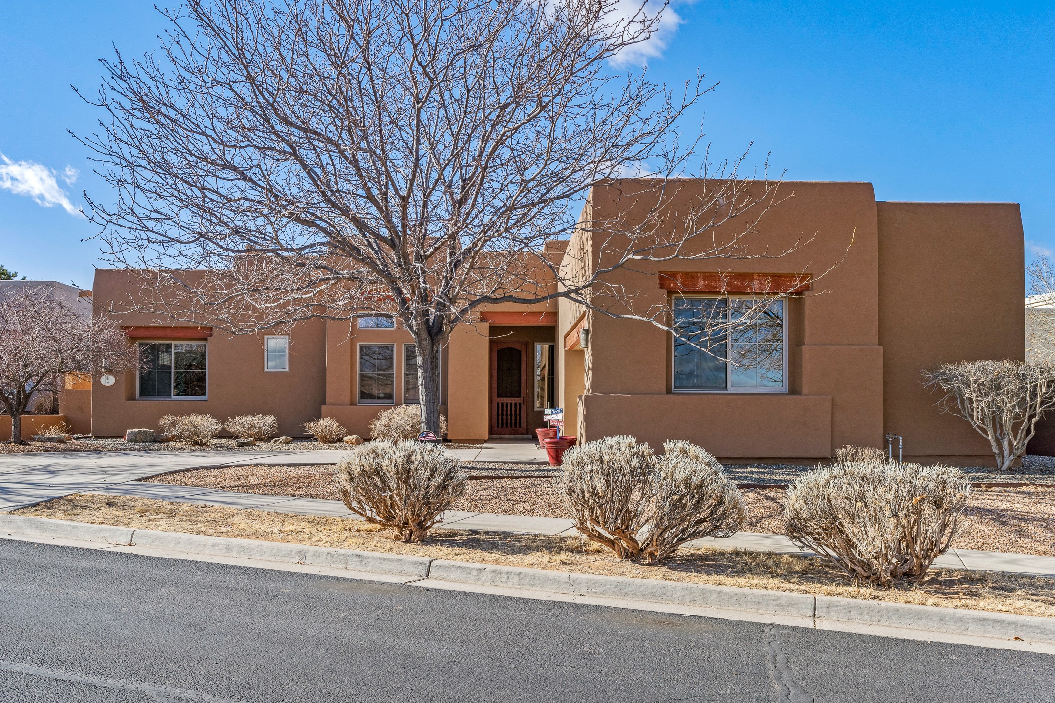 Mountain views from every room. On a quiet cul-de-sac street with open space in front and back of home with spectacular sunsets and views from the back yard. This recently updated Pueblo-style home in Rancho Viejo with new roof, new stucco, fresh interior paint, fully remodeled primary bath, added covered portal and granite island in kitchen is on a premium lot backing to vast greenbelt. The popular Mesa Verde open floor plan has four bedrooms and three full baths plus lots of usable space and storage room. The versatile 4th bedroom with private bath can serve as office, guest room, library or den. Large walled backyard for landscaping and pets with fruit trees. Behind the home is part of the 15 miles of paved walking/biking trails in the neighborhood. Near everything in Santa Fe but just far enough out for a quiet, peaceful life.