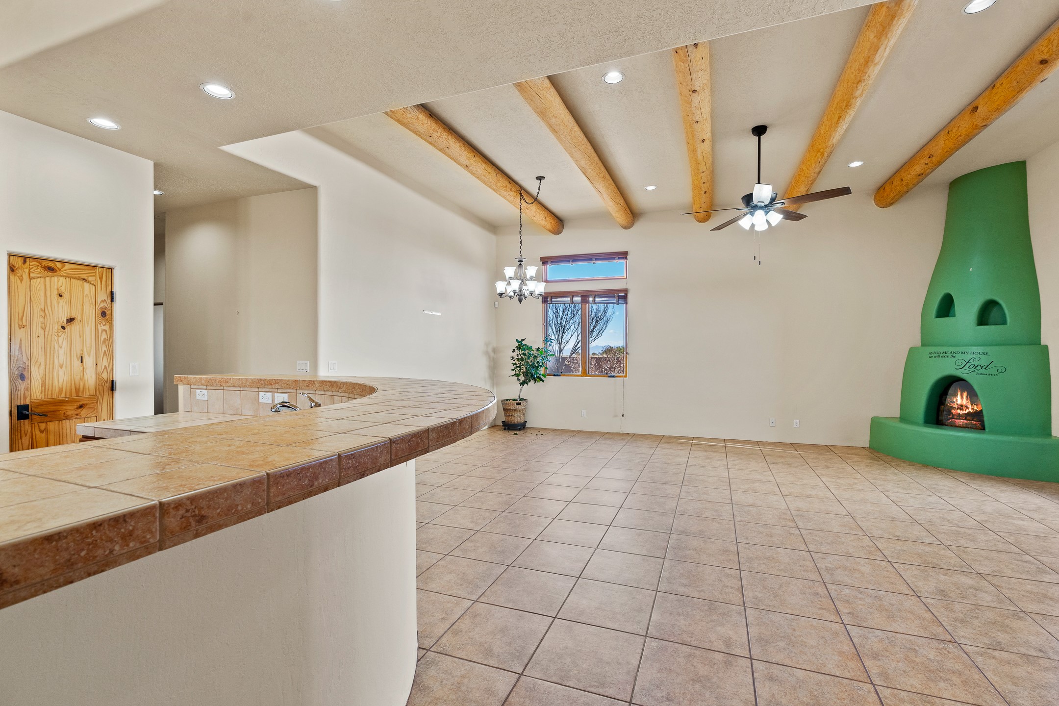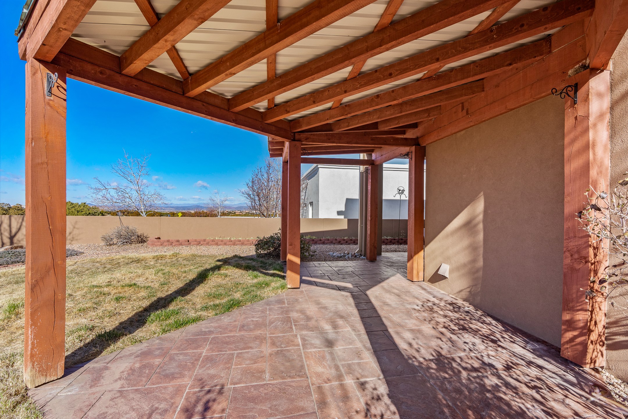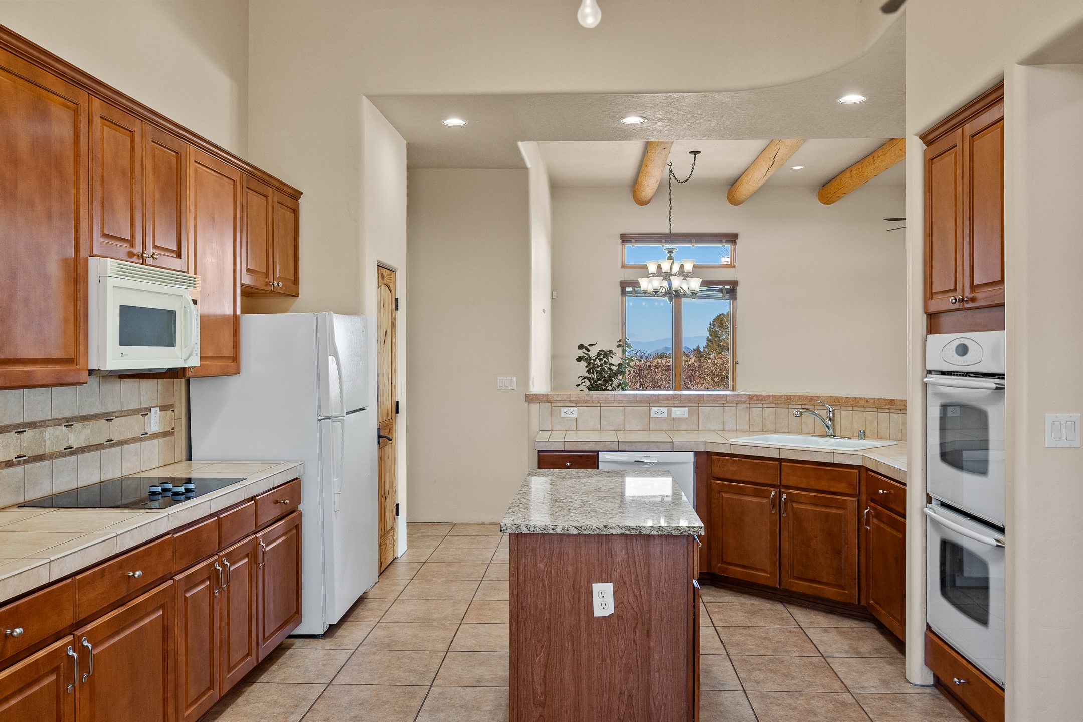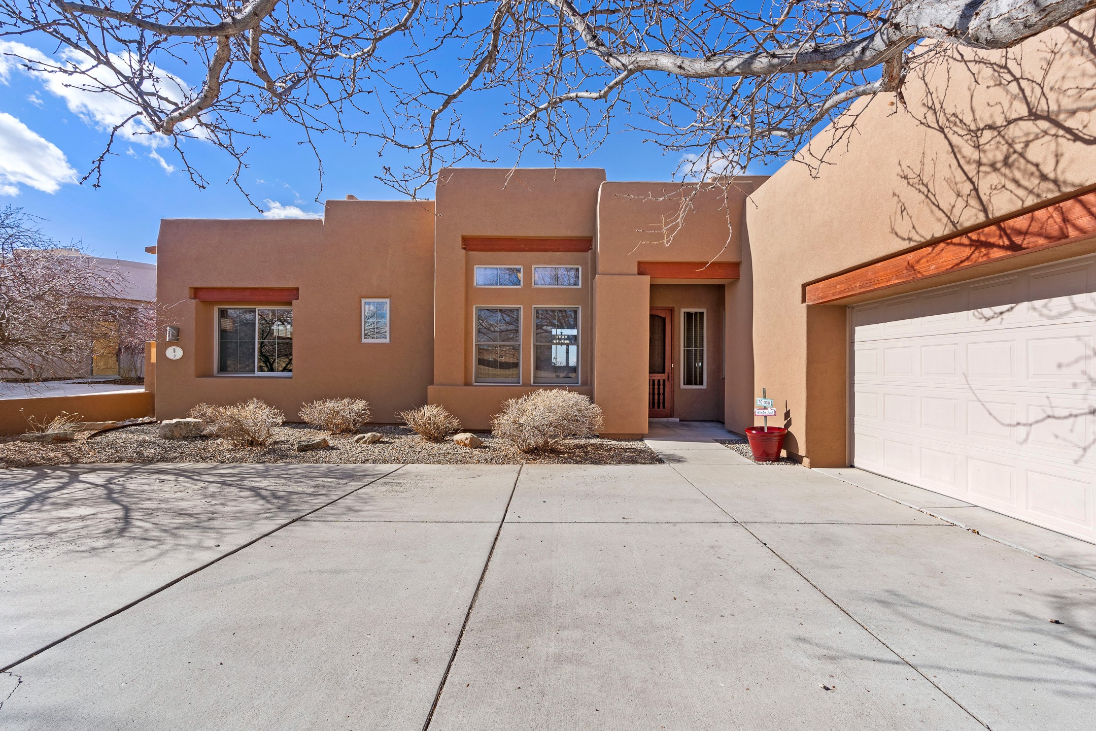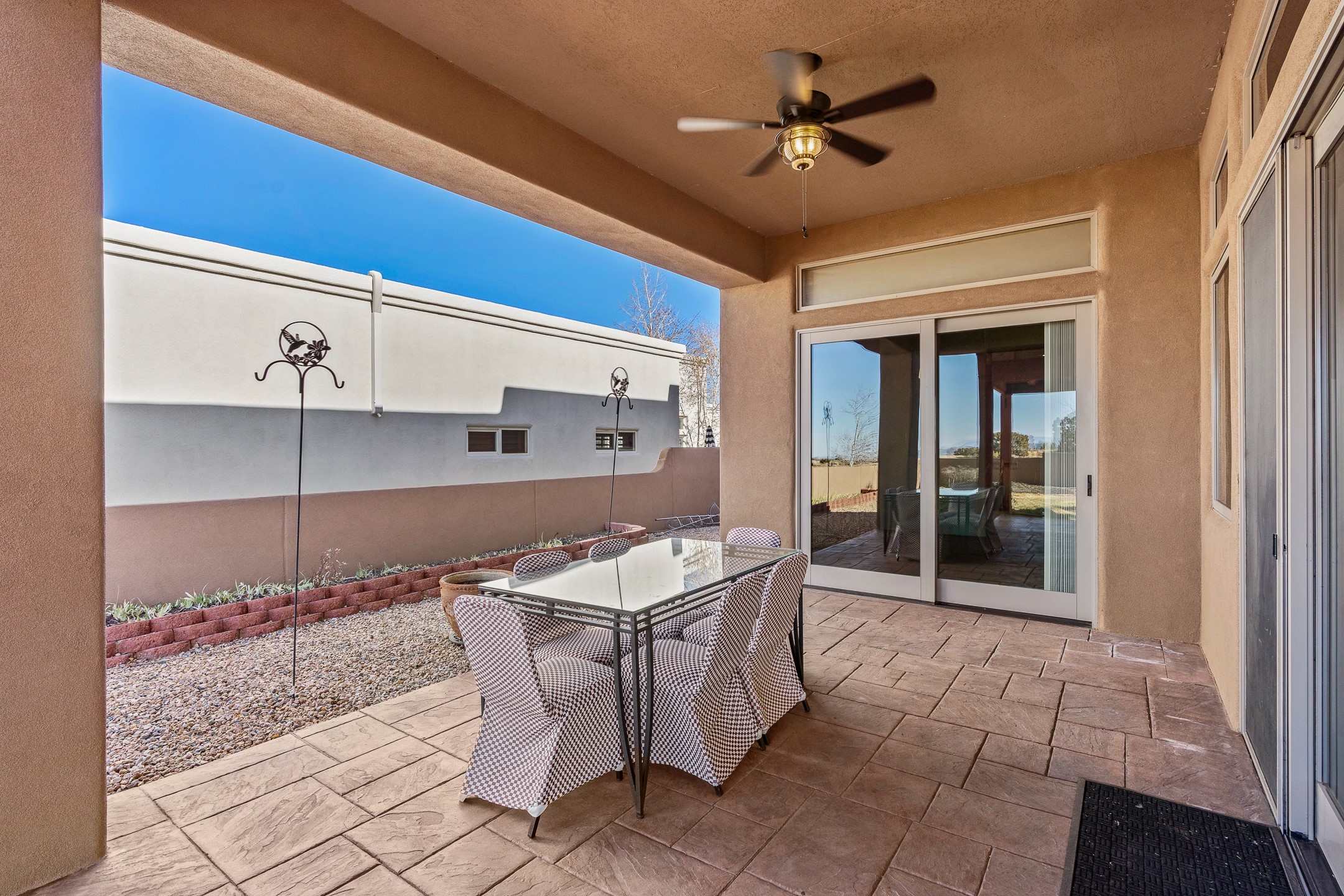 Mountain views from every room. On a quiet cul-de-sac street with open space in front and back of home with spectacular sunsets and views from the back yard. This recently updated Pueblo-style home in Rancho Viejo with new roof, new stucco, fresh interior paint, fully remodeled primary bath, added covered portal and granite island in kitchen is on a premium lot backing to vast greenbelt. The popular Mesa Verde open floor plan has four bedrooms and three full baths plus lots of usable space and storage room. The versatile 4th bedroom with private bath can serve as office, guest room, library or den. Large walled backyard for landscaping and pets with fruit trees. Behind the home is part of the 15 miles of paved walking/biking trails in the neighborhood. Near everything in Santa Fe but just far enough out for a quiet, peaceful life.