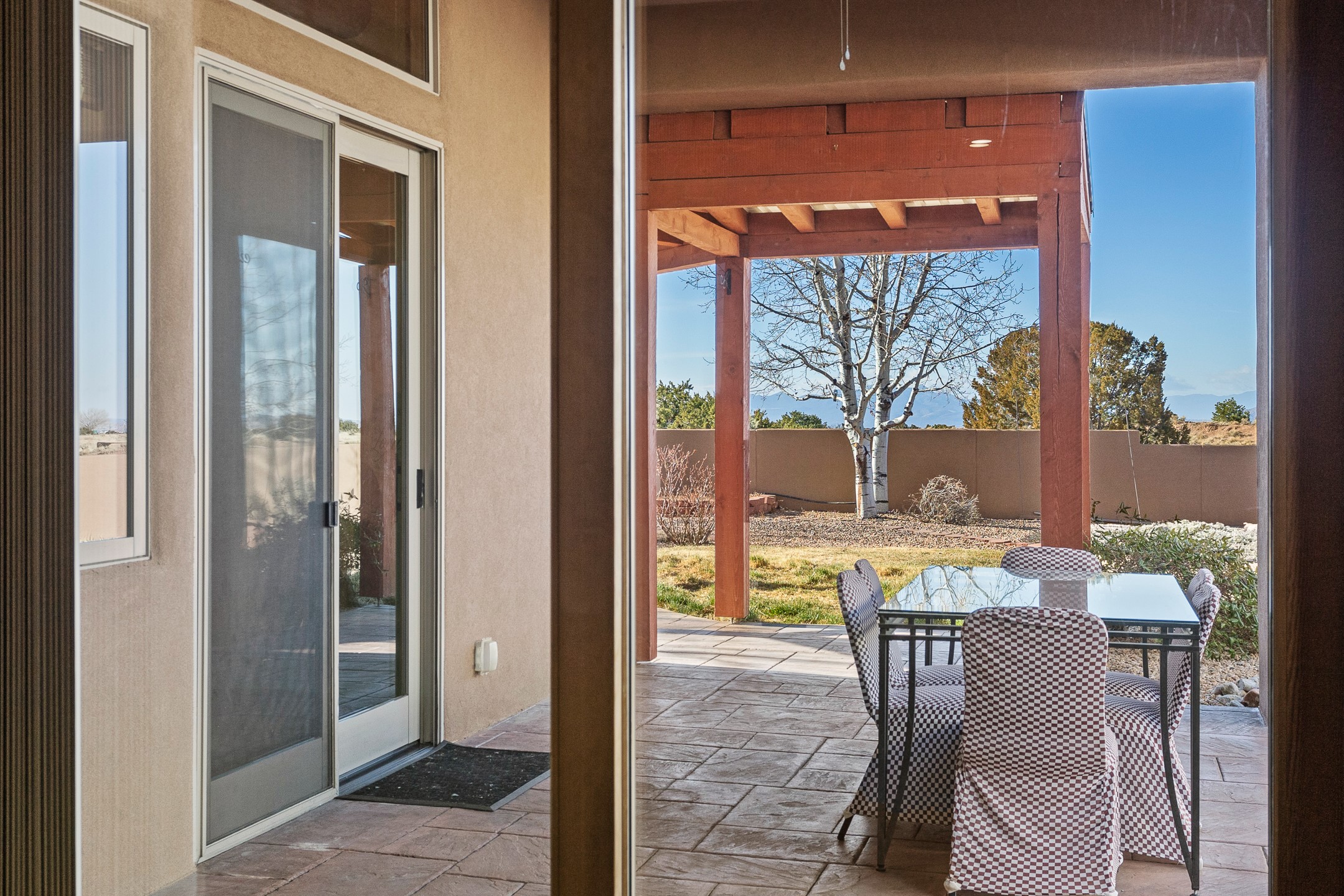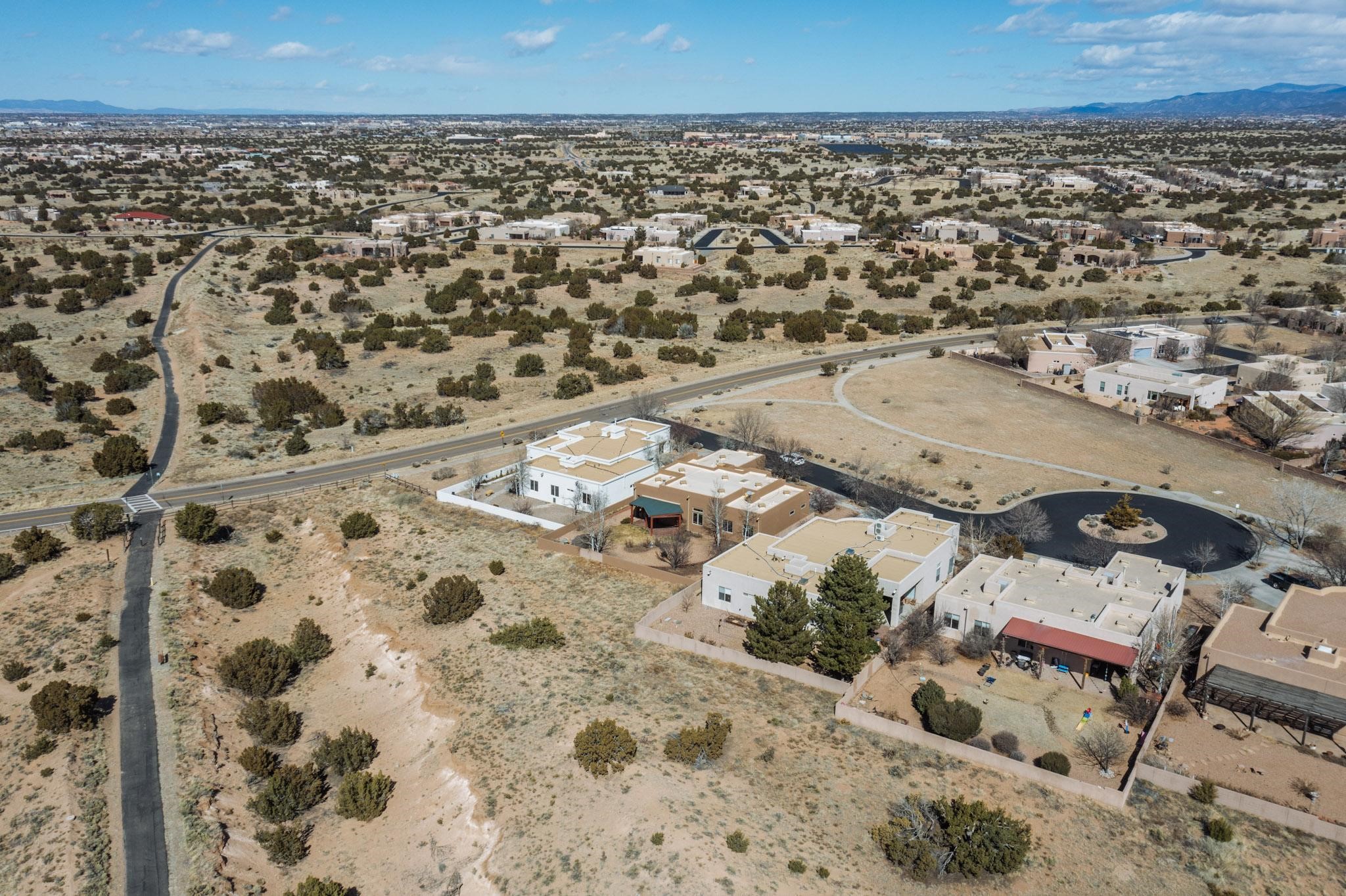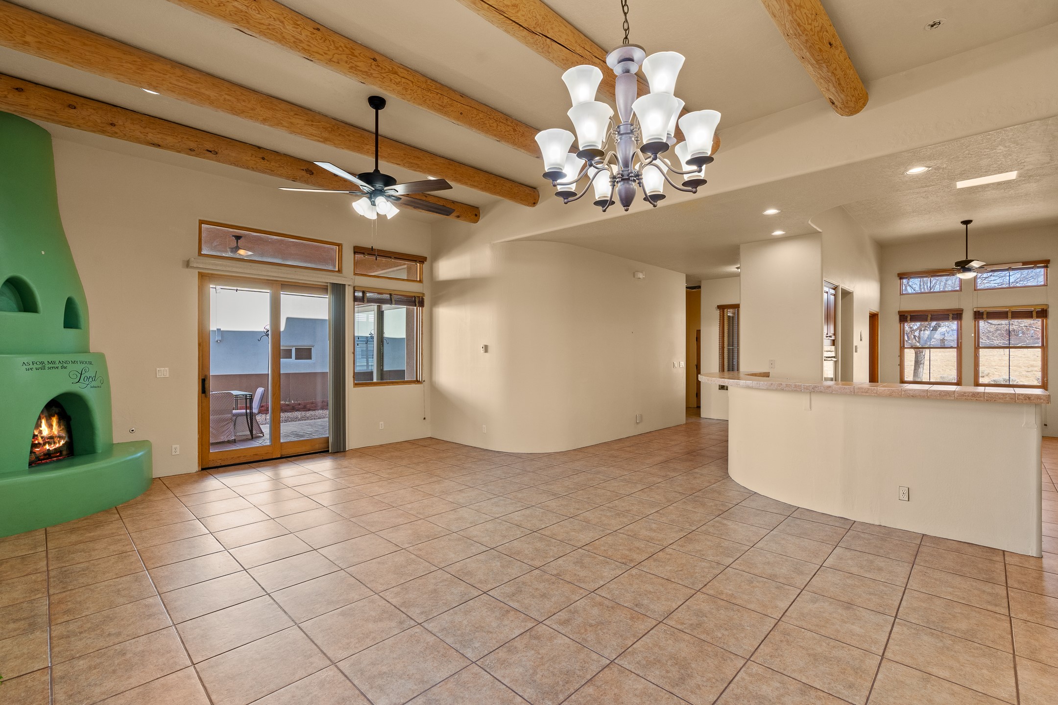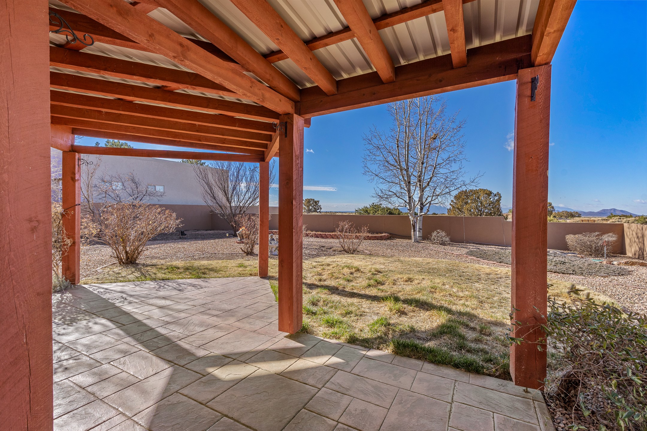 Mountain views from every room. On a quiet cul-de-sac street with open space in front and back of home with spectacular sunsets and views from the back yard. This recently updated Pueblo-style home in Rancho Viejo with new roof, new stucco, fresh interior paint, fully remodeled primary bath, added covered portal and granite island in kitchen is on a premium lot backing to vast greenbelt. The popular Mesa Verde open floor plan has four bedrooms and three full baths plus lots of usable space and storage room. The versatile 4th bedroom with private bath can serve as office, guest room, library or den. Large walled backyard for landscaping and pets with fruit trees. Behind the home is part of the 15 miles of paved walking/biking trails in the neighborhood. Near everything in Santa Fe but just far enough out for a quiet, peaceful life.