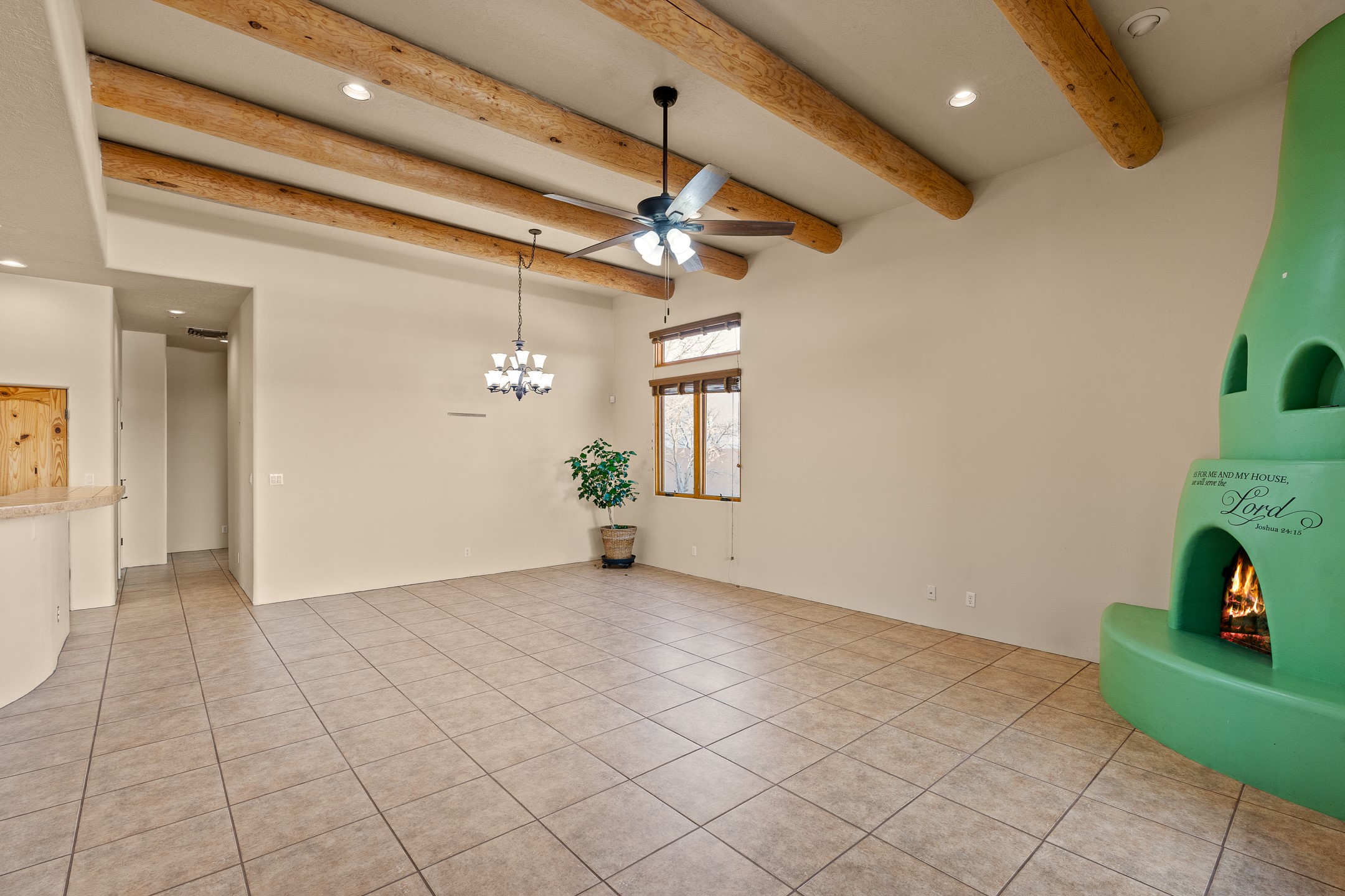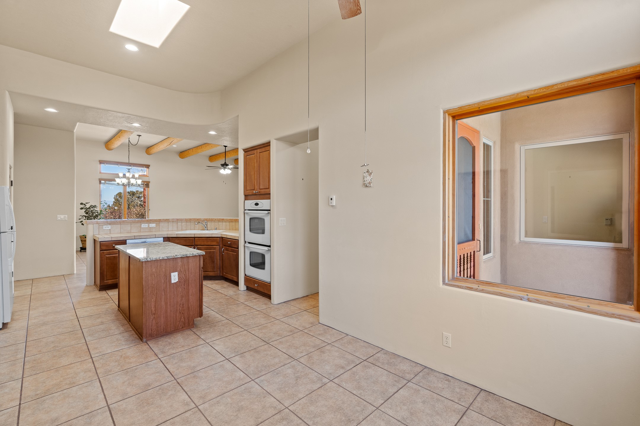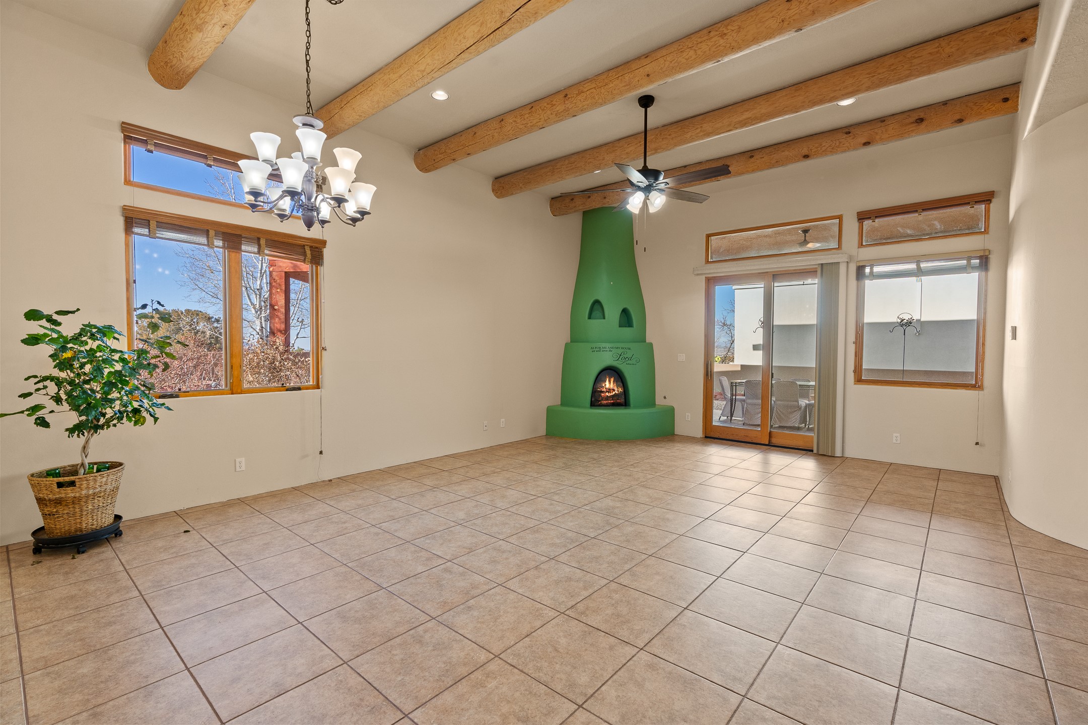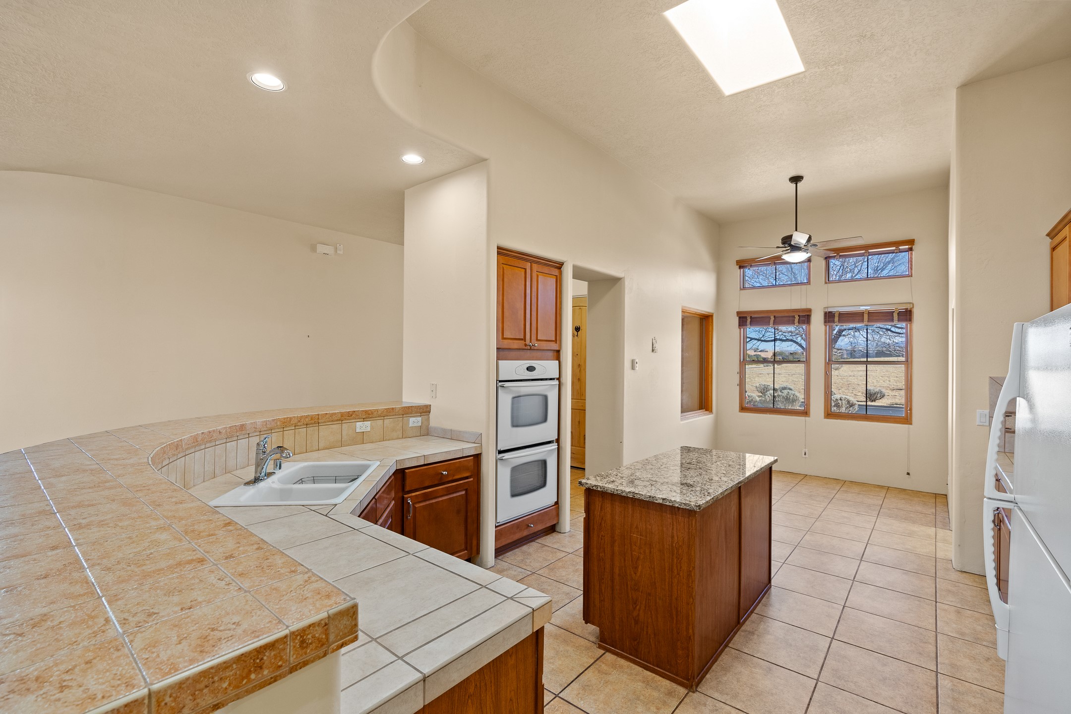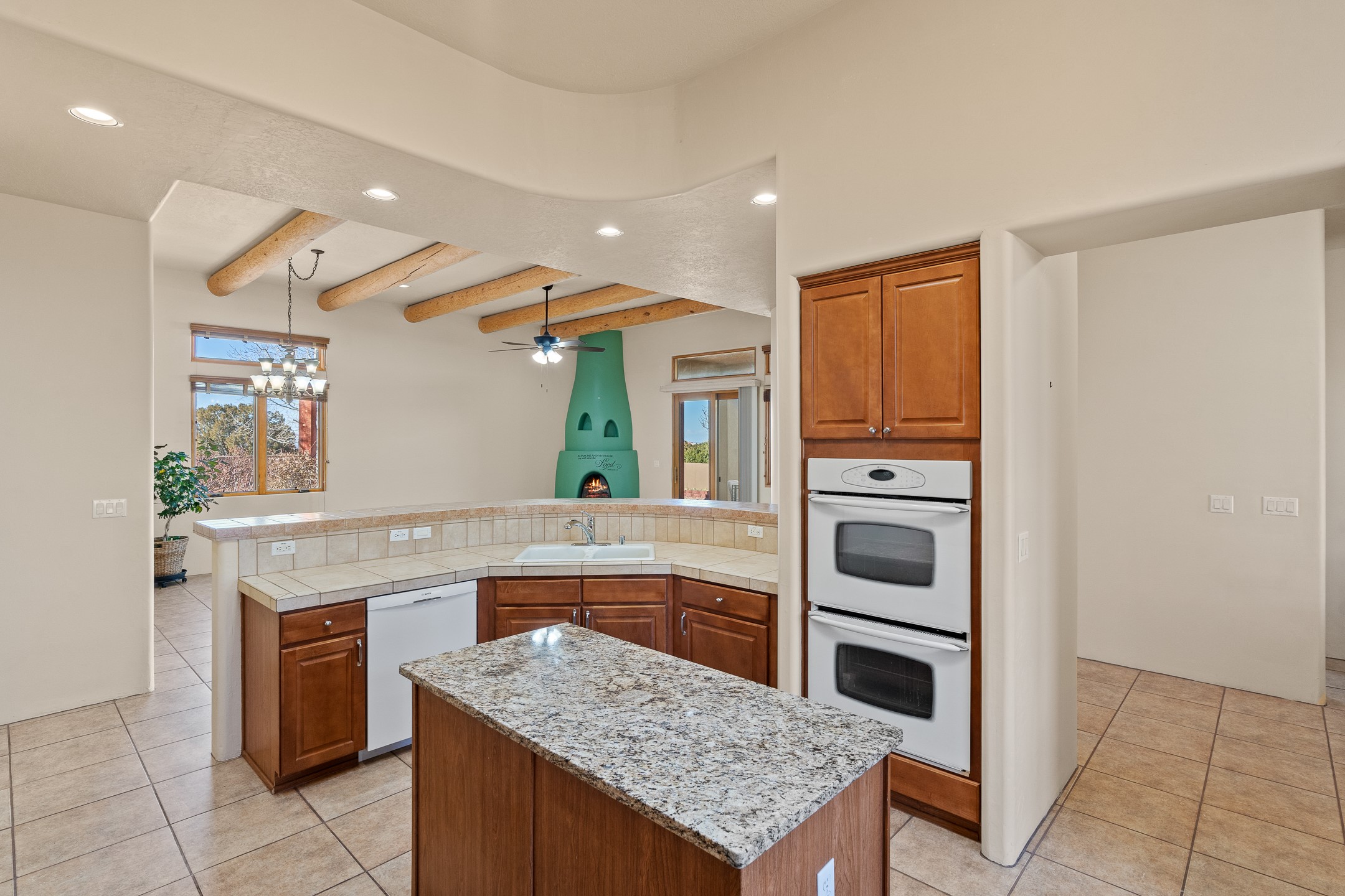 Mountain views from every room. On a quiet cul-de-sac street with open space in front and back of home with spectacular sunsets and views from the back yard. This recently updated Pueblo-style home in Rancho Viejo with new roof, new stucco, fresh interior paint, fully remodeled primary bath, added covered portal and granite island in kitchen is on a premium lot backing to vast greenbelt. The popular Mesa Verde open floor plan has four bedrooms and three full baths plus lots of usable space and storage room. The versatile 4th bedroom with private bath can serve as office, guest room, library or den. Large walled backyard for landscaping and pets with fruit trees. Behind the home is part of the 15 miles of paved walking/biking trails in the neighborhood. Near everything in Santa Fe but just far enough out for a quiet, peaceful life.