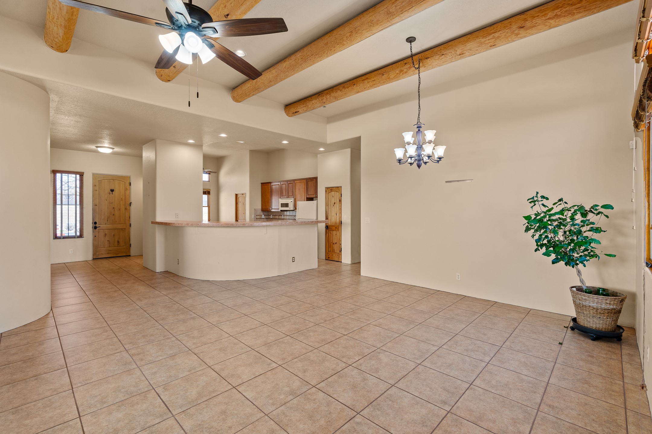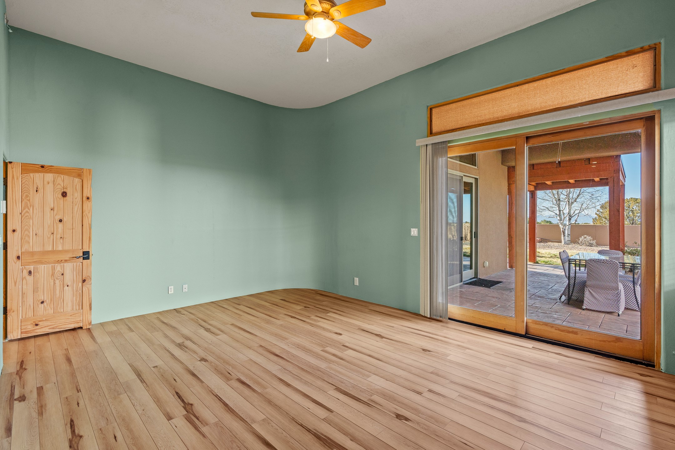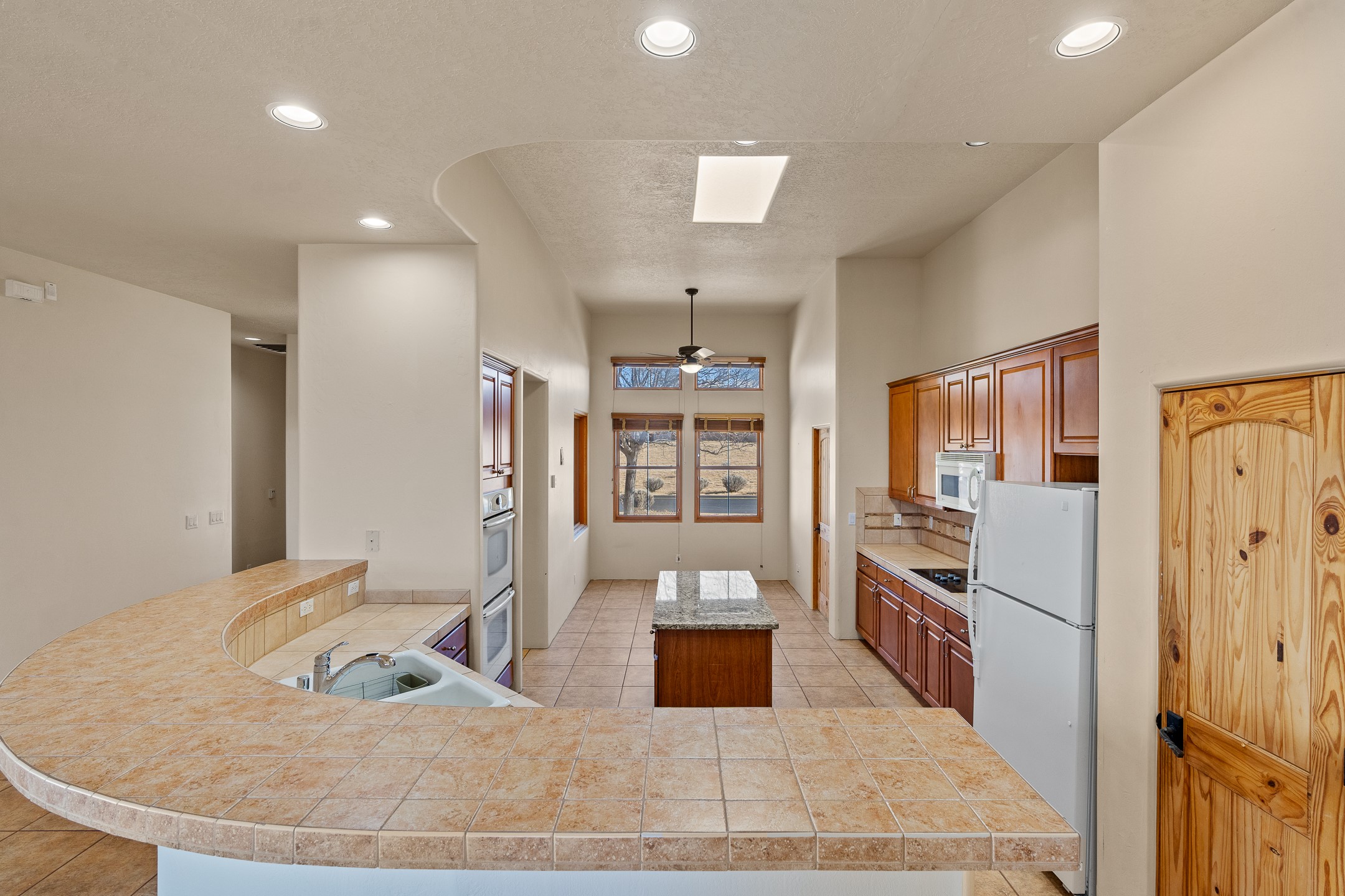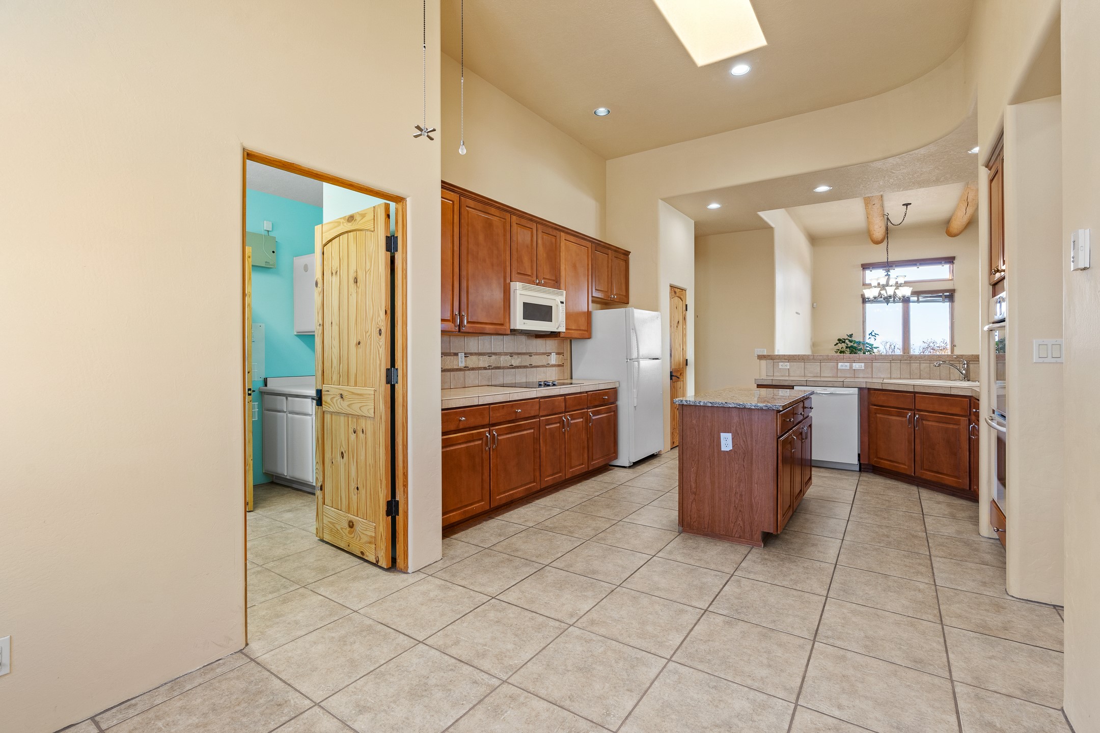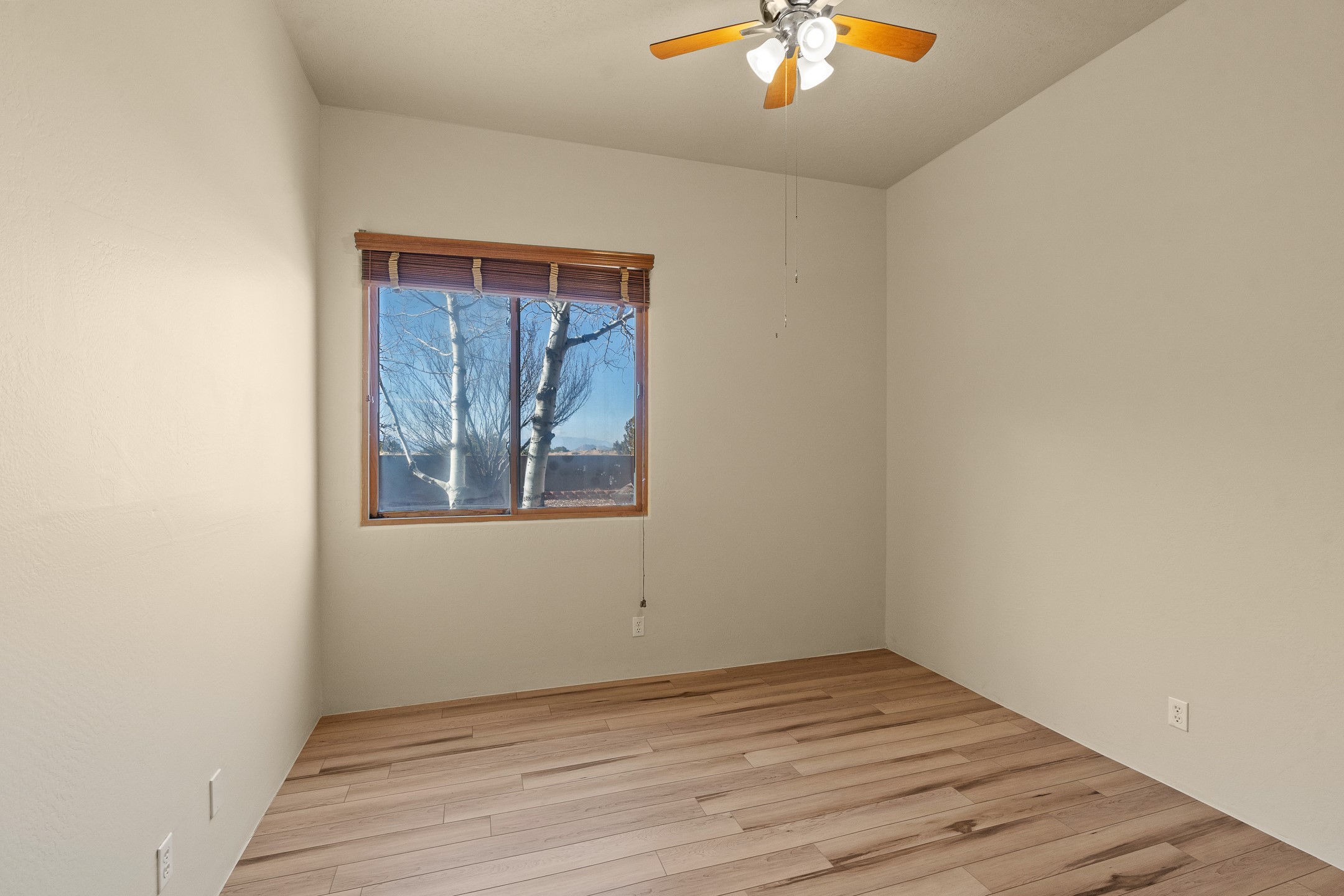 Mountain views from every room. On a quiet cul-de-sac street with open space in front and back of home with spectacular sunsets and views from the back yard. This recently updated Pueblo-style home in Rancho Viejo with new roof, new stucco, fresh interior paint, fully remodeled primary bath, added covered portal and granite island in kitchen is on a premium lot backing to vast greenbelt. The popular Mesa Verde open floor plan has four bedrooms and three full baths plus lots of usable space and storage room. The versatile 4th bedroom with private bath can serve as office, guest room, library or den. Large walled backyard for landscaping and pets with fruit trees. Behind the home is part of the 15 miles of paved walking/biking trails in the neighborhood. Near everything in Santa Fe but just far enough out for a quiet, peaceful life.
