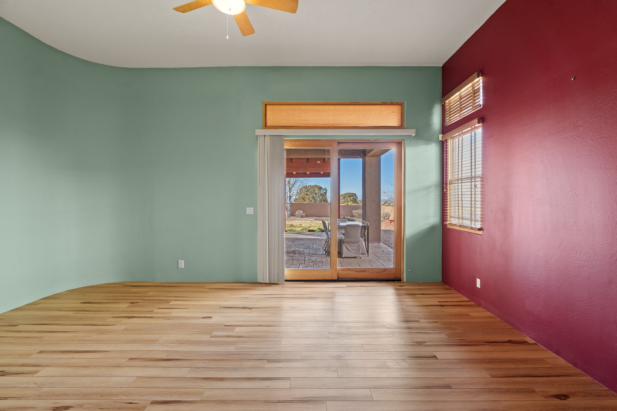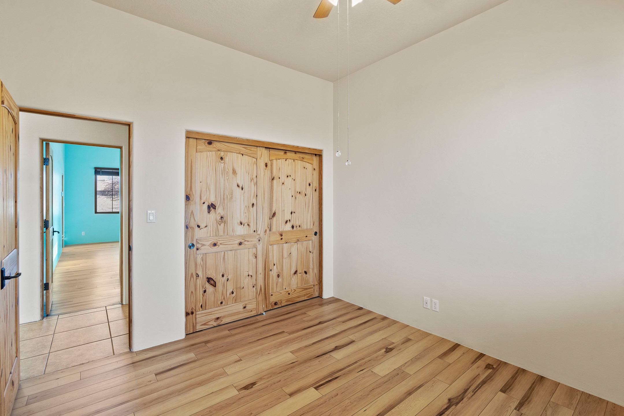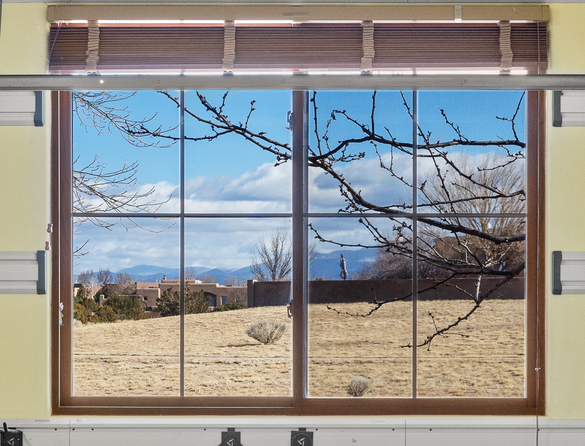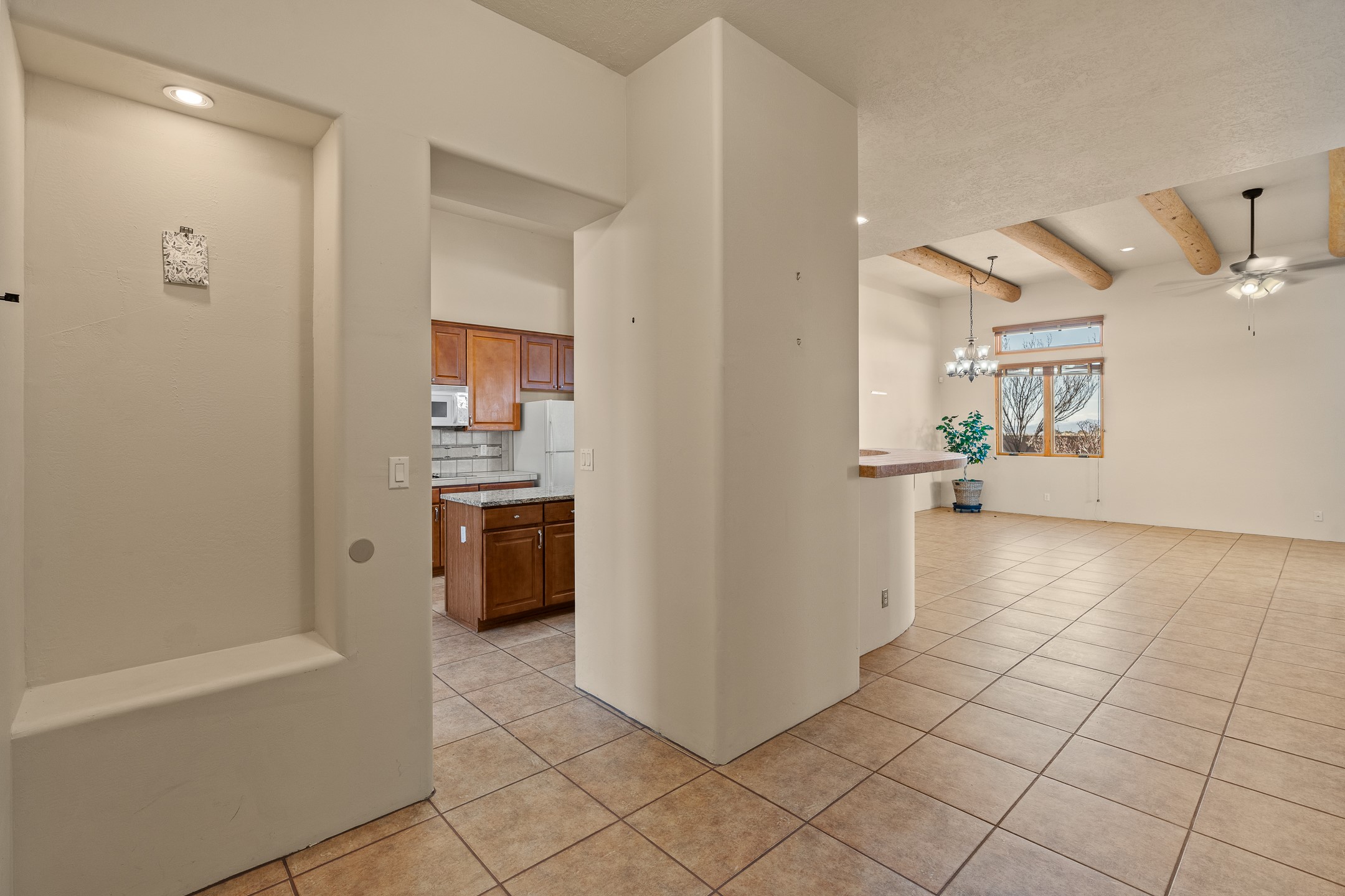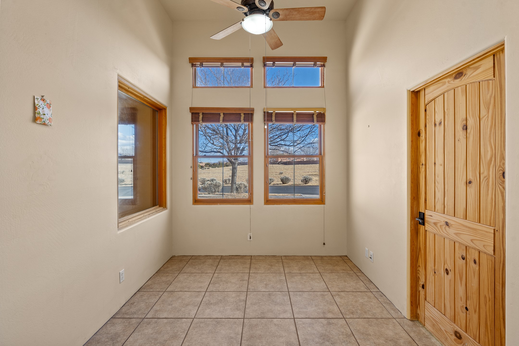 Mountain views from every room. On a quiet cul-de-sac street with open space in front and back of home with spectacular sunsets and views from the back yard. This recently updated Pueblo-style home in Rancho Viejo with new roof, new stucco, fresh interior paint, fully remodeled primary bath, added covered portal and granite island in kitchen is on a premium lot backing to vast greenbelt. The popular Mesa Verde open floor plan has four bedrooms and three full baths plus lots of usable space and storage room. The versatile 4th bedroom with private bath can serve as office, guest room, library or den. Large walled backyard for landscaping and pets with fruit trees. Behind the home is part of the 15 miles of paved walking/biking trails in the neighborhood. Near everything in Santa Fe but just far enough out for a quiet, peaceful life.