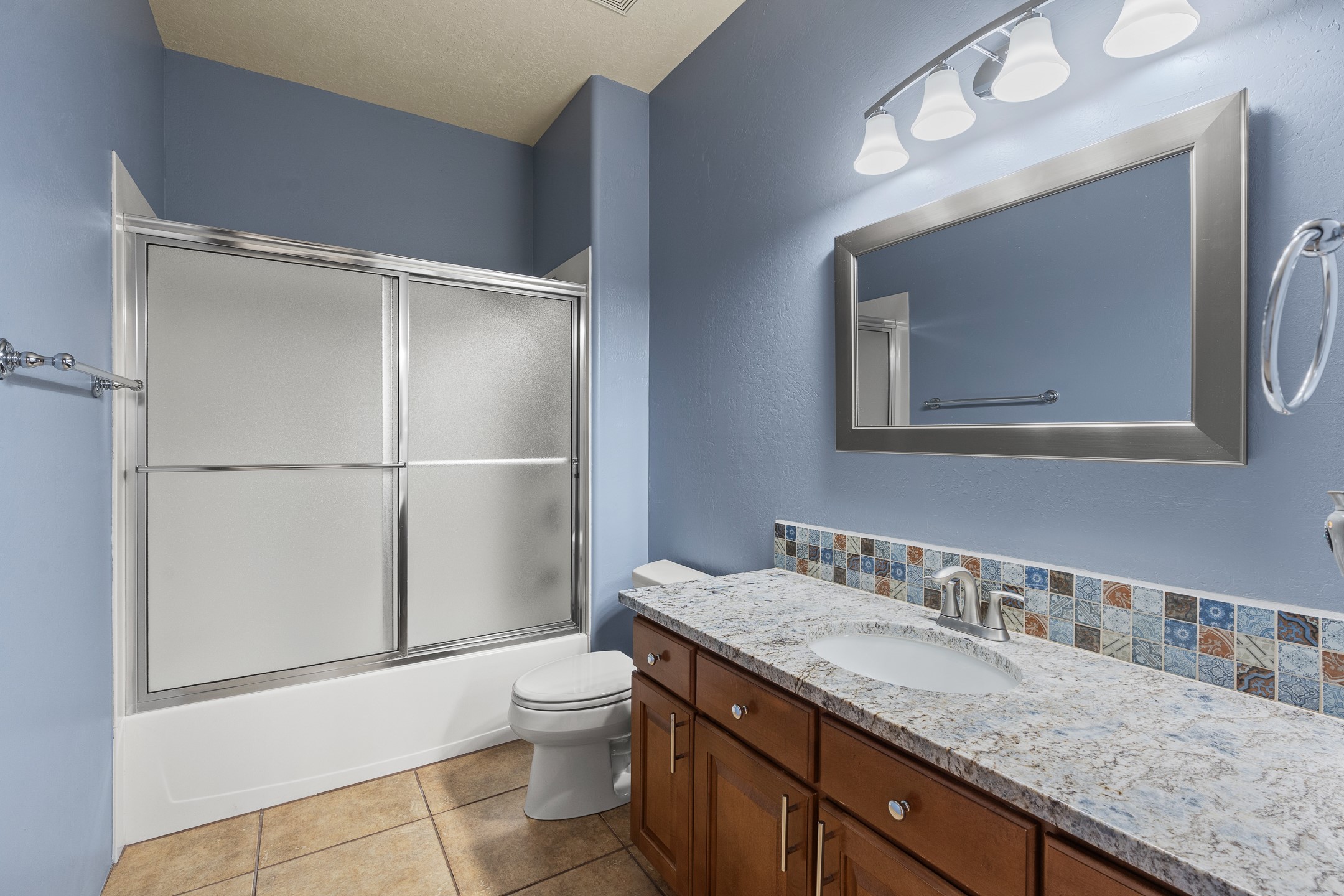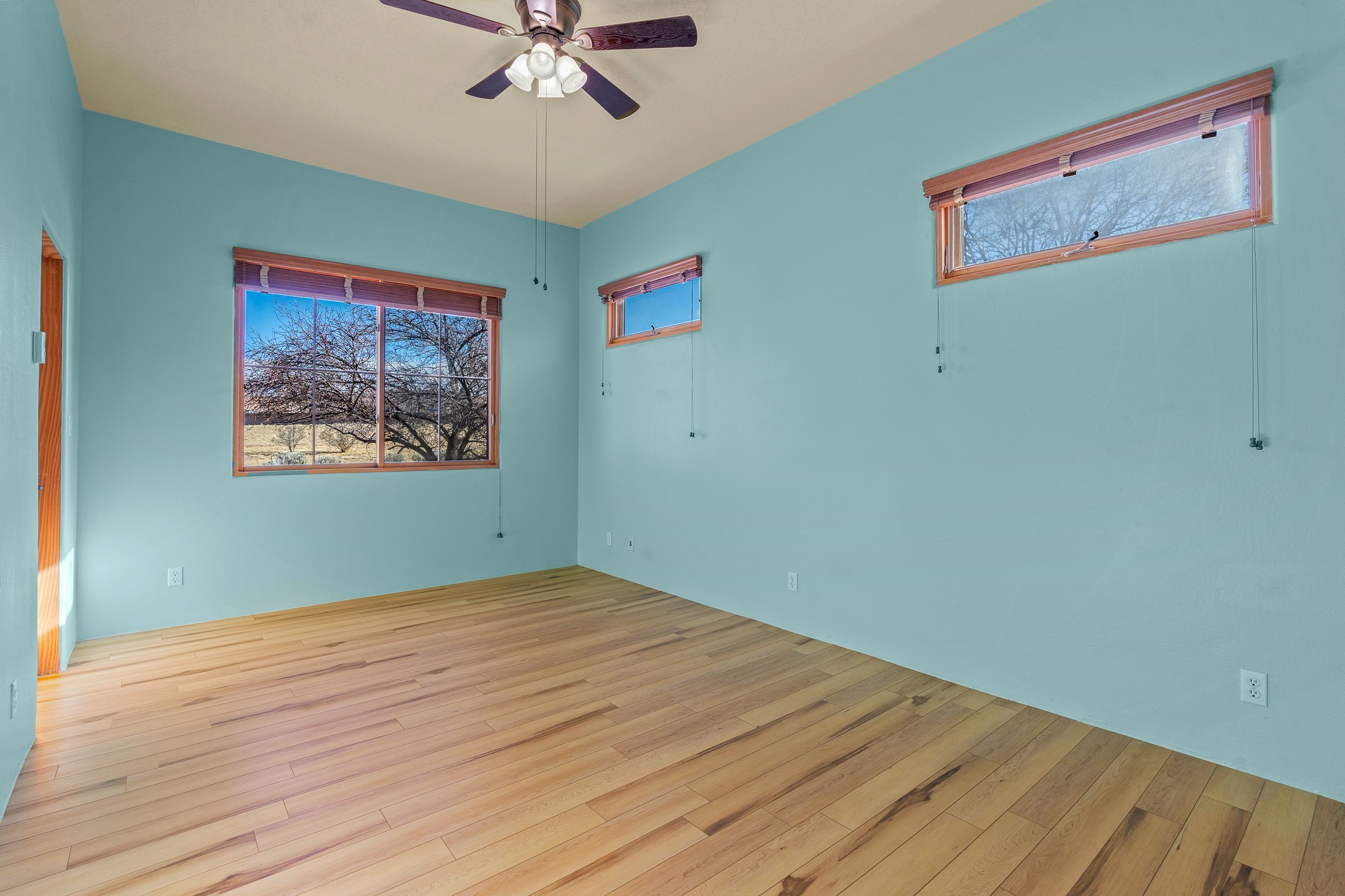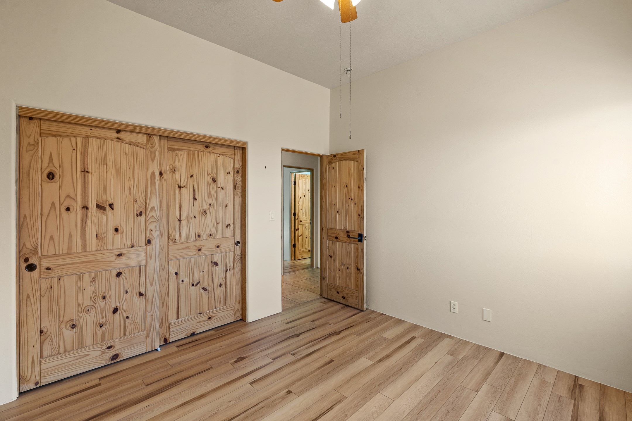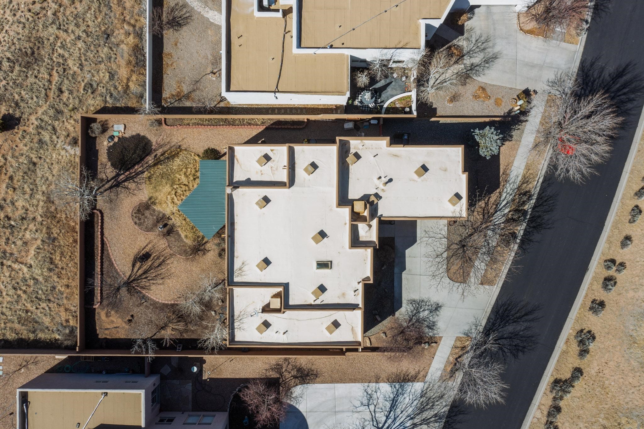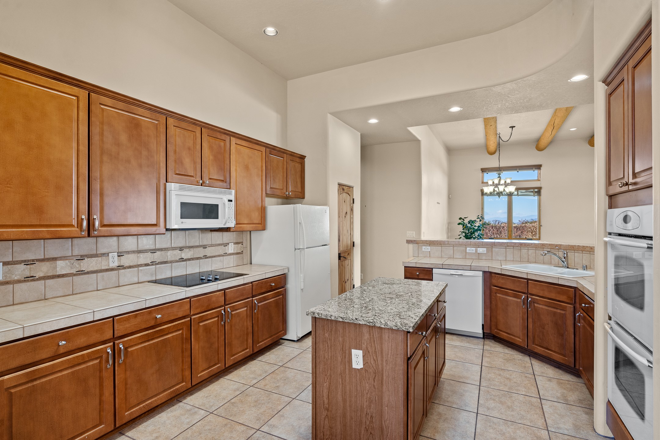Mountain views from every room. On a quiet cul-de-sac street with open space in front and back of home with spectacular sunsets and views from the back yard. This recently updated Pueblo-style home in Rancho Viejo with new roof, new stucco, fresh interior paint, fully remodeled primary bath, added covered portal and granite island in kitchen is on a premium lot backing to vast greenbelt. The popular Mesa Verde open floor plan has four bedrooms and three full baths plus lots of usable space and storage room. The versatile 4th bedroom with private bath can serve as office, guest room, library or den. Large walled backyard for landscaping and pets with fruit trees. Behind the home is part of the 15 miles of paved walking/biking trails in the neighborhood. Near everything in Santa Fe but just far enough out for a quiet, peaceful life.