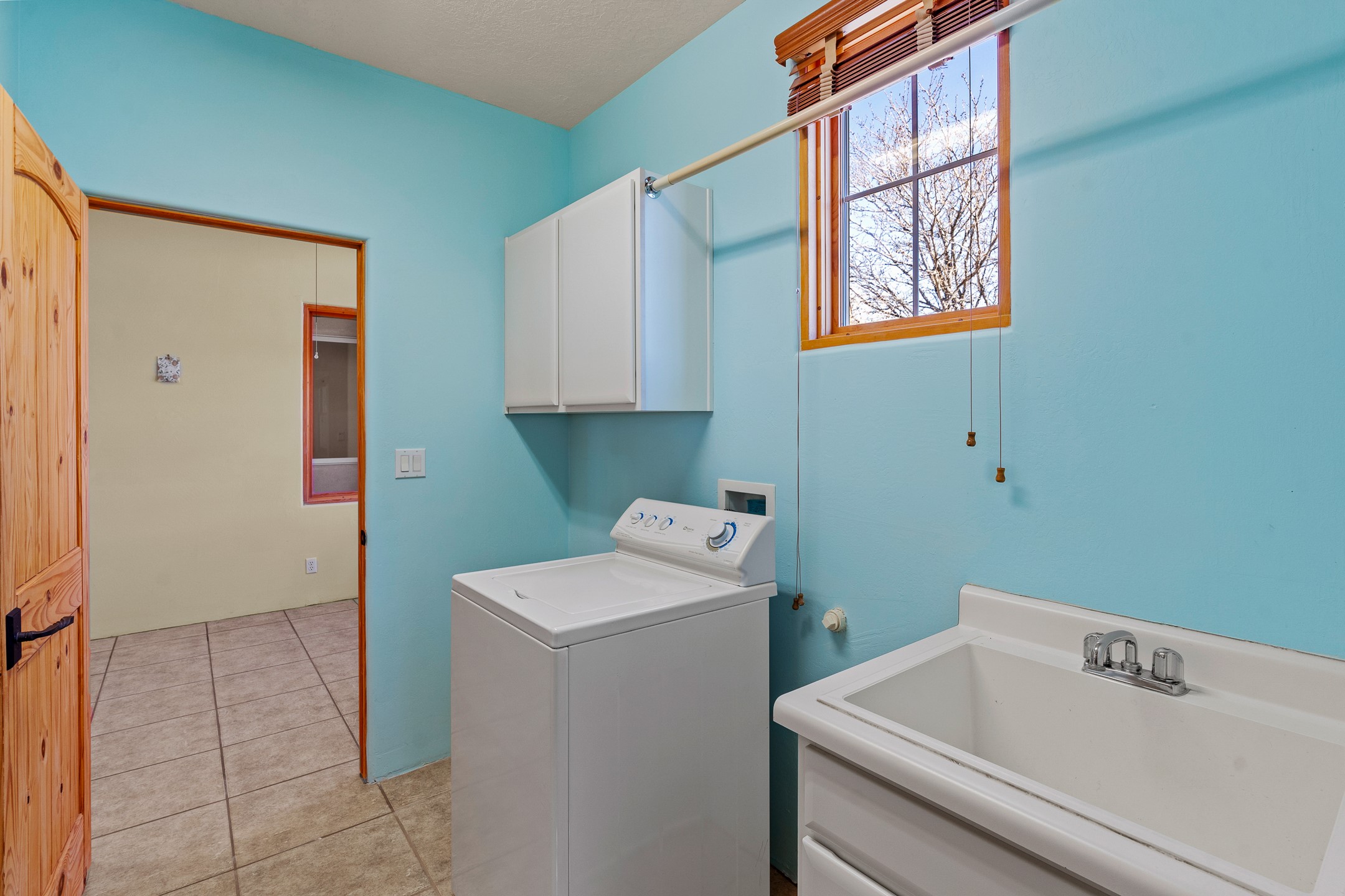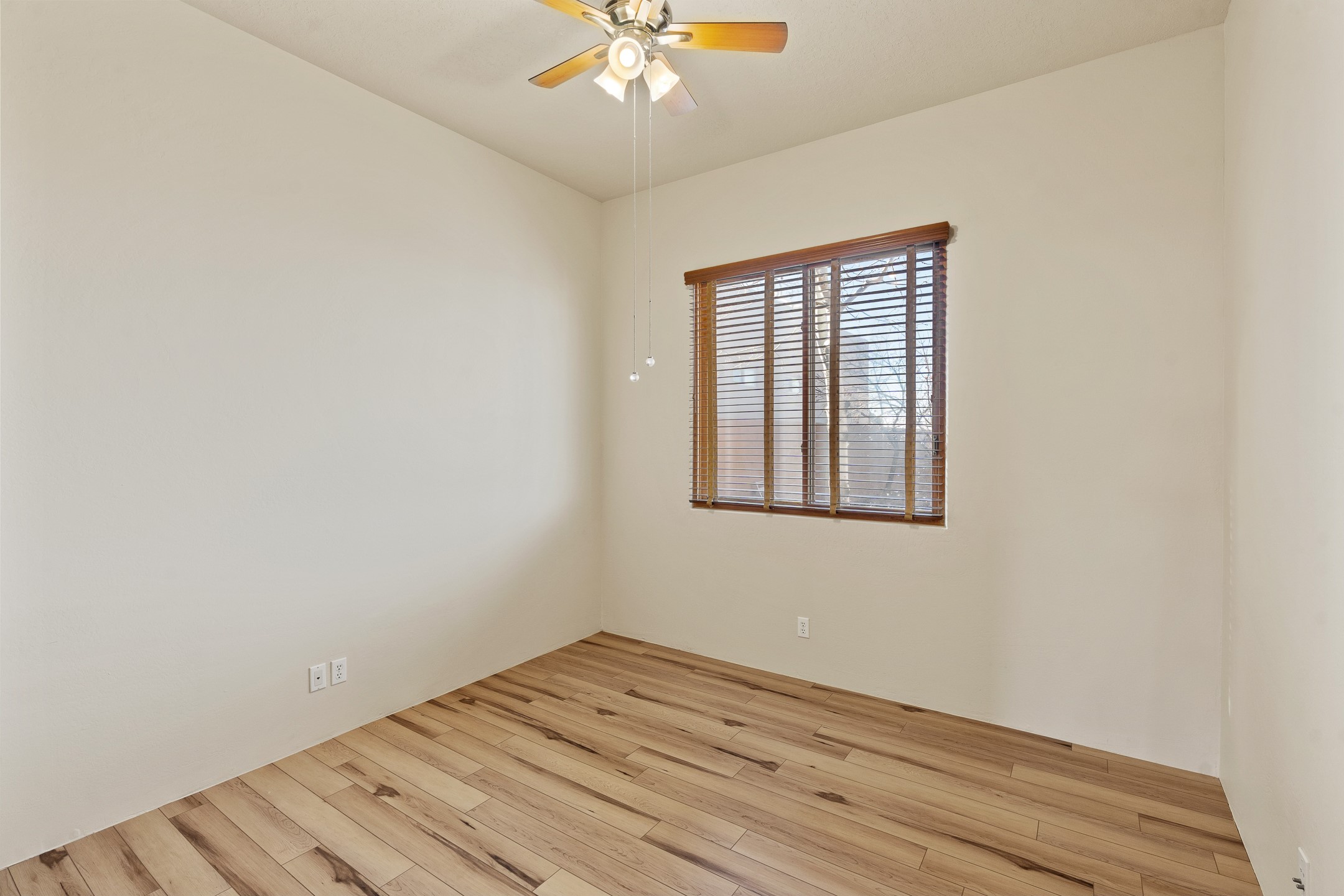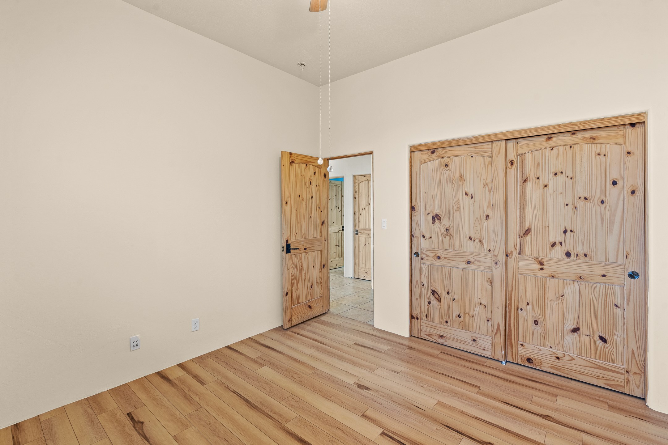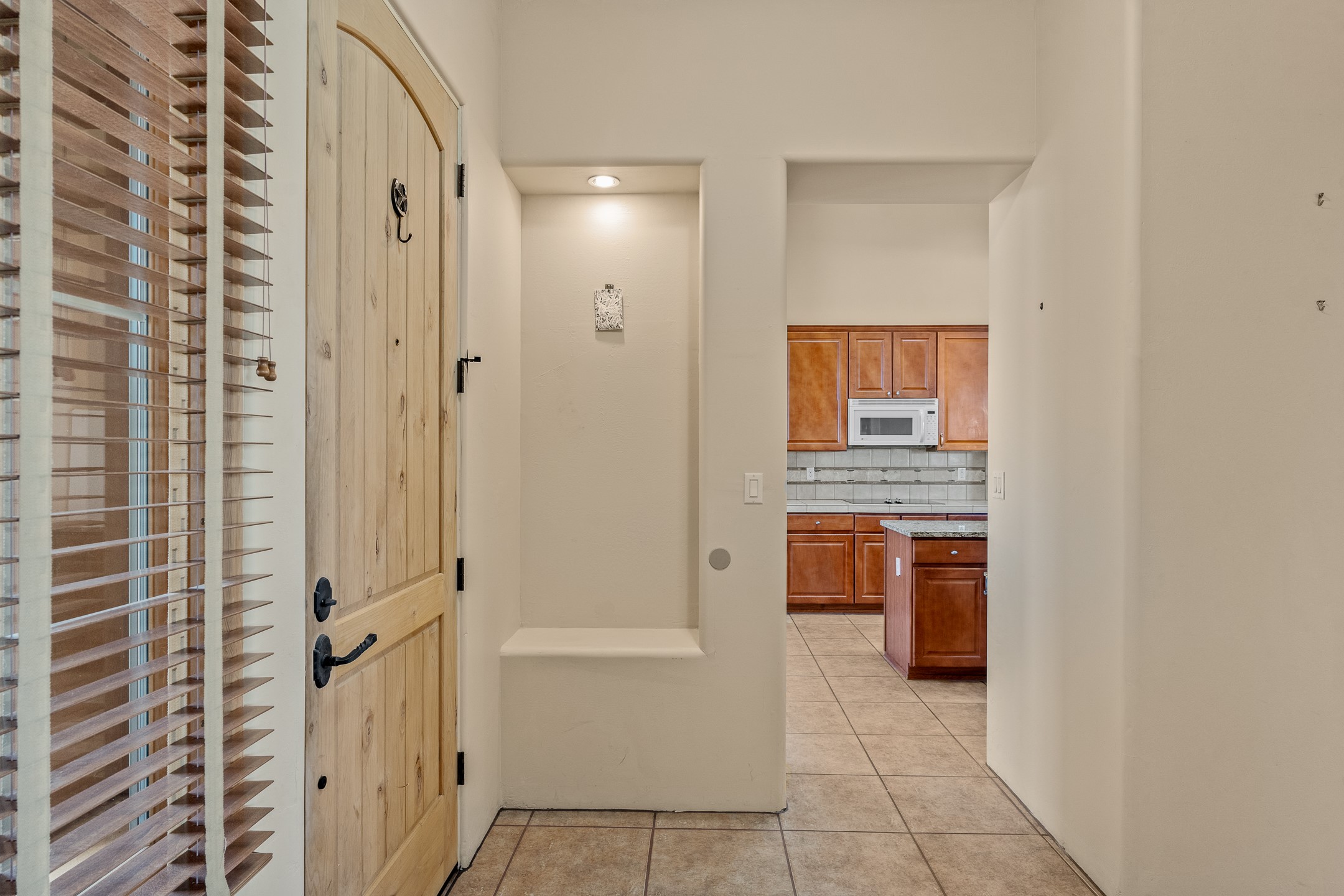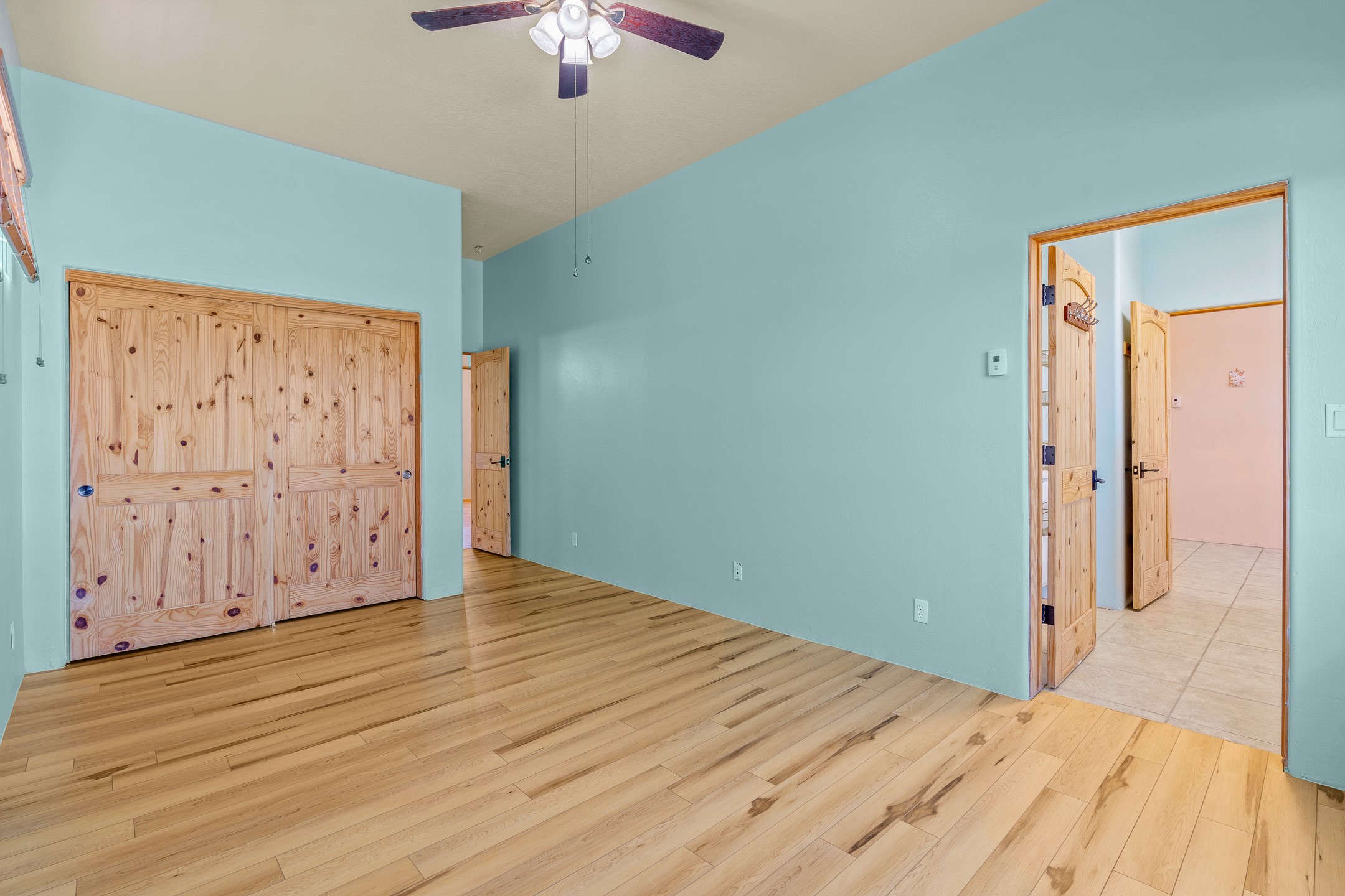 Mountain views from every room. On a quiet cul-de-sac street with open space in front and back of home with spectacular sunsets and views from the back yard. This recently updated Pueblo-style home in Rancho Viejo with new roof, new stucco, fresh interior paint, fully remodeled primary bath, added covered portal and granite island in kitchen is on a premium lot backing to vast greenbelt. The popular Mesa Verde open floor plan has four bedrooms and three full baths plus lots of usable space and storage room. The versatile 4th bedroom with private bath can serve as office, guest room, library or den. Large walled backyard for landscaping and pets with fruit trees. Behind the home is part of the 15 miles of paved walking/biking trails in the neighborhood. Near everything in Santa Fe but just far enough out for a quiet, peaceful life.
