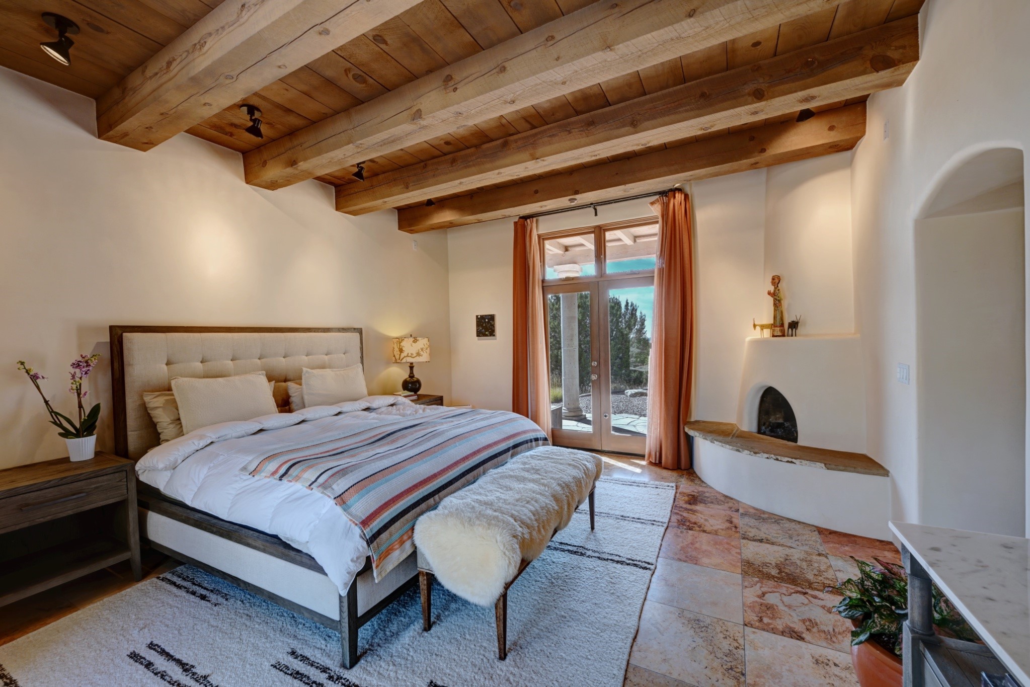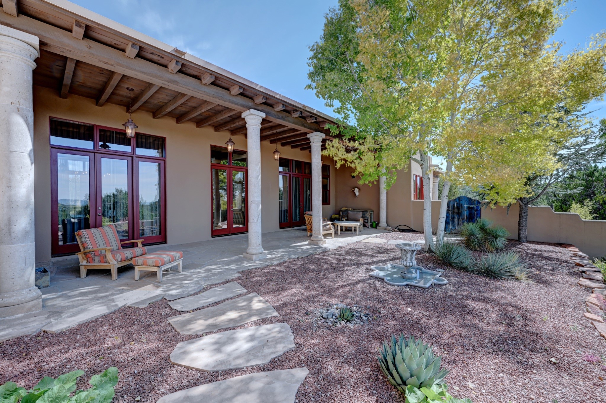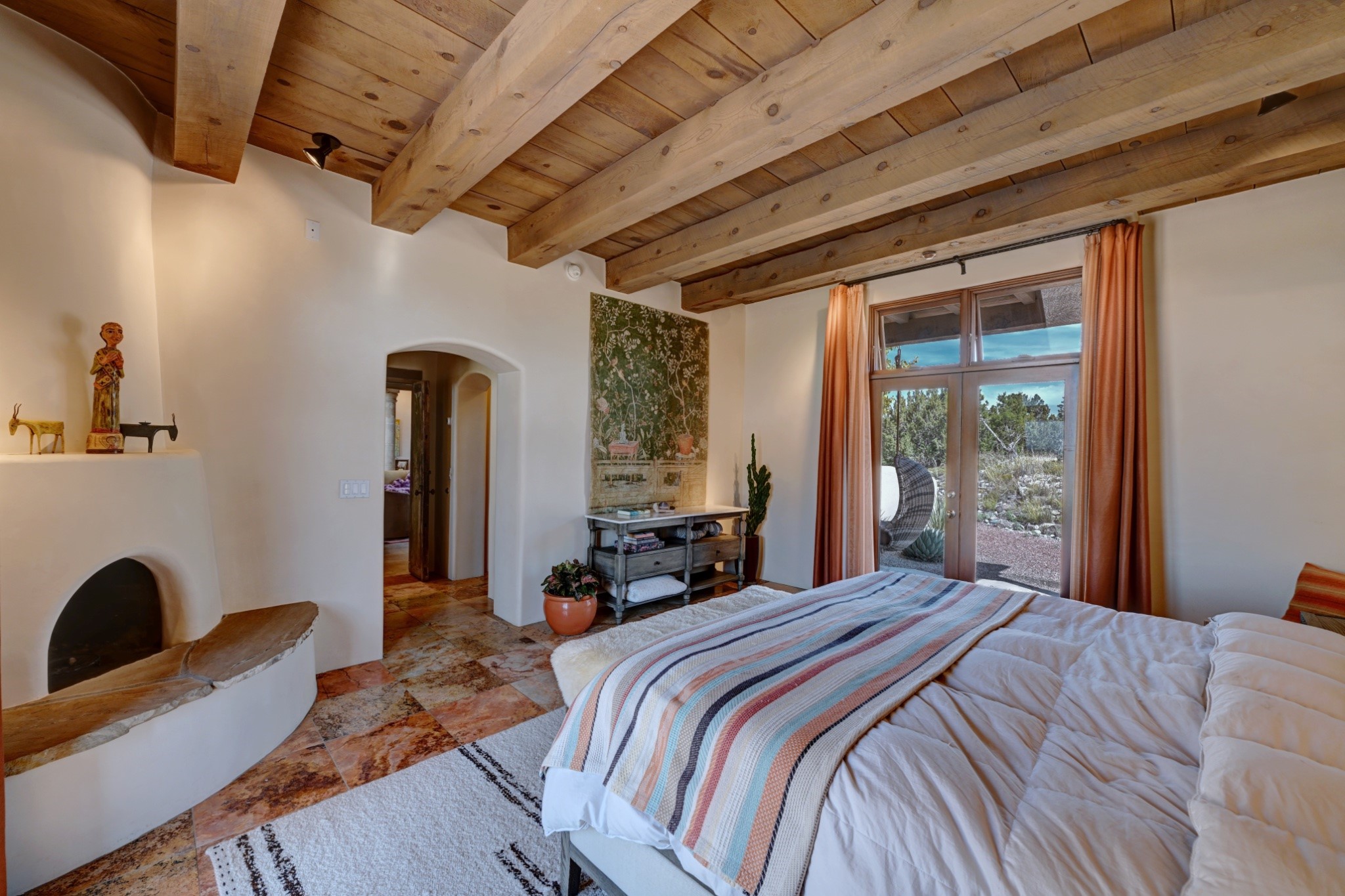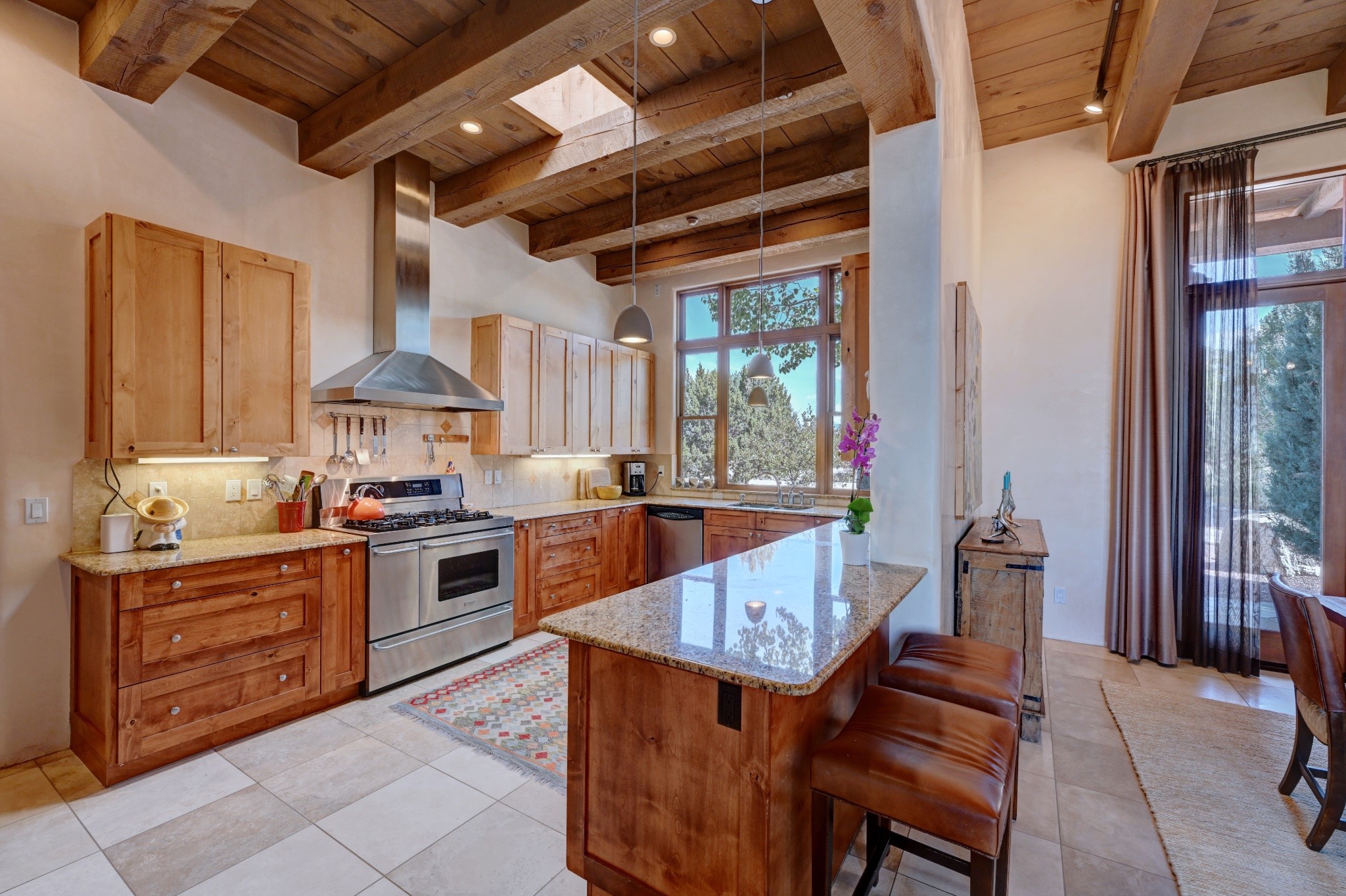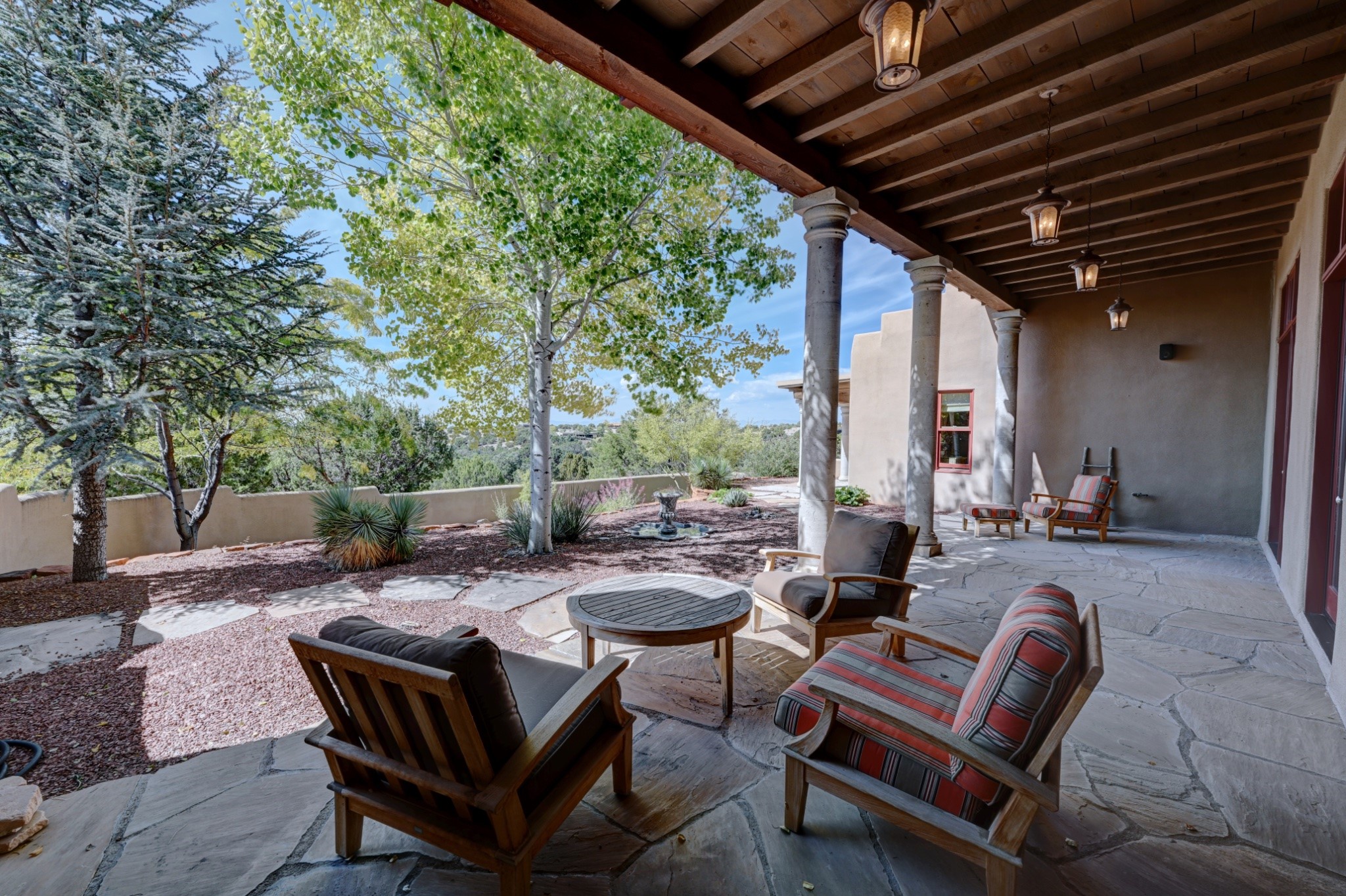 Discover refined living in this exquisite single-level residence located in Sundance Estates, where sophisticated design meets timeless Santa Fe charm. This 3 bedroom, 3 bathroom home's 2,627 square feet unfold with meticulous attention to detail, featuring elegant travertine floors and Diamond plaster walls that flow seamlessly throughout the space. The heart of the home showcases a luminous living room anchored by a stunning stone fireplace, beamed ceiling, abundant light and complemented by contemporary lighting fixtures and custom drapery that create an ambiance of understated luxury. This gracious space extends naturally into the dining area, distinguished by an artistic iron chandelier, while both rooms open onto a welcoming flagstone portal overlooking expansive views and the meticulously landscaped backyard with stone fountain. The primary bedroom suite serves as a private sanctuary, featuring an authentic Mexican wooden door entrance, a wood-burning kiva fireplace, and a private portal. The spa-inspired ensuite bathroom boasts a generous soaking tub and sophisticated marble and stone dual vanities, complemented by a generous walk-in closet. Culinary enthusiasts will appreciate the gourmet kitchen, equipped with stainless steel appliances, and custom wood cabinetry offering abundant storage. Granite countertops provide both beauty and functionality. Two thoughtfully positioned guest bedrooms, featuring character-rich square beamed ceilings and custom window treatments, offer built-in bookshelves and privacy from the primary suite. Both guest rooms enjoy their own portal access, perfect for morning coffee or evening relaxation. A two-car garage provides secure parking, while a rooftop deck offers breathtaking panoramic views. Located near the Calabasas Trail Head and only 14 minutes from the historic plaza, this home perfectly balances luxury living with the natural beauty of Santa Fe. This home offers an exceptional lifestyle in one of Santa Fe's most sought-after communities. Schedule a tour today to experience this remarkable property and please see the Matterport 3-D tour in the listing!