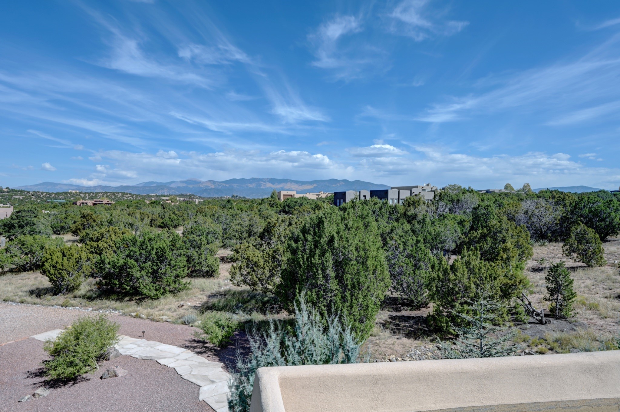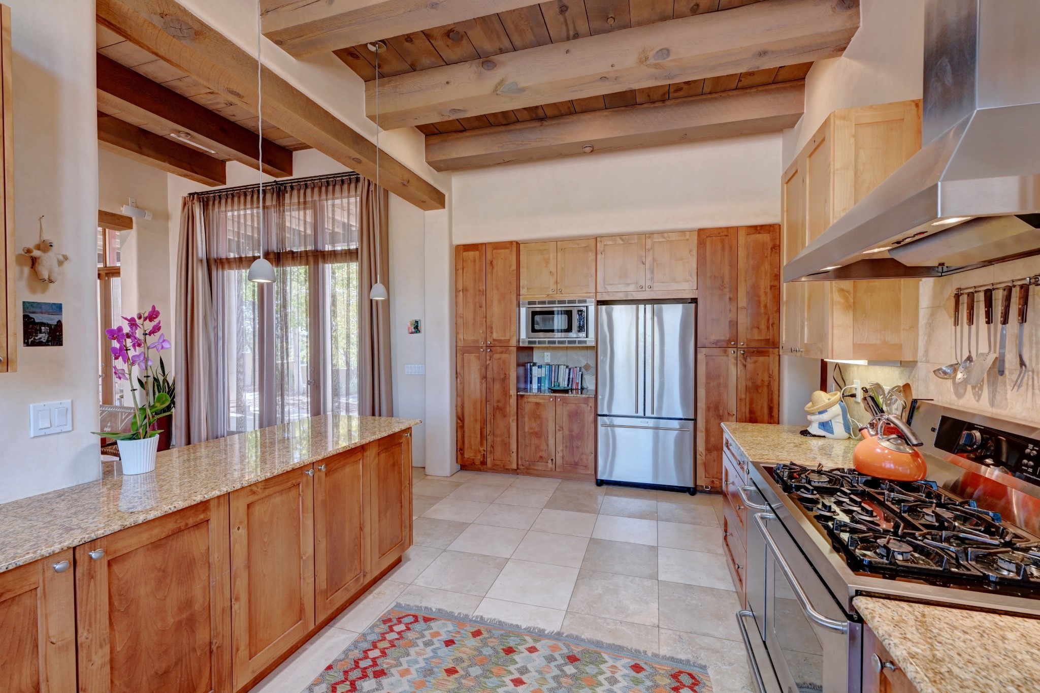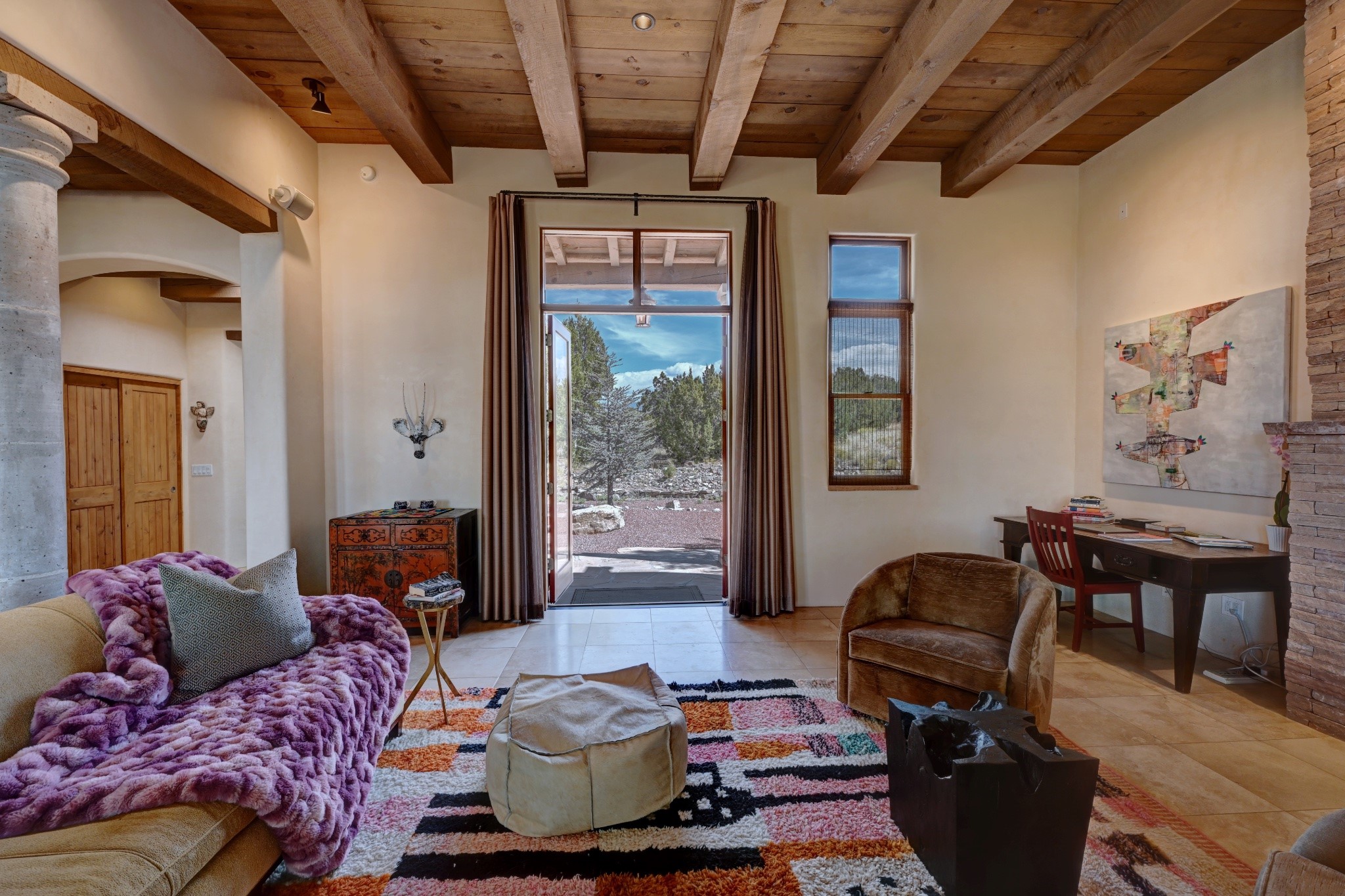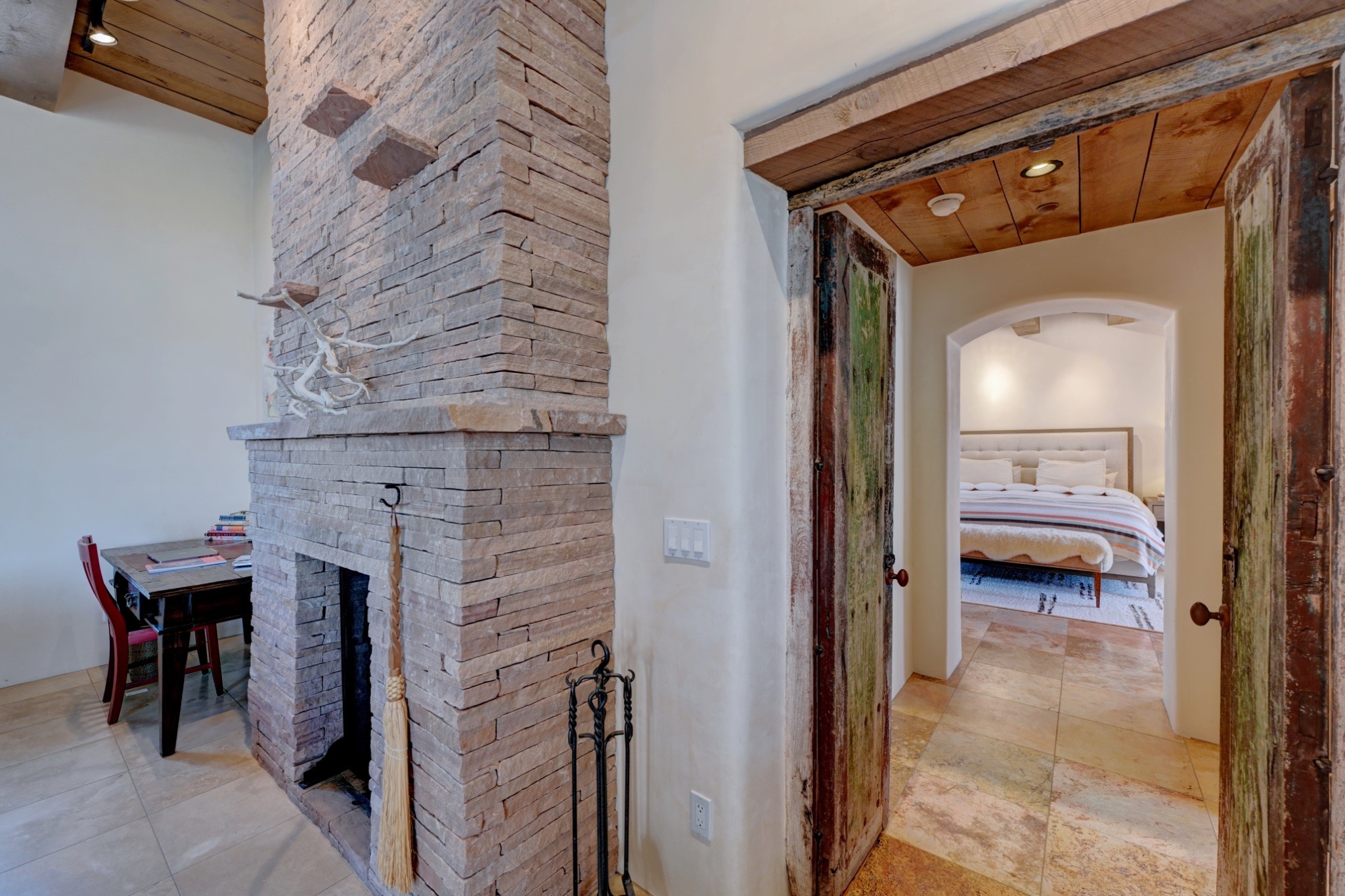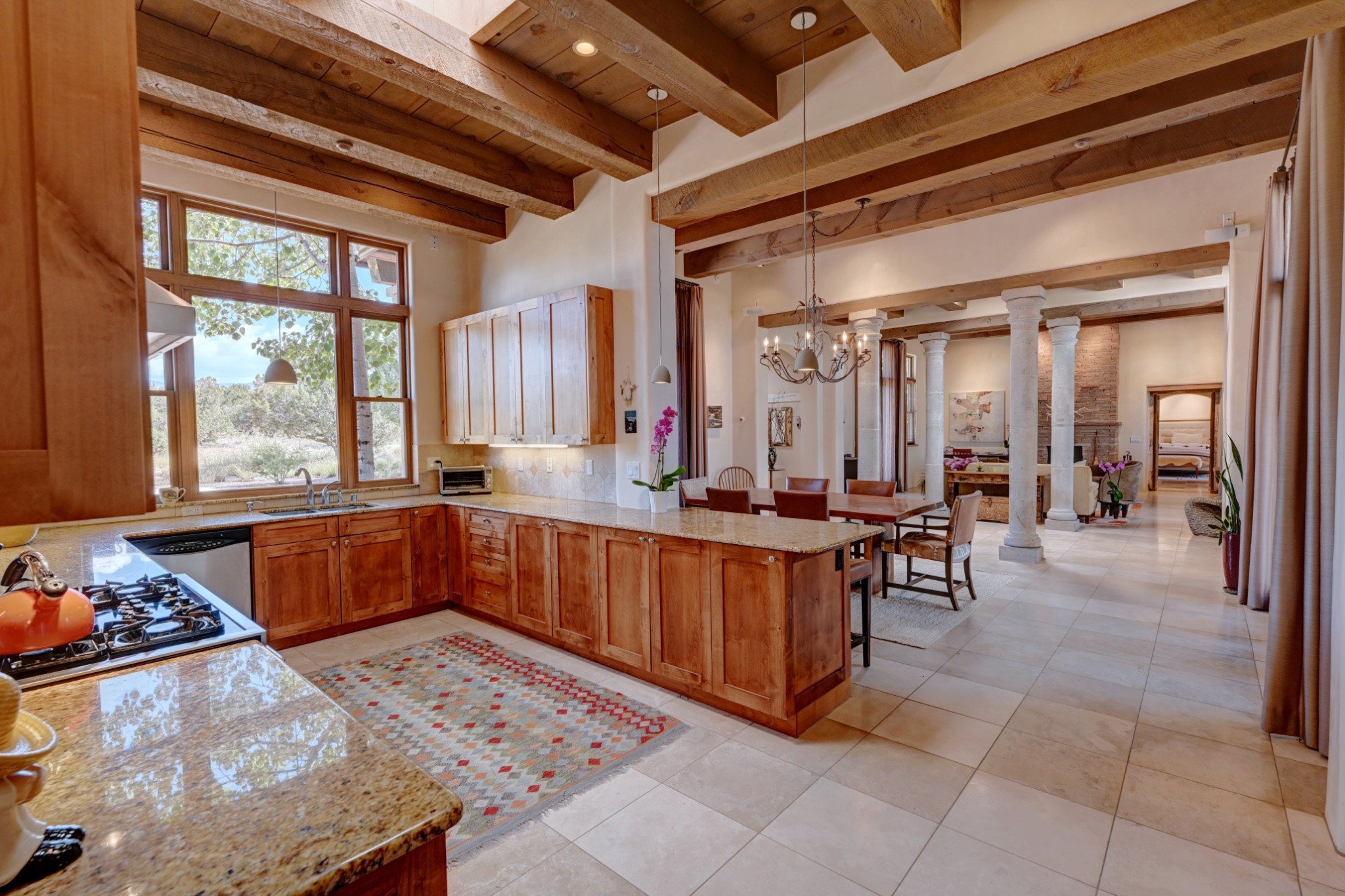 Discover refined living in this exquisite single-level residence located in Sundance Estates, where sophisticated design meets timeless Santa Fe charm. This 3 bedroom, 3 bathroom home's 2,627 square feet unfold with meticulous attention to detail, featuring elegant travertine floors and Diamond plaster walls that flow seamlessly throughout the space. The heart of the home showcases a luminous living room anchored by a stunning stone fireplace, beamed ceiling, abundant light and complemented by contemporary lighting fixtures and custom drapery that create an ambiance of understated luxury. This gracious space extends naturally into the dining area, distinguished by an artistic iron chandelier, while both rooms open onto a welcoming flagstone portal overlooking expansive views and the meticulously landscaped backyard with stone fountain. The primary bedroom suite serves as a private sanctuary, featuring an authentic Mexican wooden door entrance, a wood-burning kiva fireplace, and a private portal. The spa-inspired ensuite bathroom boasts a generous soaking tub and sophisticated marble and stone dual vanities, complemented by a generous walk-in closet. Culinary enthusiasts will appreciate the gourmet kitchen, equipped with stainless steel appliances, and custom wood cabinetry offering abundant storage. Granite countertops provide both beauty and functionality. Two thoughtfully positioned guest bedrooms, featuring character-rich square beamed ceilings and custom window treatments, offer built-in bookshelves and privacy from the primary suite. Both guest rooms enjoy their own portal access, perfect for morning coffee or evening relaxation. A two-car garage provides secure parking, while a rooftop deck offers breathtaking panoramic views. Located near the Calabasas Trail Head and only 14 minutes from the historic plaza, this home perfectly balances luxury living with the natural beauty of Santa Fe. This home offers an exceptional lifestyle in one of Santa Fe's most sought-after communities. Schedule a tour today to experience this remarkable property and please see the Matterport 3-D tour in the listing!