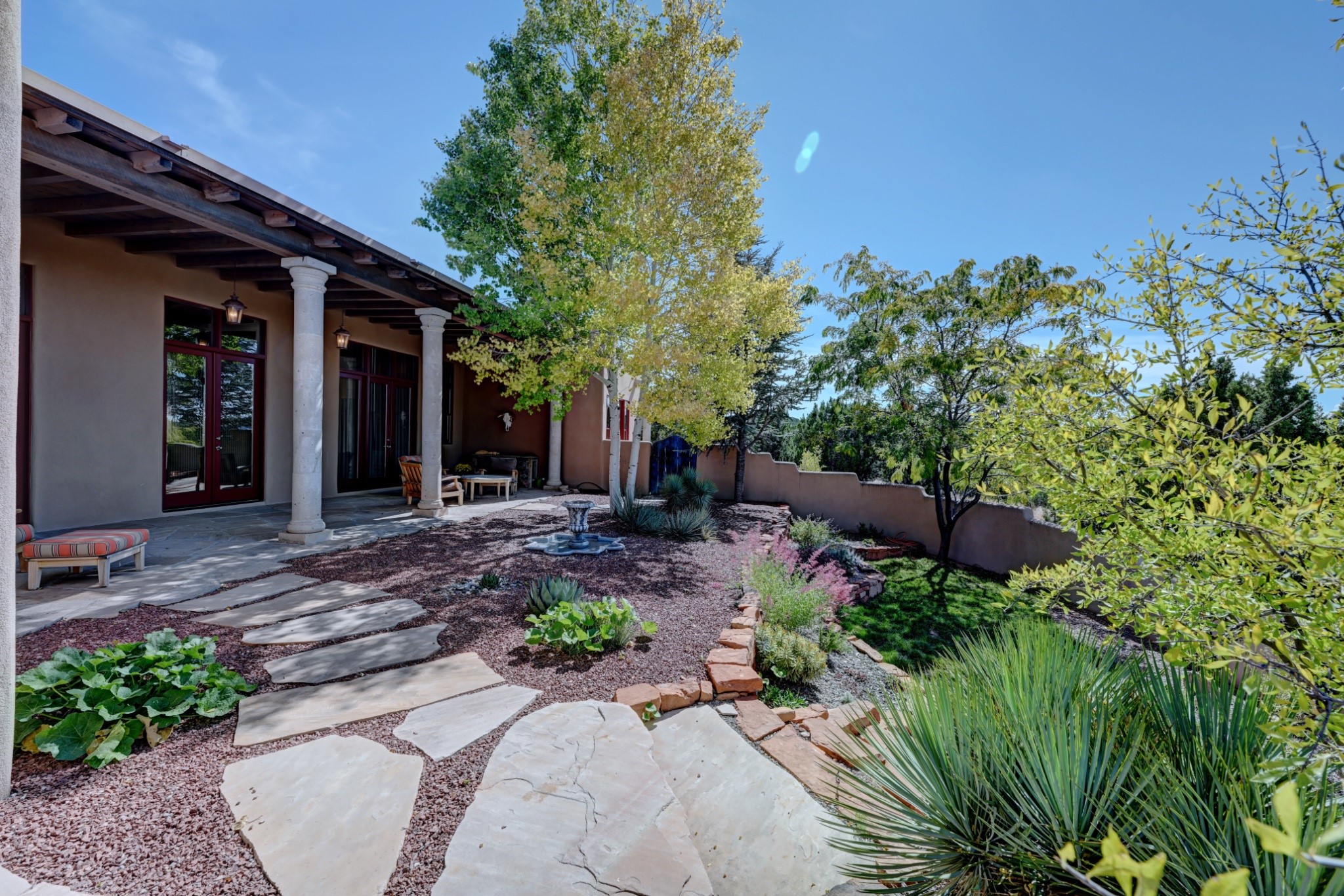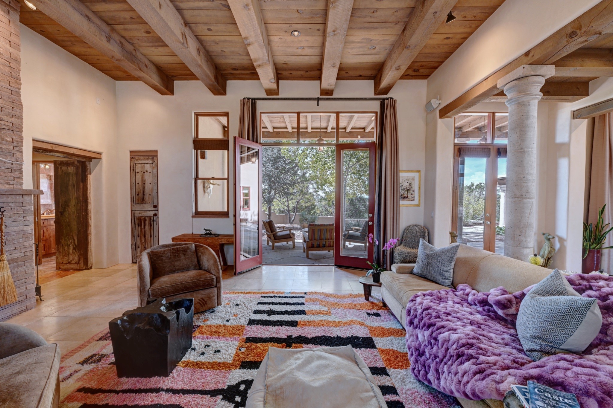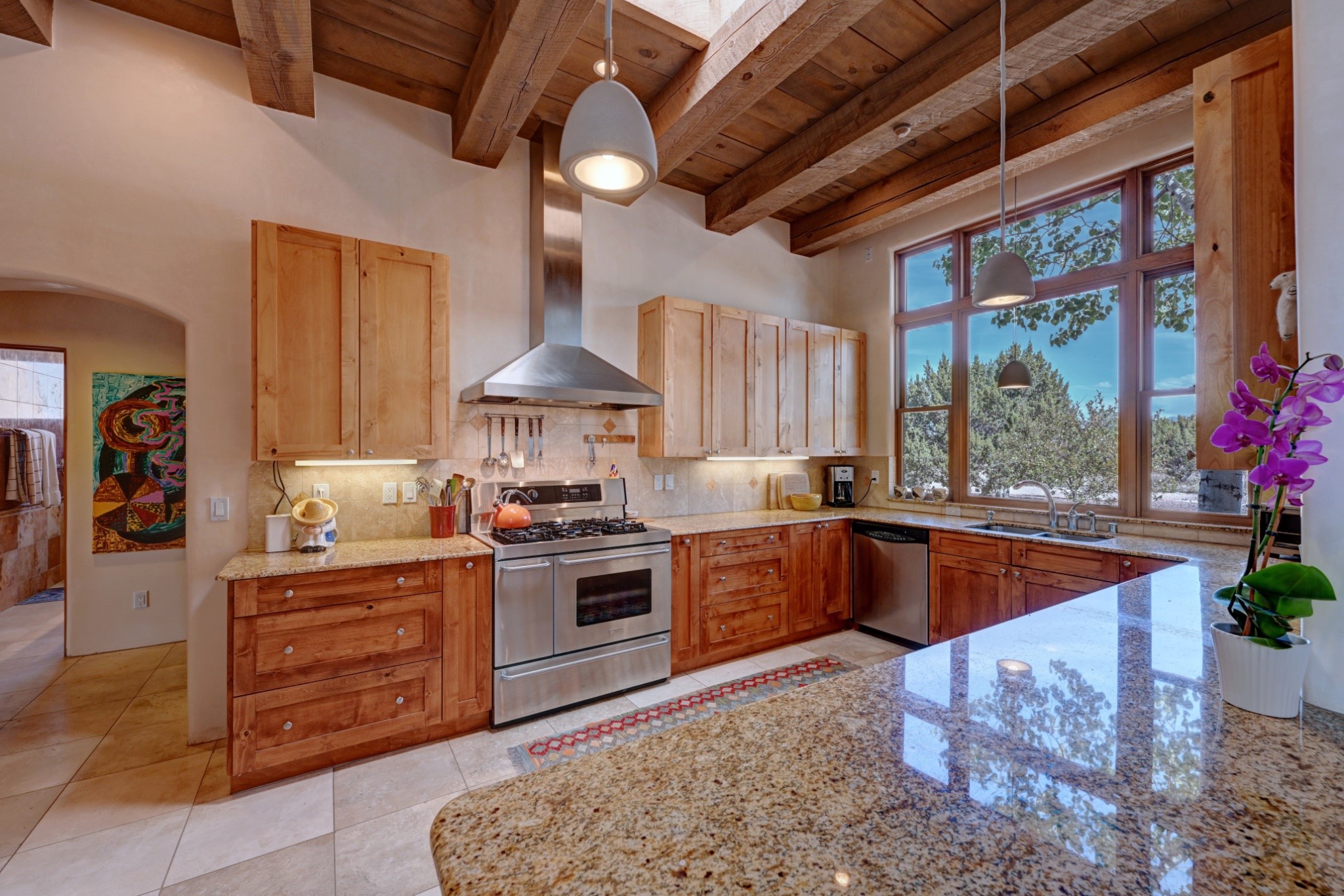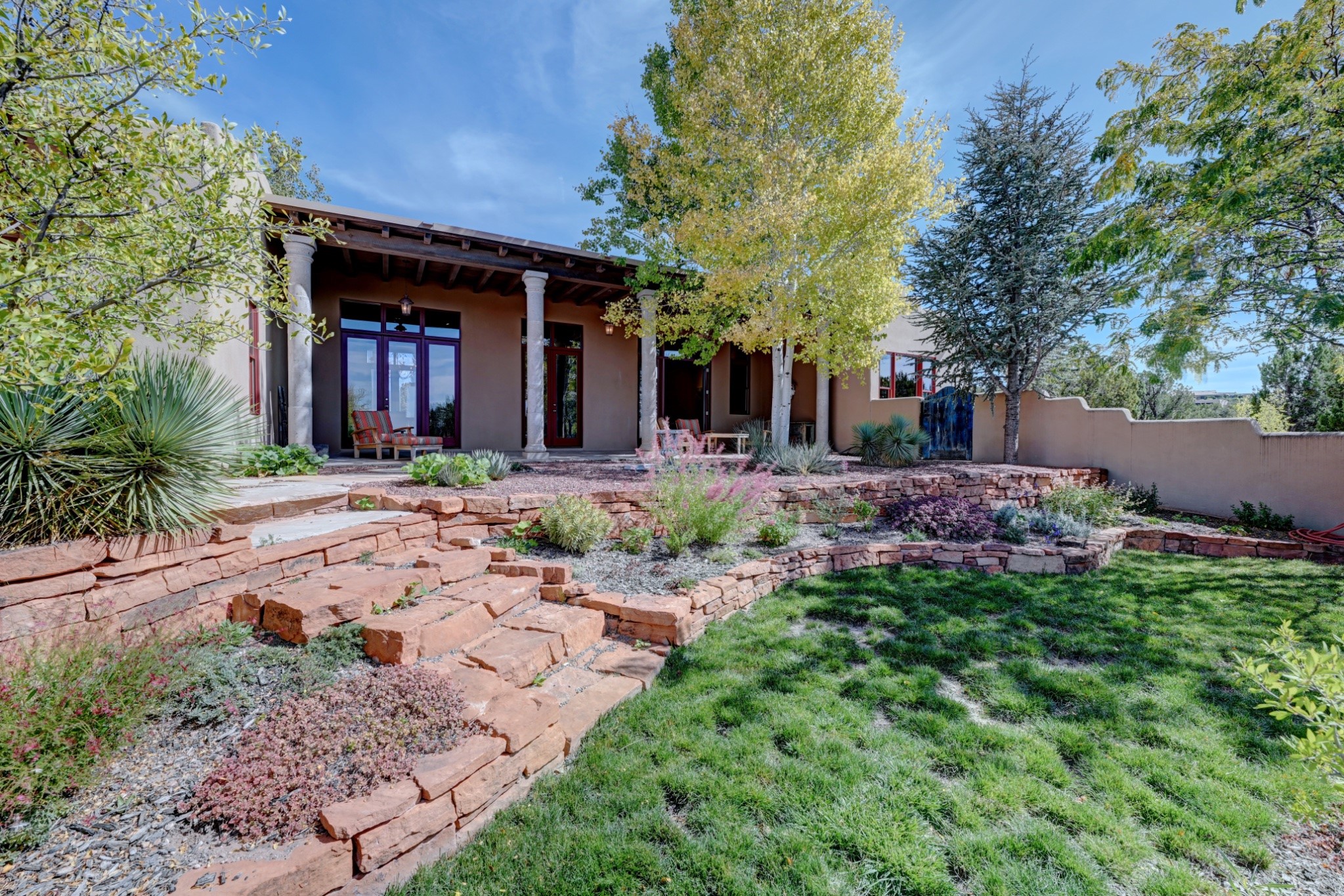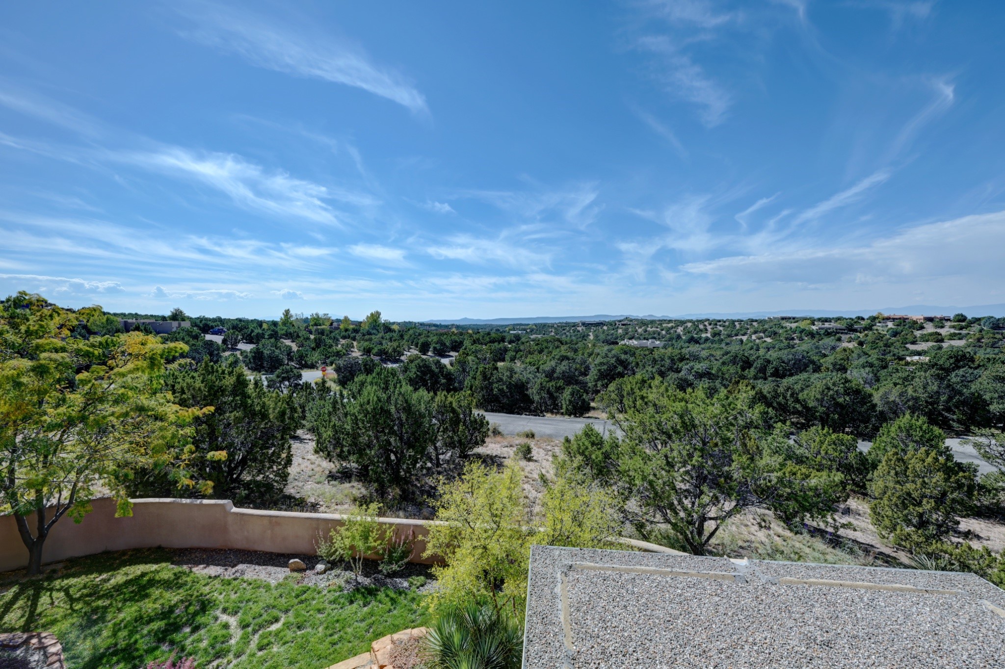 Discover refined living in this exquisite single-level residence located in Sundance Estates, where sophisticated design meets timeless Santa Fe charm. This 3 bedroom, 3 bathroom home's 2,627 square feet unfold with meticulous attention to detail, featuring elegant travertine floors and Diamond plaster walls that flow seamlessly throughout the space. The heart of the home showcases a luminous living room anchored by a stunning stone fireplace, beamed ceiling, abundant light and complemented by contemporary lighting fixtures and custom drapery that create an ambiance of understated luxury. This gracious space extends naturally into the dining area, distinguished by an artistic iron chandelier, while both rooms open onto a welcoming flagstone portal overlooking expansive views and the meticulously landscaped backyard with stone fountain. The primary bedroom suite serves as a private sanctuary, featuring an authentic Mexican wooden door entrance, a wood-burning kiva fireplace, and a private portal. The spa-inspired ensuite bathroom boasts a generous soaking tub and sophisticated marble and stone dual vanities, complemented by a generous walk-in closet. Culinary enthusiasts will appreciate the gourmet kitchen, equipped with stainless steel appliances, and custom wood cabinetry offering abundant storage. Granite countertops provide both beauty and functionality. Two thoughtfully positioned guest bedrooms, featuring character-rich square beamed ceilings and custom window treatments, offer built-in bookshelves and privacy from the primary suite. Both guest rooms enjoy their own portal access, perfect for morning coffee or evening relaxation. A two-car garage provides secure parking, while a rooftop deck offers breathtaking panoramic views. Located near the Calabasas Trail Head and only 14 minutes from the historic plaza, this home perfectly balances luxury living with the natural beauty of Santa Fe. This home offers an exceptional lifestyle in one of Santa Fe's most sought-after communities. Schedule a tour today to experience this remarkable property and please see the Matterport 3-D tour in the listing!