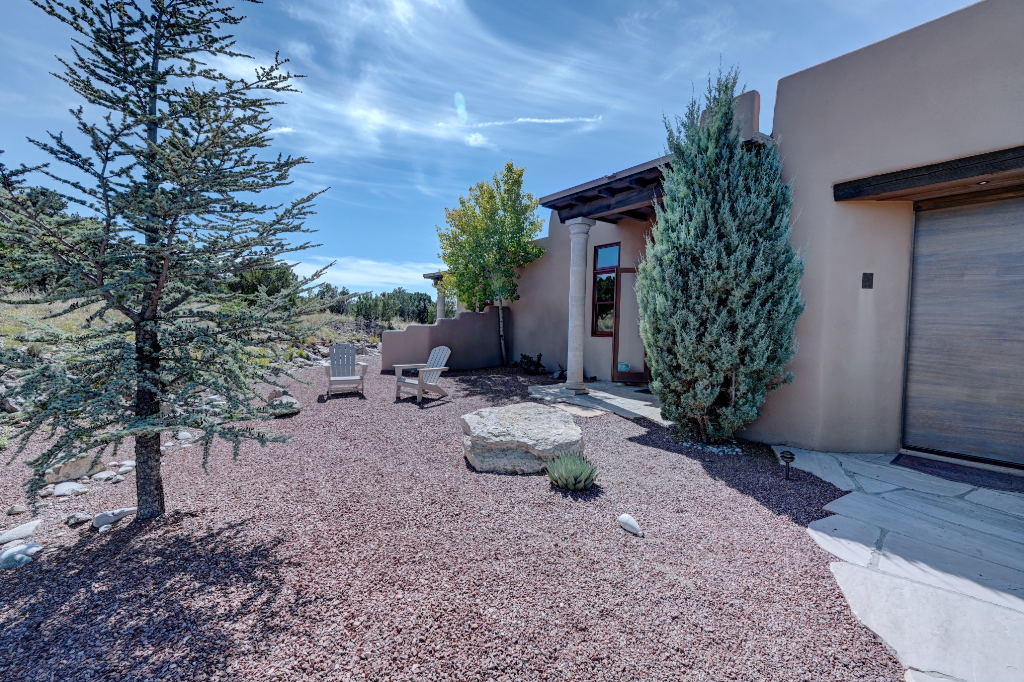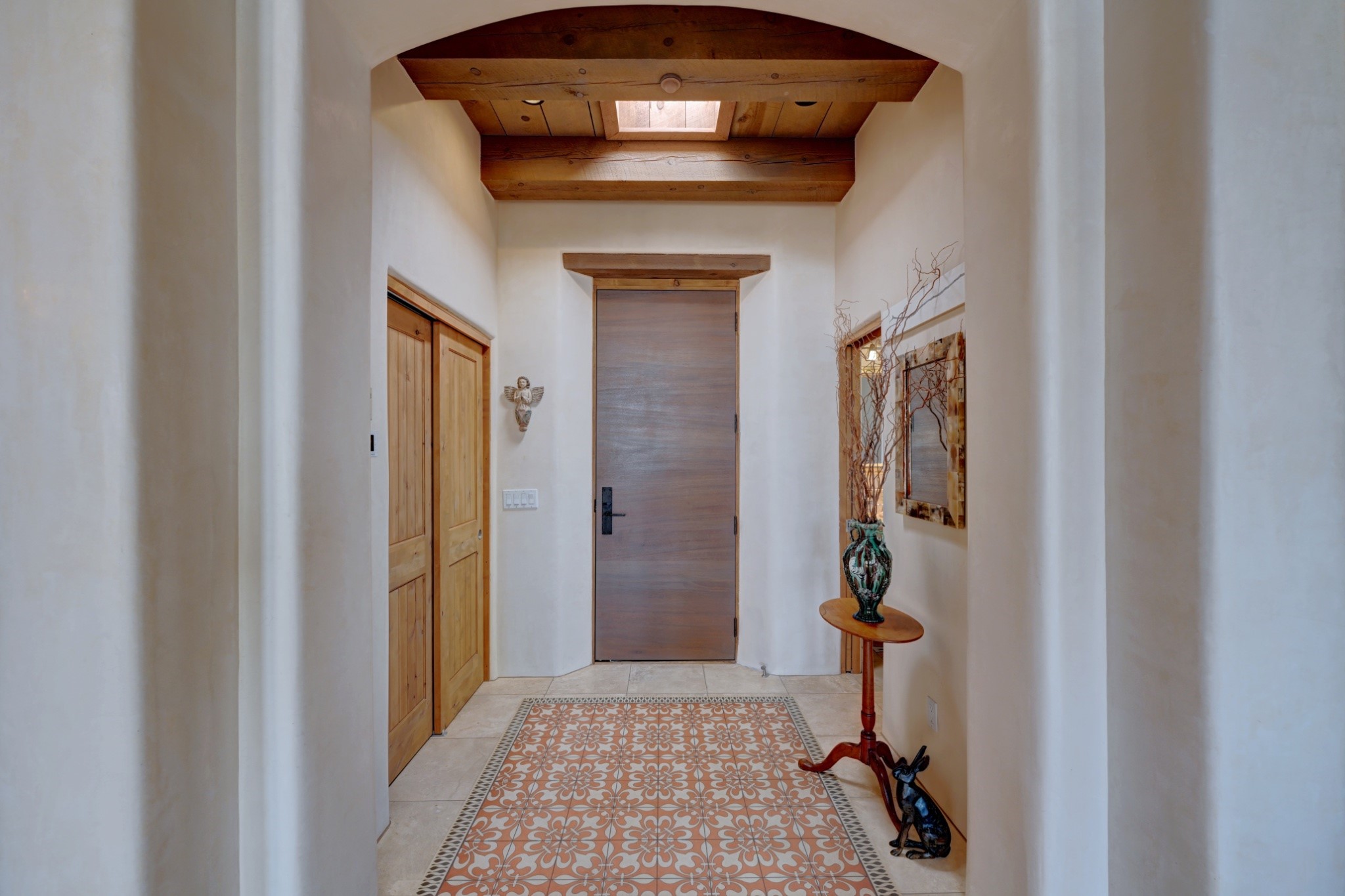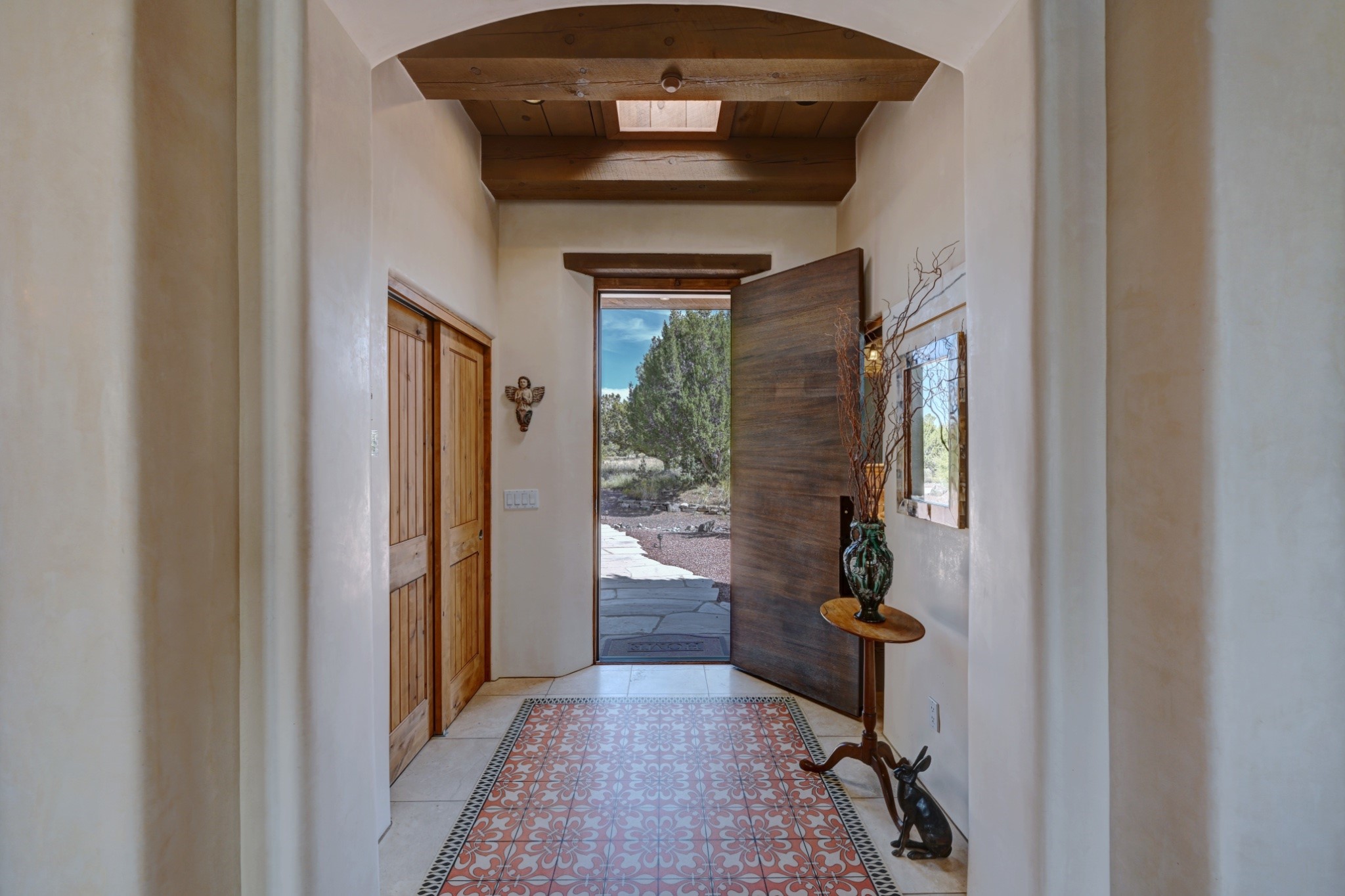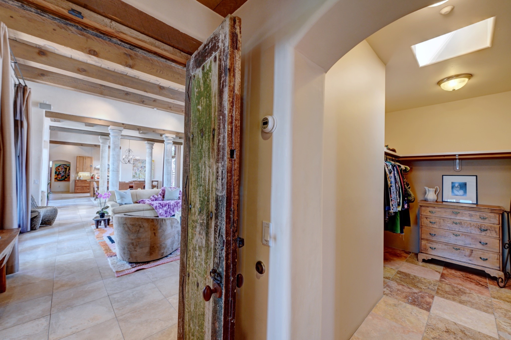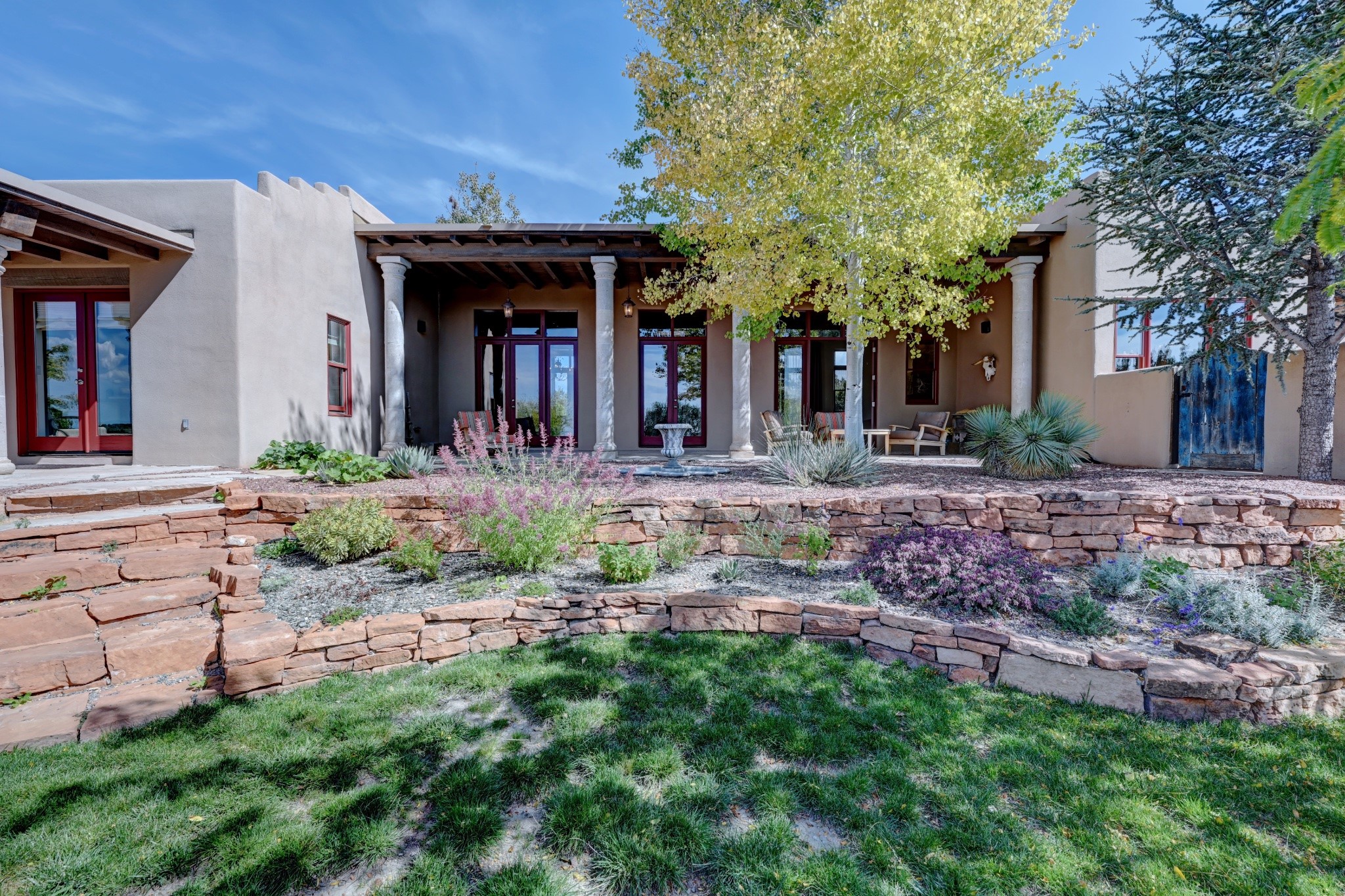 Discover refined living in this exquisite single-level residence located in Sundance Estates, where sophisticated design meets timeless Santa Fe charm. This 3 bedroom, 3 bathroom home's 2,627 square feet unfold with meticulous attention to detail, featuring elegant travertine floors and Diamond plaster walls that flow seamlessly throughout the space. The heart of the home showcases a luminous living room anchored by a stunning stone fireplace, beamed ceiling, abundant light and complemented by contemporary lighting fixtures and custom drapery that create an ambiance of understated luxury. This gracious space extends naturally into the dining area, distinguished by an artistic iron chandelier, while both rooms open onto a welcoming flagstone portal overlooking expansive views and the meticulously landscaped backyard with stone fountain. The primary bedroom suite serves as a private sanctuary, featuring an authentic Mexican wooden door entrance, a wood-burning kiva fireplace, and a private portal. The spa-inspired ensuite bathroom boasts a generous soaking tub and sophisticated marble and stone dual vanities, complemented by a generous walk-in closet. Culinary enthusiasts will appreciate the gourmet kitchen, equipped with stainless steel appliances, and custom wood cabinetry offering abundant storage. Granite countertops provide both beauty and functionality. Two thoughtfully positioned guest bedrooms, featuring character-rich square beamed ceilings and custom window treatments, offer built-in bookshelves and privacy from the primary suite. Both guest rooms enjoy their own portal access, perfect for morning coffee or evening relaxation. A two-car garage provides secure parking, while a rooftop deck offers breathtaking panoramic views. Located near the Calabasas Trail Head and only 14 minutes from the historic plaza, this home perfectly balances luxury living with the natural beauty of Santa Fe. This home offers an exceptional lifestyle in one of Santa Fe's most sought-after communities. Schedule a tour today to experience this remarkable property and please see the Matterport 3-D tour in the listing!