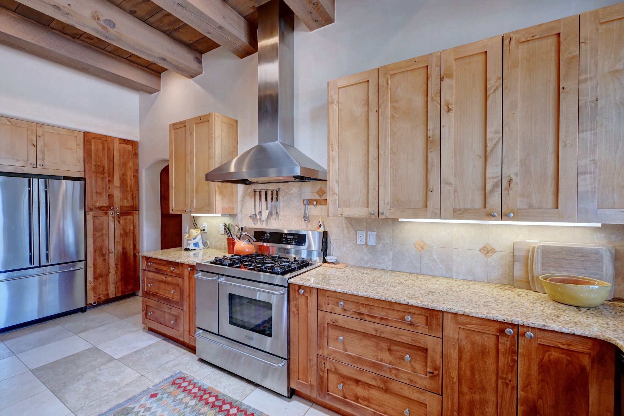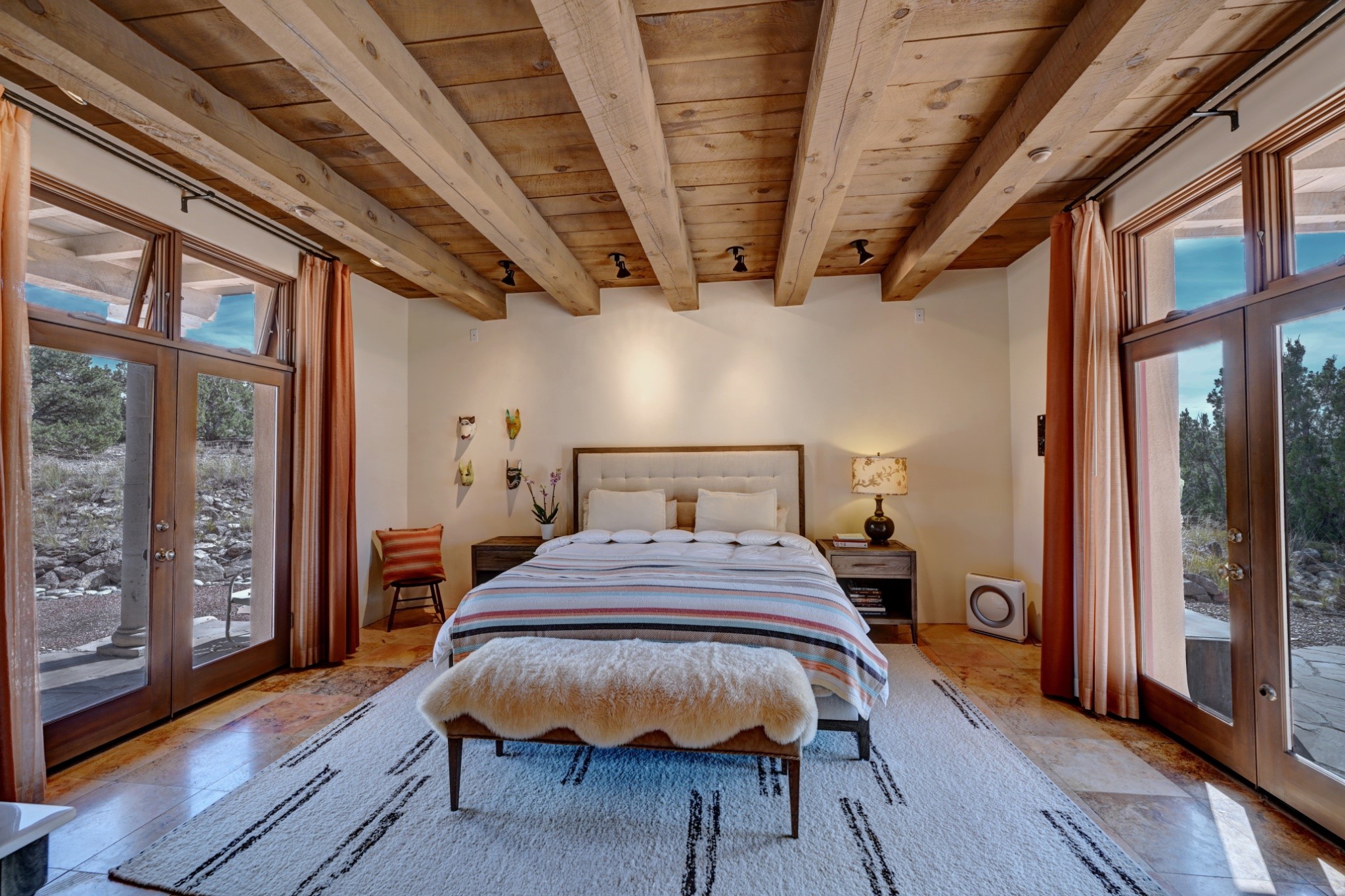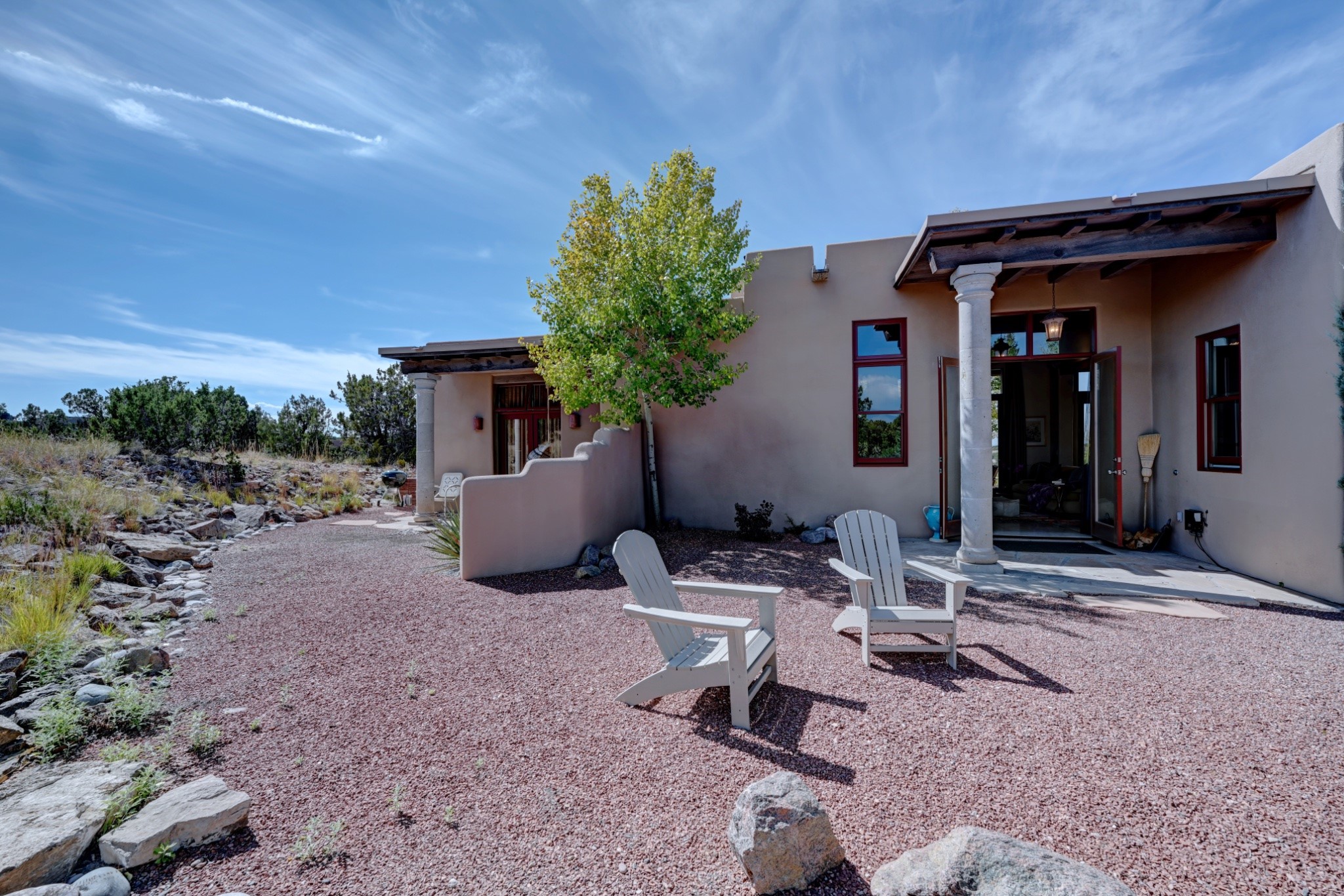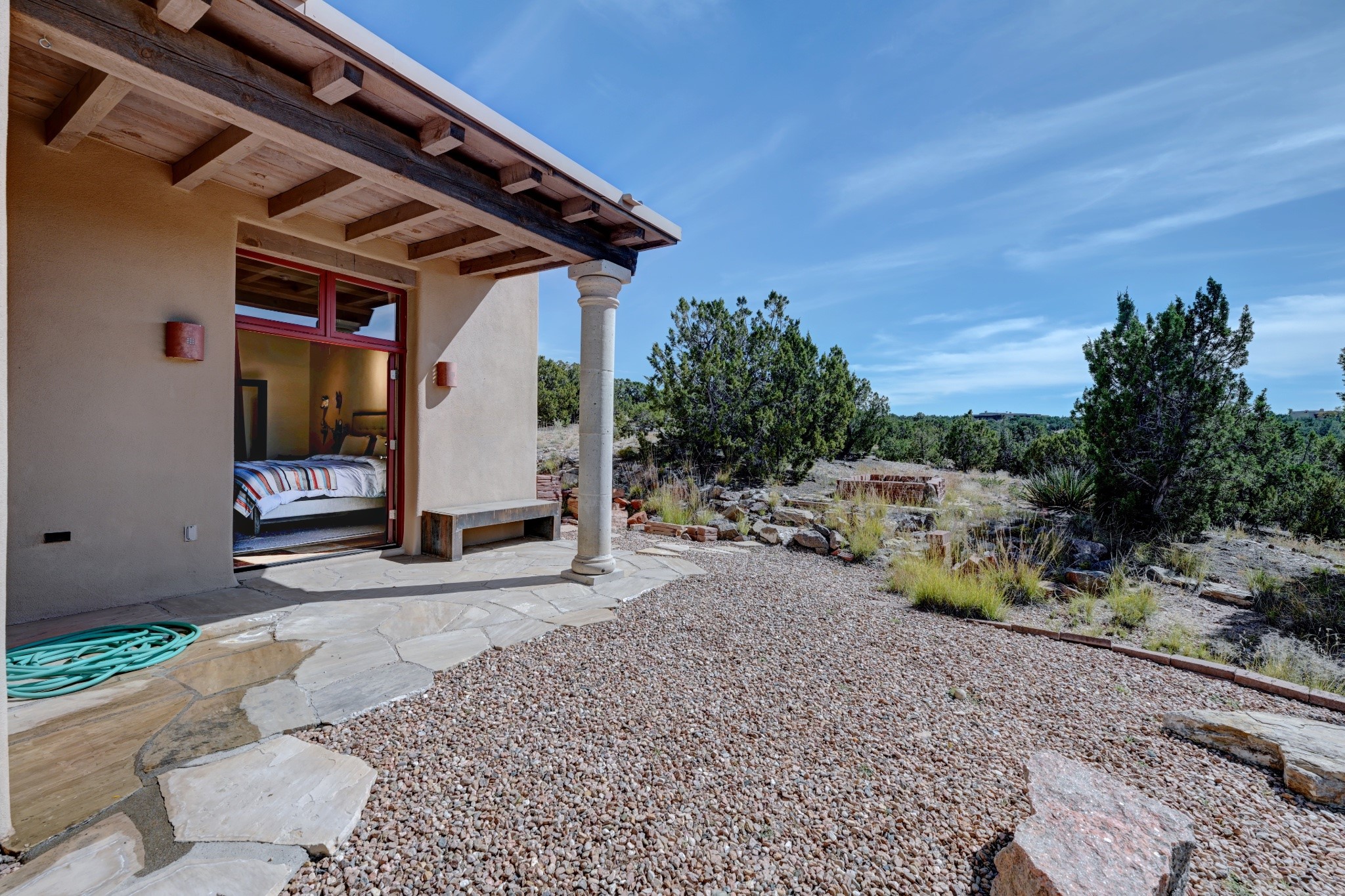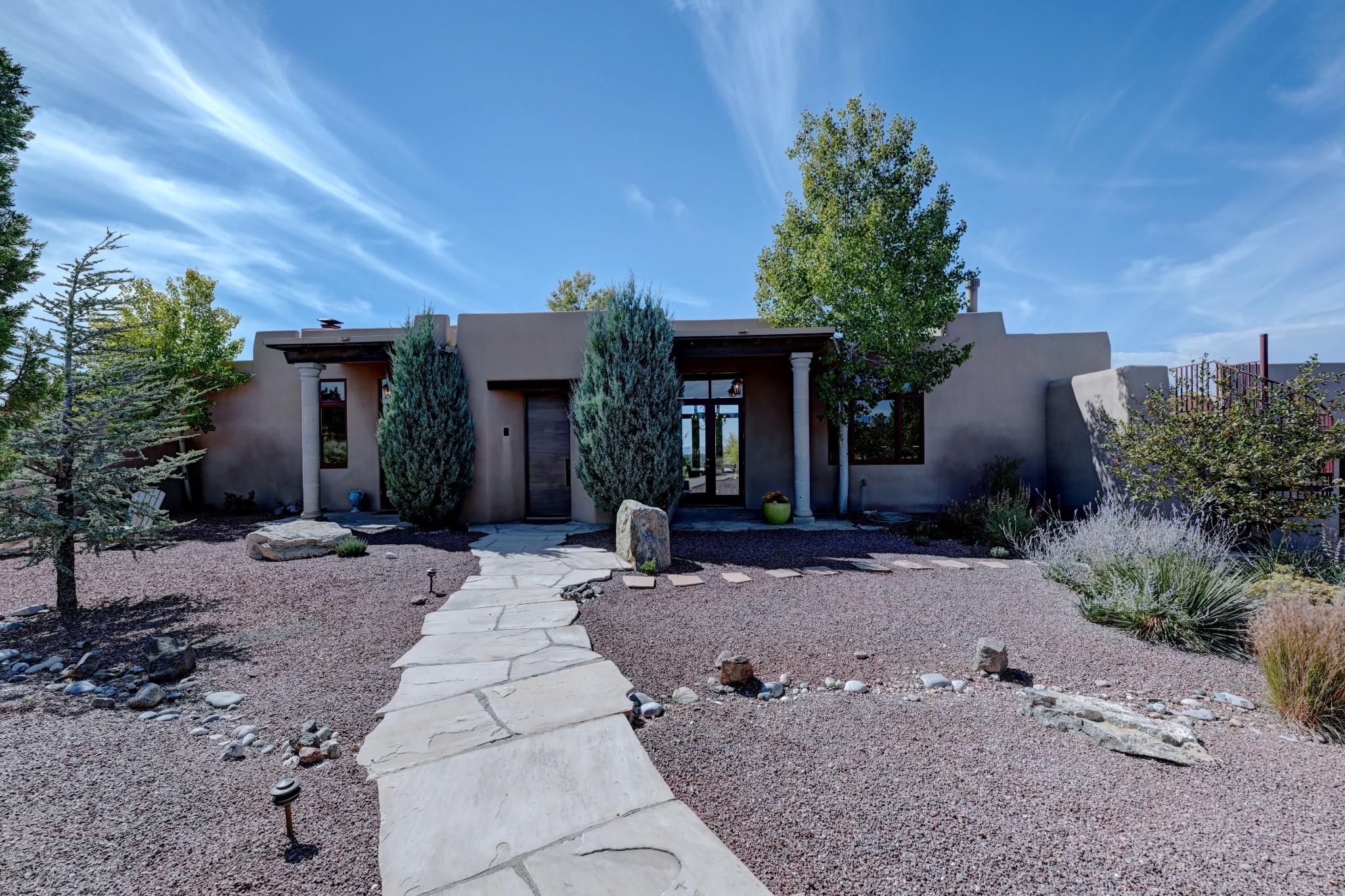 Discover refined living in this exquisite single-level residence located in Sundance Estates, where sophisticated design meets timeless Santa Fe charm. This 3 bedroom, 3 bathroom home's 2,627 square feet unfold with meticulous attention to detail, featuring elegant travertine floors and Diamond plaster walls that flow seamlessly throughout the space. The heart of the home showcases a luminous living room anchored by a stunning stone fireplace, beamed ceiling, abundant light and complemented by contemporary lighting fixtures and custom drapery that create an ambiance of understated luxury. This gracious space extends naturally into the dining area, distinguished by an artistic iron chandelier, while both rooms open onto a welcoming flagstone portal overlooking expansive views and the meticulously landscaped backyard with stone fountain. The primary bedroom suite serves as a private sanctuary, featuring an authentic Mexican wooden door entrance, a wood-burning kiva fireplace, and a private portal. The spa-inspired ensuite bathroom boasts a generous soaking tub and sophisticated marble and stone dual vanities, complemented by a generous walk-in closet. Culinary enthusiasts will appreciate the gourmet kitchen, equipped with stainless steel appliances, and custom wood cabinetry offering abundant storage. Granite countertops provide both beauty and functionality. Two thoughtfully positioned guest bedrooms, featuring character-rich square beamed ceilings and custom window treatments, offer built-in bookshelves and privacy from the primary suite. Both guest rooms enjoy their own portal access, perfect for morning coffee or evening relaxation. A two-car garage provides secure parking, while a rooftop deck offers breathtaking panoramic views. Located near the Calabasas Trail Head and only 14 minutes from the historic plaza, this home perfectly balances luxury living with the natural beauty of Santa Fe. This home offers an exceptional lifestyle in one of Santa Fe's most sought-after communities. Schedule a tour today to experience this remarkable property and please see the Matterport 3-D tour in the listing!