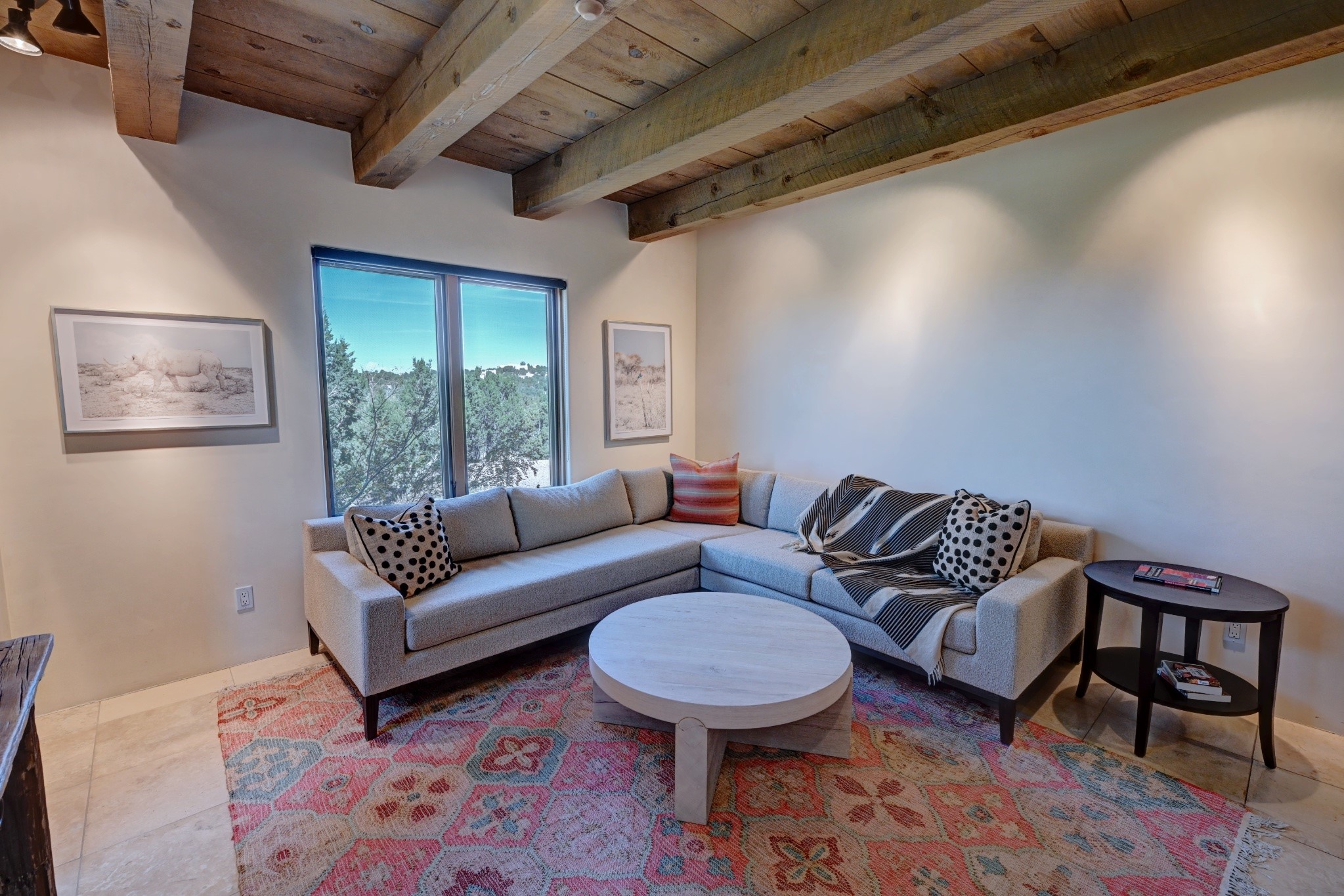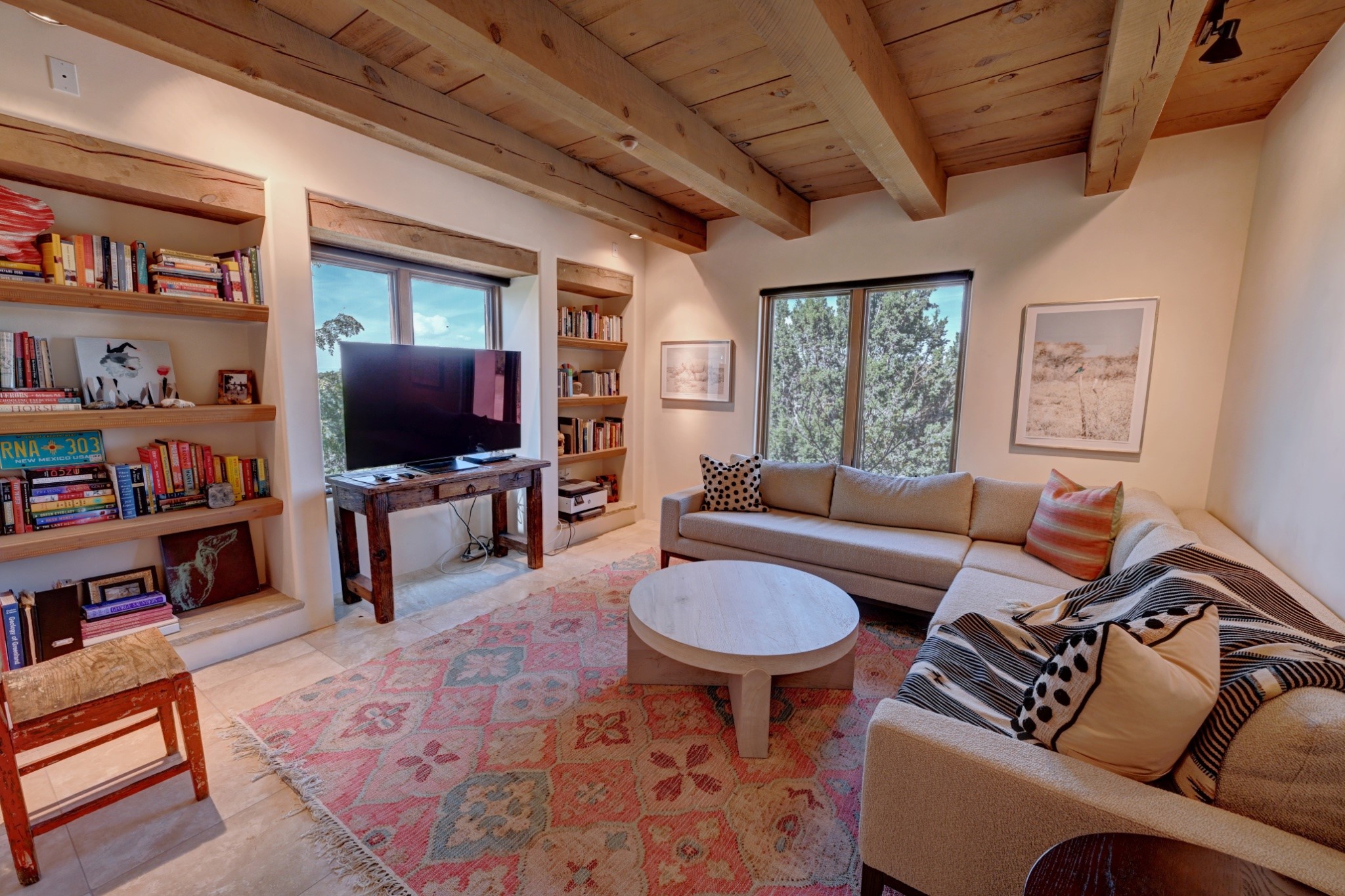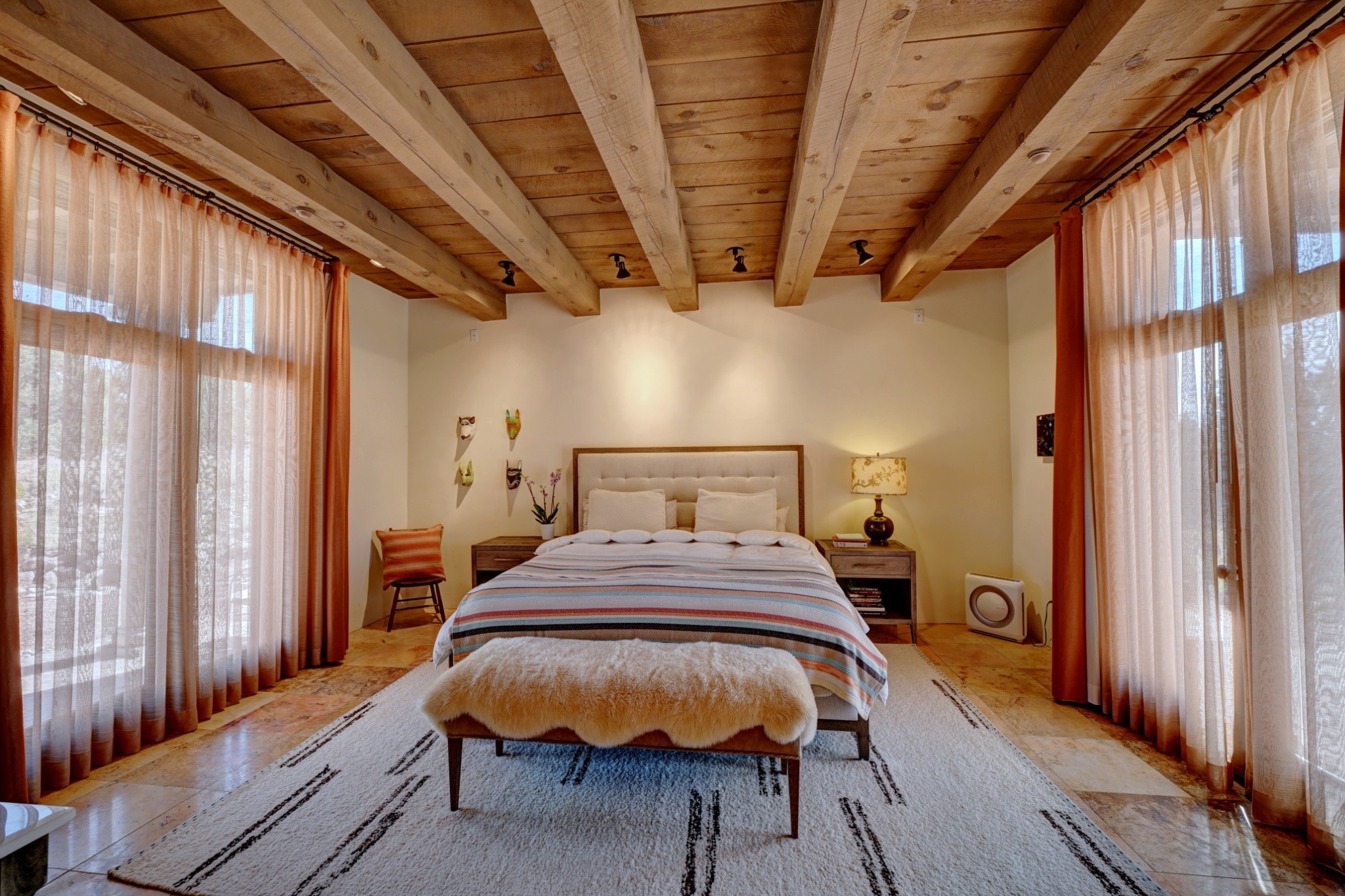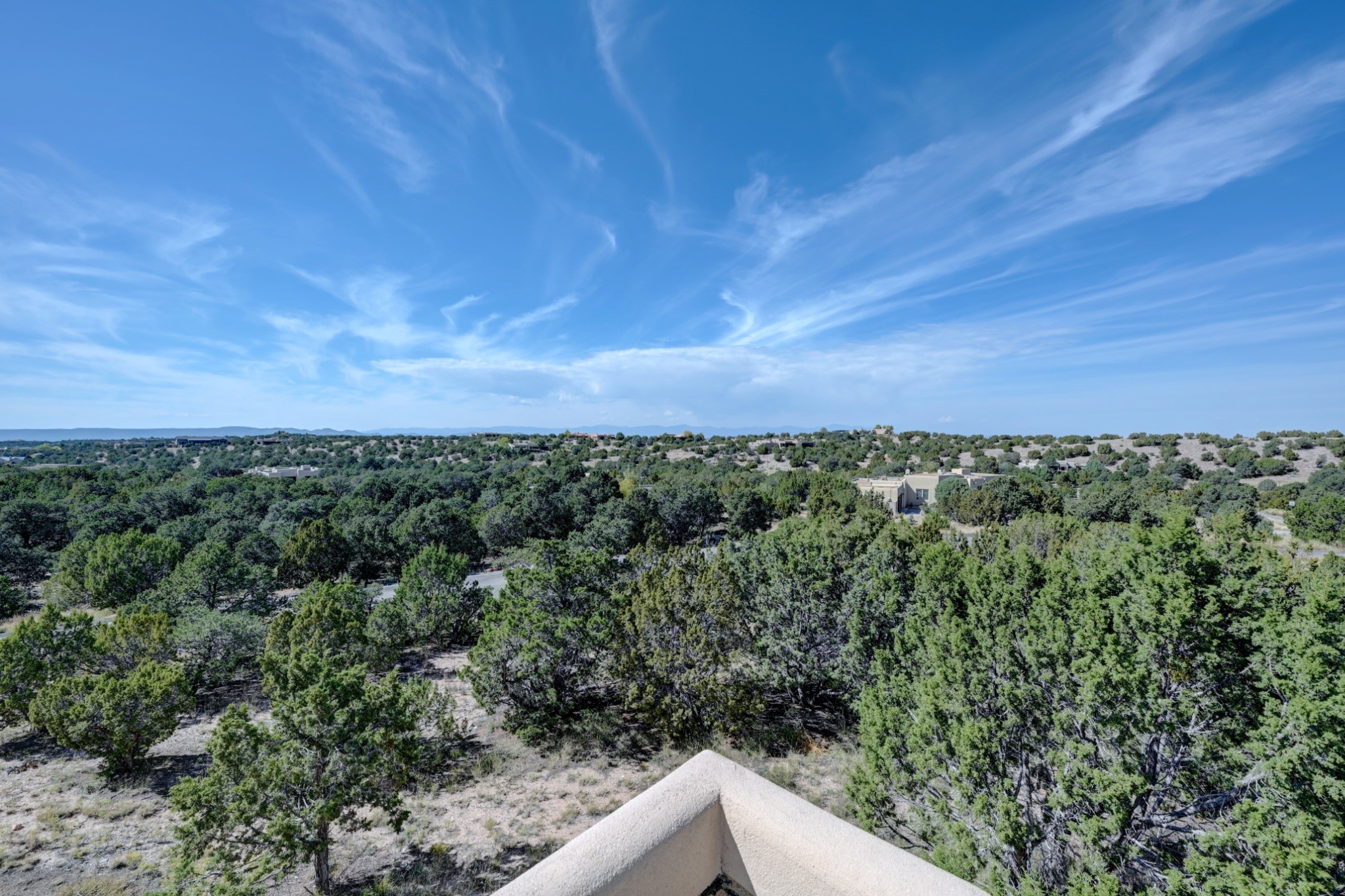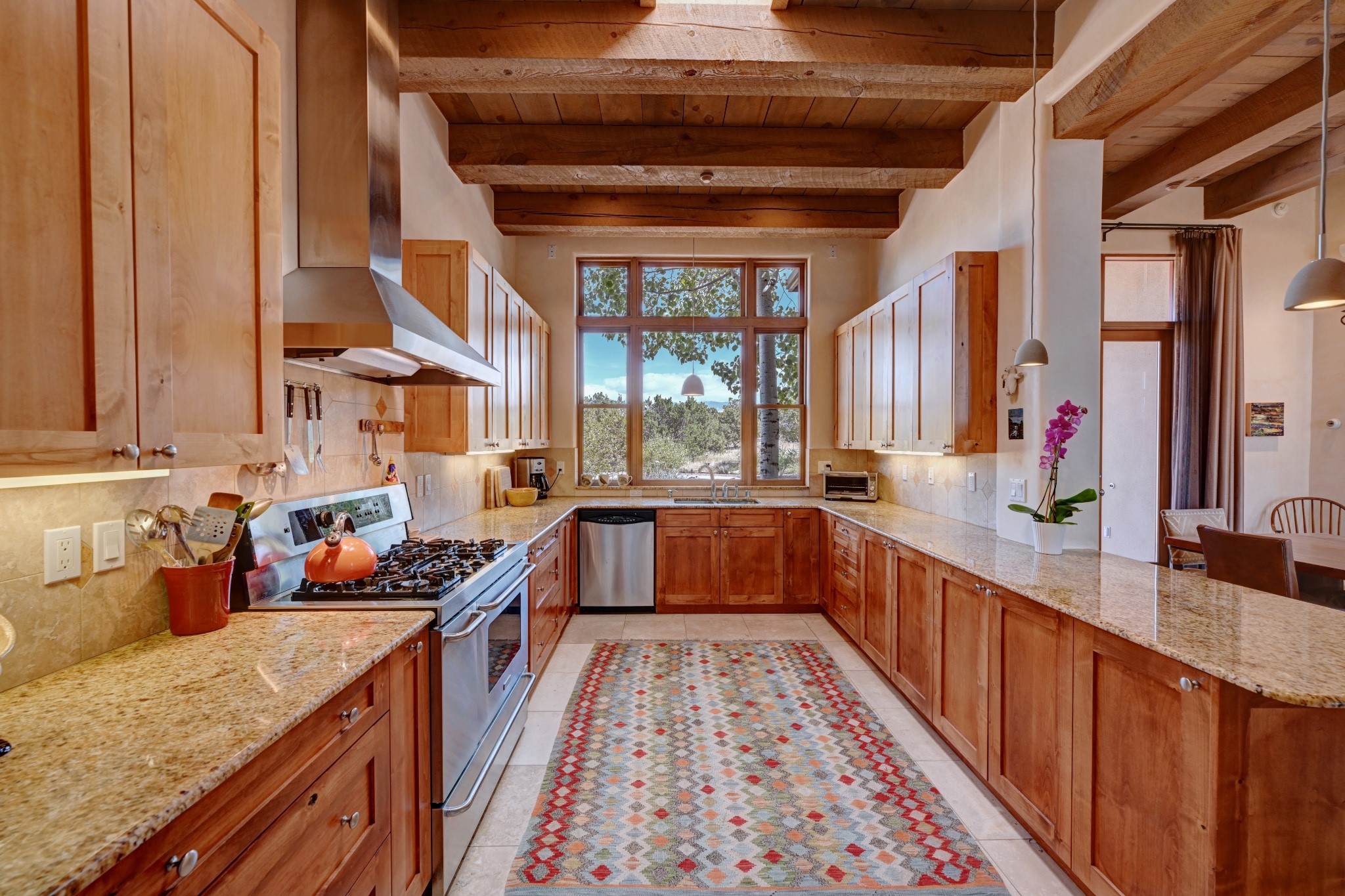 Discover refined living in this exquisite single-level residence located in Sundance Estates, where sophisticated design meets timeless Santa Fe charm. This 3 bedroom, 3 bathroom home's 2,627 square feet unfold with meticulous attention to detail, featuring elegant travertine floors and Diamond plaster walls that flow seamlessly throughout the space. The heart of the home showcases a luminous living room anchored by a stunning stone fireplace, beamed ceiling, abundant light and complemented by contemporary lighting fixtures and custom drapery that create an ambiance of understated luxury. This gracious space extends naturally into the dining area, distinguished by an artistic iron chandelier, while both rooms open onto a welcoming flagstone portal overlooking expansive views and the meticulously landscaped backyard with stone fountain. The primary bedroom suite serves as a private sanctuary, featuring an authentic Mexican wooden door entrance, a wood-burning kiva fireplace, and a private portal. The spa-inspired ensuite bathroom boasts a generous soaking tub and sophisticated marble and stone dual vanities, complemented by a generous walk-in closet. Culinary enthusiasts will appreciate the gourmet kitchen, equipped with stainless steel appliances, and custom wood cabinetry offering abundant storage. Granite countertops provide both beauty and functionality. Two thoughtfully positioned guest bedrooms, featuring character-rich square beamed ceilings and custom window treatments, offer built-in bookshelves and privacy from the primary suite. Both guest rooms enjoy their own portal access, perfect for morning coffee or evening relaxation. A two-car garage provides secure parking, while a rooftop deck offers breathtaking panoramic views. Located near the Calabasas Trail Head and only 14 minutes from the historic plaza, this home perfectly balances luxury living with the natural beauty of Santa Fe. This home offers an exceptional lifestyle in one of Santa Fe's most sought-after communities. Schedule a tour today to experience this remarkable property and please see the Matterport 3-D tour in the listing!