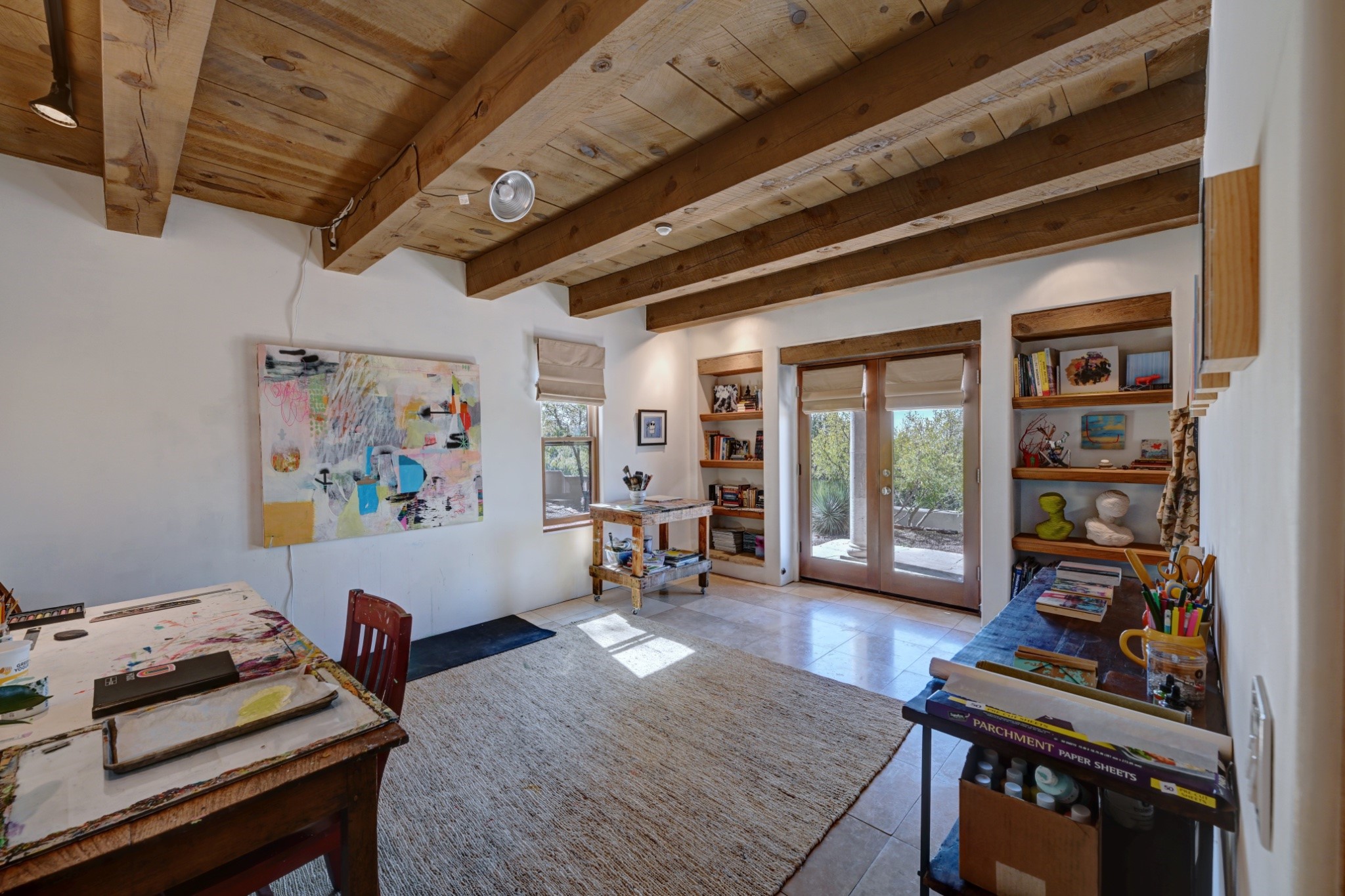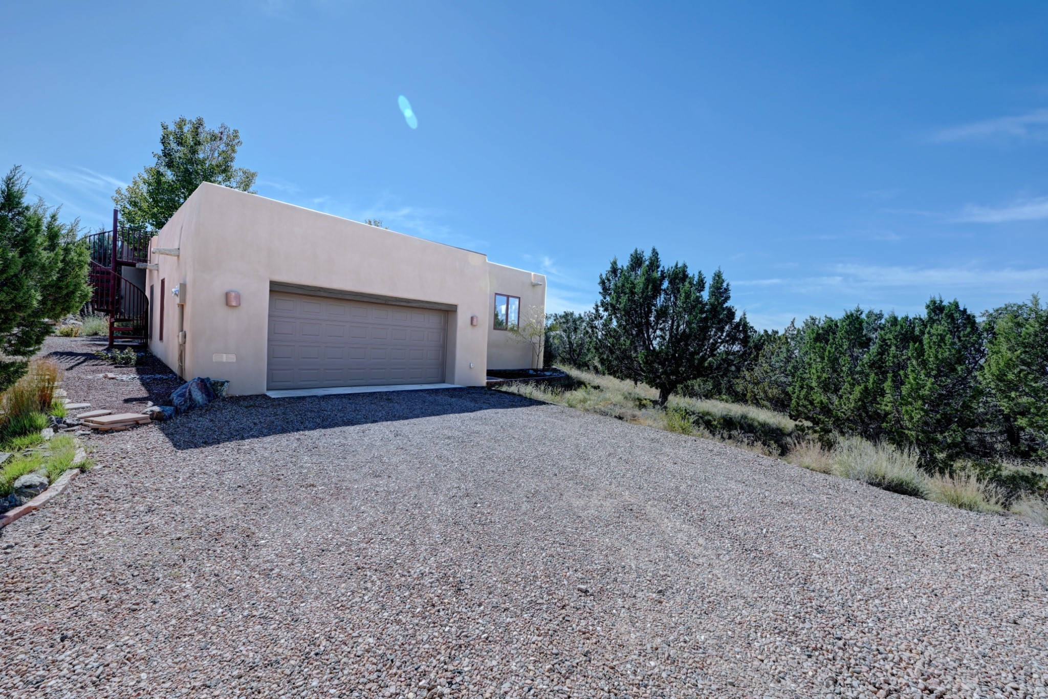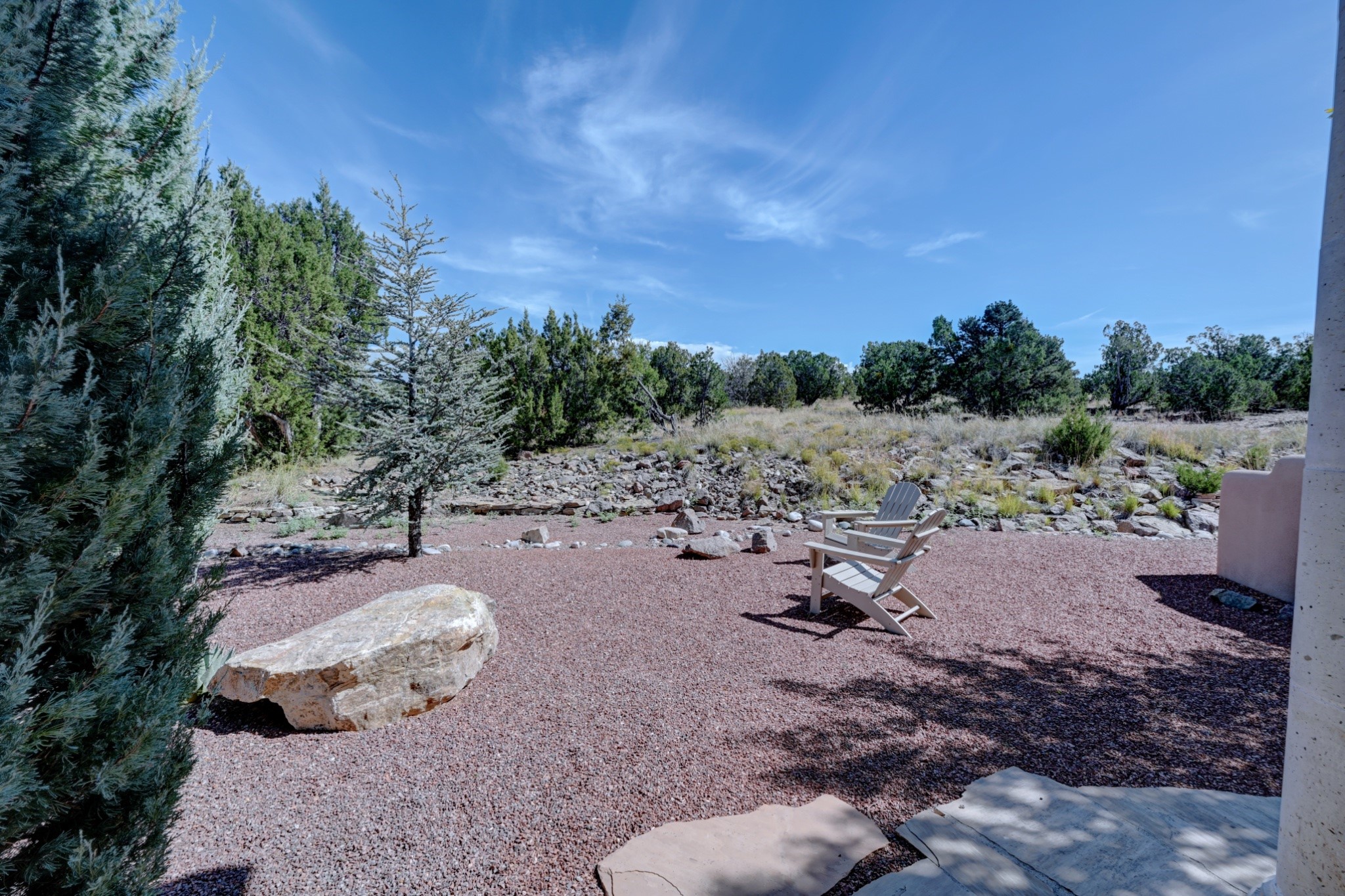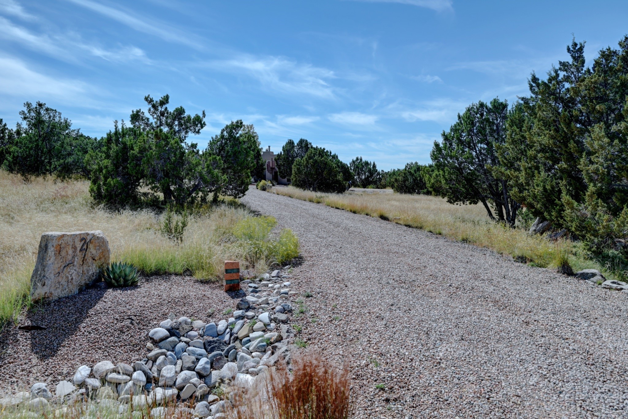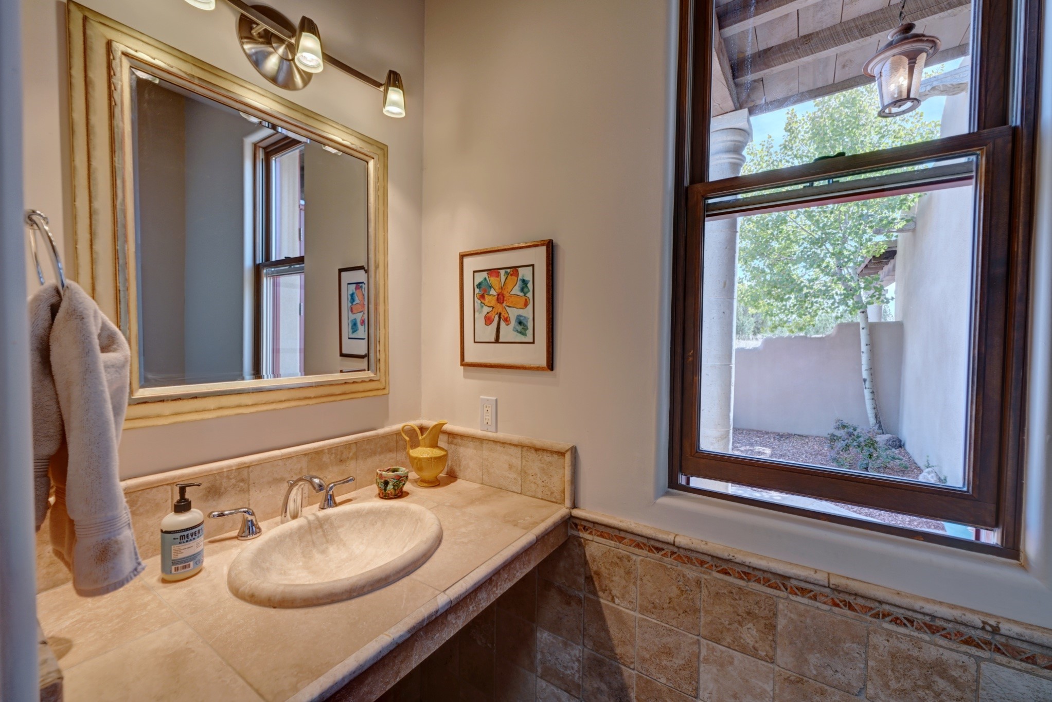 Discover refined living in this exquisite single-level residence located in Sundance Estates, where sophisticated design meets timeless Santa Fe charm. This 3 bedroom, 3 bathroom home's 2,627 square feet unfold with meticulous attention to detail, featuring elegant travertine floors and Diamond plaster walls that flow seamlessly throughout the space. The heart of the home showcases a luminous living room anchored by a stunning stone fireplace, beamed ceiling, abundant light and complemented by contemporary lighting fixtures and custom drapery that create an ambiance of understated luxury. This gracious space extends naturally into the dining area, distinguished by an artistic iron chandelier, while both rooms open onto a welcoming flagstone portal overlooking expansive views and the meticulously landscaped backyard with stone fountain. The primary bedroom suite serves as a private sanctuary, featuring an authentic Mexican wooden door entrance, a wood-burning kiva fireplace, and a private portal. The spa-inspired ensuite bathroom boasts a generous soaking tub and sophisticated marble and stone dual vanities, complemented by a generous walk-in closet. Culinary enthusiasts will appreciate the gourmet kitchen, equipped with stainless steel appliances, and custom wood cabinetry offering abundant storage. Granite countertops provide both beauty and functionality. Two thoughtfully positioned guest bedrooms, featuring character-rich square beamed ceilings and custom window treatments, offer built-in bookshelves and privacy from the primary suite. Both guest rooms enjoy their own portal access, perfect for morning coffee or evening relaxation. A two-car garage provides secure parking, while a rooftop deck offers breathtaking panoramic views. Located near the Calabasas Trail Head and only 14 minutes from the historic plaza, this home perfectly balances luxury living with the natural beauty of Santa Fe. This home offers an exceptional lifestyle in one of Santa Fe's most sought-after communities. Schedule a tour today to experience this remarkable property and please see the Matterport 3-D tour in the listing!