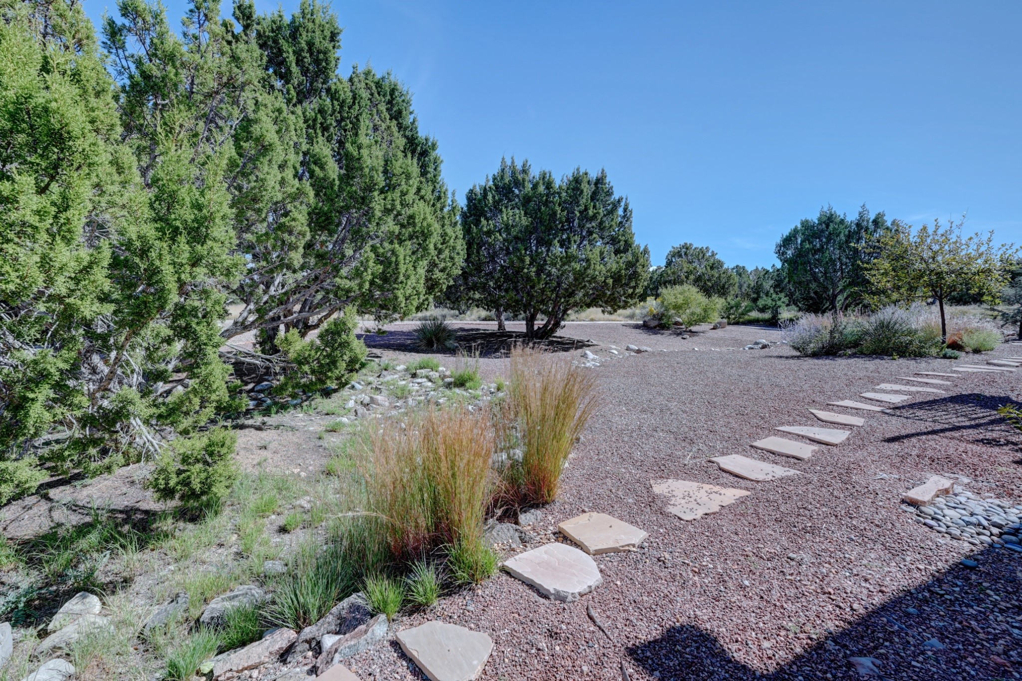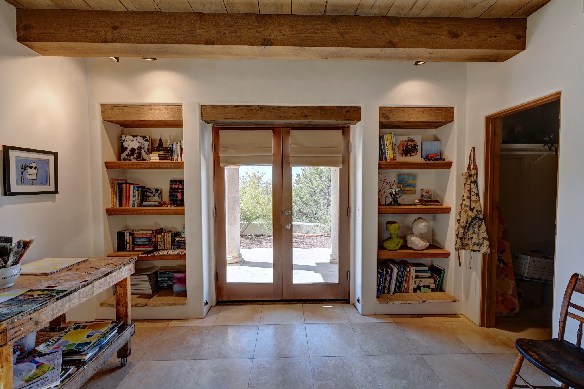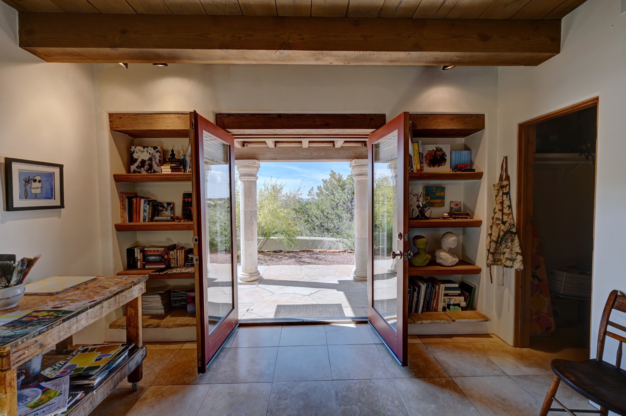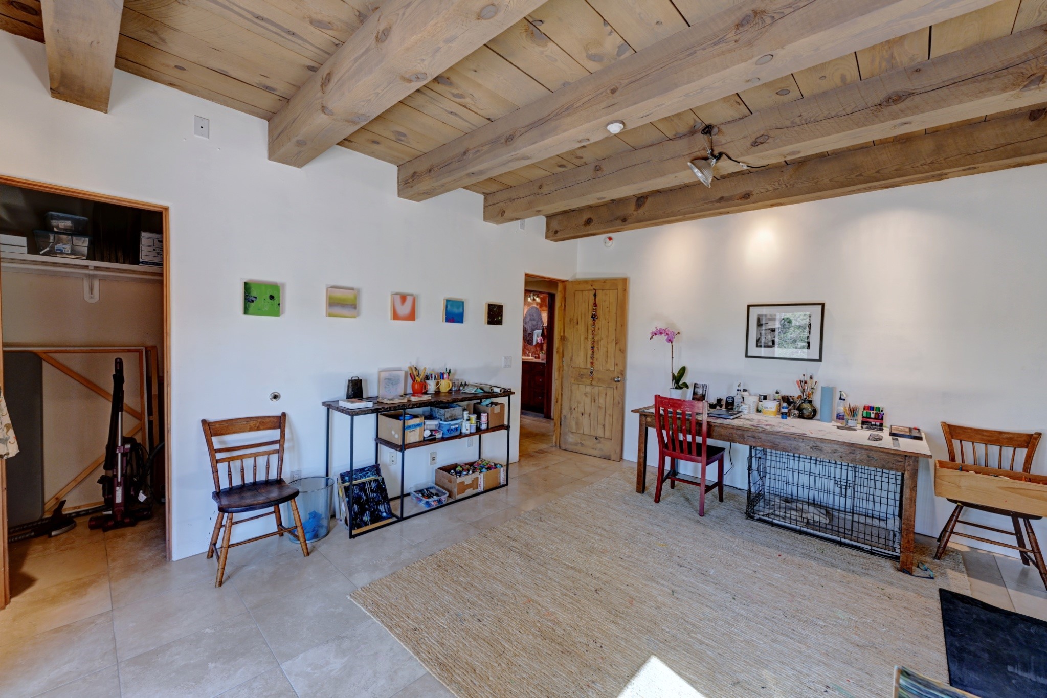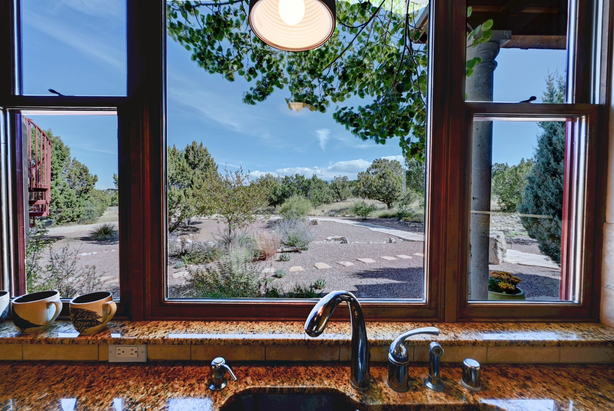 Discover refined living in this exquisite single-level residence located in Sundance Estates, where sophisticated design meets timeless Santa Fe charm. This 3 bedroom, 3 bathroom home's 2,627 square feet unfold with meticulous attention to detail, featuring elegant travertine floors and Diamond plaster walls that flow seamlessly throughout the space. The heart of the home showcases a luminous living room anchored by a stunning stone fireplace, beamed ceiling, abundant light and complemented by contemporary lighting fixtures and custom drapery that create an ambiance of understated luxury. This gracious space extends naturally into the dining area, distinguished by an artistic iron chandelier, while both rooms open onto a welcoming flagstone portal overlooking expansive views and the meticulously landscaped backyard with stone fountain. The primary bedroom suite serves as a private sanctuary, featuring an authentic Mexican wooden door entrance, a wood-burning kiva fireplace, and a private portal. The spa-inspired ensuite bathroom boasts a generous soaking tub and sophisticated marble and stone dual vanities, complemented by a generous walk-in closet. Culinary enthusiasts will appreciate the gourmet kitchen, equipped with stainless steel appliances, and custom wood cabinetry offering abundant storage. Granite countertops provide both beauty and functionality. Two thoughtfully positioned guest bedrooms, featuring character-rich square beamed ceilings and custom window treatments, offer built-in bookshelves and privacy from the primary suite. Both guest rooms enjoy their own portal access, perfect for morning coffee or evening relaxation. A two-car garage provides secure parking, while a rooftop deck offers breathtaking panoramic views. Located near the Calabasas Trail Head and only 14 minutes from the historic plaza, this home perfectly balances luxury living with the natural beauty of Santa Fe. This home offers an exceptional lifestyle in one of Santa Fe's most sought-after communities. Schedule a tour today to experience this remarkable property and please see the Matterport 3-D tour in the listing!