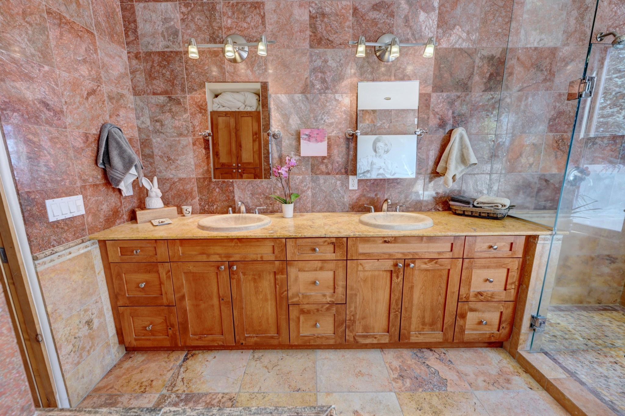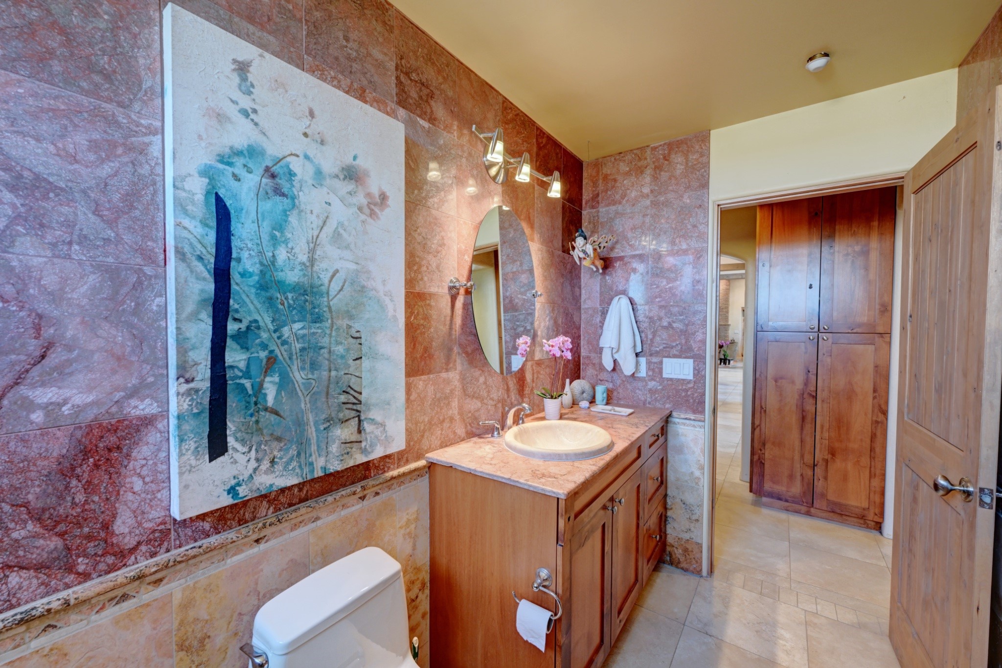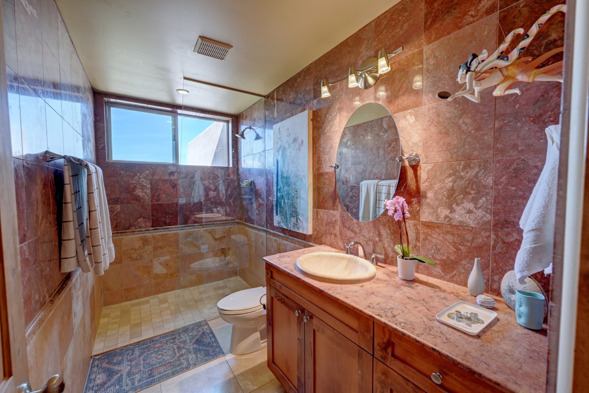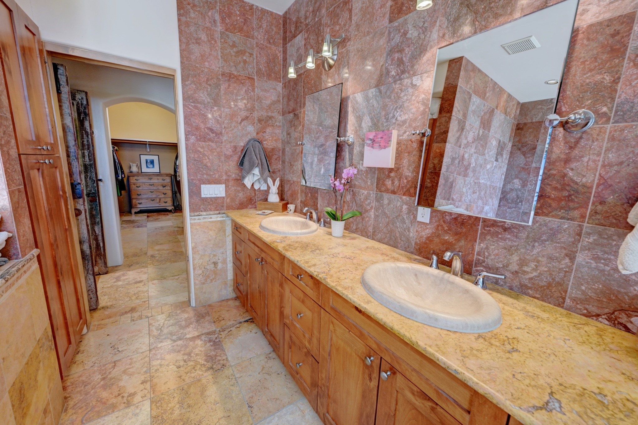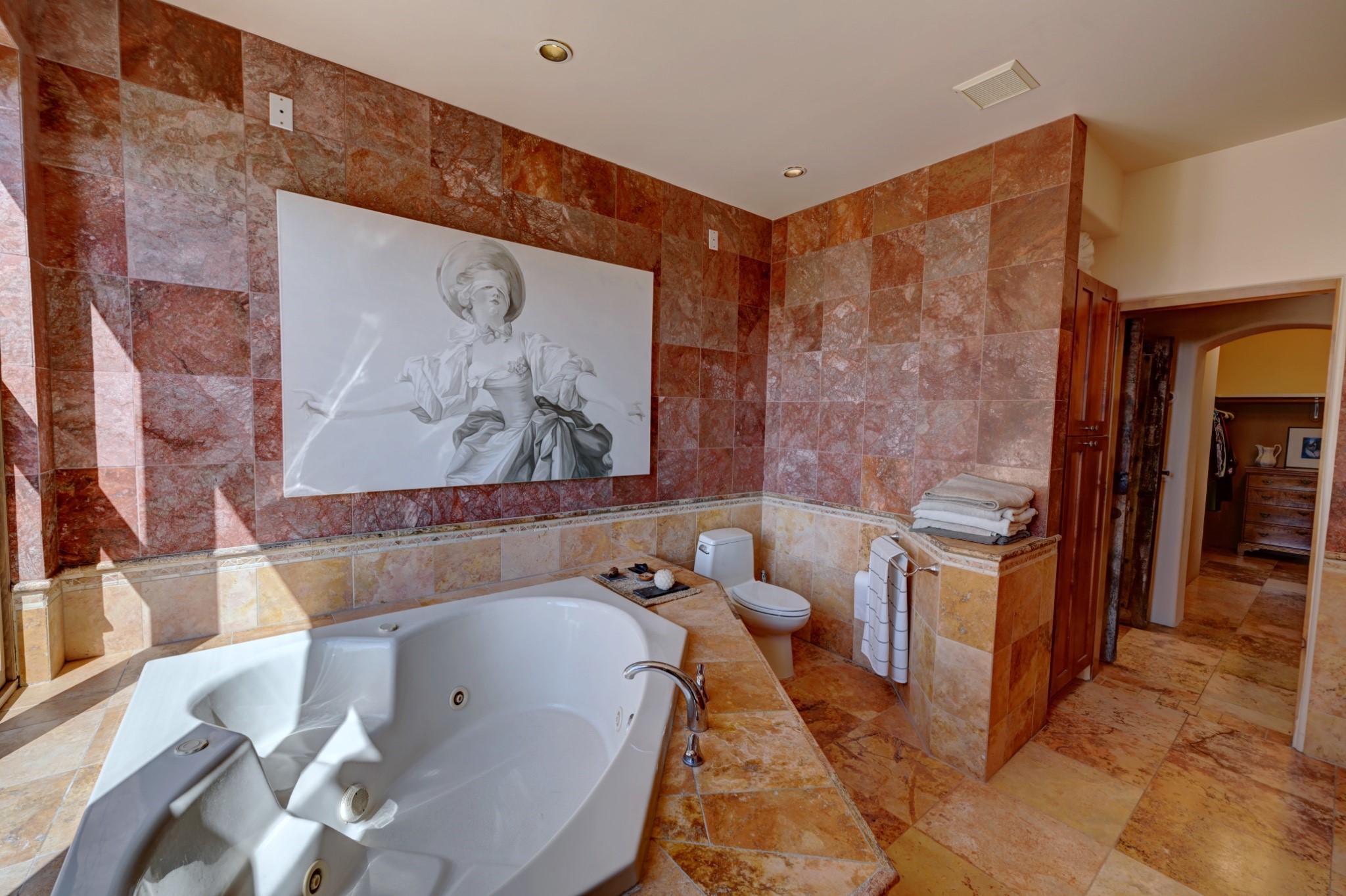 Discover refined living in this exquisite single-level residence located in Sundance Estates, where sophisticated design meets timeless Santa Fe charm. This 3 bedroom, 3 bathroom home's 2,627 square feet unfold with meticulous attention to detail, featuring elegant travertine floors and Diamond plaster walls that flow seamlessly throughout the space. The heart of the home showcases a luminous living room anchored by a stunning stone fireplace, beamed ceiling, abundant light and complemented by contemporary lighting fixtures and custom drapery that create an ambiance of understated luxury. This gracious space extends naturally into the dining area, distinguished by an artistic iron chandelier, while both rooms open onto a welcoming flagstone portal overlooking expansive views and the meticulously landscaped backyard with stone fountain. The primary bedroom suite serves as a private sanctuary, featuring an authentic Mexican wooden door entrance, a wood-burning kiva fireplace, and a private portal. The spa-inspired ensuite bathroom boasts a generous soaking tub and sophisticated marble and stone dual vanities, complemented by a generous walk-in closet. Culinary enthusiasts will appreciate the gourmet kitchen, equipped with stainless steel appliances, and custom wood cabinetry offering abundant storage. Granite countertops provide both beauty and functionality. Two thoughtfully positioned guest bedrooms, featuring character-rich square beamed ceilings and custom window treatments, offer built-in bookshelves and privacy from the primary suite. Both guest rooms enjoy their own portal access, perfect for morning coffee or evening relaxation. A two-car garage provides secure parking, while a rooftop deck offers breathtaking panoramic views. Located near the Calabasas Trail Head and only 14 minutes from the historic plaza, this home perfectly balances luxury living with the natural beauty of Santa Fe. This home offers an exceptional lifestyle in one of Santa Fe's most sought-after communities. Schedule a tour today to experience this remarkable property and please see the Matterport 3-D tour in the listing!