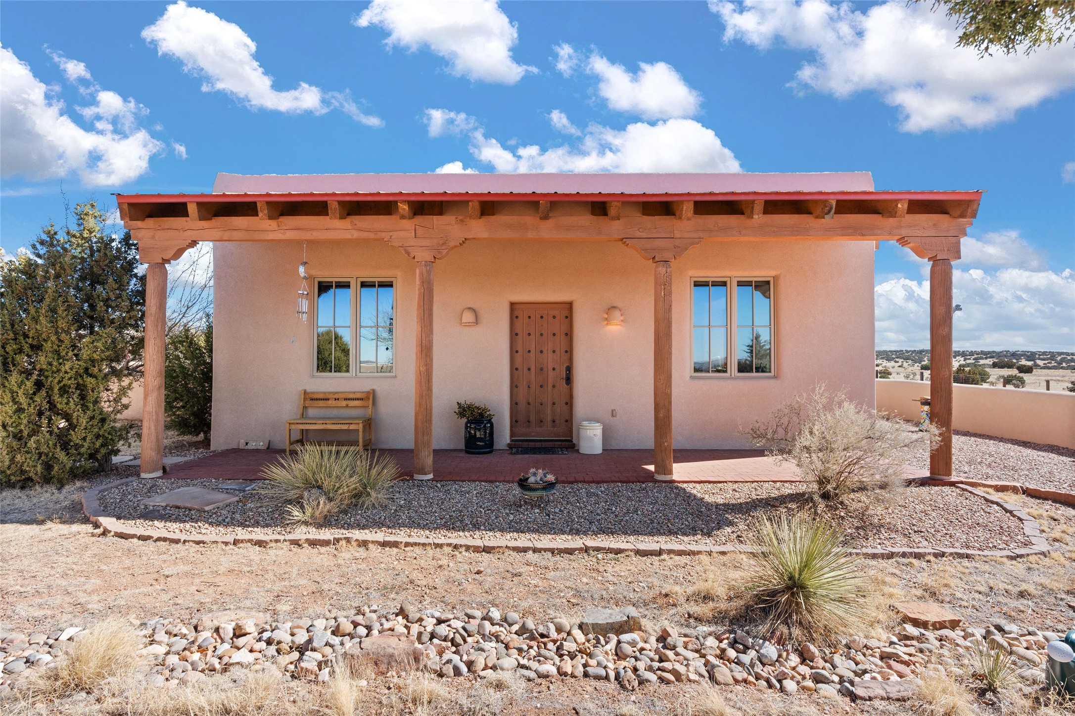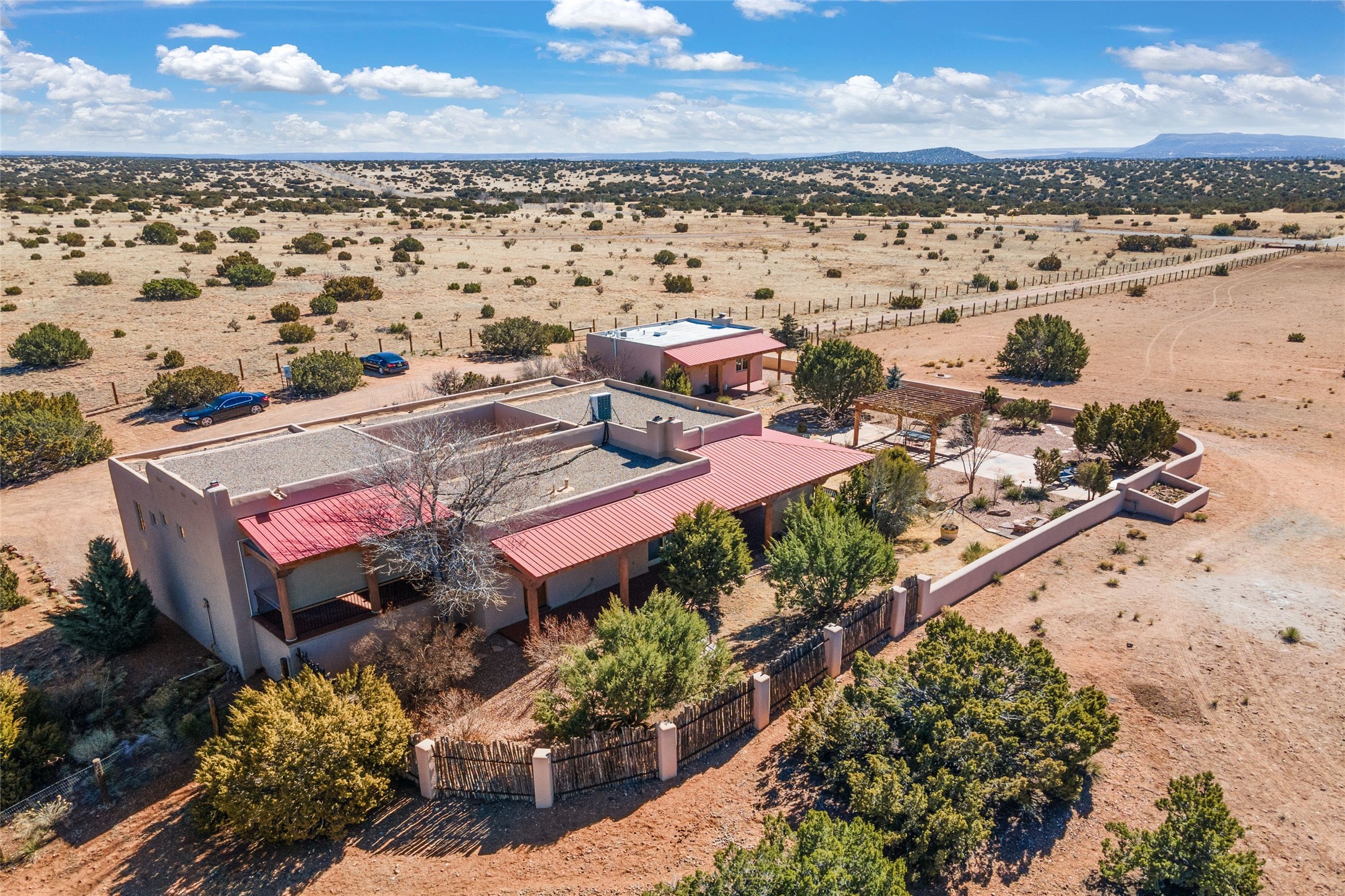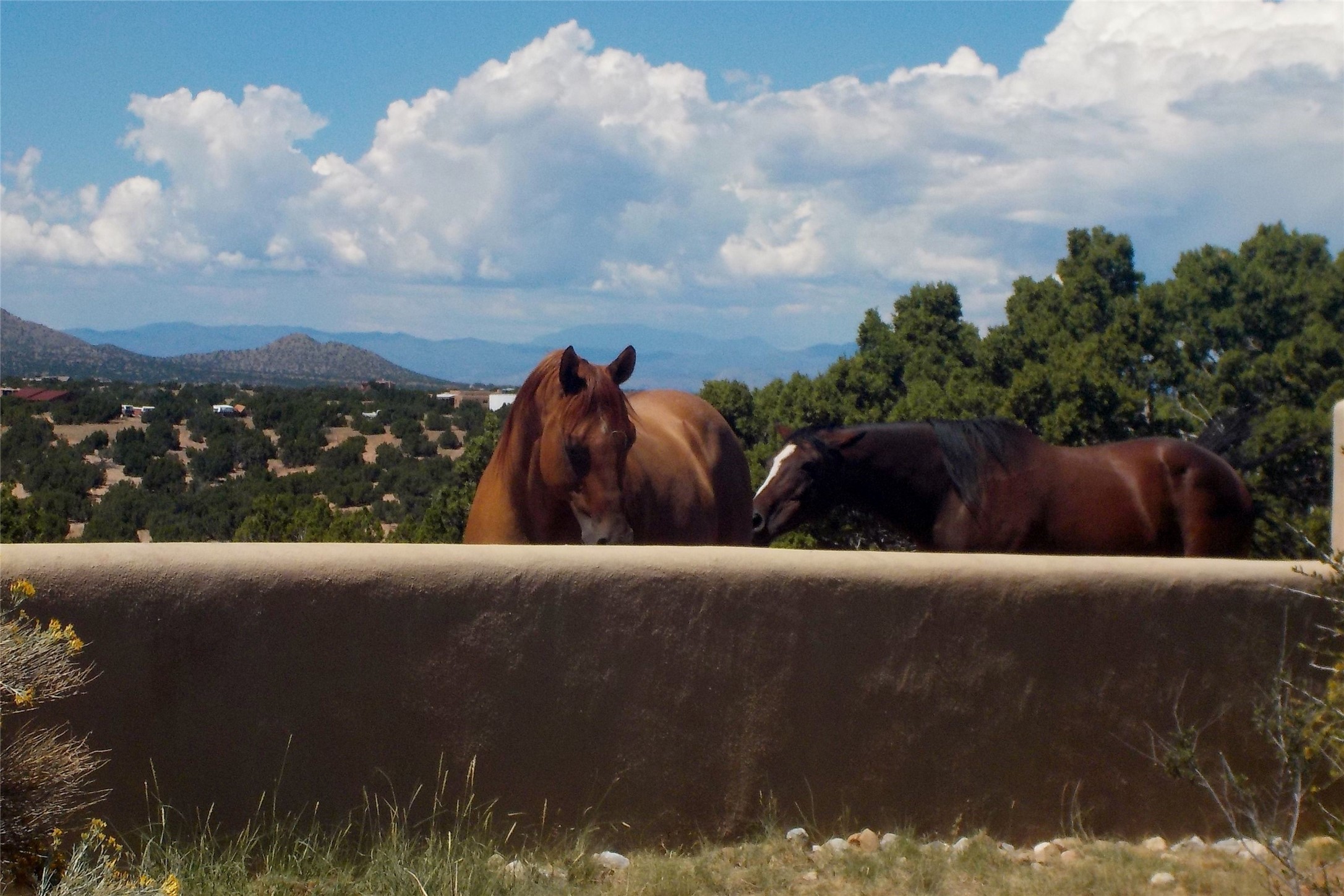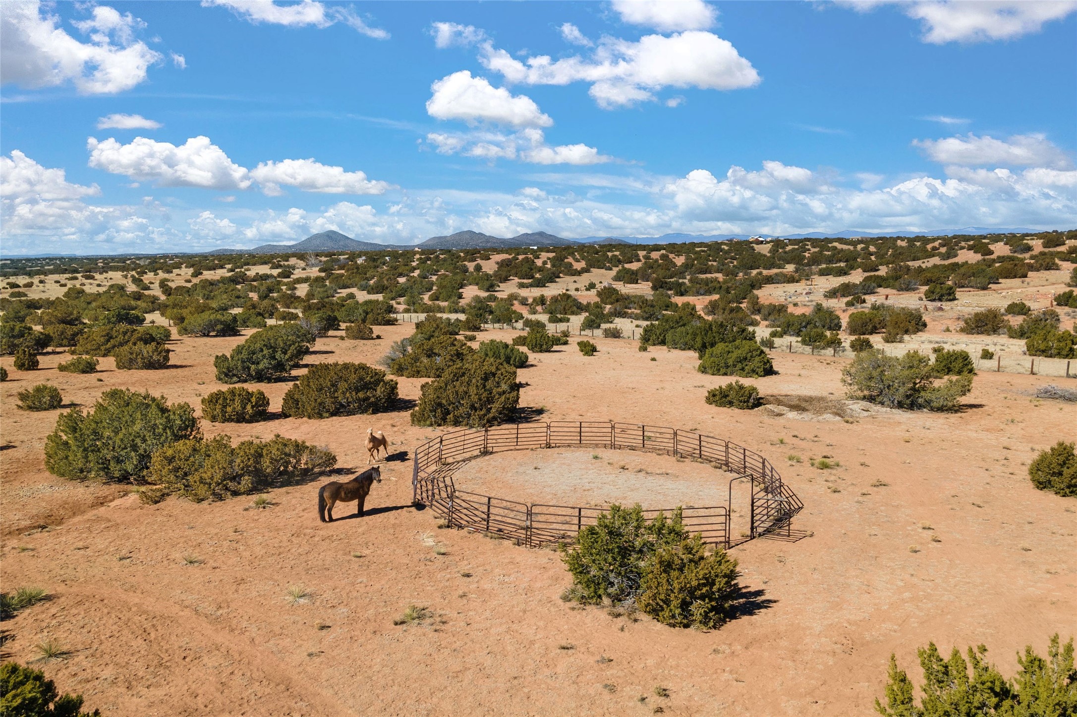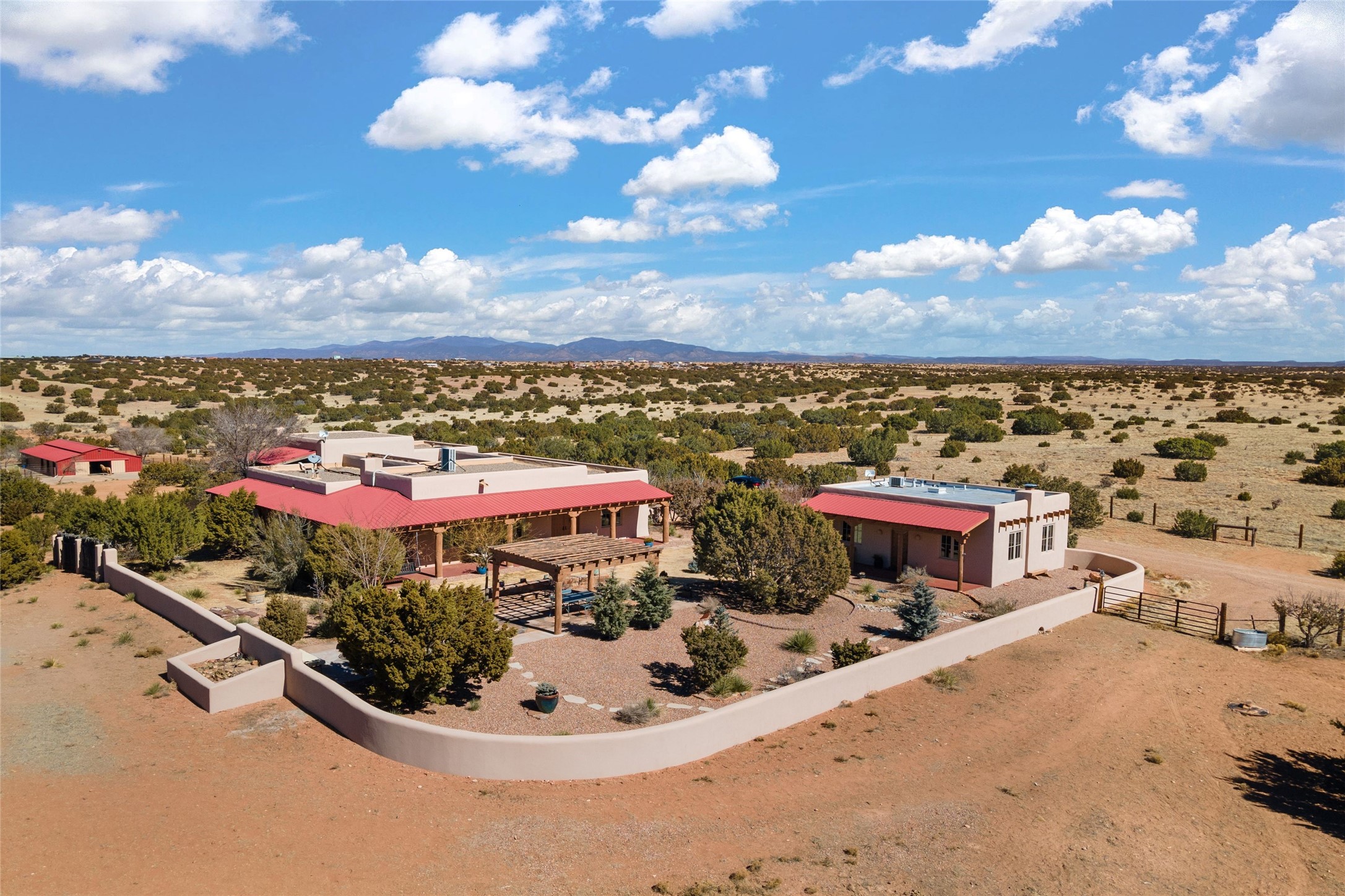 The best horse property in Santa Fe- with panoramic views! A rare find, this pristine equestrian ranch spans nearly 20 acres of breathtaking countryside, offering an ideal retreat for both horses and owners. Framed by the majestic Ortiz, Sandia, Jemez, and Sangre de Cristo mountains, the property provides a serene yet convenient location just 15 minutes from Santa Fe and I-25. Designed and built by renowned builder Will Prull, the custom Pueblo Hacienda welcomes you through a beautifully landscaped front courtyard and a wraparound portal. Inside, a spacious entry foyer opens to an inviting living area with a kiva fireplace, seamlessly connecting to the formal dining room. The well-appointed cook's kitchen, complete with a butler's pantry, offers easy access to a charming interior patio, perfect for indoor-outdoor living. Two guest bedrooms, each with built-in shelving and access to a covered portal, share a luxurious bath--one featuring a sleek fireplace. The private primary suite, has a cozy fireplace and a balcony offering breathtaking views of the estate and surrounding mountains. A beautifully designed one-bedroom guest house complements the main residence, featuring an open-concept living area, kitchenette, and fireplace, all finished to the same high standards. Equestrian enthusiasts will appreciate the immaculate five-stall barn with turnouts, a tack room, and space to expand with an additional five stalls. The barn accommodates up to 600 bales of hay, while a secure 5-foot, non-climb horse safety wire fence encloses the entire property, allowing horses free access. A private 3-acre-foot well, 1120 feet deep, delivers an ample 20 gpm water supply. This extraordinary estate seamlessly blends luxury, tranquility, and equestrian excellence, all within close reach of Santa Fe's vibrant cultural and recreational offerings.