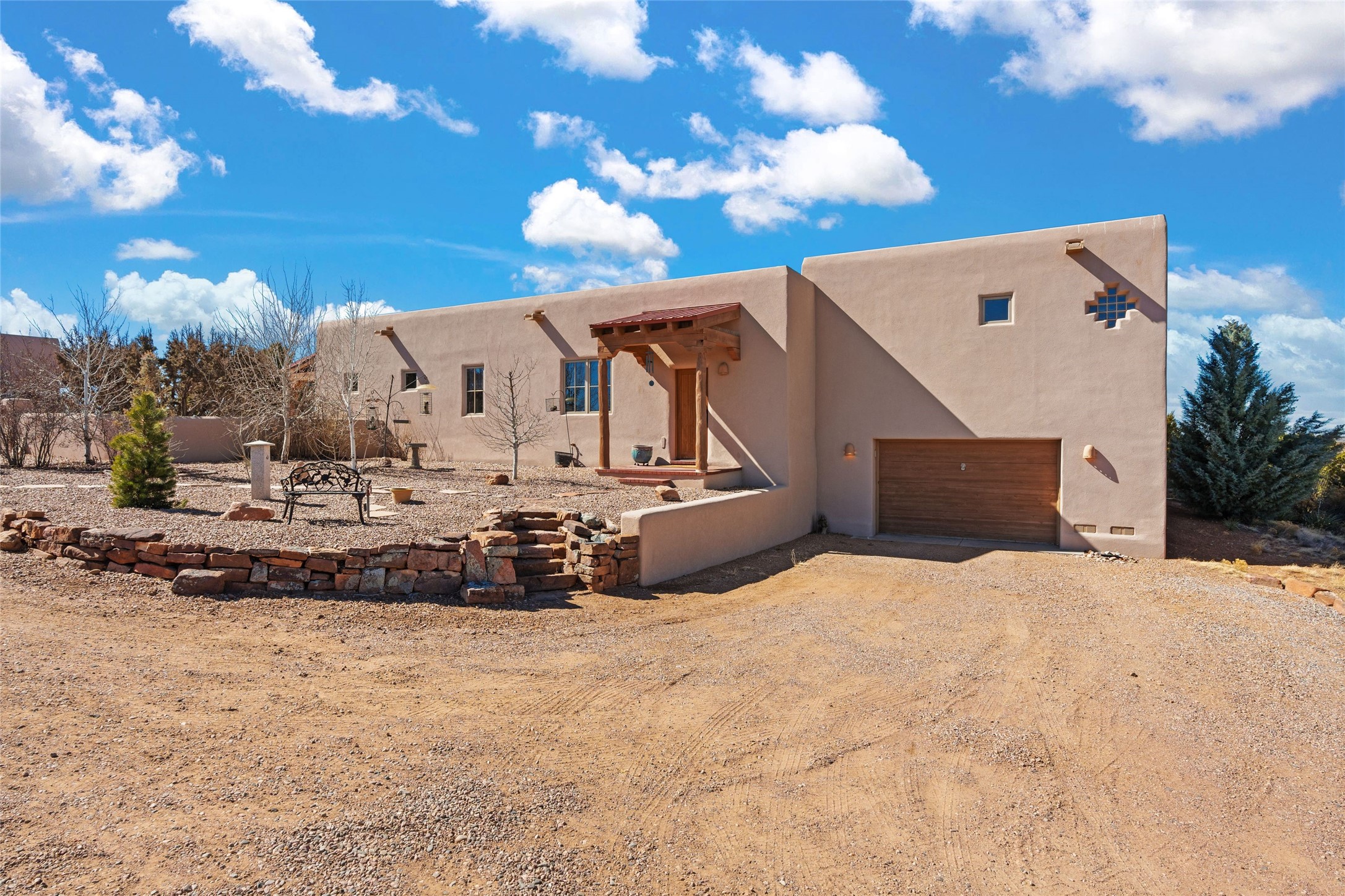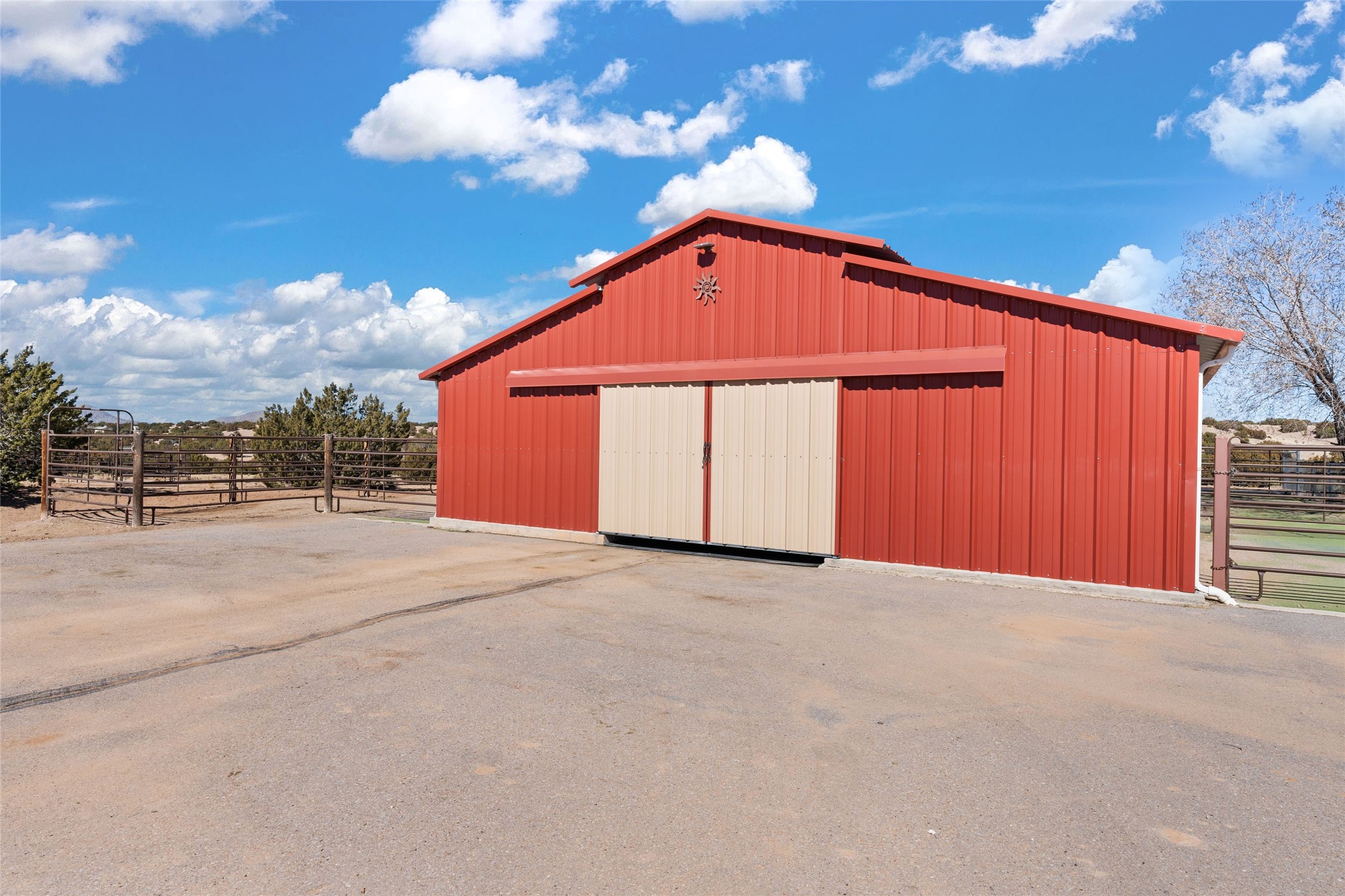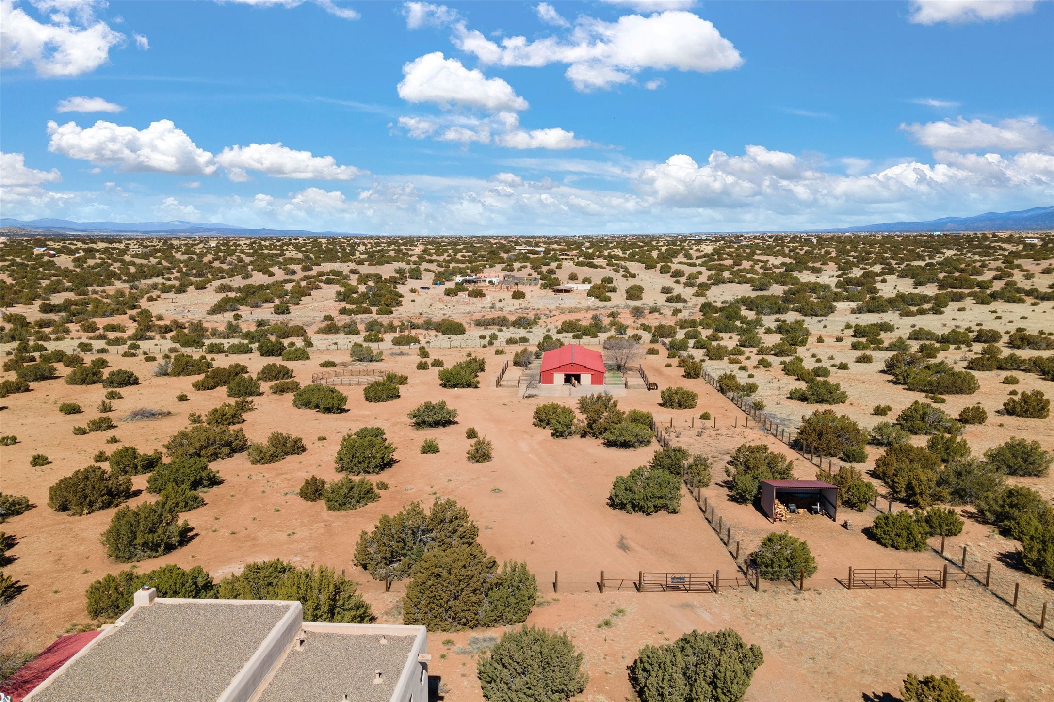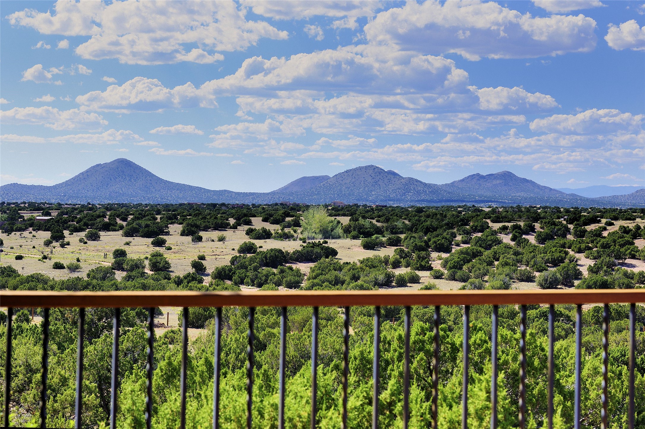 The best horse property in Santa Fe- with panoramic views! A rare find, this pristine equestrian ranch spans nearly 20 acres of breathtaking countryside, offering an ideal retreat for both horses and owners. Framed by the majestic Ortiz, Sandia, Jemez, and Sangre de Cristo mountains, the property provides a serene yet convenient location just 15 minutes from Santa Fe and I-25. Designed and built by renowned builder Will Prull, the custom Pueblo Hacienda welcomes you through a beautifully landscaped front courtyard and a wraparound portal. Inside, a spacious entry foyer opens to an inviting living area with a kiva fireplace, seamlessly connecting to the formal dining room. The well-appointed cook's kitchen, complete with a butler's pantry, offers easy access to a charming interior patio, perfect for indoor-outdoor living. Two guest bedrooms, each with built-in shelving and access to a covered portal, share a luxurious bath--one featuring a sleek fireplace. The private primary suite, has a cozy fireplace and a balcony offering breathtaking views of the estate and surrounding mountains. A beautifully designed one-bedroom guest house complements the main residence, featuring an open-concept living area, kitchenette, and fireplace, all finished to the same high standards. Equestrian enthusiasts will appreciate the immaculate five-stall barn with turnouts, a tack room, and space to expand with an additional five stalls. The barn accommodates up to 600 bales of hay, while a secure 5-foot, non-climb horse safety wire fence encloses the entire property, allowing horses free access. A private 3-acre-foot well, 1120 feet deep, delivers an ample 20 gpm water supply. This extraordinary estate seamlessly blends luxury, tranquility, and equestrian excellence, all within close reach of Santa Fe's vibrant cultural and recreational offerings.