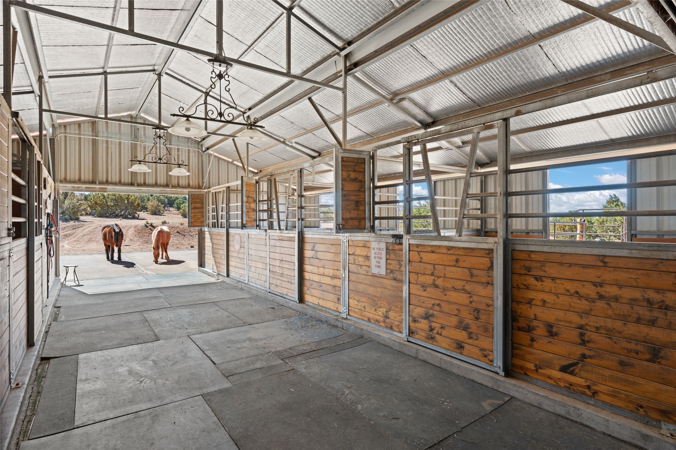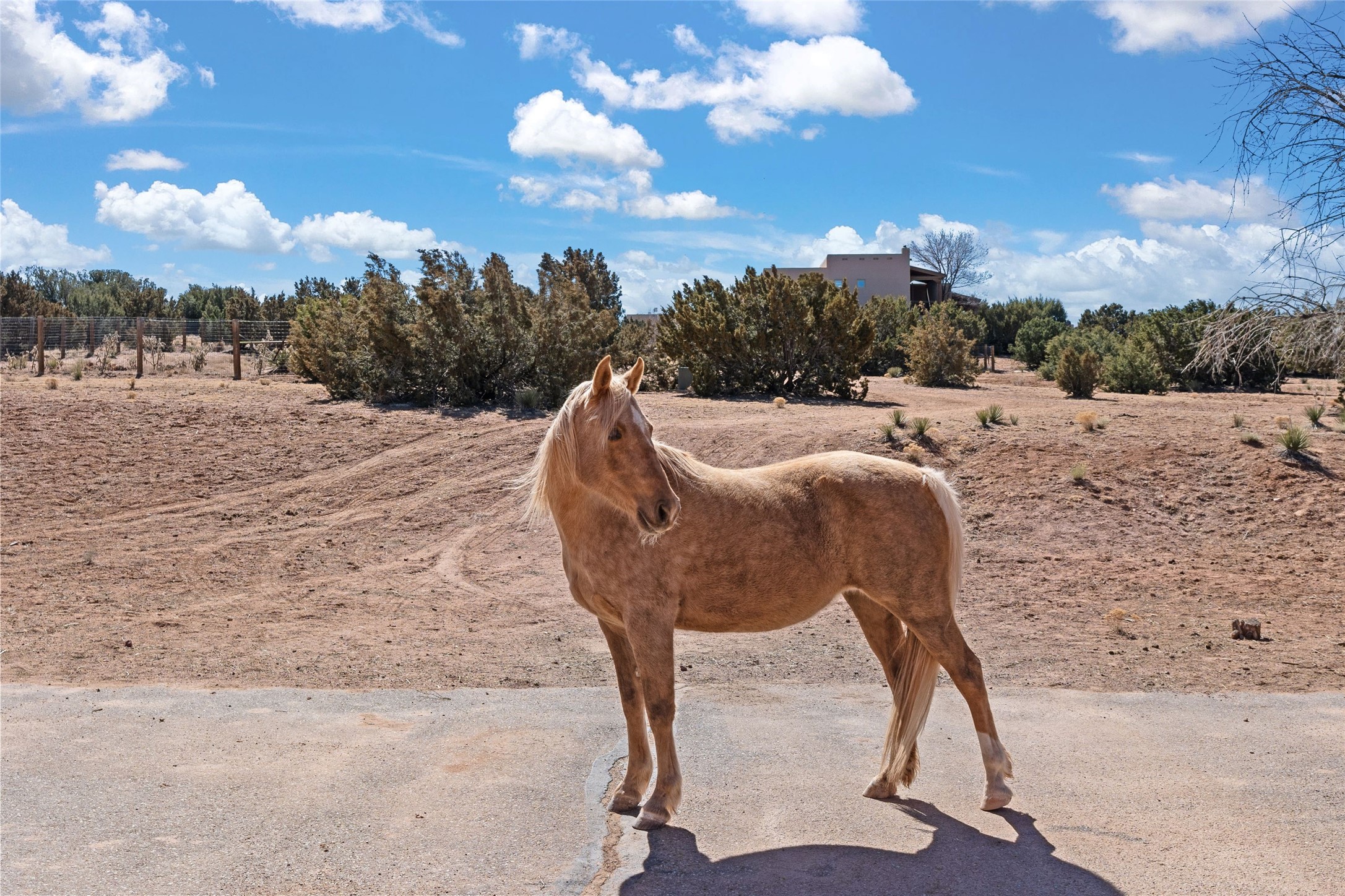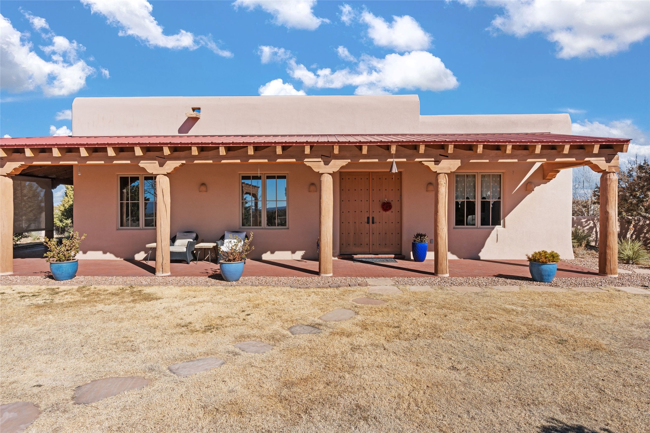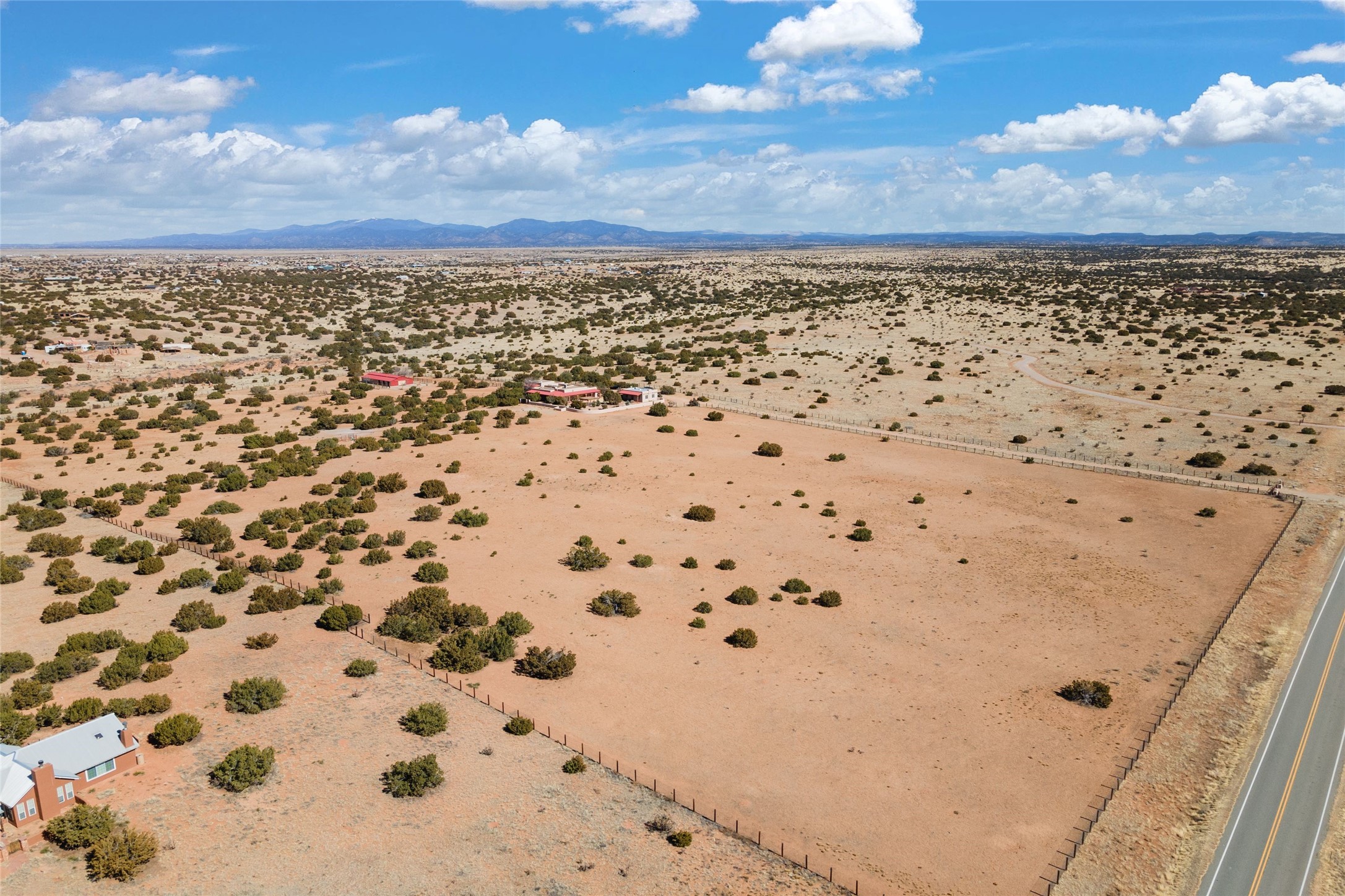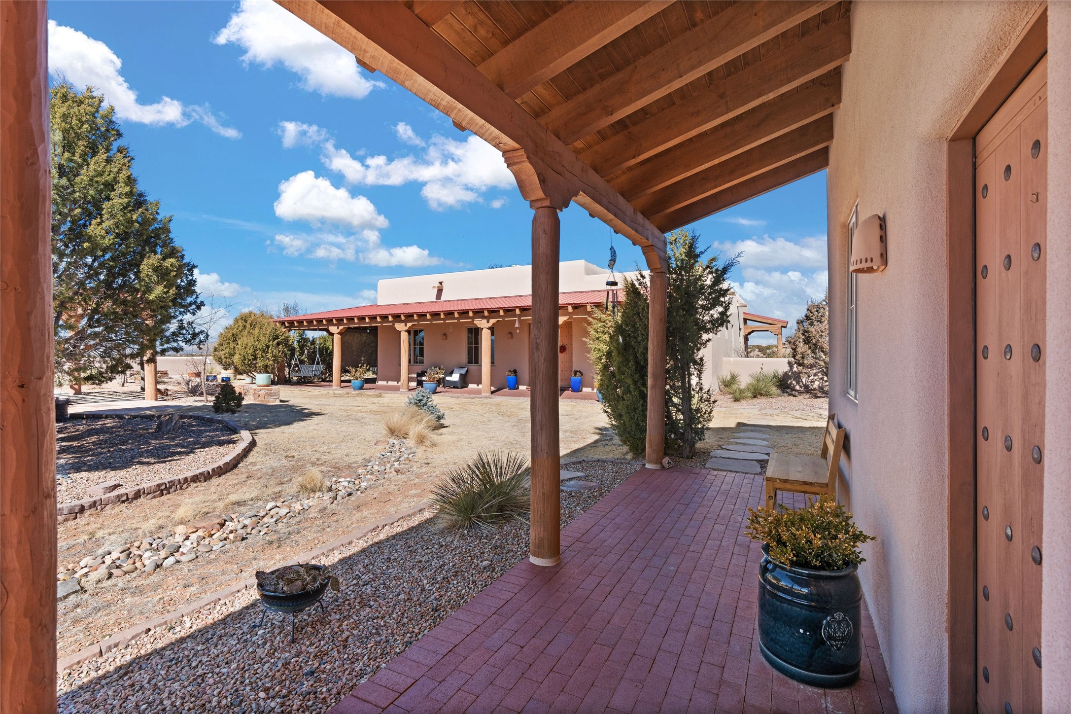 The best horse property in Santa Fe- with panoramic views! A rare find, this pristine equestrian ranch spans nearly 20 acres of breathtaking countryside, offering an ideal retreat for both horses and owners. Framed by the majestic Ortiz, Sandia, Jemez, and Sangre de Cristo mountains, the property provides a serene yet convenient location just 15 minutes from Santa Fe and I-25. Designed and built by renowned builder Will Prull, the custom Pueblo Hacienda welcomes you through a beautifully landscaped front courtyard and a wraparound portal. Inside, a spacious entry foyer opens to an inviting living area with a kiva fireplace, seamlessly connecting to the formal dining room. The well-appointed cook's kitchen, complete with a butler's pantry, offers easy access to a charming interior patio, perfect for indoor-outdoor living. Two guest bedrooms, each with built-in shelving and access to a covered portal, share a luxurious bath--one featuring a sleek fireplace. The private primary suite, has a cozy fireplace and a balcony offering breathtaking views of the estate and surrounding mountains. A beautifully designed one-bedroom guest house complements the main residence, featuring an open-concept living area, kitchenette, and fireplace, all finished to the same high standards. Equestrian enthusiasts will appreciate the immaculate five-stall barn with turnouts, a tack room, and space to expand with an additional five stalls. The barn accommodates up to 600 bales of hay, while a secure 5-foot, non-climb horse safety wire fence encloses the entire property, allowing horses free access. A private 3-acre-foot well, 1120 feet deep, delivers an ample 20 gpm water supply. This extraordinary estate seamlessly blends luxury, tranquility, and equestrian excellence, all within close reach of Santa Fe's vibrant cultural and recreational offerings.