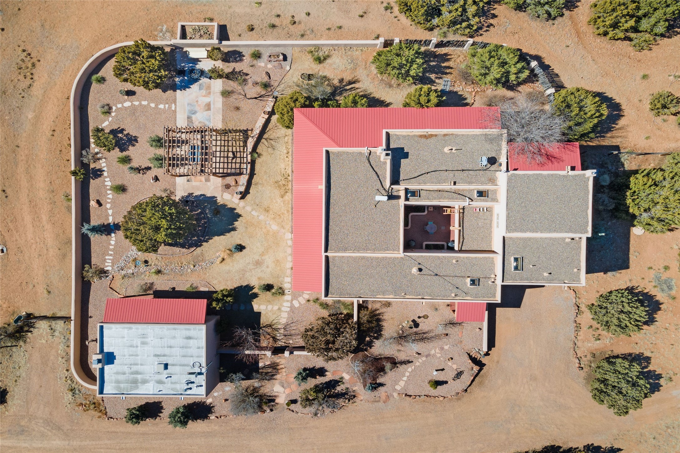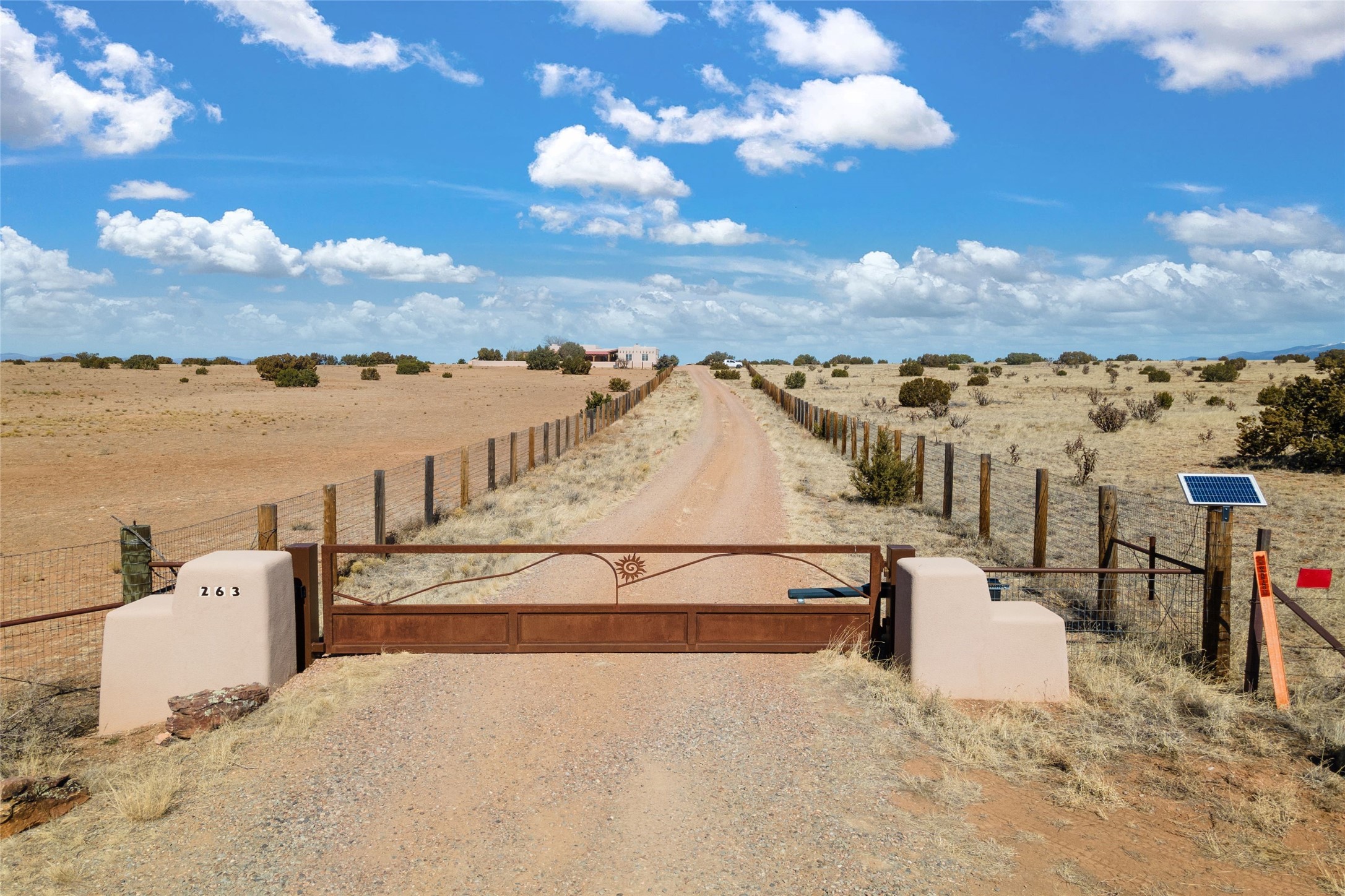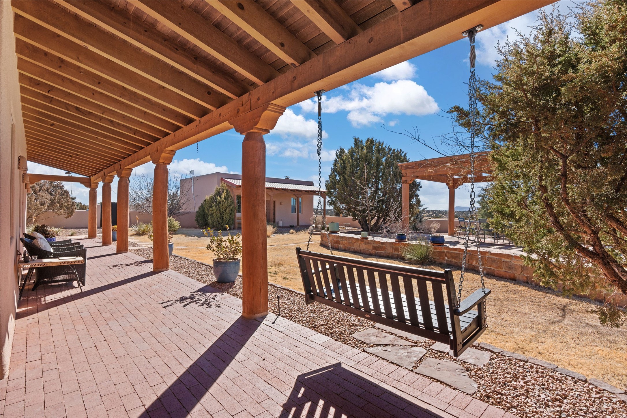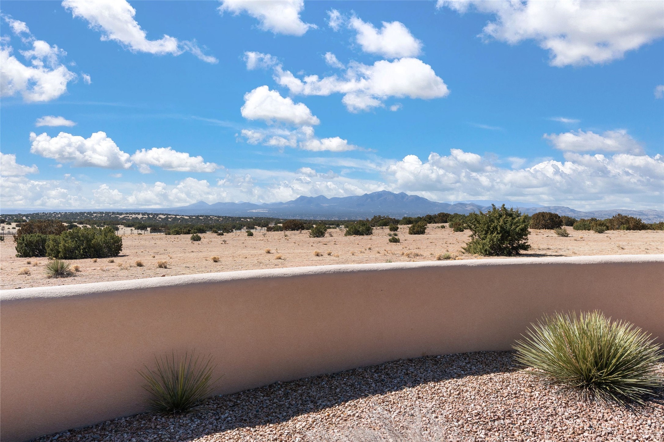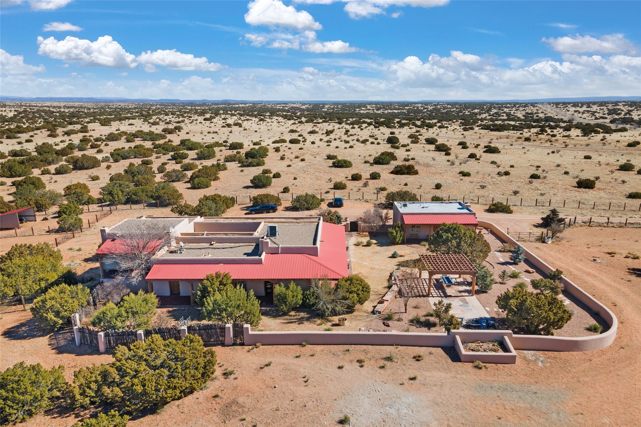 The best horse property in Santa Fe- with panoramic views! A rare find, this pristine equestrian ranch spans nearly 20 acres of breathtaking countryside, offering an ideal retreat for both horses and owners. Framed by the majestic Ortiz, Sandia, Jemez, and Sangre de Cristo mountains, the property provides a serene yet convenient location just 15 minutes from Santa Fe and I-25. Designed and built by renowned builder Will Prull, the custom Pueblo Hacienda welcomes you through a beautifully landscaped front courtyard and a wraparound portal. Inside, a spacious entry foyer opens to an inviting living area with a kiva fireplace, seamlessly connecting to the formal dining room. The well-appointed cook's kitchen, complete with a butler's pantry, offers easy access to a charming interior patio, perfect for indoor-outdoor living. Two guest bedrooms, each with built-in shelving and access to a covered portal, share a luxurious bath--one featuring a sleek fireplace. The private primary suite, has a cozy fireplace and a balcony offering breathtaking views of the estate and surrounding mountains. A beautifully designed one-bedroom guest house complements the main residence, featuring an open-concept living area, kitchenette, and fireplace, all finished to the same high standards. Equestrian enthusiasts will appreciate the immaculate five-stall barn with turnouts, a tack room, and space to expand with an additional five stalls. The barn accommodates up to 600 bales of hay, while a secure 5-foot, non-climb horse safety wire fence encloses the entire property, allowing horses free access. A private 3-acre-foot well, 1120 feet deep, delivers an ample 20 gpm water supply. This extraordinary estate seamlessly blends luxury, tranquility, and equestrian excellence, all within close reach of Santa Fe's vibrant cultural and recreational offerings.