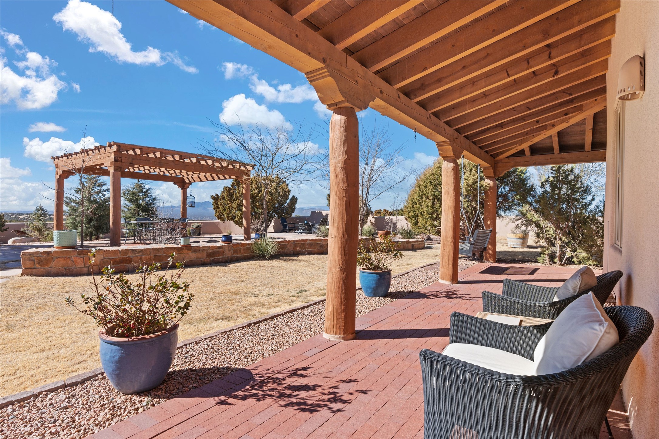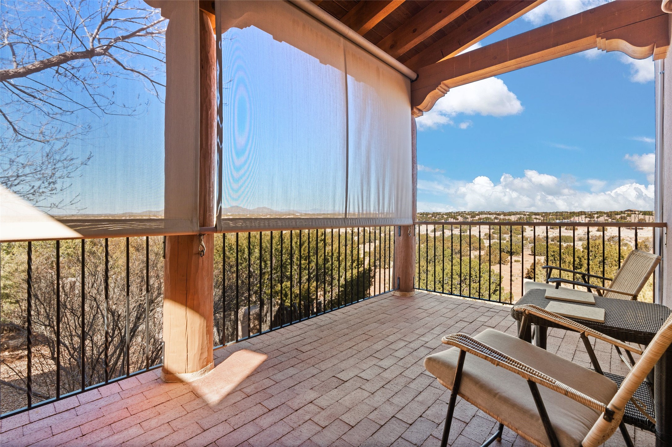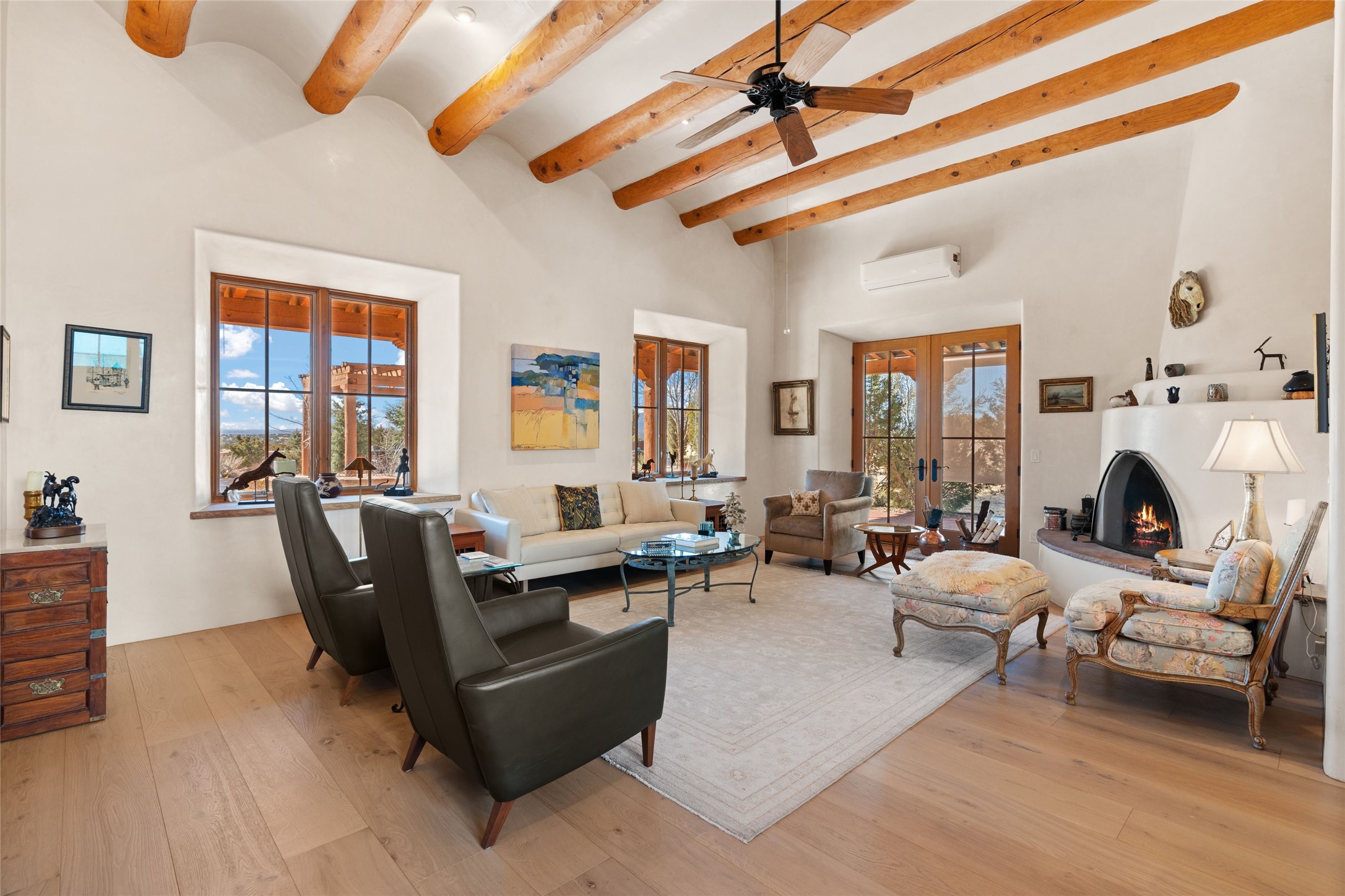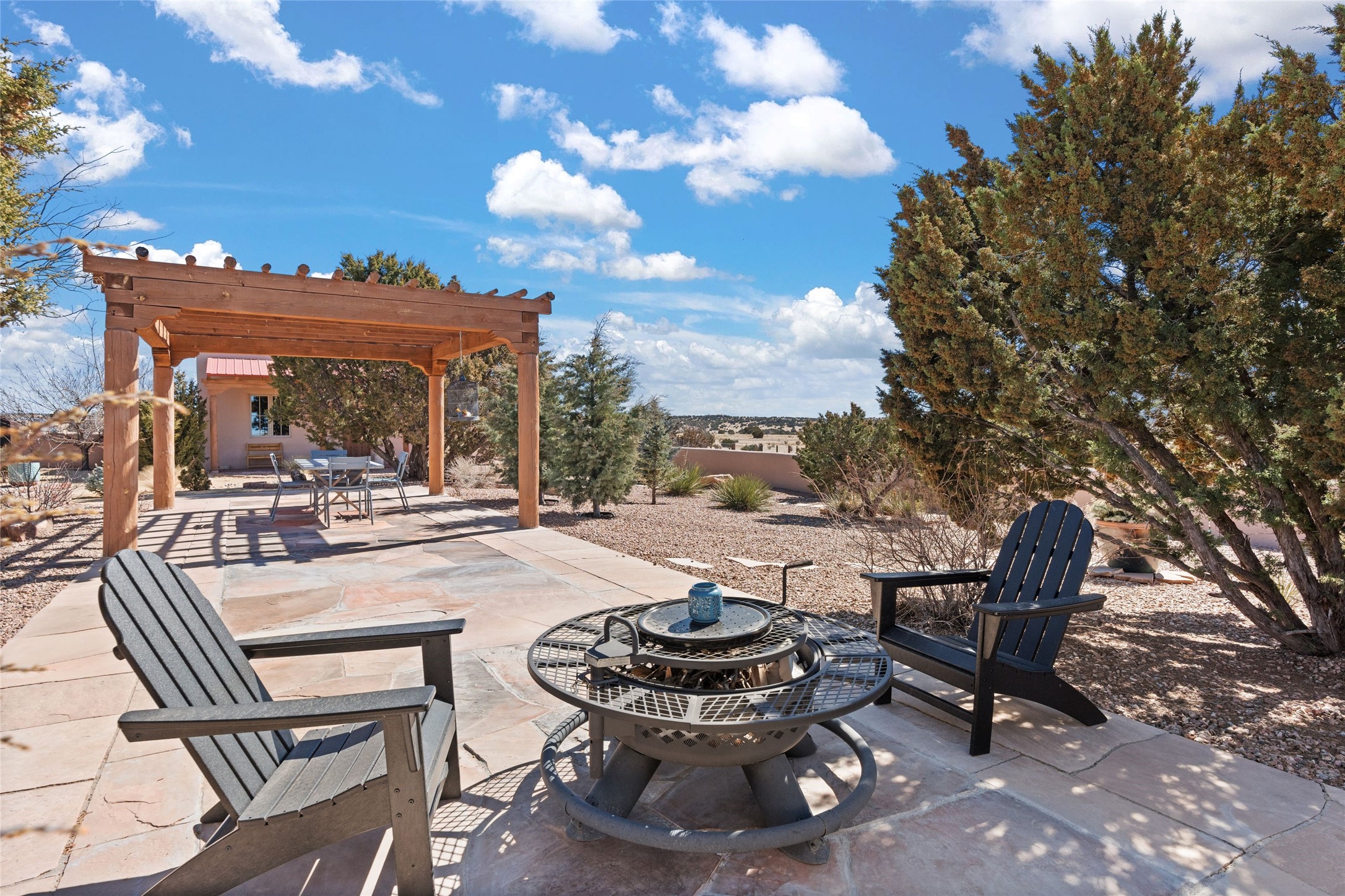 The best horse property in Santa Fe- with panoramic views! A rare find, this pristine equestrian ranch spans nearly 20 acres of breathtaking countryside, offering an ideal retreat for both horses and owners. Framed by the majestic Ortiz, Sandia, Jemez, and Sangre de Cristo mountains, the property provides a serene yet convenient location just 15 minutes from Santa Fe and I-25. Designed and built by renowned builder Will Prull, the custom Pueblo Hacienda welcomes you through a beautifully landscaped front courtyard and a wraparound portal. Inside, a spacious entry foyer opens to an inviting living area with a kiva fireplace, seamlessly connecting to the formal dining room. The well-appointed cook's kitchen, complete with a butler's pantry, offers easy access to a charming interior patio, perfect for indoor-outdoor living. Two guest bedrooms, each with built-in shelving and access to a covered portal, share a luxurious bath--one featuring a sleek fireplace. The private primary suite, has a cozy fireplace and a balcony offering breathtaking views of the estate and surrounding mountains. A beautifully designed one-bedroom guest house complements the main residence, featuring an open-concept living area, kitchenette, and fireplace, all finished to the same high standards. Equestrian enthusiasts will appreciate the immaculate five-stall barn with turnouts, a tack room, and space to expand with an additional five stalls. The barn accommodates up to 600 bales of hay, while a secure 5-foot, non-climb horse safety wire fence encloses the entire property, allowing horses free access. A private 3-acre-foot well, 1120 feet deep, delivers an ample 20 gpm water supply. This extraordinary estate seamlessly blends luxury, tranquility, and equestrian excellence, all within close reach of Santa Fe's vibrant cultural and recreational offerings.