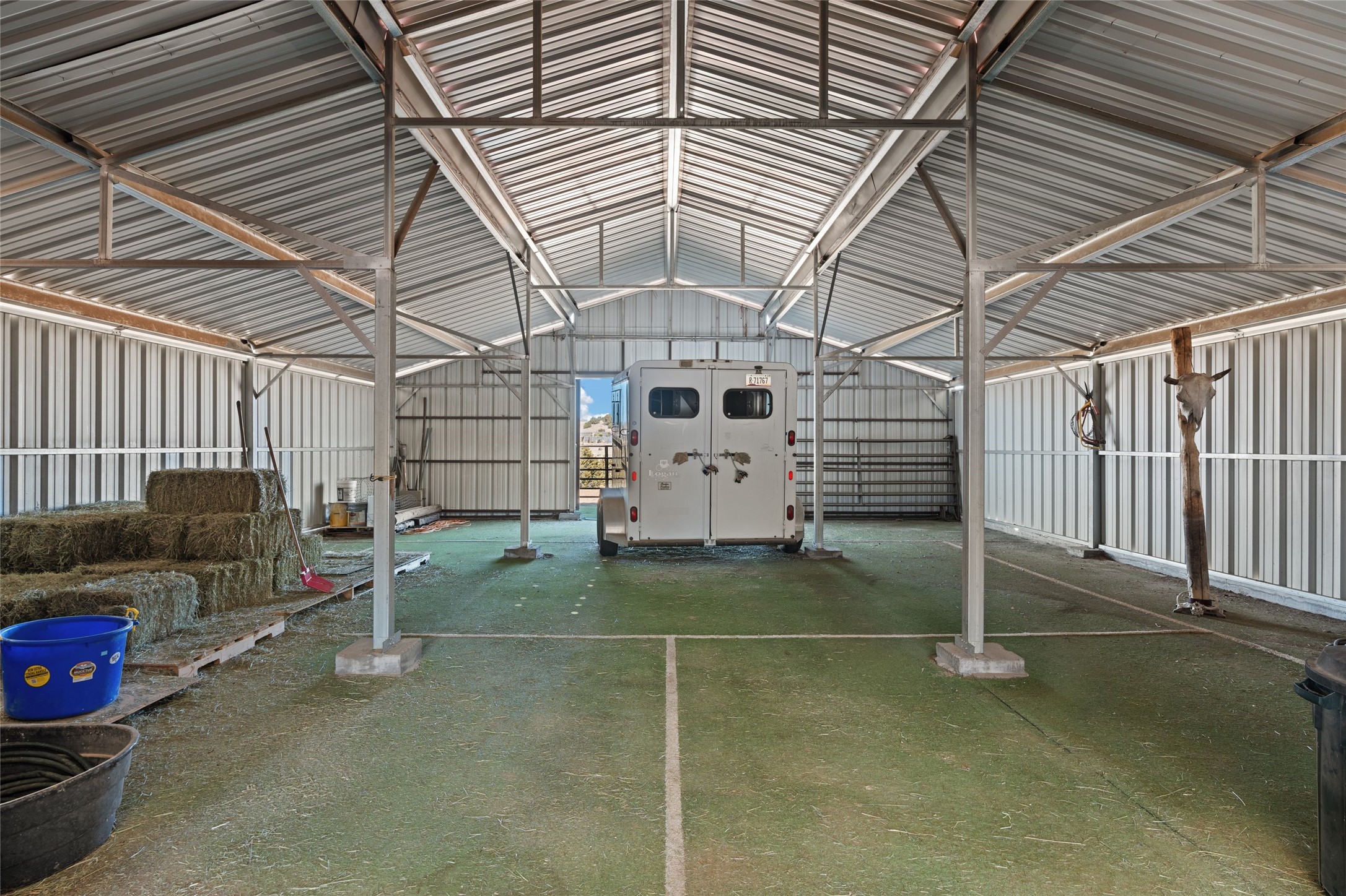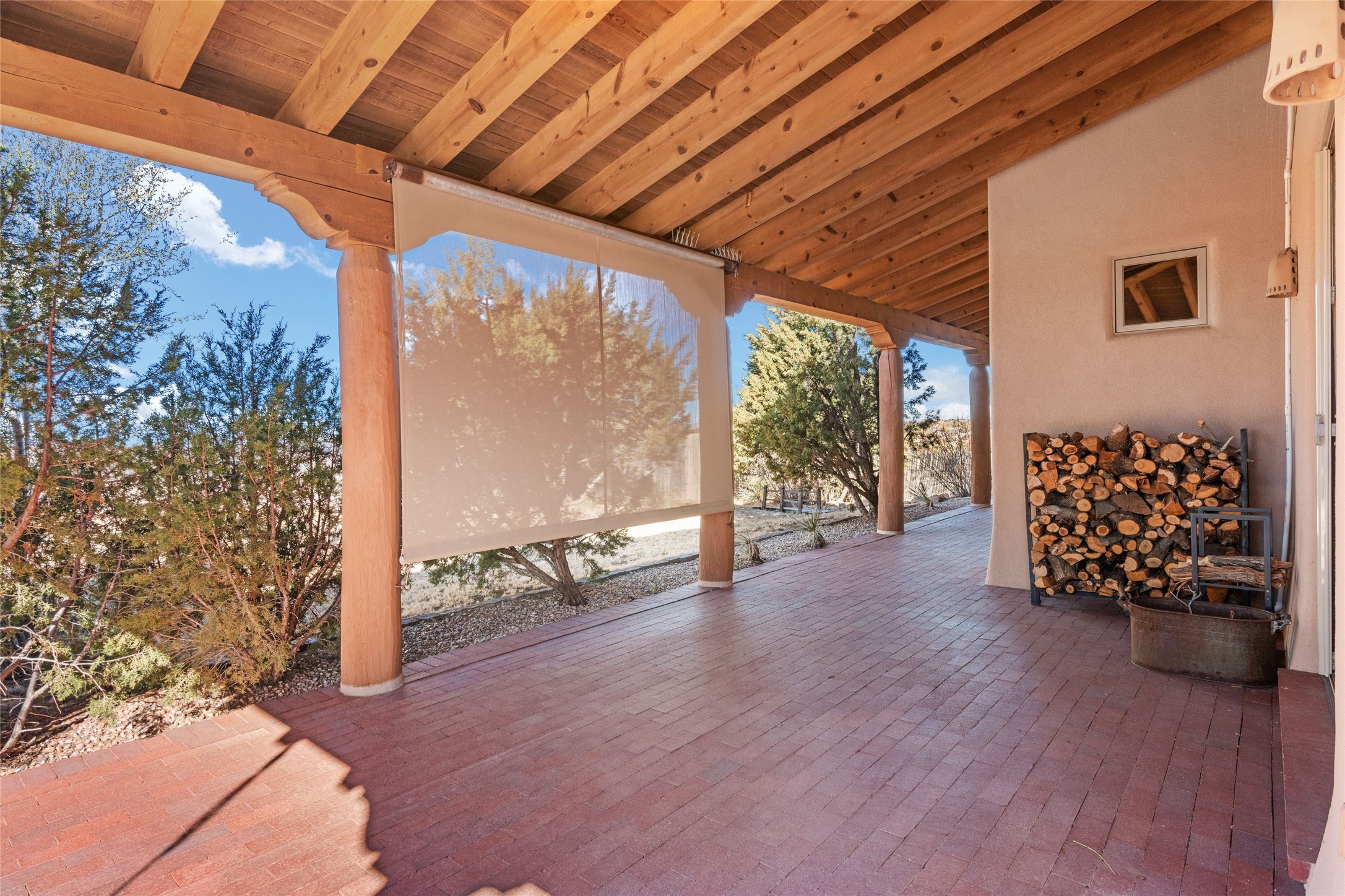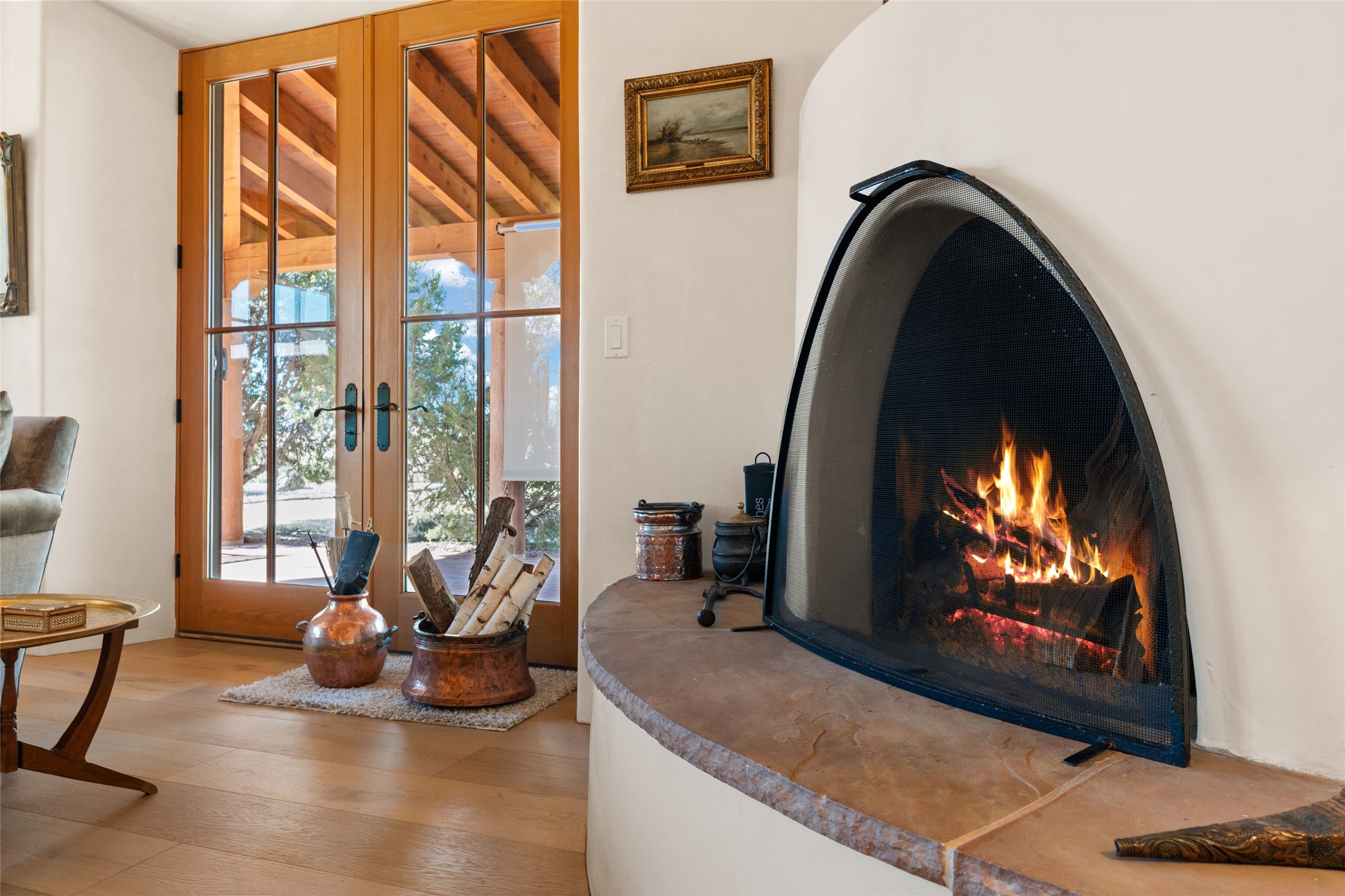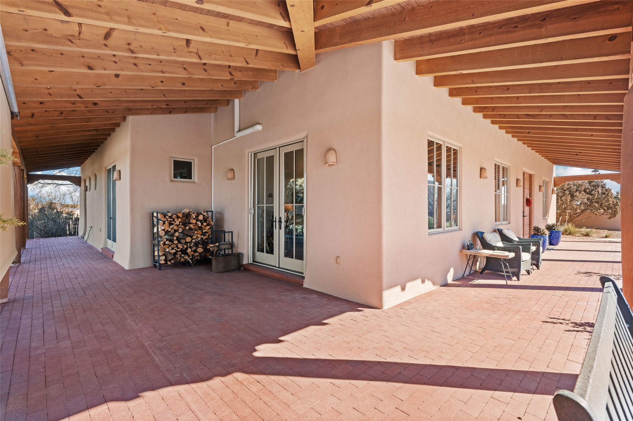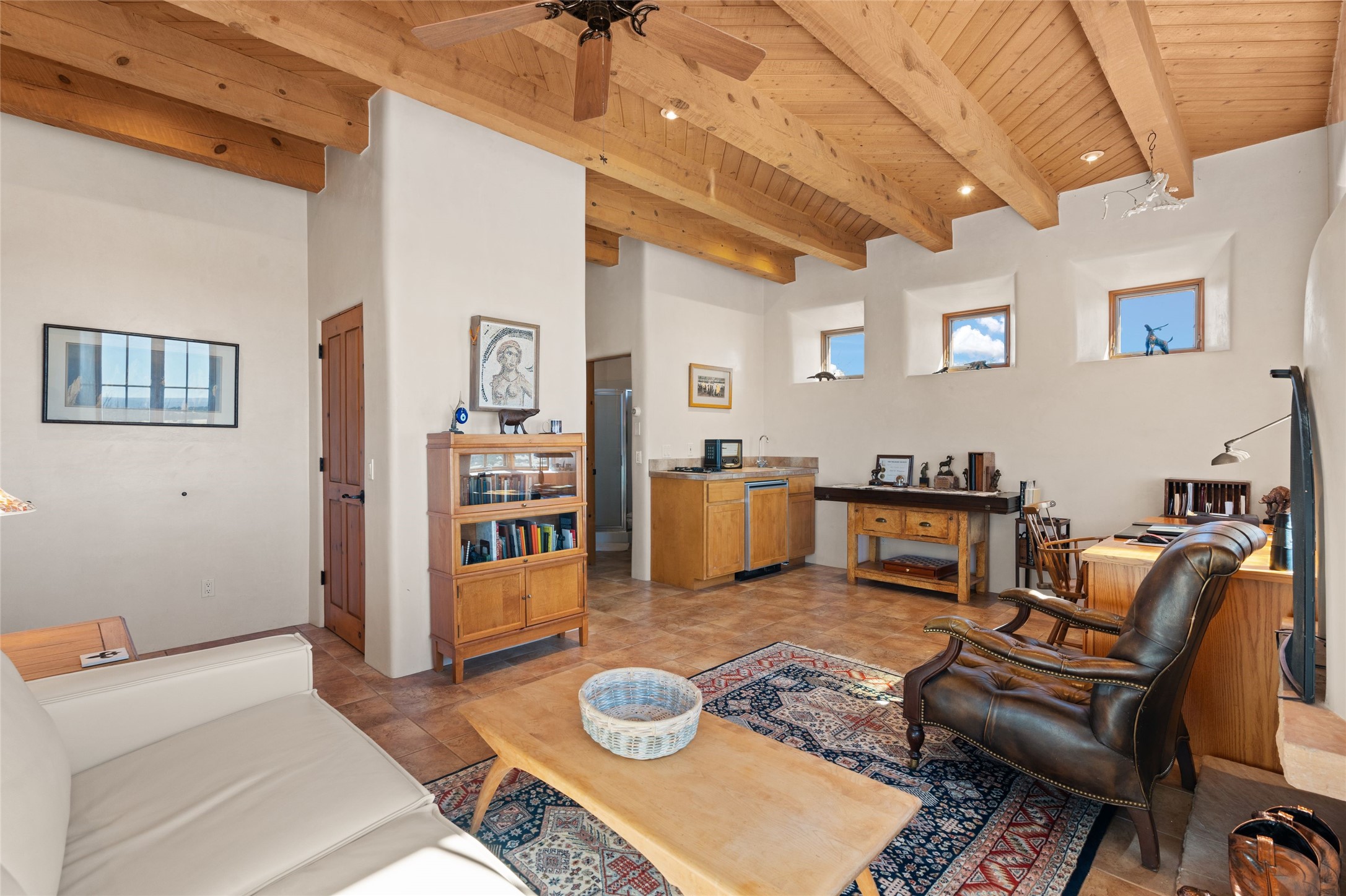 The best horse property in Santa Fe- with panoramic views! A rare find, this pristine equestrian ranch spans nearly 20 acres of breathtaking countryside, offering an ideal retreat for both horses and owners. Framed by the majestic Ortiz, Sandia, Jemez, and Sangre de Cristo mountains, the property provides a serene yet convenient location just 15 minutes from Santa Fe and I-25. Designed and built by renowned builder Will Prull, the custom Pueblo Hacienda welcomes you through a beautifully landscaped front courtyard and a wraparound portal. Inside, a spacious entry foyer opens to an inviting living area with a kiva fireplace, seamlessly connecting to the formal dining room. The well-appointed cook's kitchen, complete with a butler's pantry, offers easy access to a charming interior patio, perfect for indoor-outdoor living. Two guest bedrooms, each with built-in shelving and access to a covered portal, share a luxurious bath--one featuring a sleek fireplace. The private primary suite, has a cozy fireplace and a balcony offering breathtaking views of the estate and surrounding mountains. A beautifully designed one-bedroom guest house complements the main residence, featuring an open-concept living area, kitchenette, and fireplace, all finished to the same high standards. Equestrian enthusiasts will appreciate the immaculate five-stall barn with turnouts, a tack room, and space to expand with an additional five stalls. The barn accommodates up to 600 bales of hay, while a secure 5-foot, non-climb horse safety wire fence encloses the entire property, allowing horses free access. A private 3-acre-foot well, 1120 feet deep, delivers an ample 20 gpm water supply. This extraordinary estate seamlessly blends luxury, tranquility, and equestrian excellence, all within close reach of Santa Fe's vibrant cultural and recreational offerings.