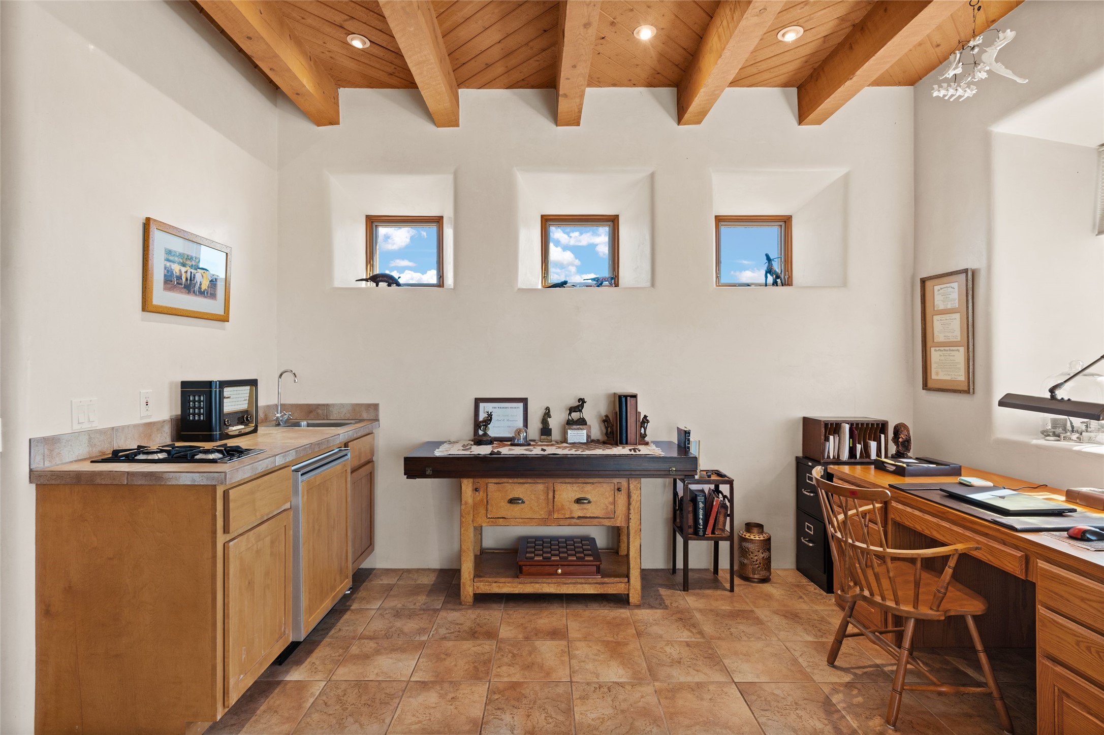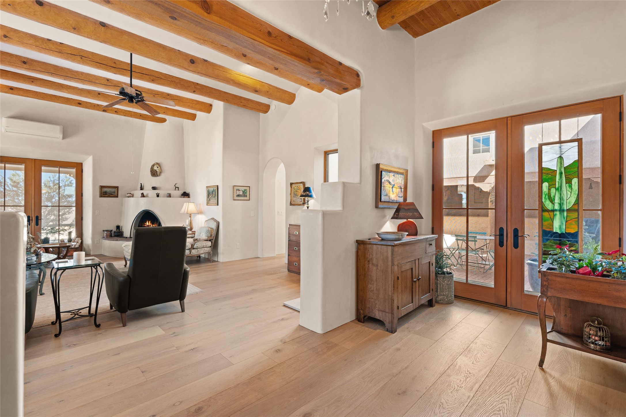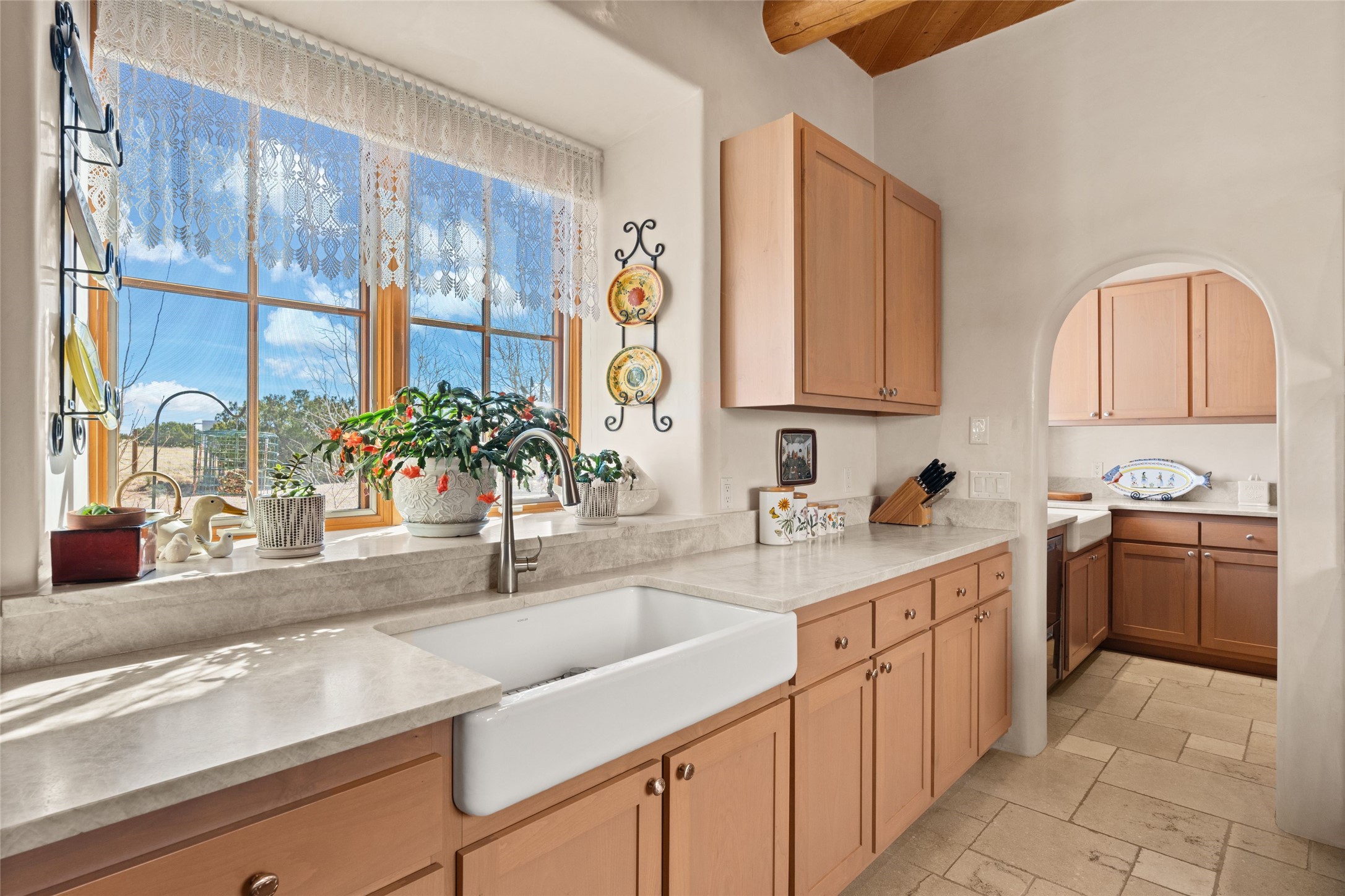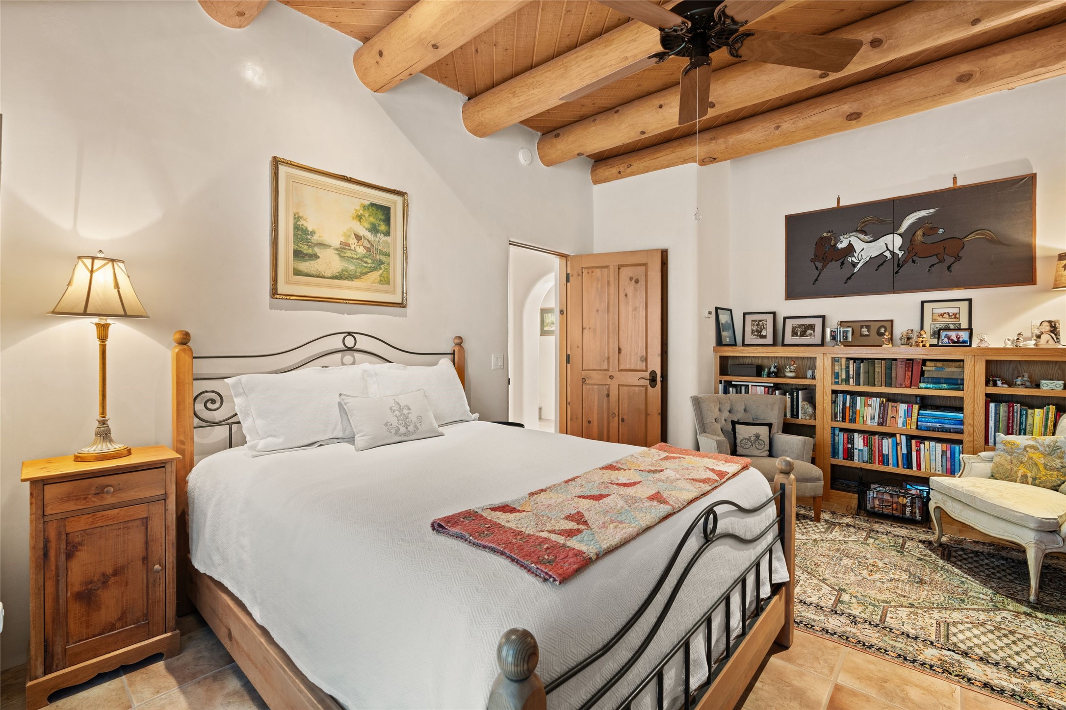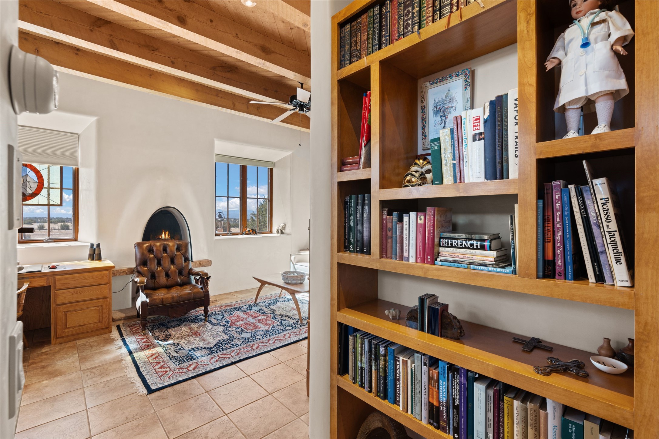 The best horse property in Santa Fe- with panoramic views! A rare find, this pristine equestrian ranch spans nearly 20 acres of breathtaking countryside, offering an ideal retreat for both horses and owners. Framed by the majestic Ortiz, Sandia, Jemez, and Sangre de Cristo mountains, the property provides a serene yet convenient location just 15 minutes from Santa Fe and I-25. Designed and built by renowned builder Will Prull, the custom Pueblo Hacienda welcomes you through a beautifully landscaped front courtyard and a wraparound portal. Inside, a spacious entry foyer opens to an inviting living area with a kiva fireplace, seamlessly connecting to the formal dining room. The well-appointed cook's kitchen, complete with a butler's pantry, offers easy access to a charming interior patio, perfect for indoor-outdoor living. Two guest bedrooms, each with built-in shelving and access to a covered portal, share a luxurious bath--one featuring a sleek fireplace. The private primary suite, has a cozy fireplace and a balcony offering breathtaking views of the estate and surrounding mountains. A beautifully designed one-bedroom guest house complements the main residence, featuring an open-concept living area, kitchenette, and fireplace, all finished to the same high standards. Equestrian enthusiasts will appreciate the immaculate five-stall barn with turnouts, a tack room, and space to expand with an additional five stalls. The barn accommodates up to 600 bales of hay, while a secure 5-foot, non-climb horse safety wire fence encloses the entire property, allowing horses free access. A private 3-acre-foot well, 1120 feet deep, delivers an ample 20 gpm water supply. This extraordinary estate seamlessly blends luxury, tranquility, and equestrian excellence, all within close reach of Santa Fe's vibrant cultural and recreational offerings.