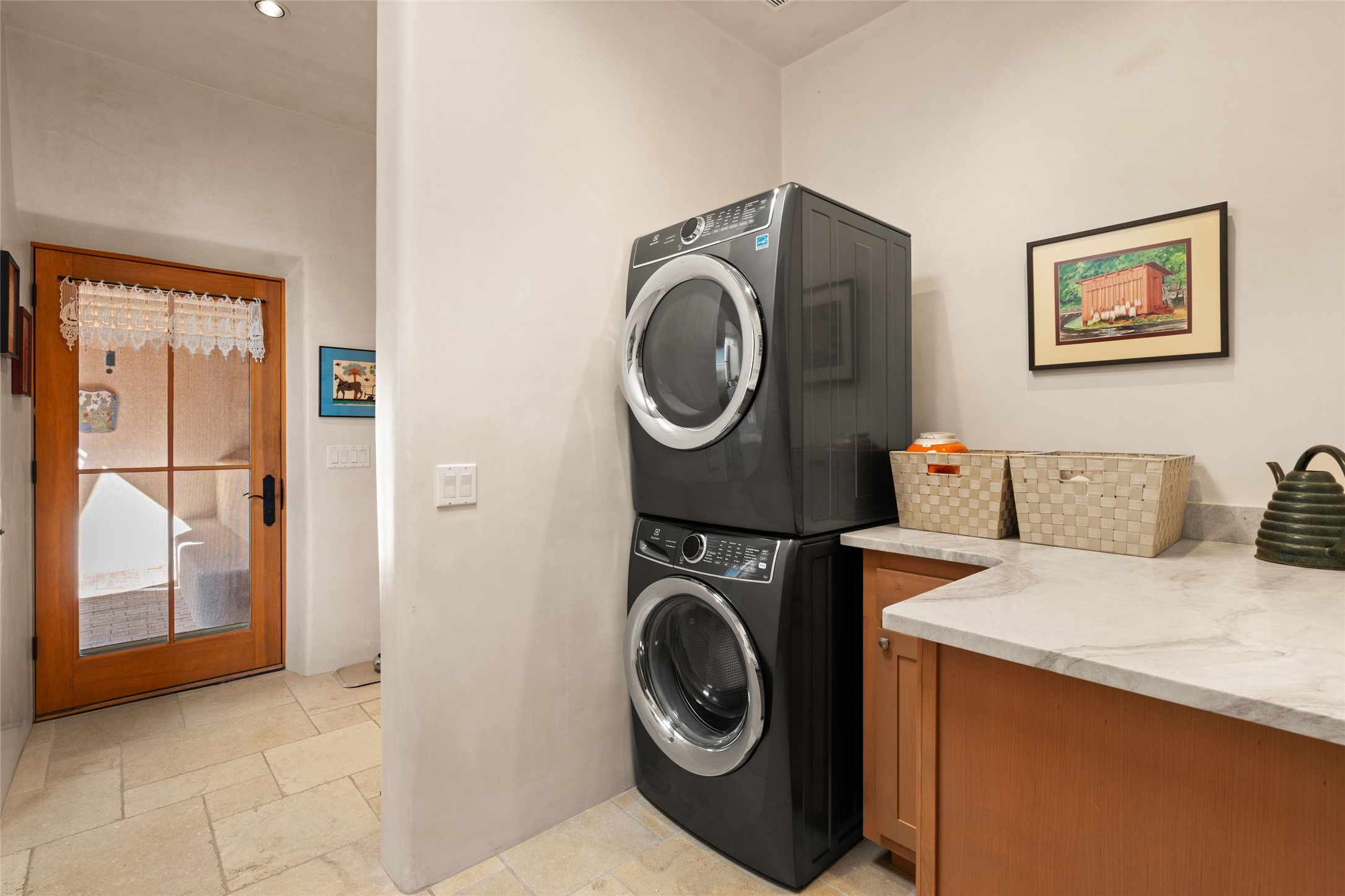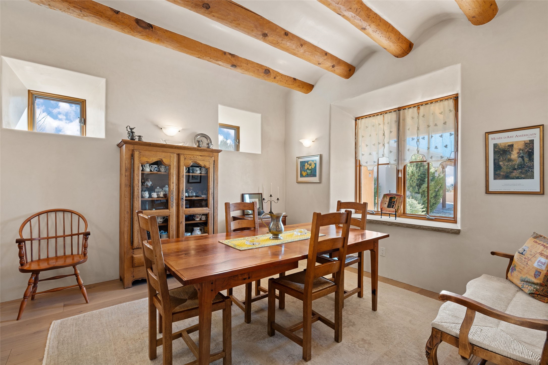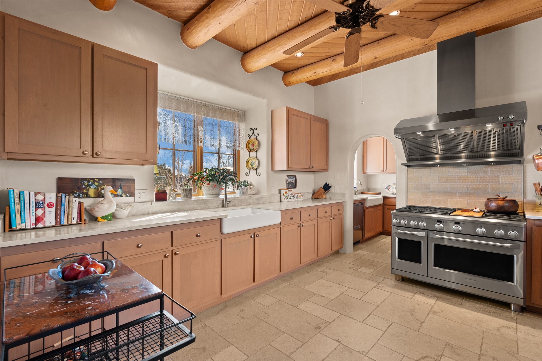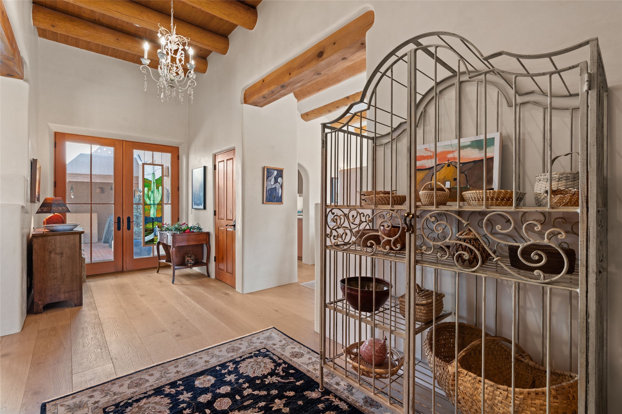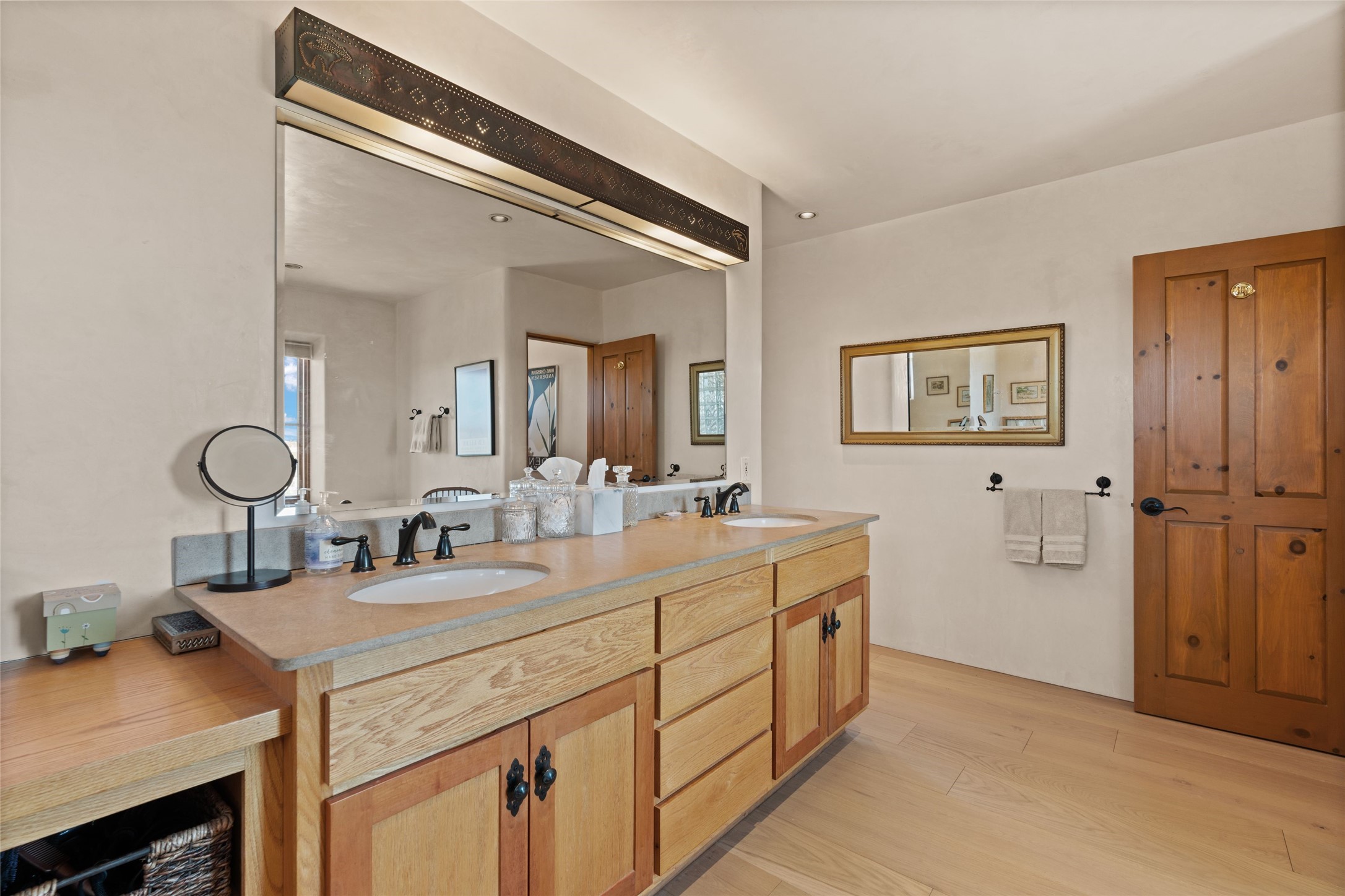 The best horse property in Santa Fe- with panoramic views! A rare find, this pristine equestrian ranch spans nearly 20 acres of breathtaking countryside, offering an ideal retreat for both horses and owners. Framed by the majestic Ortiz, Sandia, Jemez, and Sangre de Cristo mountains, the property provides a serene yet convenient location just 15 minutes from Santa Fe and I-25. Designed and built by renowned builder Will Prull, the custom Pueblo Hacienda welcomes you through a beautifully landscaped front courtyard and a wraparound portal. Inside, a spacious entry foyer opens to an inviting living area with a kiva fireplace, seamlessly connecting to the formal dining room. The well-appointed cook's kitchen, complete with a butler's pantry, offers easy access to a charming interior patio, perfect for indoor-outdoor living. Two guest bedrooms, each with built-in shelving and access to a covered portal, share a luxurious bath--one featuring a sleek fireplace. The private primary suite, has a cozy fireplace and a balcony offering breathtaking views of the estate and surrounding mountains. A beautifully designed one-bedroom guest house complements the main residence, featuring an open-concept living area, kitchenette, and fireplace, all finished to the same high standards. Equestrian enthusiasts will appreciate the immaculate five-stall barn with turnouts, a tack room, and space to expand with an additional five stalls. The barn accommodates up to 600 bales of hay, while a secure 5-foot, non-climb horse safety wire fence encloses the entire property, allowing horses free access. A private 3-acre-foot well, 1120 feet deep, delivers an ample 20 gpm water supply. This extraordinary estate seamlessly blends luxury, tranquility, and equestrian excellence, all within close reach of Santa Fe's vibrant cultural and recreational offerings.