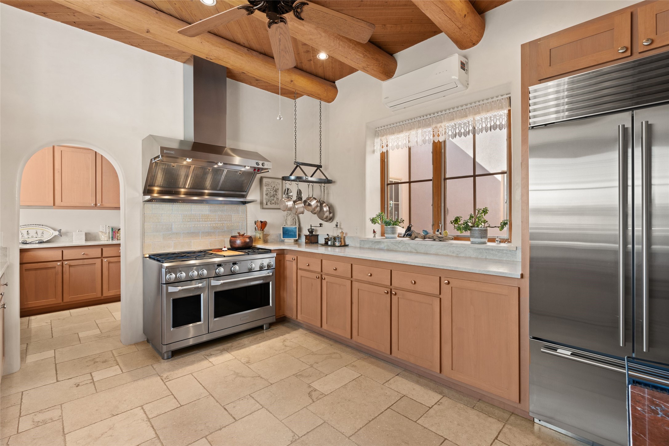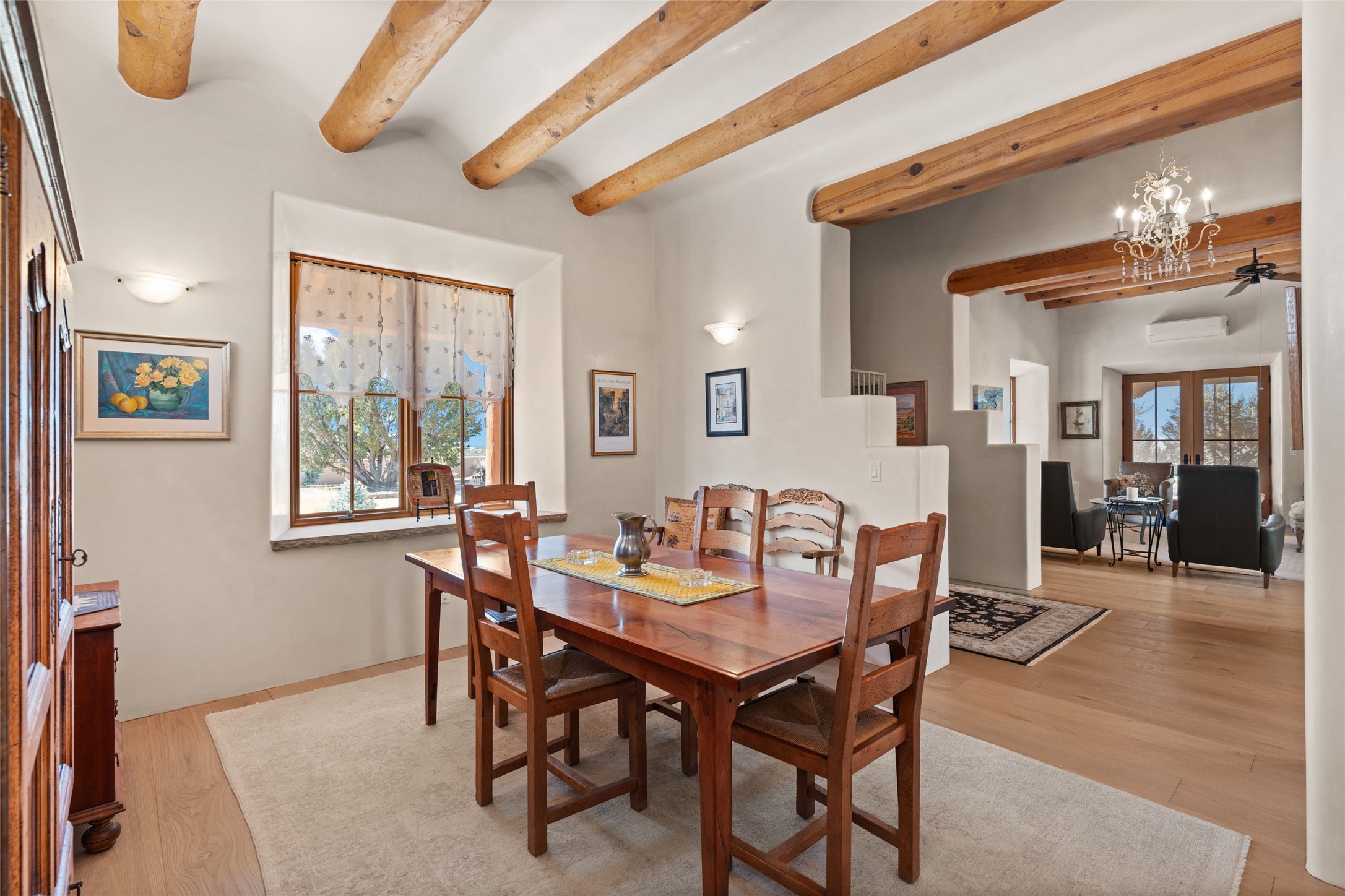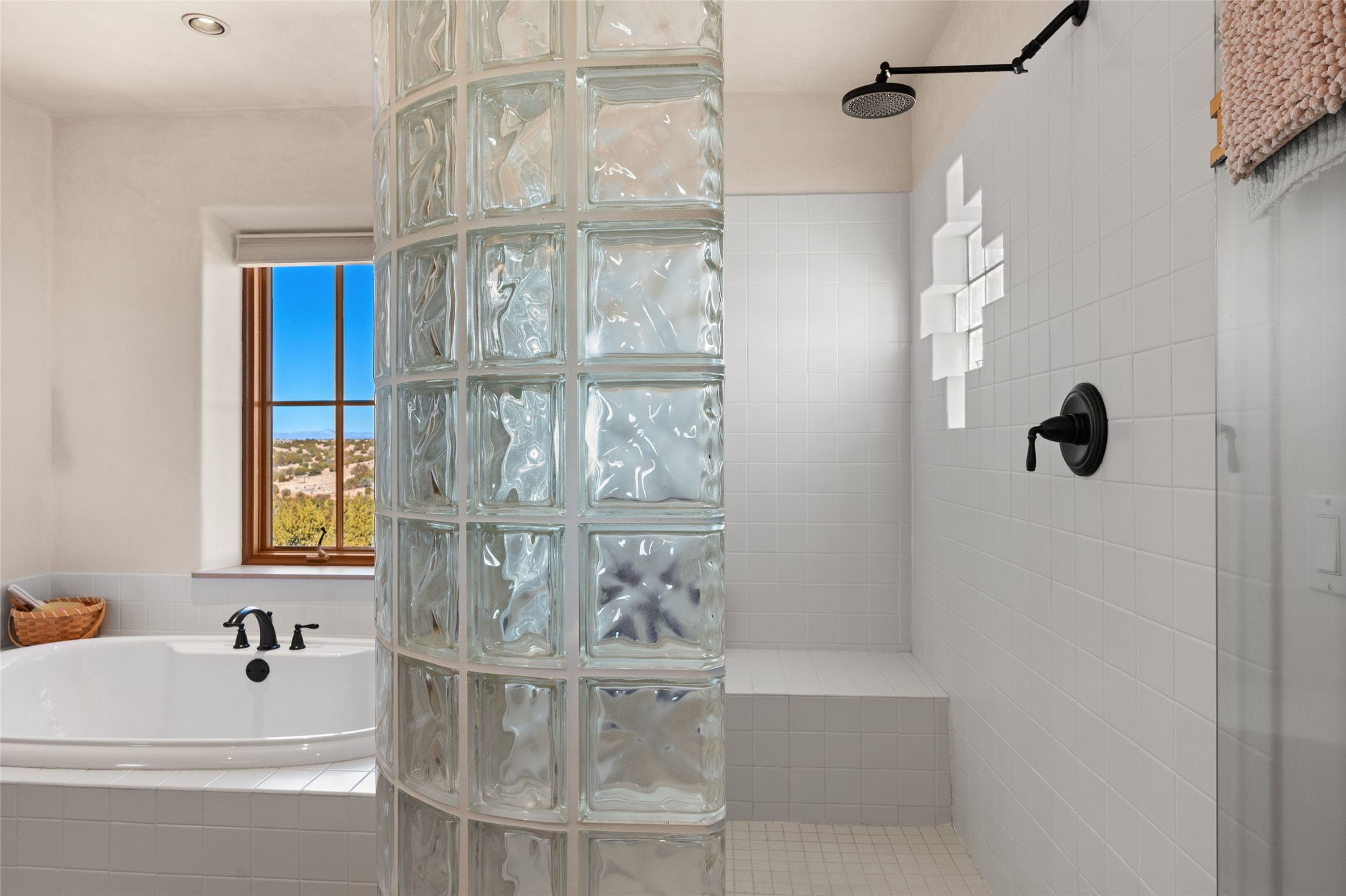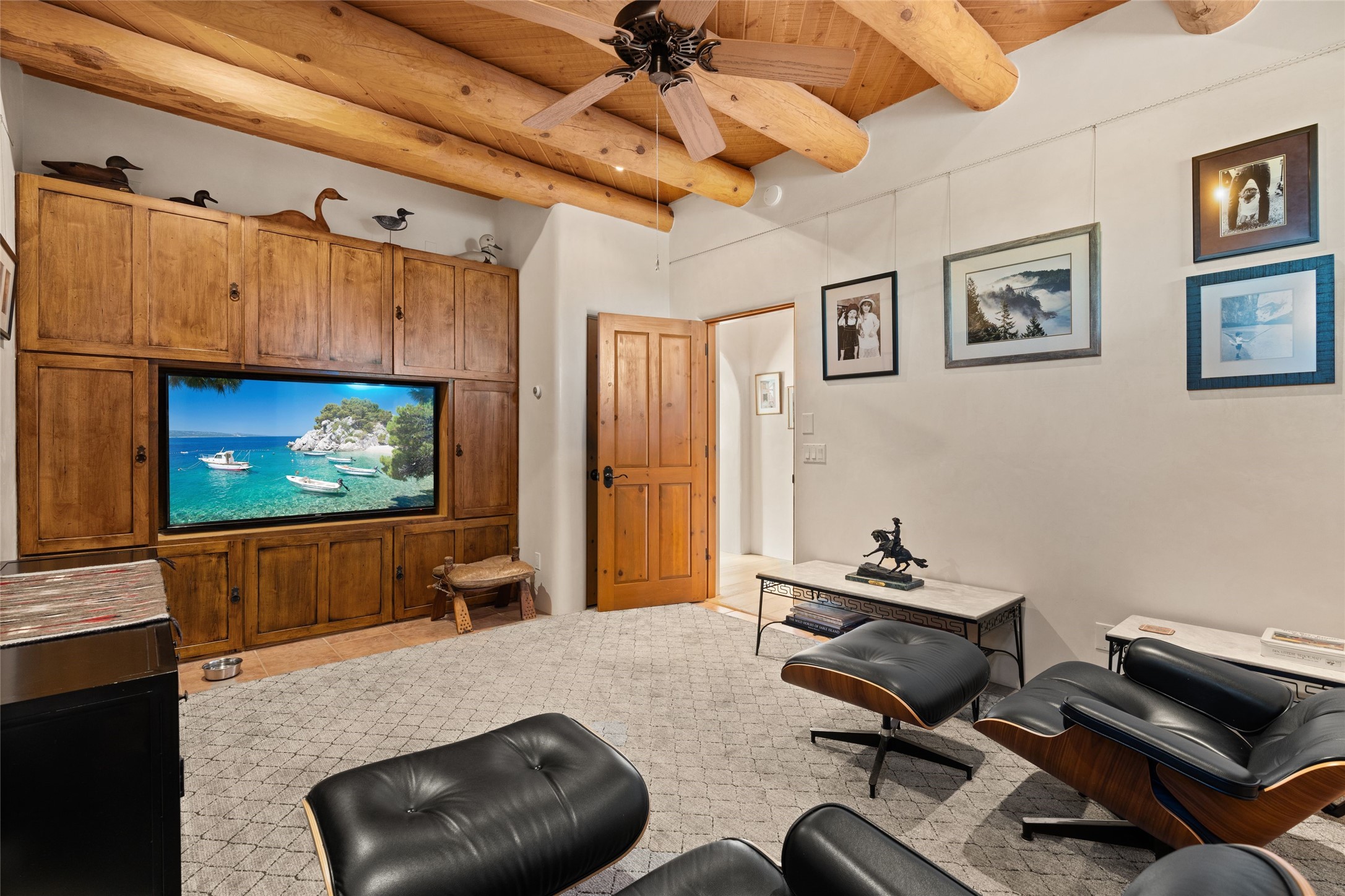 The best horse property in Santa Fe- with panoramic views! A rare find, this pristine equestrian ranch spans nearly 20 acres of breathtaking countryside, offering an ideal retreat for both horses and owners. Framed by the majestic Ortiz, Sandia, Jemez, and Sangre de Cristo mountains, the property provides a serene yet convenient location just 15 minutes from Santa Fe and I-25. Designed and built by renowned builder Will Prull, the custom Pueblo Hacienda welcomes you through a beautifully landscaped front courtyard and a wraparound portal. Inside, a spacious entry foyer opens to an inviting living area with a kiva fireplace, seamlessly connecting to the formal dining room. The well-appointed cook's kitchen, complete with a butler's pantry, offers easy access to a charming interior patio, perfect for indoor-outdoor living. Two guest bedrooms, each with built-in shelving and access to a covered portal, share a luxurious bath--one featuring a sleek fireplace. The private primary suite, has a cozy fireplace and a balcony offering breathtaking views of the estate and surrounding mountains. A beautifully designed one-bedroom guest house complements the main residence, featuring an open-concept living area, kitchenette, and fireplace, all finished to the same high standards. Equestrian enthusiasts will appreciate the immaculate five-stall barn with turnouts, a tack room, and space to expand with an additional five stalls. The barn accommodates up to 600 bales of hay, while a secure 5-foot, non-climb horse safety wire fence encloses the entire property, allowing horses free access. A private 3-acre-foot well, 1120 feet deep, delivers an ample 20 gpm water supply. This extraordinary estate seamlessly blends luxury, tranquility, and equestrian excellence, all within close reach of Santa Fe's vibrant cultural and recreational offerings.