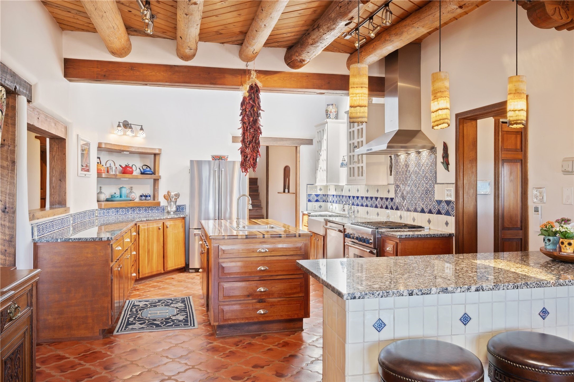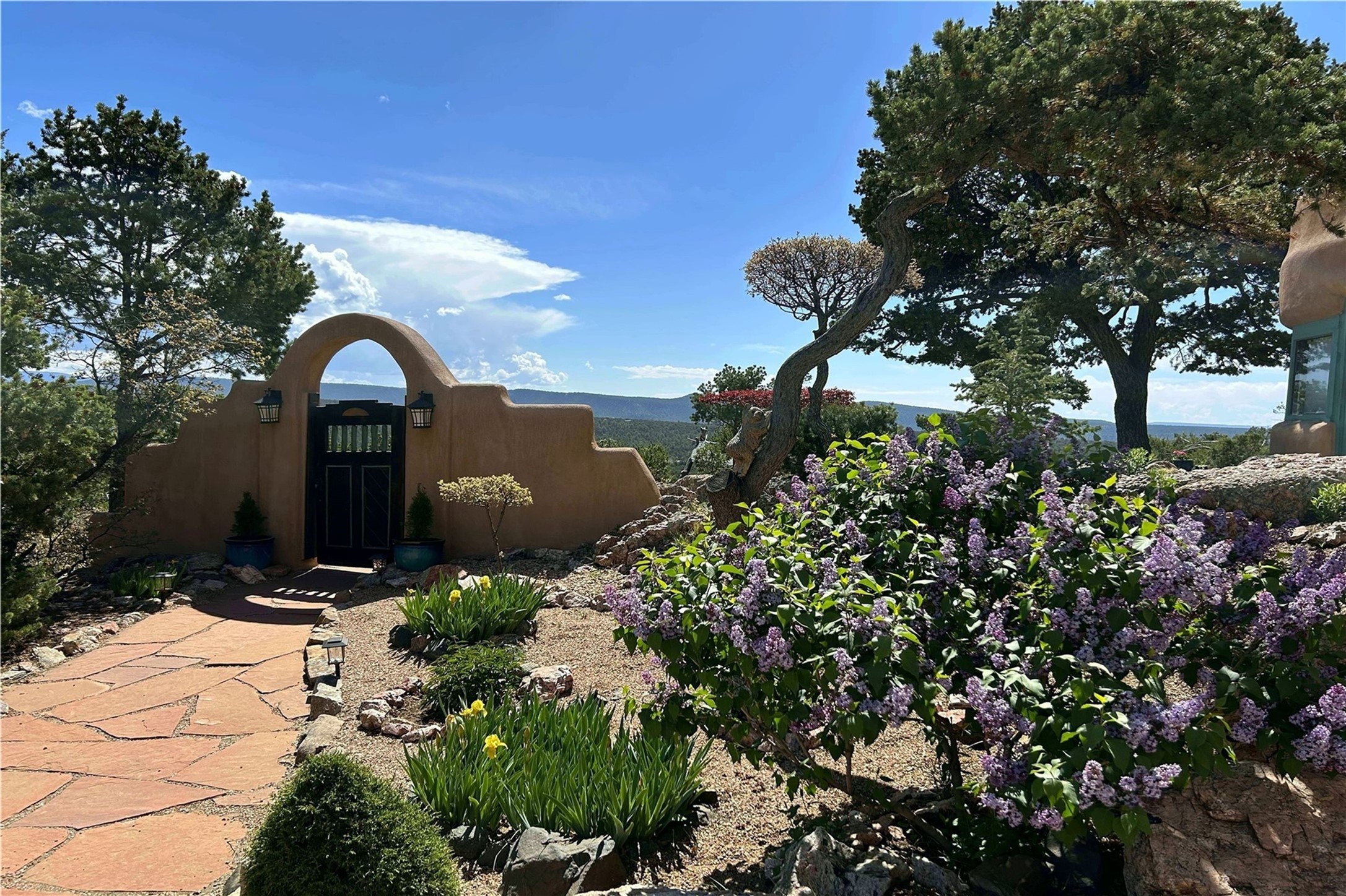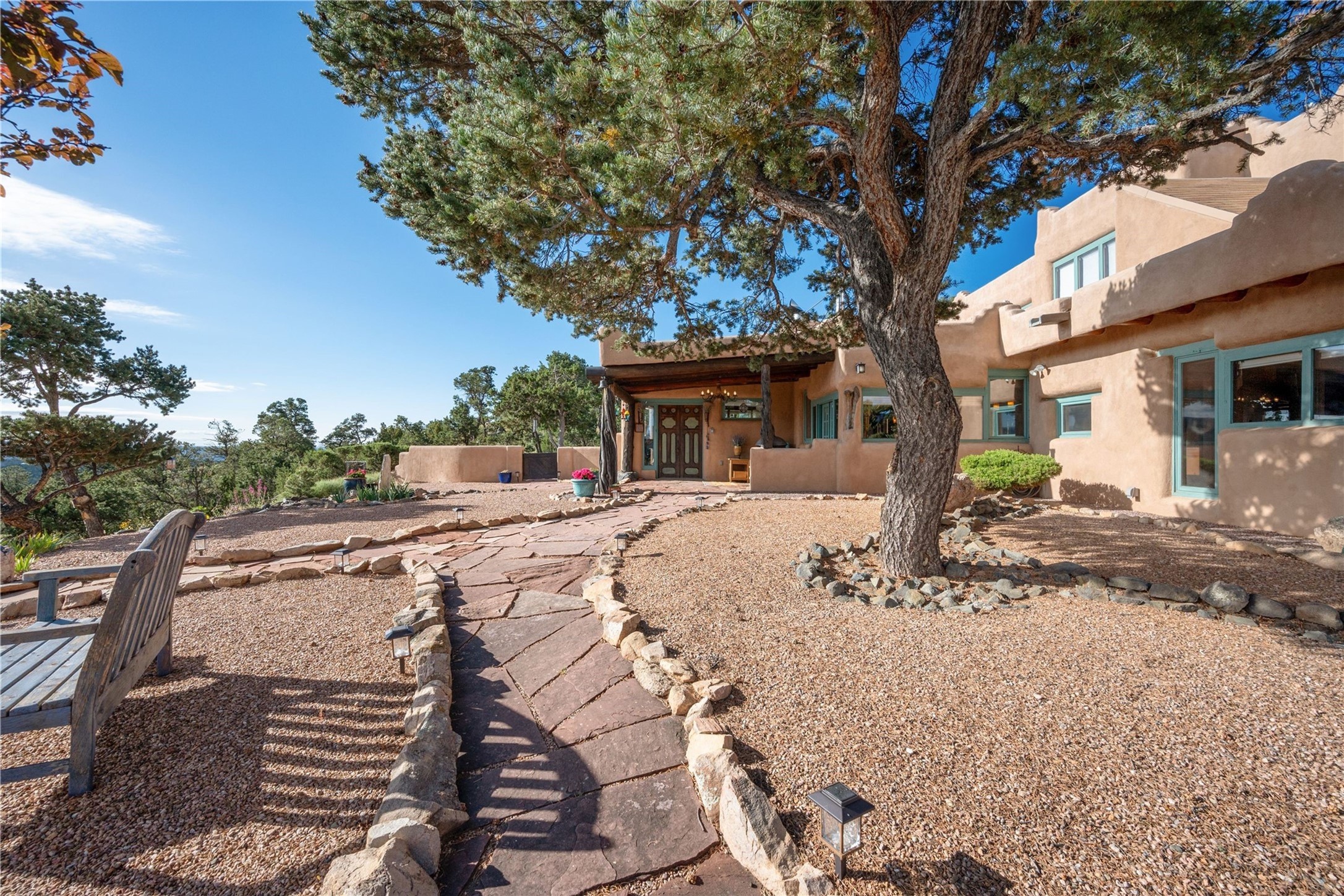 Discover a rare one-of-a-kind Hacienda w/ Studio on 6+ acres boasting dramatic rock outcroppings, sweeping views of Apache Ridge, Rowe Mesa and the Sangre de Cristos in a private pristine setting, just 20 minutes from the Santa Fe Plaza. Perched on a hillside to capture the breathtaking surroundings, this custom-built adobe Pueblo-style gem offers incredible craftsmanship, rounded architecture and unparalleled custom artisan touches. Soaring ceilings w/massive wood vigas throughout, exquisite Saltillo tile, cherry, hardwood and brick floors, rounded art walls curved arches, heavy antique carved doors, a walnut staircase, built-in bancos, recessed nichos, multiple portals and skylights abound. The current owners have thoughtfully renovated the house to add a sense of grand luxury. An added 2-car garage w/custom cabinetry includes an attached studio w/private entry. Follow the path to a small hobbit house-like hideaway to enjoy the exhilarating mountain air and views. Another path leads to a 2-3 stall barn/workshop.The floorplan moves effortlessly between indoor and outdoor living to showcase the arresting views and superb landscaping. The primary suite boasts a private deck, adjoiningsitting room w/curved window walls, custom closets, one cedar lined, a spa-like bath w/giant jetted soaking tub and private courtyard. The kitchen highlights rich cherryvcabinetry, wood-burning stove and opens to a spacious dining room w/patio. Rounded architecture flows seamlessly into the living room w/panoramic bays of passive-solar windows, bancos, a large Kiva wood-burning fireplace, and main portal access.Other spaces include an office, spacious media/family room, two additional bedrooms, one w/private entry and patio, a mudroom, plus a versatile flex room, ideal for an overflowbedroom. This home is truly an architectural wonder to experience. With its incredible craftsmanship, artisan details and never-ending vistas, 8 Hampton Road marries luxury w/privacy and historic charm.