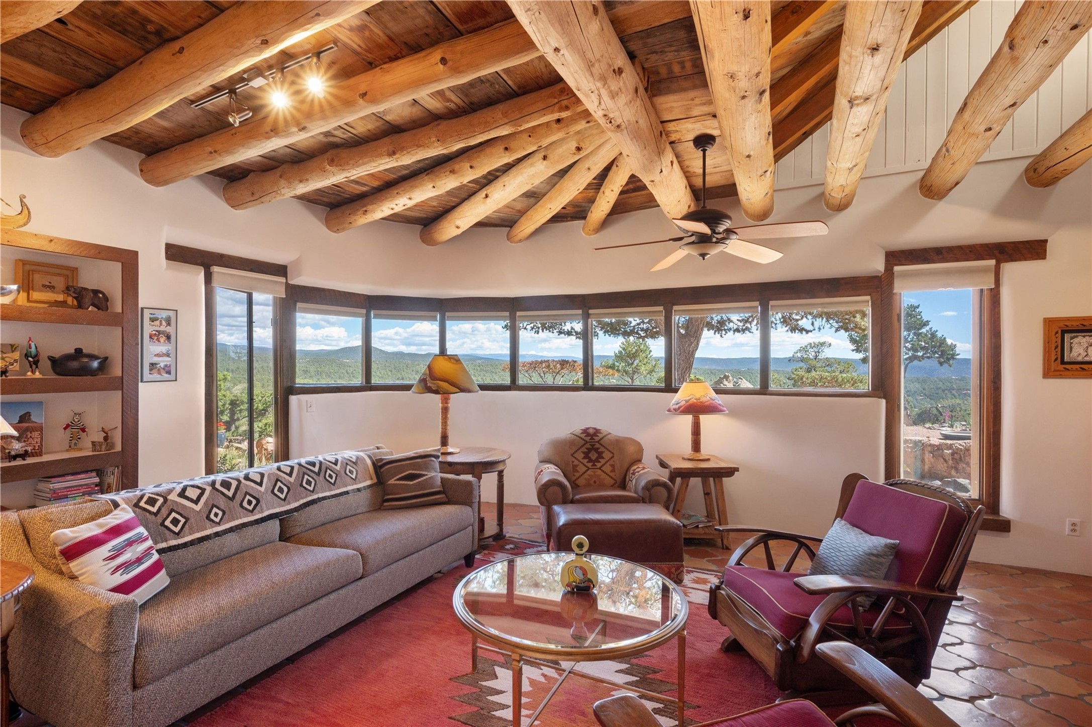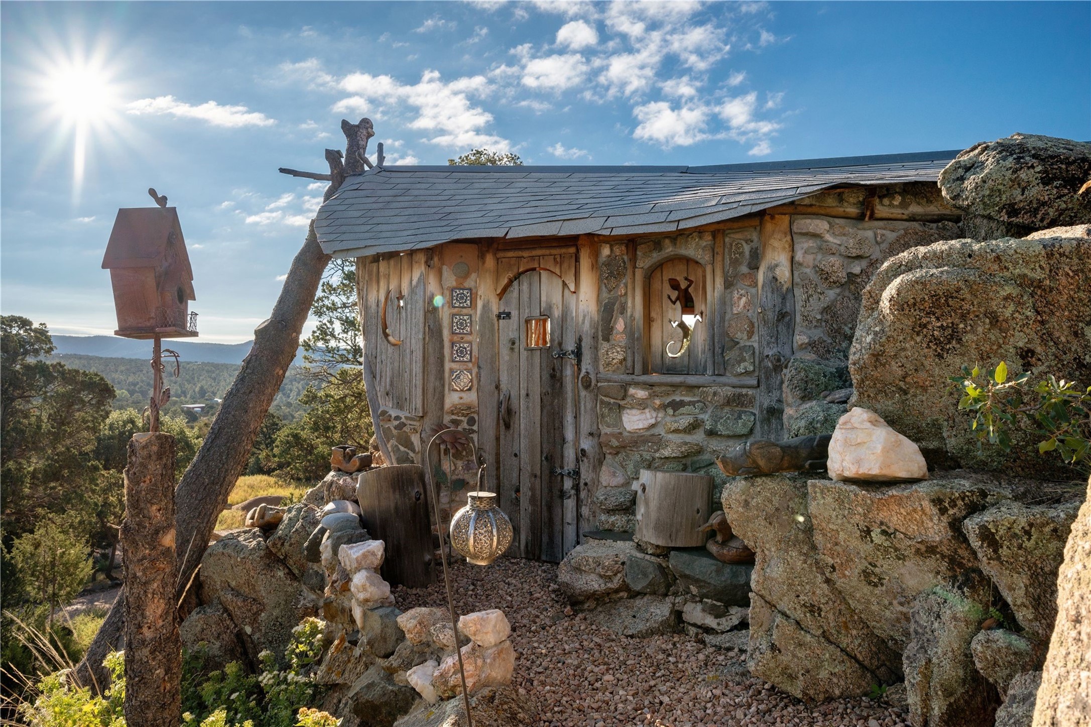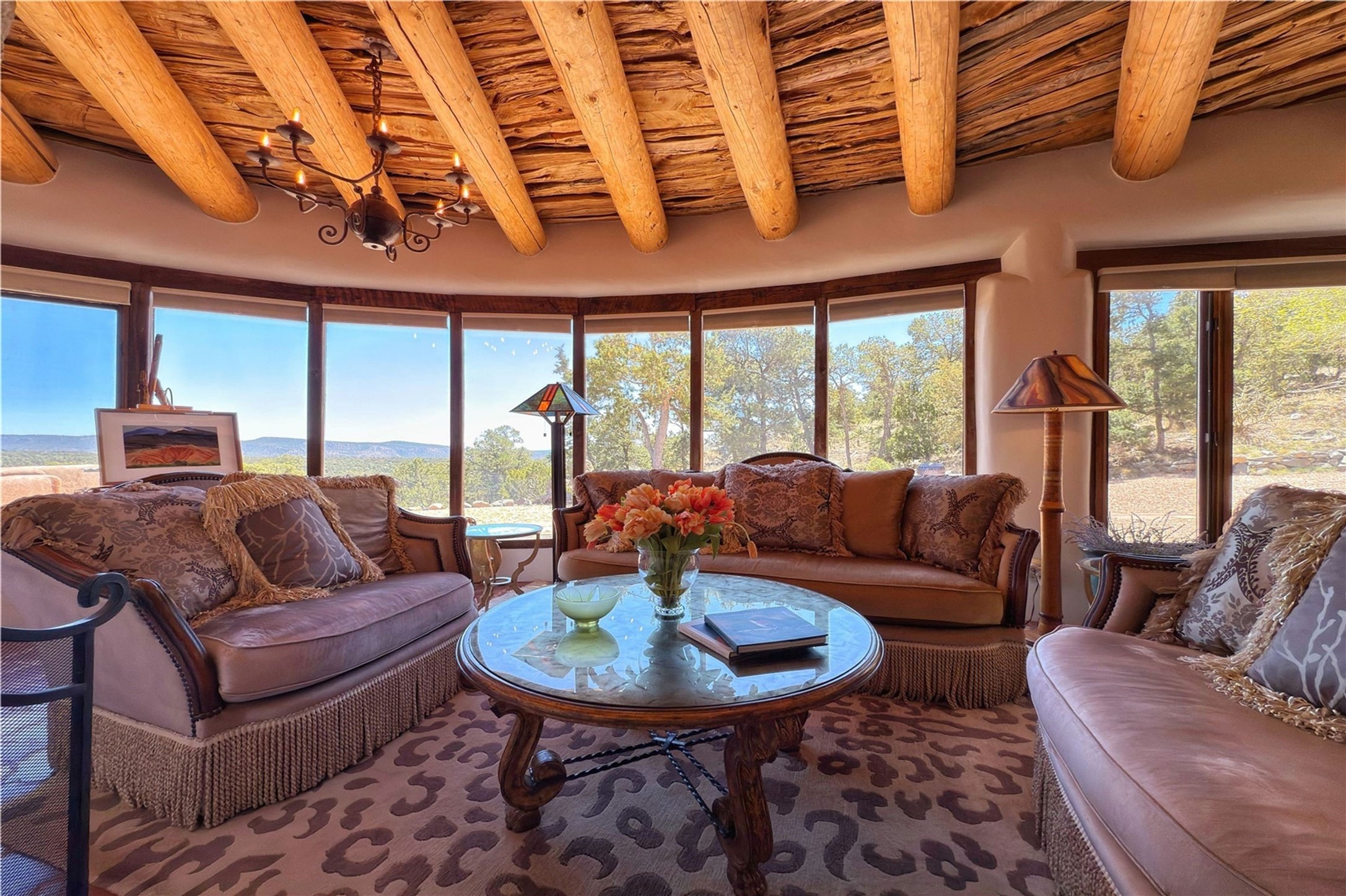 Discover a rare one-of-a-kind Hacienda w/ Studio on 6+ acres boasting dramatic rock outcroppings, sweeping views of Apache Ridge, Rowe Mesa and the Sangre de Cristos in a private pristine setting, just 20 minutes from the Santa Fe Plaza. Perched on a hillside to capture the breathtaking surroundings, this custom-built adobe Pueblo-style gem offers incredible craftsmanship, rounded architecture and unparalleled custom artisan touches. Soaring ceilings w/massive wood vigas throughout, exquisite Saltillo tile, cherry, hardwood and brick floors, rounded art walls curved arches, heavy antique carved doors, a walnut staircase, built-in bancos, recessed nichos, multiple portals and skylights abound. The current owners have thoughtfully renovated the house to add a sense of grand luxury. An added 2-car garage w/custom cabinetry includes an attached studio w/private entry. Follow the path to a small hobbit house-like hideaway to enjoy the exhilarating mountain air and views. Another path leads to a 2-3 stall barn/workshop.The floorplan moves effortlessly between indoor and outdoor living to showcase the arresting views and superb landscaping. The primary suite boasts a private deck, adjoiningsitting room w/curved window walls, custom closets, one cedar lined, a spa-like bath w/giant jetted soaking tub and private courtyard. The kitchen highlights rich cherryvcabinetry, wood-burning stove and opens to a spacious dining room w/patio. Rounded architecture flows seamlessly into the living room w/panoramic bays of passive-solar windows, bancos, a large Kiva wood-burning fireplace, and main portal access.Other spaces include an office, spacious media/family room, two additional bedrooms, one w/private entry and patio, a mudroom, plus a versatile flex room, ideal for an overflowbedroom. This home is truly an architectural wonder to experience. With its incredible craftsmanship, artisan details and never-ending vistas, 8 Hampton Road marries luxury w/privacy and historic charm.