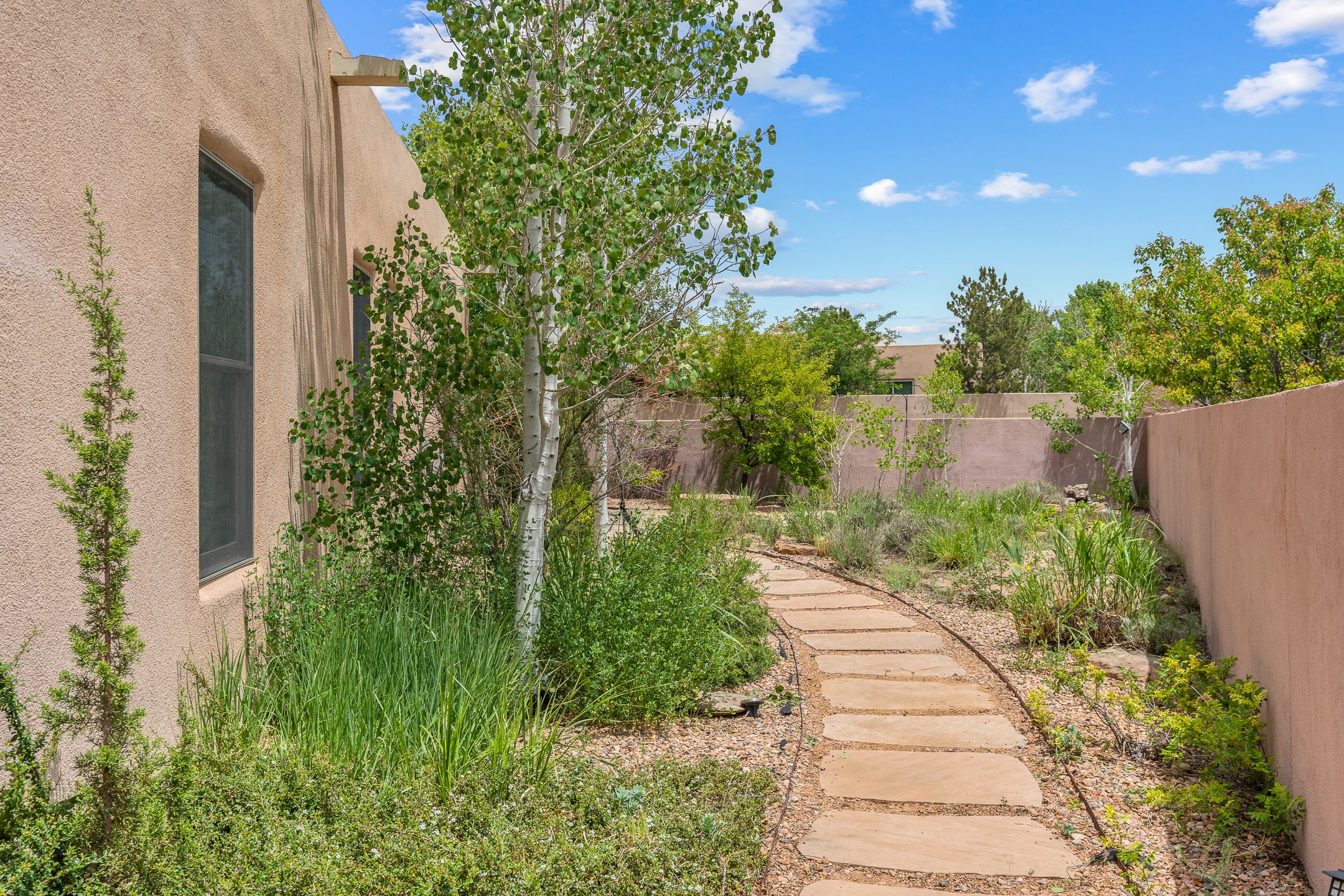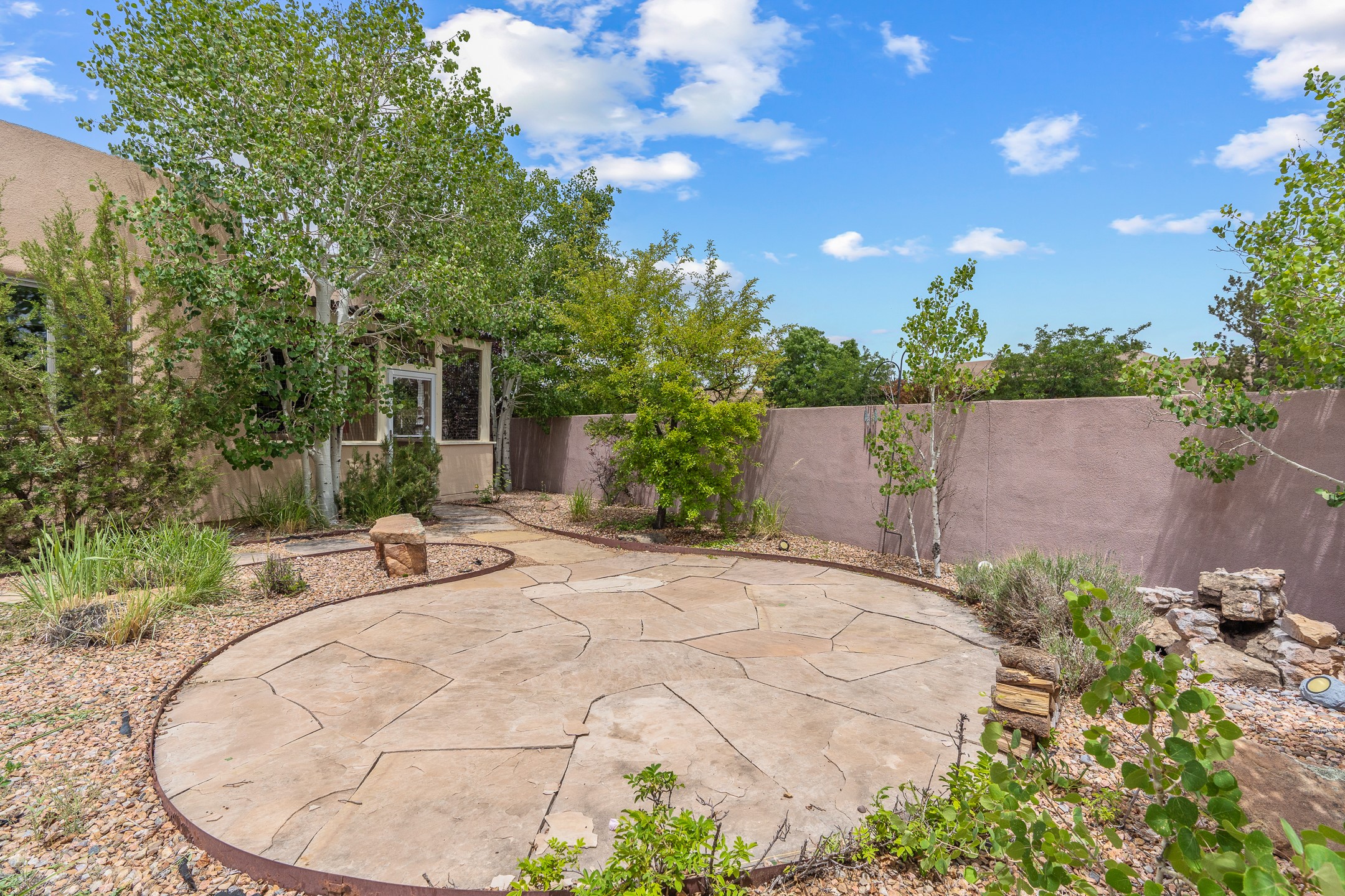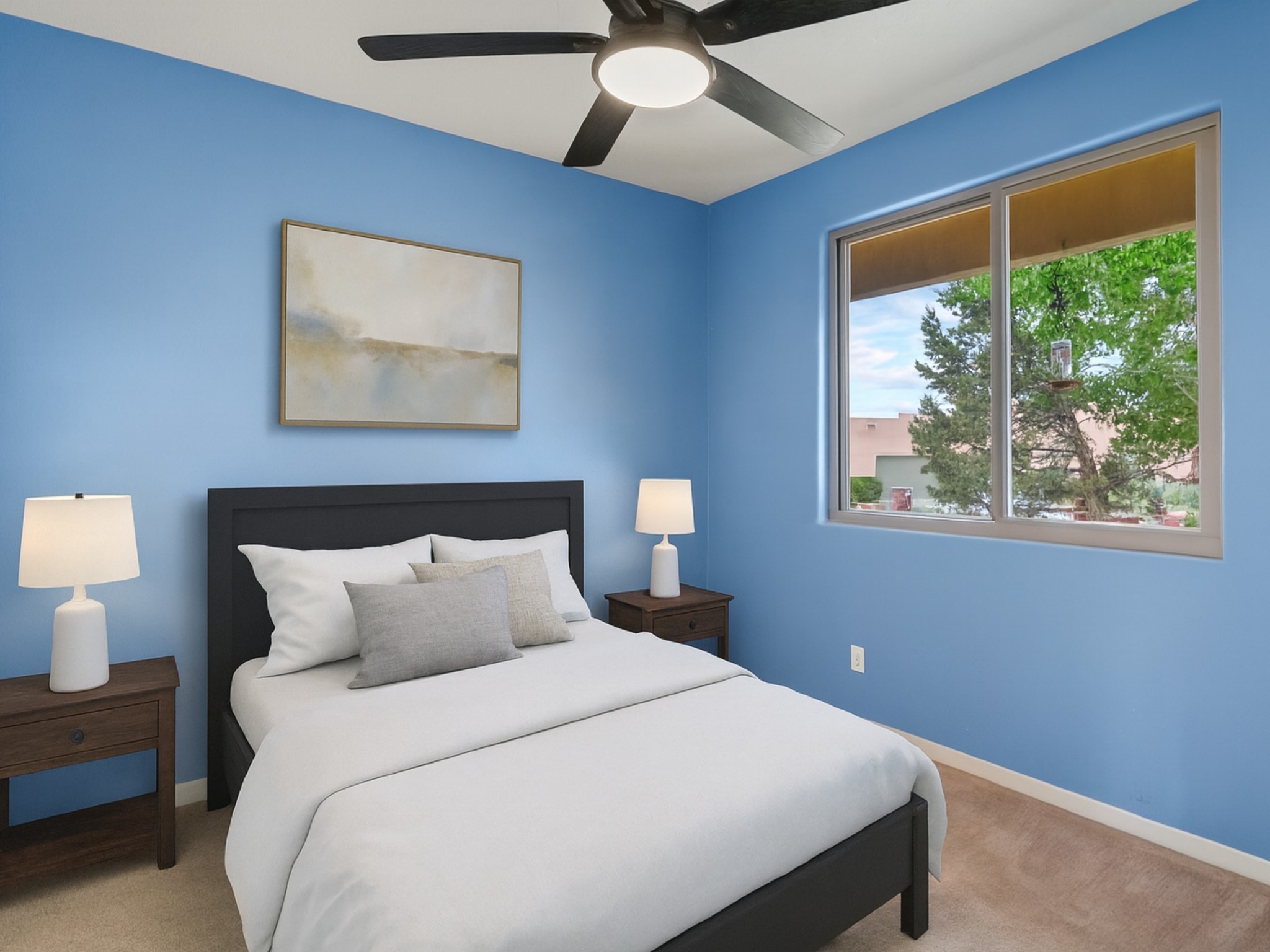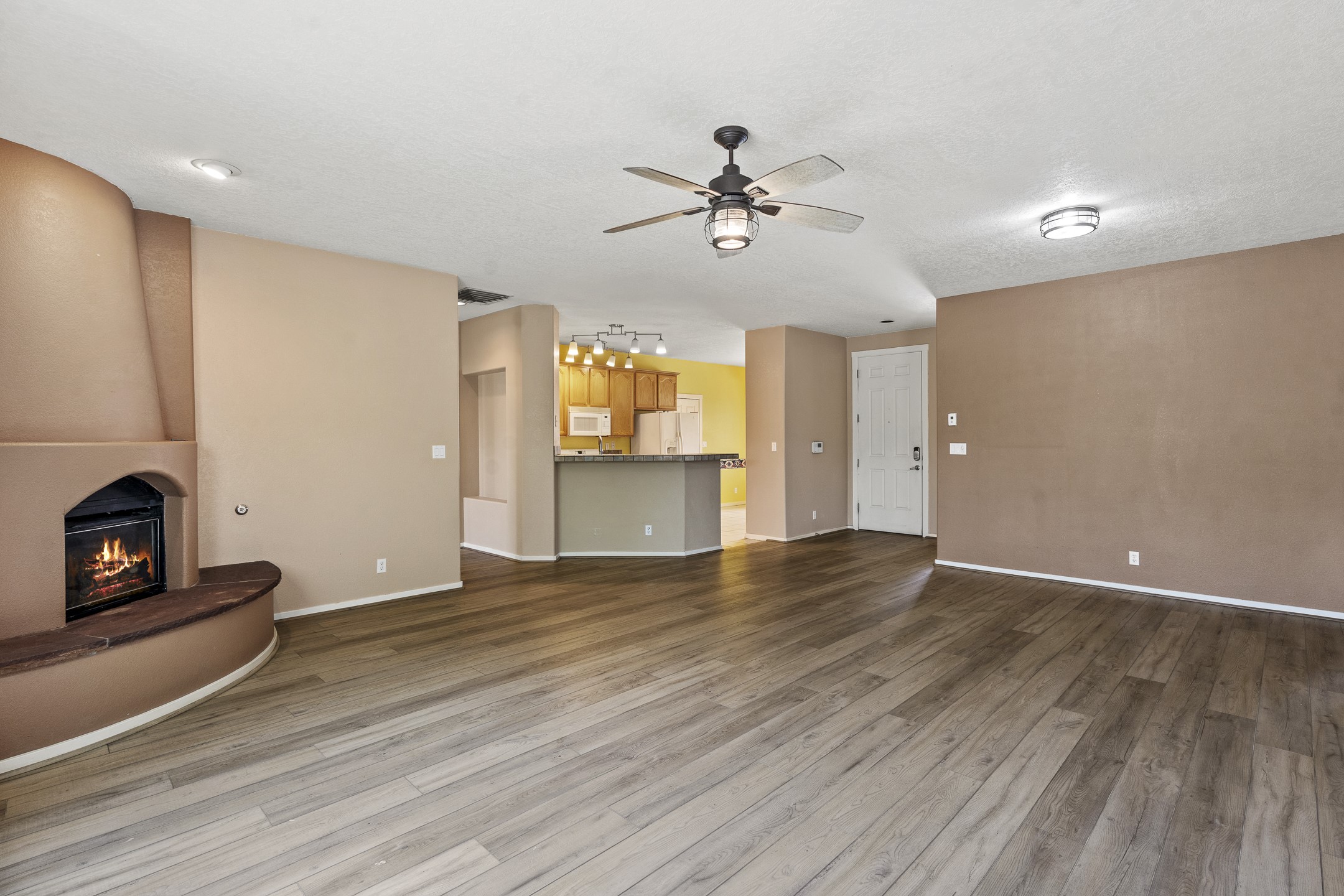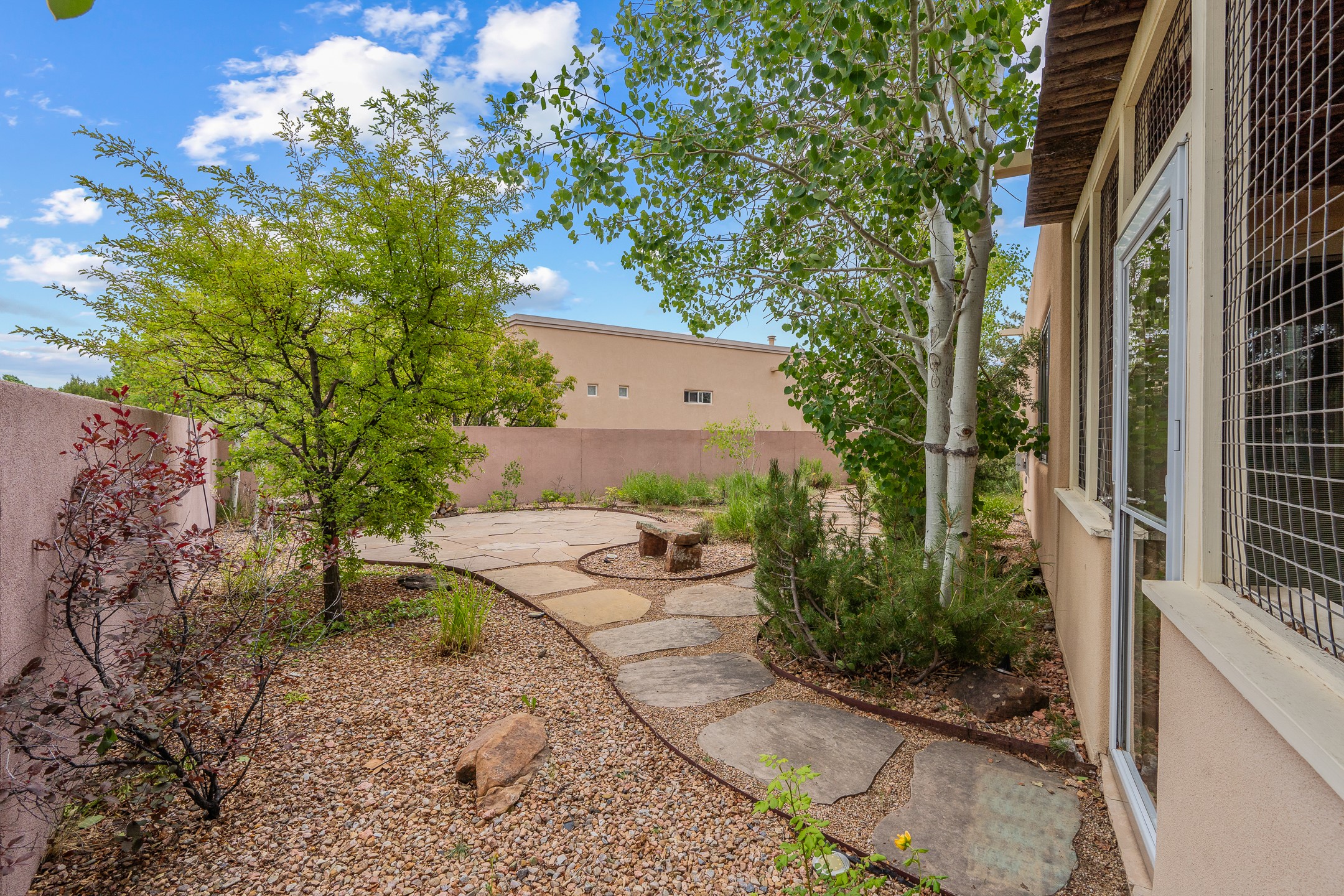 Privately positioned at the end of a cul-de-sac in Rancho Viejo, 3 Periwinkle Place offers a comfortable single-level layout with 3 bedrooms and 2 bathrooms, thoughtfully designed with separation in mind. The primary suite and two guest bedrooms are located on opposite sides of the home, creating a sense of privacy and flexibility. This approximately 1,846 square foot home features a gas kiva fireplace at the heart of a spacious kitchen and living area, providing a warm and open gathering space. Radiant in-floor heating and evaporative cooling ensure year-round comfort. Brand new carpet has been installed throughout the whole house, enhancing its fresh and inviting feel. Sliding doors open to a catio, offering a protected outdoor area for pets or quiet relaxation. The home sits adjacent to a landscaped open greenbelt, offering a calm and natural backdrop. The outdoor areas include mature landscaping, a drip irrigation system, and a covered patio designed for low-maintenance enjoyment. The layout supports both day-to-day ease and comfortable hosting. Recent upgrades completed in 2023 include a new boiler, new water heater, and a new roof, providing added value and peace of mind. Additional features include a two-car garage, underground utilities, and convenient access to nearby schools, restaurants, and I-25. Buyers are encouraged to verify square footage, lot size, and all features to their own satisfaction.