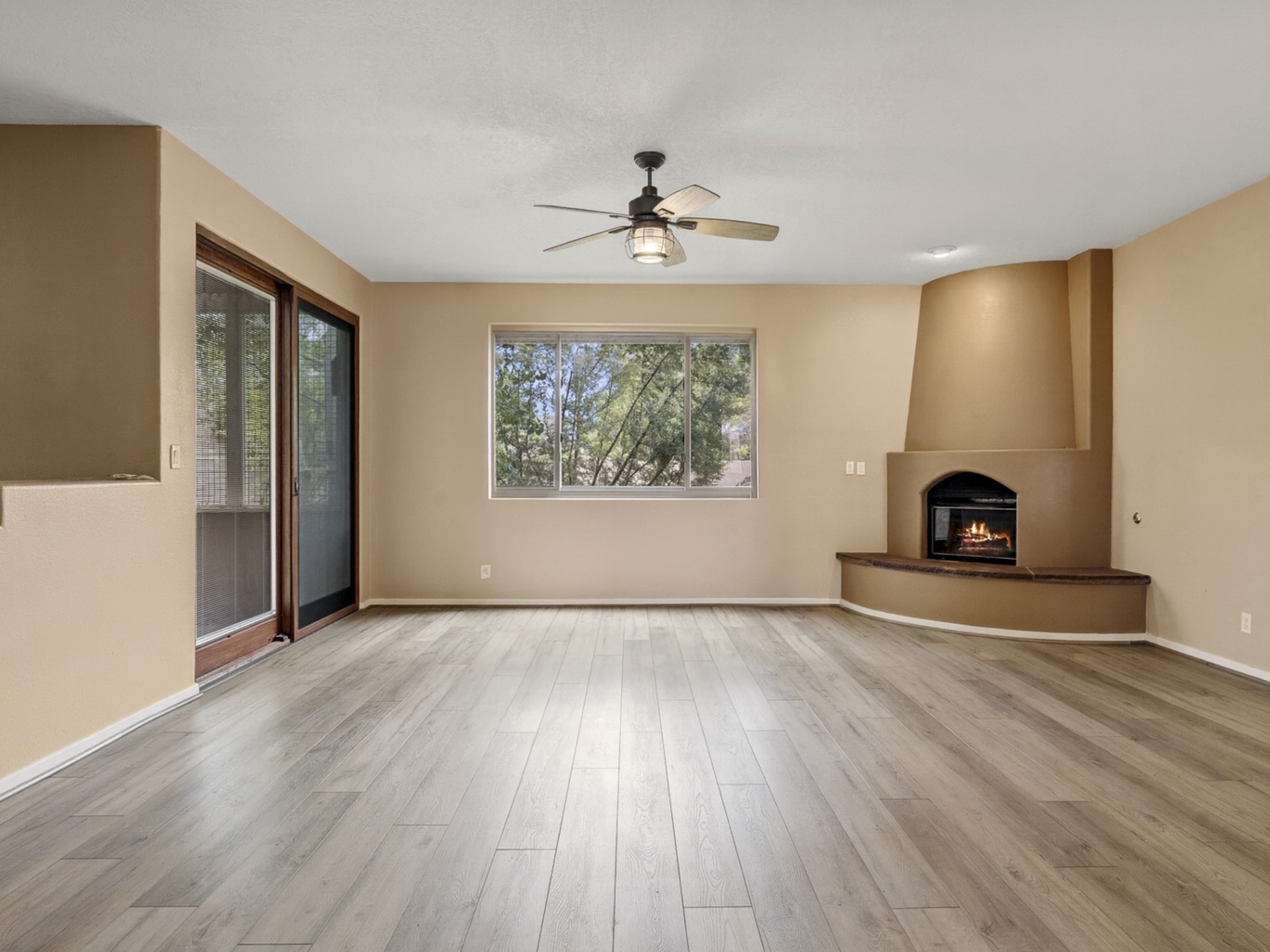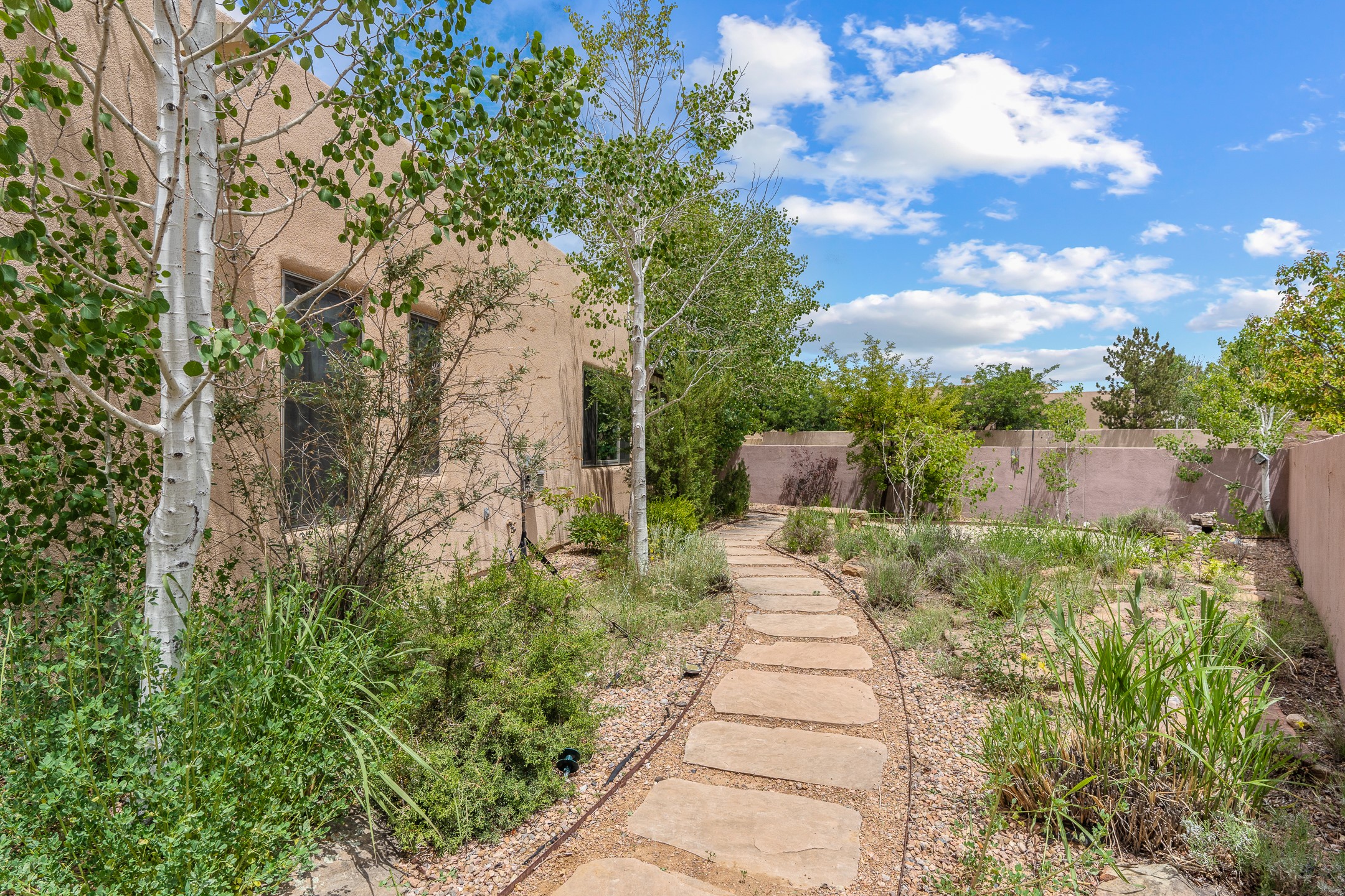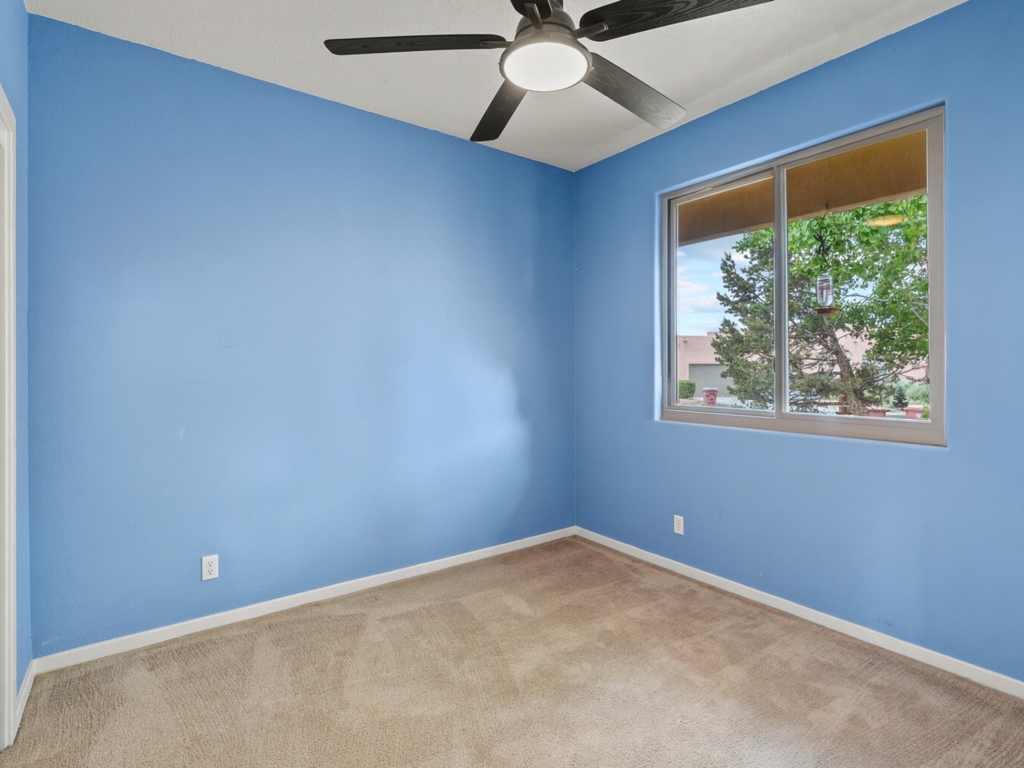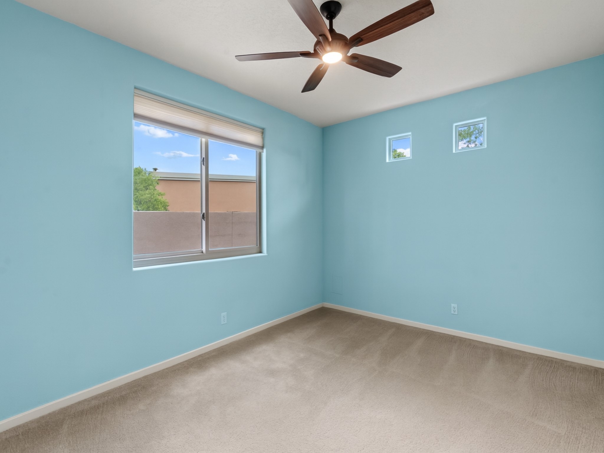 Privately positioned at the end of a cul-de-sac in Rancho Viejo, 3 Periwinkle Place offers a comfortable single-level layout with 3 bedrooms and 2 bathrooms, thoughtfully designed with separation in mind. The primary suite and two guest bedrooms are located on opposite sides of the home, creating a sense of privacy and flexibility. This approximately 1,846 square foot home features a gas kiva fireplace at the heart of a spacious kitchen and living area, providing a warm and open gathering space. Radiant in-floor heating and evaporative cooling ensure year-round comfort. Brand new carpet has been installed throughout the whole house, enhancing its fresh and inviting feel. Sliding doors open to a catio, offering a protected outdoor area for pets or quiet relaxation. The home sits adjacent to a landscaped open greenbelt, offering a calm and natural backdrop. The outdoor areas include mature landscaping, a drip irrigation system, and a covered patio designed for low-maintenance enjoyment. The layout supports both day-to-day ease and comfortable hosting. Recent upgrades completed in 2023 include a new boiler, new water heater, and a new roof, providing added value and peace of mind. Additional features include a two-car garage, underground utilities, and convenient access to nearby schools, restaurants, and I-25. Buyers are encouraged to verify square footage, lot size, and all features to their own satisfaction.