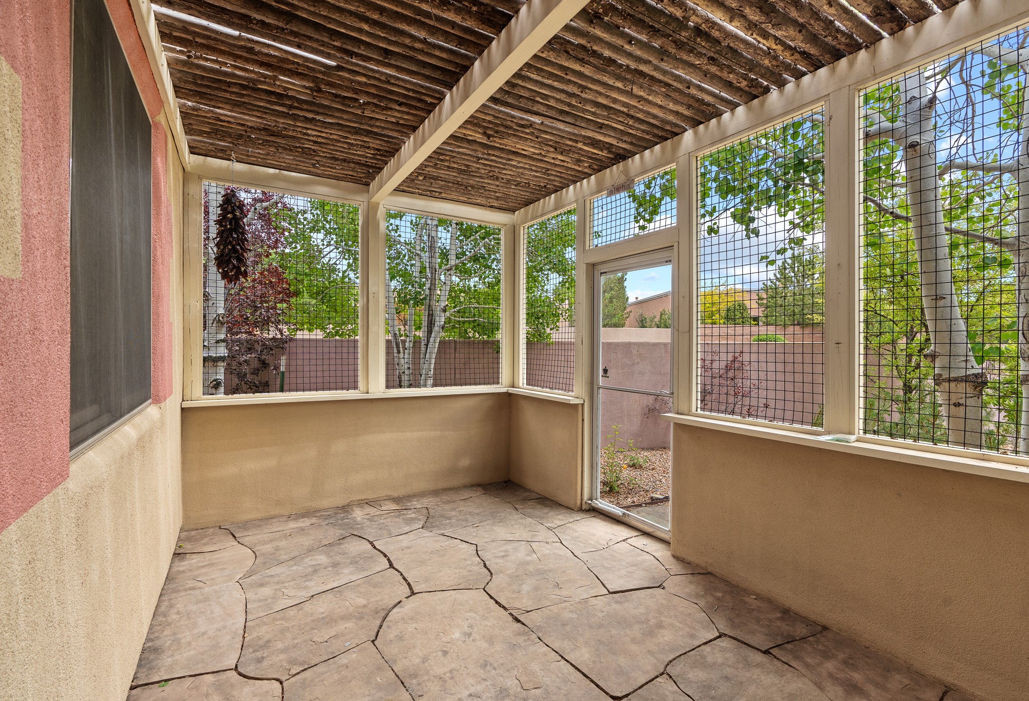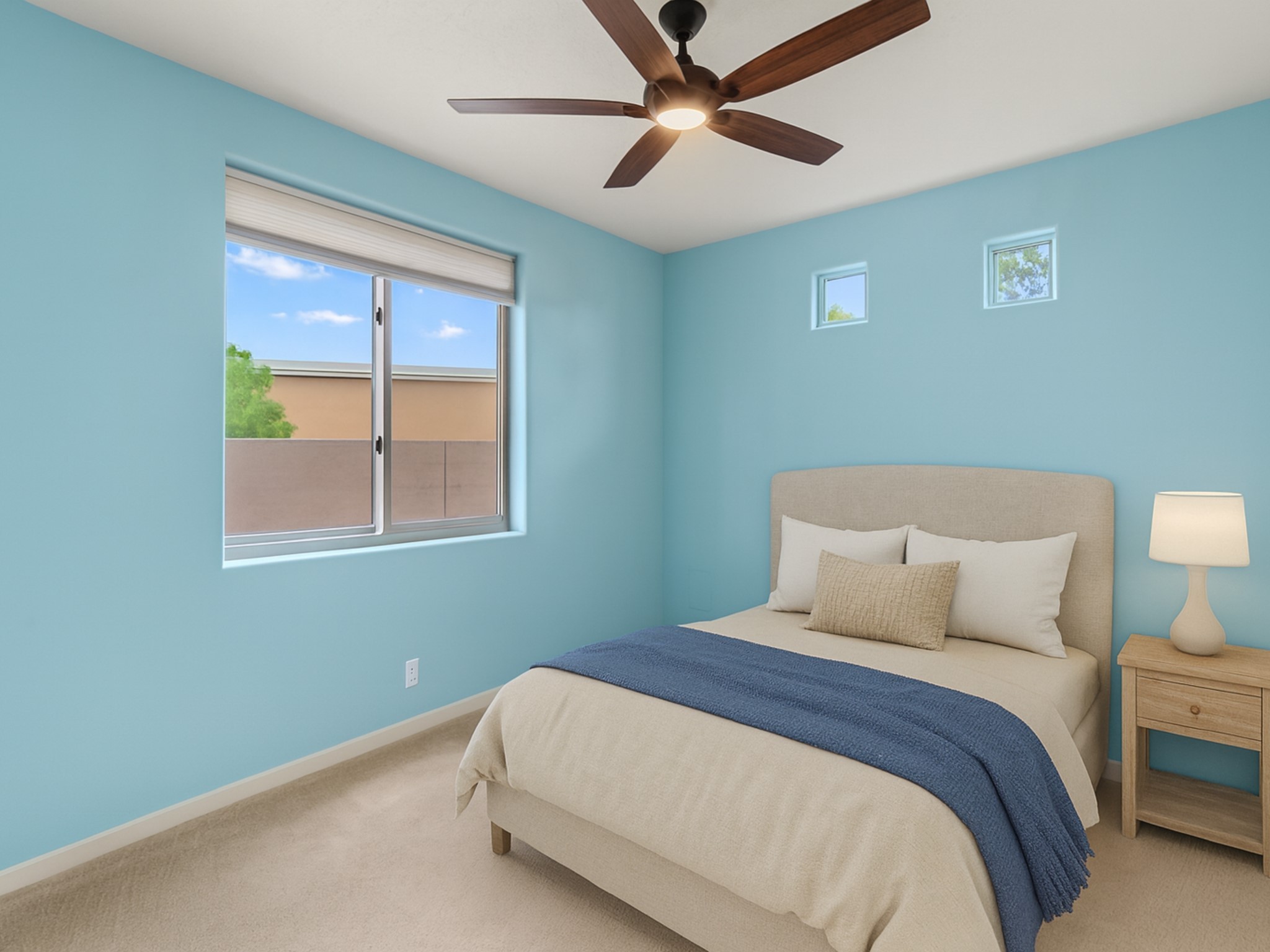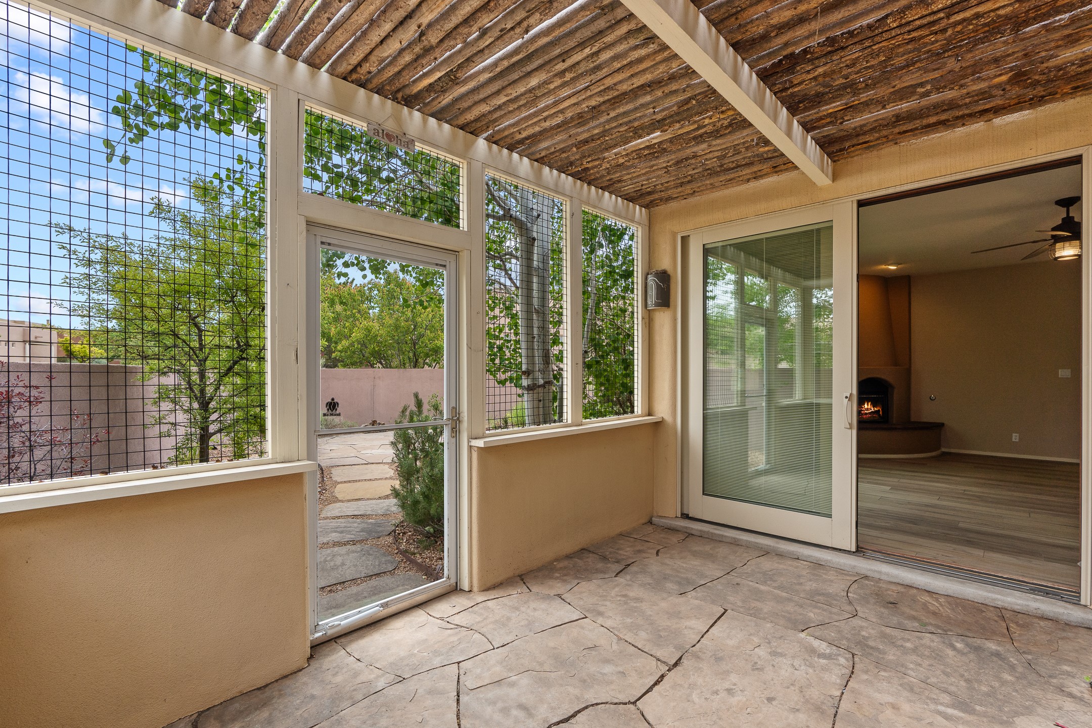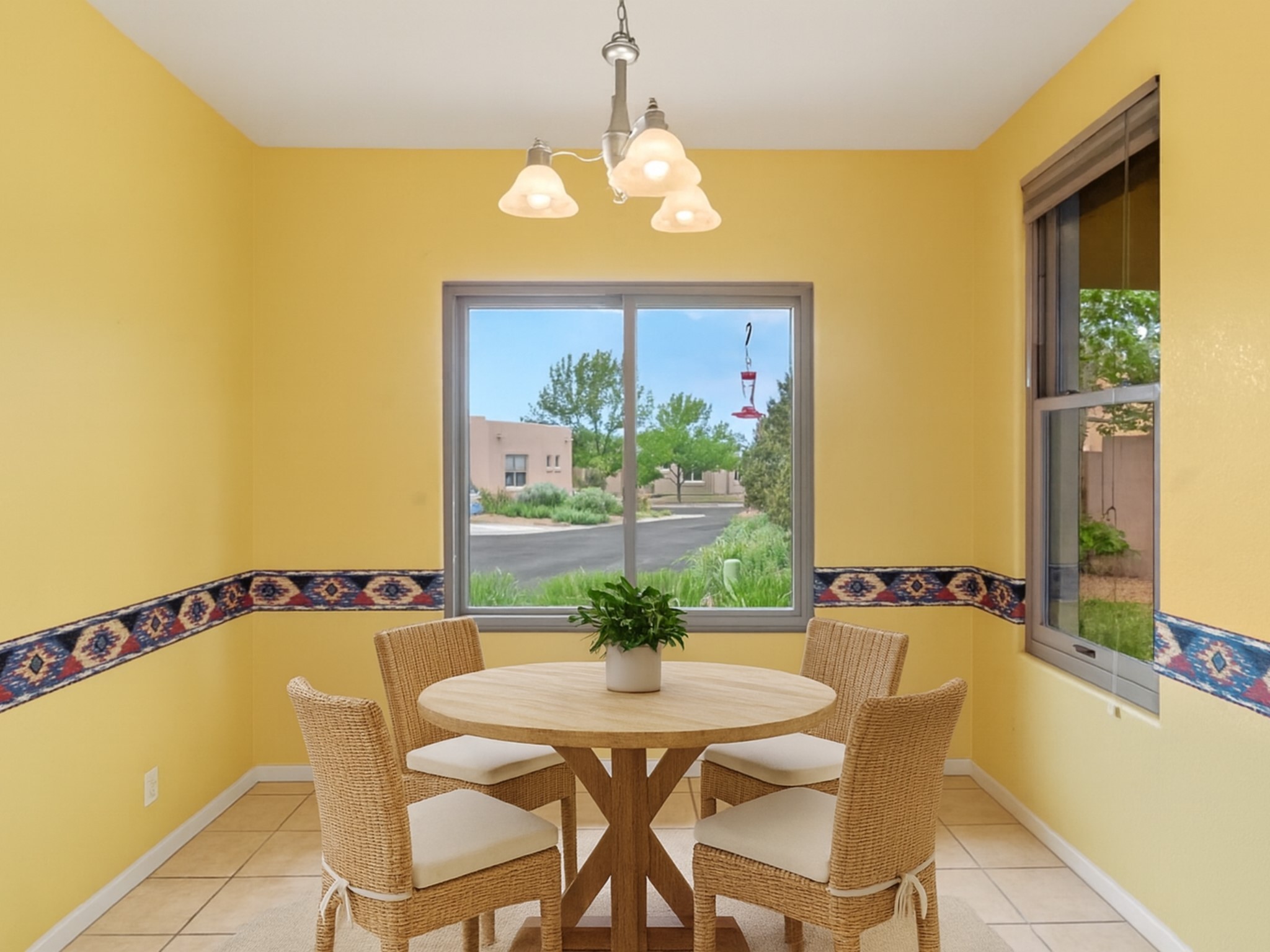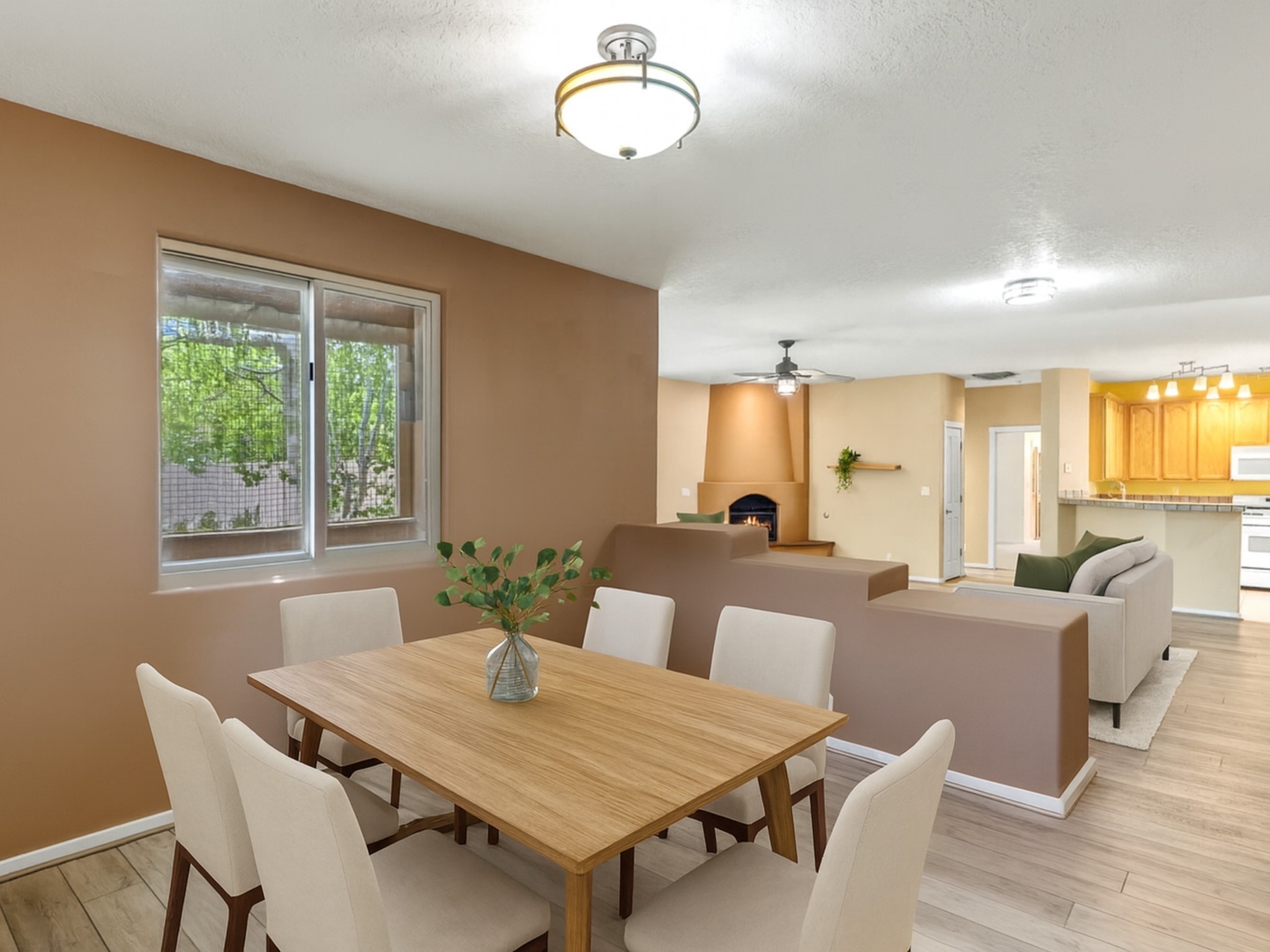 Privately positioned at the end of a cul-de-sac in Rancho Viejo, 3 Periwinkle Place offers a comfortable single-level layout with 3 bedrooms and 2 bathrooms, thoughtfully designed with separation in mind. The primary suite and two guest bedrooms are located on opposite sides of the home, creating a sense of privacy and flexibility. This approximately 1,846 square foot home features a gas kiva fireplace at the heart of a spacious kitchen and living area, providing a warm and open gathering space. Radiant in-floor heating and evaporative cooling ensure year-round comfort. Brand new carpet has been installed throughout the whole house, enhancing its fresh and inviting feel. Sliding doors open to a catio, offering a protected outdoor area for pets or quiet relaxation. The home sits adjacent to a landscaped open greenbelt, offering a calm and natural backdrop. The outdoor areas include mature landscaping, a drip irrigation system, and a covered patio designed for low-maintenance enjoyment. The layout supports both day-to-day ease and comfortable hosting. Recent upgrades completed in 2023 include a new boiler, new water heater, and a new roof, providing added value and peace of mind. Additional features include a two-car garage, underground utilities, and convenient access to nearby schools, restaurants, and I-25. Buyers are encouraged to verify square footage, lot size, and all features to their own satisfaction.