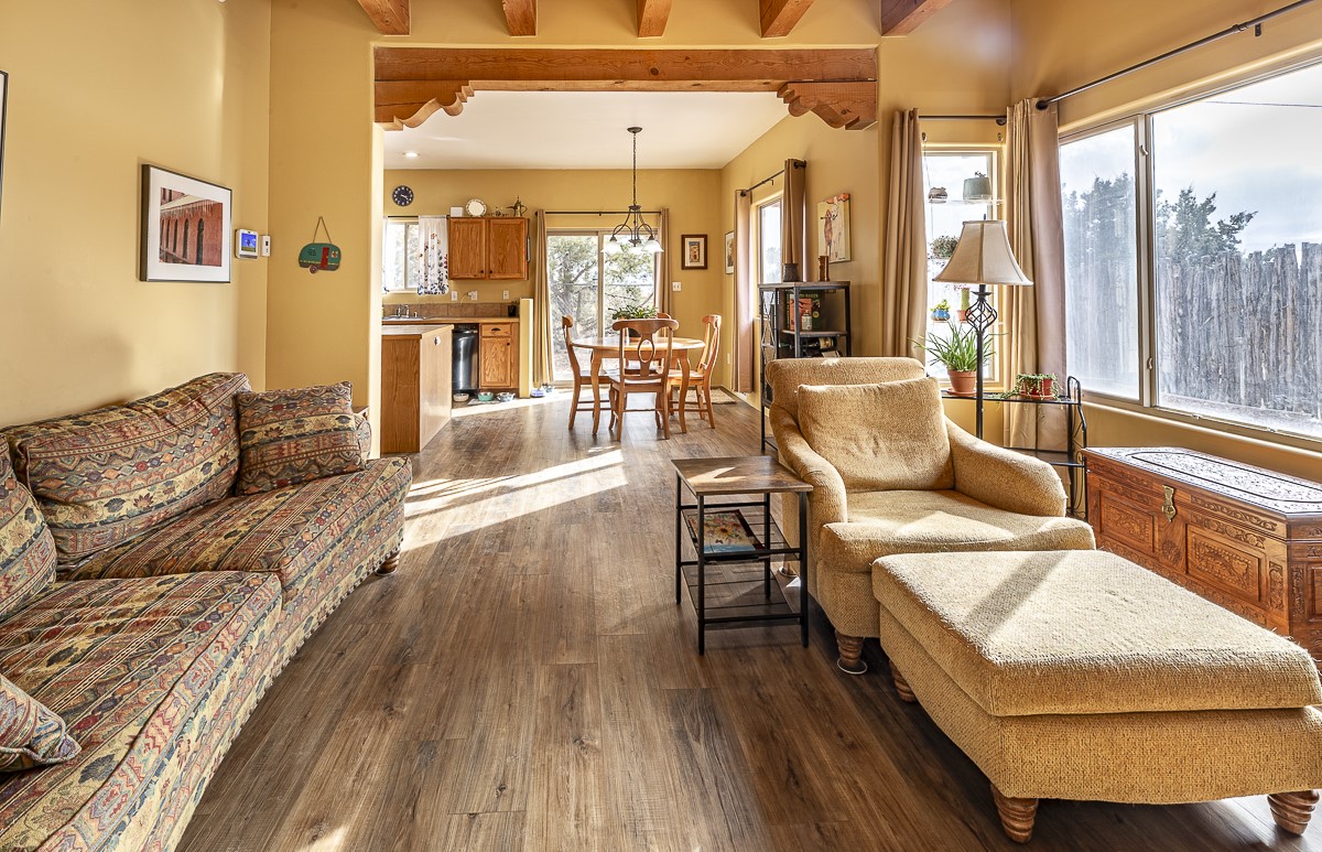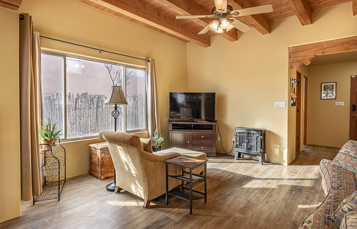 A bright single family two story home with a fully fenced back yard. The welcoming main level features one full bath, a guest room, a window filled living room, kitchen and dining area. The open kitchen invites casual meals and conversation. The kitchen does also include a walk-in pantry! The primary bedroom and a second guest room share the second full bath upstairs. There is a mudroom / laundry room off the kitchen with access to the one car garage. The outdoor shed and the closet under the stairs offer GREAT storage. Outside, a wooden pergola covers the patio off of the dining area. The home is located close to HWY 599 and the Santa Fe Airport. RV or Camper parking inside the fence if needed/wanted.